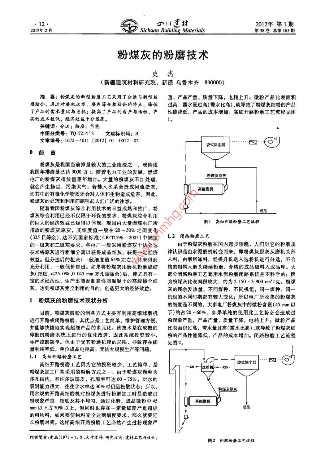 H材2012年第1期2012年2月Sichuan Building Materials第38卷總第165期粉煤灰的粉磨技術(shù)史杰(新疆建筑材料研究院,新疆烏魯木齊8300000摘要:粉煤灰的新型粉磨工藝采用了分選與新型粉重,產(chǎn)品產(chǎn)量、質(zhì)量下降,電耗上升;微粉產(chǎn)品比表面積磨結(jié)合,通過(guò)對(duì)磨機(jī)選型、磨內(nèi)篩分相結(jié)合的特點(diǎn),降低過(guò)高,需水量過(guò)髙(需水比高),就導(dǎo)致了粉煤灰細(xì)粉的產(chǎn)品了產(chǎn)品的需水量比與電耗;提高了產(chǎn)品的臺(tái)產(chǎn)與活性,產(chǎn)性能降低,產(chǎn)品的成本增加。高細(xì)開路粉磨工藝流程見圖品的成本較低,經(jīng)濟(jì)效益十分顯著。關(guān)鍵詞:分選;粉磨;節(jié)能中圖分類號(hào):TQ1724·3文獻(xiàn)標(biāo)識(shí)碼:B文章編號(hào):1672-4011(2012)01-0012-02袋式除塵器0前言粉煤灰是我國(guó)當(dāng)前排量較大的工業(yè)廢渣之一,現(xiàn)階段我國(guó)年排渣量已達(dá)3000t隨著電力工業(yè)的發(fā)展,燃煤電廠的粉煤灰排放量逐年增加。大量的粉煤灰不加處理,粉煤灰原灰就會(huì)產(chǎn)生揚(yáng)塵,污染大氣;若排入水系會(huì)造成河流淤塞,高細(xì)磨機(jī)而其中的有毒化學(xué)物質(zhì)還會(huì)對(duì)人體和生物造成危害。因此,粉煤灰的處理和利用問(wèn)題引起人們廣泛的注意。隨著我國(guó)粉煤灰綜合利用技術(shù)的日益成熟和推廣,粉煤灰綜合利用已經(jīng)不僅限于環(huán)保的要求,粉煤灰綜合利用的巨大的經(jīng)濟(jì)效益已經(jīng)得以體現(xiàn)?,F(xiàn)國(guó)內(nèi)大量燃煤電廠所圖1高細(xì)開珞粉磨工藝流程排放的粉煤灰原灰,其細(xì)度值一般在20~50%之間變化(325目篩余),達(dá)不到國(guó)家標(biāo)準(zhǔn)(GBT196-2005)中規(guī)定1.2閉路粉磨工藝的一級(jí)灰和二級(jí)灰要求。各電廠一般采用粉煤灰干法分選由于粉煤灰粉磨在國(guó)內(nèi)起步較晚,人們對(duì)它的粉磨規(guī)技術(shù)將原灰進(jìn)行粗細(xì)分離以獲得成品細(xì)灰,獲得一定經(jīng)濟(jì)律認(rèn)識(shí)是由水泥磨機(jī)轉(zhuǎn)變而來(lái),即粉煤灰原灰從磨機(jī)頭部效益。但分選后的粗灰(一般細(xì)度值65%左右),并未得到入料,由磨尾卸料,經(jīng)提升機(jī)送入選粉機(jī)進(jìn)行分選,不合充分利用,一般低價(jià)售出。如果將粉煤灰用磨機(jī)粉磨成細(xì)格的粗料人磨頭繼續(xù)粉磨,合格的成品細(xì)料入成品庫(kù)。大灰(細(xì)度:≤25.0%,0.045mm方孔篩篩余)后,使之具有一部分閉路粉磨工藝套用水泥粉磨閉路系統(tǒng)是不科學(xué)的;因定的水硬活性,生產(chǎn)出能配制高性能混凝土的高級(jí)摻合細(xì)為粉煤灰比表面積較大,約為2150~3900cm2/克。粉煤灰,達(dá)到粉煤灰完全利用的目的,創(chuàng)造更大的經(jīng)濟(jì)效益?;业臍堄喟l(fā)熱量,不同煤種、不同機(jī)組,同一煤種、同一1粉煤灰的粉磨技術(shù)現(xiàn)狀分析機(jī)組的不同時(shí)期都有較大變化;所以電廠所收集的粉煤灰的細(xì)度是不同的,大多電廠粉煤灰中的微粉含量(45mm以目前,粉煤灰微粉的制備方式主要有利用高細(xì)球磨機(jī)下)約占20~60%,如果單純的使用此工藝勢(shì)必會(huì)造成過(guò)進(jìn)行開路或閉路粉磨,其優(yōu)點(diǎn)是工藝簡(jiǎn)單、維護(hù)管理方便,粉現(xiàn)象嚴(yán)重,產(chǎn)品產(chǎn)量、質(zhì)量下降,電耗上升;微粉產(chǎn)品并能夠快捷地實(shí)現(xiàn)超細(xì)產(chǎn)品的多元化。該技術(shù)是在成熟的比表面積過(guò)高,需水量過(guò)高(需水比高),就導(dǎo)致了粉煤灰細(xì)球磨機(jī)粉磨系統(tǒng)上進(jìn)行的優(yōu)化改進(jìn),因此系統(tǒng)投資較小,粉的產(chǎn)品性能降低,產(chǎn)品的成本增加。閉路粉磨工藝流程生產(chǎn)控制簡(jiǎn)單。但由于受其粉磨機(jī)理的局限,導(dǎo)致存在能見圖2。量利用率低,單位成品電耗高,無(wú)法大規(guī)模生產(chǎn)等問(wèn)題。1.1高細(xì)開路粉磨工藝高細(xì)開路粉磨工藝因?yàn)樗耐顿Y較少、工藝簡(jiǎn)單、是袋式除塵器粉煤灰加工廠常采用的粉磨方式之一。由于粉煤灰顆粒為多孔結(jié)構(gòu),有許多玻璃質(zhì),孔隙率可達(dá)60~75%,對(duì)水的吸附能力很大,往往含水率達(dá)30%時(shí)仍呈松散狀態(tài);所以粉煤灰原灰用常規(guī)的開路高細(xì)磨機(jī)對(duì)粉煤灰進(jìn)行粉磨加工時(shí)易造成過(guò)粉現(xiàn)象嚴(yán)重,細(xì)度及其不均勻,通過(guò)化驗(yàn),成品微粉中45高細(xì)磨機(jī)mm以下占70%以上,但同時(shí)也存在一定量細(xì)度嚴(yán)重超標(biāo)的粗物料,如果要使物料完全達(dá)到細(xì)度要求,那么就要延長(zhǎng)粉磨時(shí)間。這樣高細(xì)開路粉磨工藝必然產(chǎn)生過(guò)粉現(xiàn)象嚴(yán)作者簡(jiǎn)介:史杰(1971-),男,大學(xué)本科,研究方向:建材工藝與設(shè)計(jì)圖2閉路粉磨工藝流程2012年第1期f第38卷總第165期Sichuan Building Materials2012年2月2新型粉磨技術(shù)的研究3應(yīng)用效果2.1粉磨工藝2008年我院承擔(dān)新疆一家粉煤灰制品廠的設(shè)計(jì)服務(wù)項(xiàng)由于粉煤灰原灰中的微粉含量(45mm以下)約占20~目,項(xiàng)目規(guī)模為年產(chǎn)Ⅱ級(jí)粉煤灰(GB/T1962005)36萬(wàn)t60%(成品),所以我院研發(fā)了先分級(jí)后粉磨的閉路粉磨工的粉磨生產(chǎn)線。藝,也就是粉煤灰原灰先經(jī