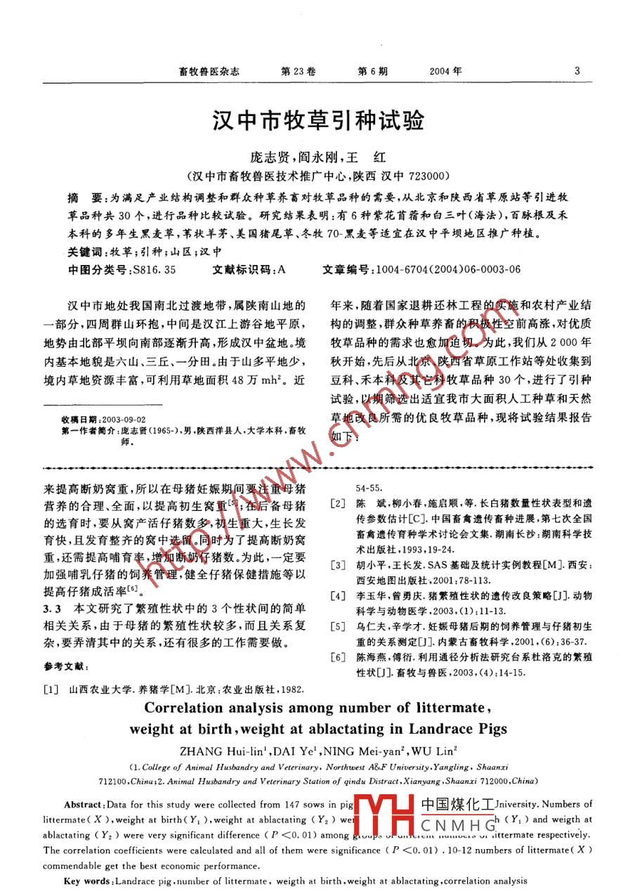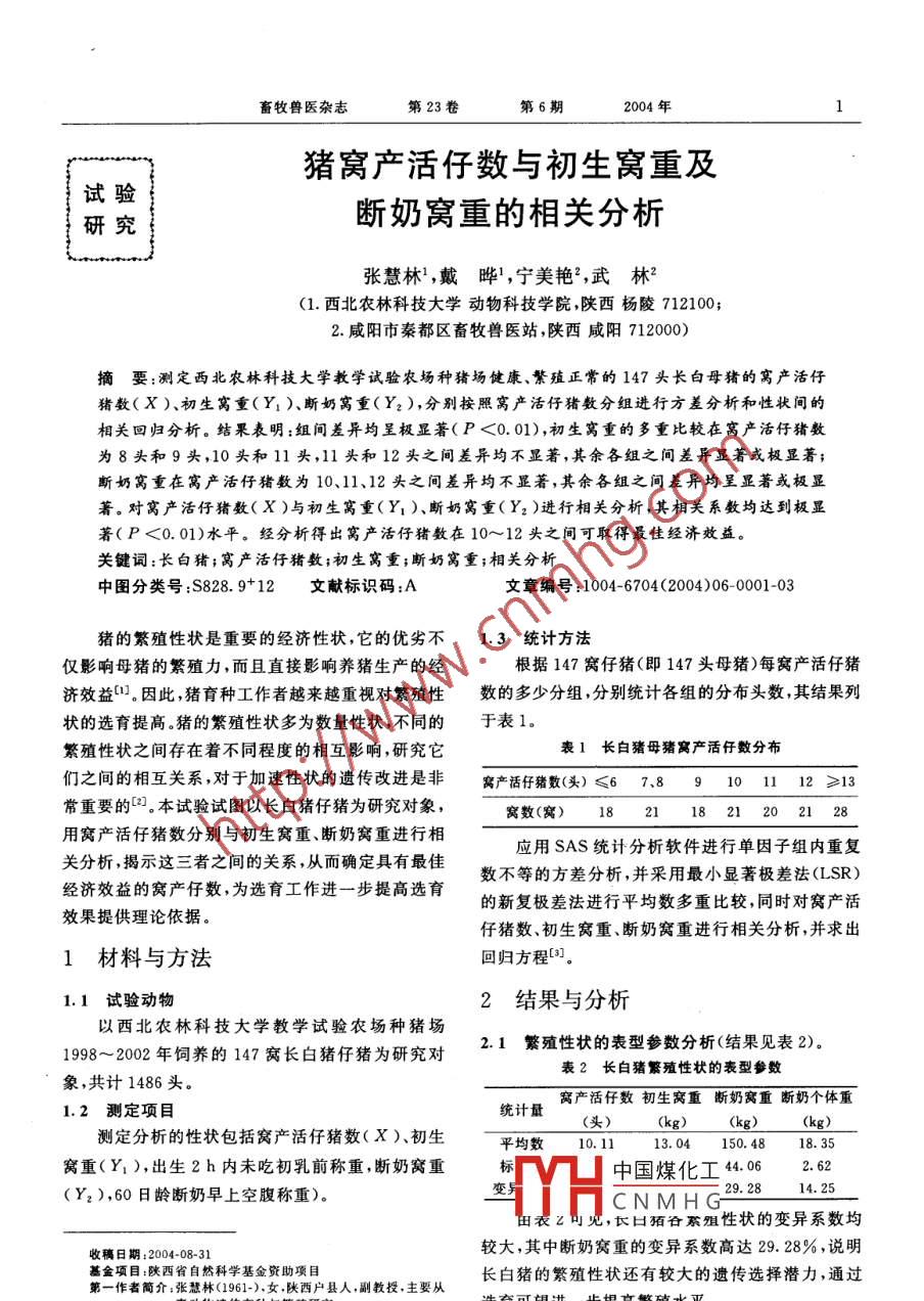 畜牧獸醫(yī)雜志第23卷第6期2004年豬窩產(chǎn)活仔數(shù)與初生窩重及試驗(yàn)研究斷奶窩重的相關(guān)分析張慧林,戴曄,寧美艷2,武林(1.西北農(nóng)林科技大學(xué)動(dòng)物科技學(xué)院,陜西楊陵712100;咸陽(yáng)市秦都區(qū)畜牧獸醫(yī)站,陜西咸陽(yáng)712000摘要:測(cè)定西北農(nóng)林科技大學(xué)教學(xué)試驗(yàn)農(nóng)場(chǎng)種豬場(chǎng)健康、繁殖正常的147頭長(zhǎng)白母豬的窩產(chǎn)活仔豬數(shù)(X)、初生窩重(Y1)、斷奶窩重(Y2),分別按照窩產(chǎn)活仔豬數(shù)分組進(jìn)行方差分析和性狀間的相關(guān)回歸分析。結(jié)果表明:組間差異均呈極顯著(P<0.01),初生窩重的多重比較在窩產(chǎn)活仔豬數(shù)為8頭和9頭,10頭和11頭,11頭和12頭之間差異均不顯著,其余各組之間差異顯著或極顯著;斷奶窩重在窩產(chǎn)活仔豬數(shù)為10、11、12頭之間差異均不顯著,其余各組之間差異均呈顯著或極顯著。對(duì)窩產(chǎn)活仔豬數(shù)(X)與初生窩重(¥1)、斷奶窩重(Y2)進(jìn)行相關(guān)分析,其相關(guān)系數(shù)均達(dá)到極顯著(P<0.01)水平。經(jīng)分析得出窩產(chǎn)活仔豬數(shù)在10~12頭之間可取得最佳經(jīng)濟(jì)效益。關(guān)鍵詞:長(zhǎng)白豬;窩產(chǎn)活仔豬數(shù);初生窩重;斷奶窩重;相關(guān)分析中圖分類(lèi)號(hào):S828.9+12文獻(xiàn)標(biāo)識(shí)碼:A文章編號(hào):1004-6704(2004)06-0001-03豬的繁殖性狀是重要的經(jīng)濟(jì)性狀,它的優(yōu)劣不1.3統(tǒng)計(jì)方法僅影響母豬的繁殖力,而且直接影響?zhàn)B豬生產(chǎn)的經(jīng)根據(jù)147窩仔豬(即147頭母豬)每窩產(chǎn)活仔豬濟(jì)效益因此,豬育種工作者越來(lái)越重視對(duì)繁殖性數(shù)的多少分組,分別統(tǒng)計(jì)各組的分布頭數(shù),其結(jié)果列狀的選育提高。豬的繁殖性狀多為數(shù)量性狀,不同的于表1。繁殖性狀之間存在著不同程度的相互影響,研究它表1長(zhǎng)白豬母豬寓產(chǎn)活仔數(shù)分布們之間的相互關(guān)系,對(duì)于加速性狀的遺傳改進(jìn)是非窩產(chǎn)活仔豬數(shù)(頭)≤67,89101112≥13常重要的。本試驗(yàn)試圖以長(zhǎng)白豬仔豬為研究對(duì)象,窩數(shù)(窩)18211821202128用窩產(chǎn)活仔豬數(shù)分別與初生窩重、斷奶窩重進(jìn)行相應(yīng)用SAS統(tǒng)計(jì)分析軟件進(jìn)行單因子組內(nèi)重復(fù)關(guān)分析,揭示這三者之間的關(guān)系,從而確定具有最佳經(jīng)濟(jì)效益的窩產(chǎn)仔數(shù),為選育工作進(jìn)一步提高選育數(shù)不等的方差分析,并采用最小顯著極差法(LSR的新復(fù)極差法進(jìn)行平均數(shù)多重比較,同時(shí)對(duì)窩產(chǎn)活效果提供理論依據(jù)。仔豬數(shù)、初生窩重、斷奶窩重進(jìn)行相關(guān)分析,并求出1材料與方法回歸方程O(píng)。1.1試驗(yàn)動(dòng)物2結(jié)果與分析以西北農(nóng)林科技大學(xué)教學(xué)試驗(yàn)農(nóng)場(chǎng)種豬場(chǎng)1998-200年飼養(yǎng)的147窩長(zhǎng)白豬仔豬為研究對(duì)21繁殖性狀的表型參數(shù)分析(結(jié)果見(jiàn)表2)表2長(zhǎng)白豬繁殖性狀的表型參數(shù)象,共計(jì)1486頭窩產(chǎn)活仔數(shù)初生窩重?cái)嗄谈C重?cái)嗄虃€(gè)體重1.2測(cè)定項(xiàng)目統(tǒng)計(jì)量(頭)(kg)(kg)(kg)測(cè)定分析的性狀包括窩產(chǎn)活仔豬數(shù)(X)、初生平均數(shù)10.1113.04150.4818.35窩重(Y1),出生2h內(nèi)未吃初乳前稱(chēng)重,斷奶窩重(Y2),60日齡斷奶早上空腹稱(chēng)重)。2)H中國(guó)煤化工4.062.62CNMHG長(zhǎng)日貊素性狀的變異系數(shù)均收稿日期:2004-08-31較大,其中斷奶窩重的變異系數(shù)高達(dá)29.28%,說(shuō)明基金項(xiàng)目:陜西省自然科學(xué)基金資助項(xiàng)目長(zhǎng)白豬的繁殖性狀還有較大的遺傳選擇潛力,通過(guò)第一作者簡(jiǎn)介;張慧林(1961-)女陜西戶縣人,副教授,主要從事動(dòng)物遺傳育種與繁殖研究。選育可望進(jìn)一步提高繁殖水平。Journal of Animal Science and Veterinary Medicine Vol 23 No. 6200422不同窩產(chǎn)活仔豬數(shù)的哺育率(結(jié)果見(jiàn)表3)。各性狀之間存在著一定的相關(guān)關(guān)系。其中斷奶窩重表3不同窩產(chǎn)活仔豬數(shù)的哺育率與初生窩重的相關(guān)系數(shù)為0.5242,差異極顯著(P窩產(chǎn)活仔豬數(shù)(頭)≤67,89101112≥13<0.01);它與窩產(chǎn)活仔豬數(shù)的相關(guān)系數(shù)為0.4832,哺育率(%)92.7191.6791.3686.678.5582.1464.62差異極顯著(P<0.01);初生窩重與窩產(chǎn)活仔豬數(shù)由表3可以看出:當(dāng)窩產(chǎn)活仔豬數(shù)增大時(shí),哺育的相關(guān)系數(shù)為0.8085,差異極顯著(P<0.01)率有下降趨勢(shì),尤其當(dāng)窩產(chǎn)活仔豬數(shù)在13頭以上表6性狀間的相關(guān)系數(shù)矩陣性xyy時(shí),其哺育率僅有64.62%。這說(shuō)明當(dāng)產(chǎn)豬仔數(shù)過(guò)多性狀X(窩產(chǎn)活仔數(shù))Y1(初生窩重)Y2(斷奶窩重)時(shí),仔豬不易成活0.80850.48322.3性狀的方差分析分別對(duì)不同窩產(chǎn)活仔豬數(shù)的初生窩重、斷奶窩重進(jìn)行組內(nèi)重復(fù)數(shù)不等的方差分析,結(jié)果均達(dá)到差注:表示差異極顯著異極顯著水準(zhǔn)(P<0.01)。進(jìn)一步對(duì)其進(jìn)行平均數(shù)25性狀之間的回歸分析的多重比較,其差異顯著性結(jié)果見(jiàn)表4及表5。①窩產(chǎn)活仔豬數(shù)(X)對(duì)初生窩重(Y1)的回歸方