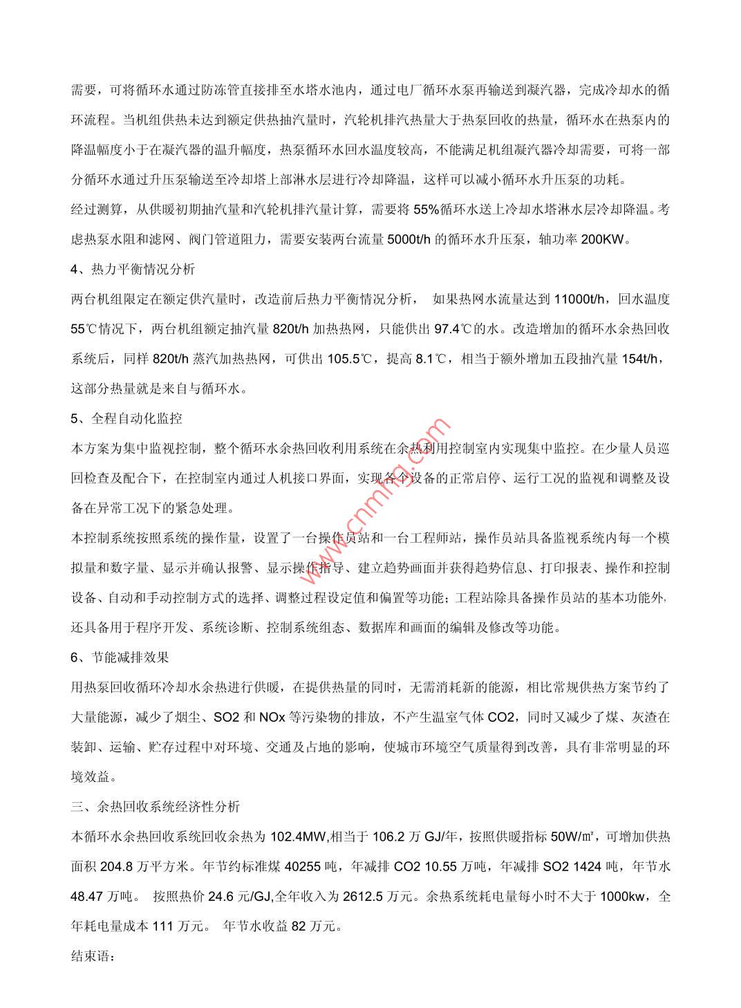 300MW機(jī)組循環(huán)水余熱利用吸收式熱泵技術(shù)田愛兵1馮愛華2 王彥海11河北建投國(guó)融能源服務(wù)股份有限公司河北050051 ; 2石家莊理工職業(yè)學(xué)院河北050228摘要:采用吸收式熱泵技術(shù)回收熱電廠中排往大氣中的凝結(jié)水余熱供熱技術(shù),可以實(shí)現(xiàn)能源的高效利用,在提供熱量的同時(shí),無(wú)需消耗新的能源,相比常規(guī)供熱方案節(jié)約了大量能源,不產(chǎn)生溫室氣體CO2,又減少了煙塵、SO2和NOx等污染物的排放,具有非常明顯的經(jīng)濟(jì)效益、環(huán)境效益和社會(huì)效益。關(guān)鍵詞:電廠余熱;節(jié)能減排;熱泵;采暖中圖分類號(hào): TE08文獻(xiàn)標(biāo)識(shí)碼: A引言:目前熱力發(fā)電廠的循環(huán)水?dāng)y帶巨大的低溫余熱從冷卻水塔排放到大氣中,并攜帶大量的水蒸汽一同損失掉。如果能夠回收利用,電廠在不增加煤耗的情況下可增加20%~25%的熱量既可以用來(lái)發(fā)電,也可以擴(kuò)大供熱面積。但由于這部分余熱品味很低無(wú)法直接利用。吸收式熱泵技術(shù)的發(fā)展為低溫余熱回收創(chuàng)造了有利條件。.余熱利用的背景和需求河北省某發(fā)電廠裝機(jī)容量為2X300MW抽汽供熱機(jī)組,每臺(tái)機(jī)組循環(huán)水系統(tǒng)配有兩臺(tái)流量為17640t/h循環(huán)水泵,采暖季時(shí)每臺(tái)機(jī)組保持一臺(tái)循環(huán)水泵運(yùn)行,循環(huán)水量約為18000t/h,凝汽器循環(huán)水進(jìn)出口溫度般在24/35C.上下。原熱網(wǎng)設(shè)計(jì)供熱面積為1400萬(wàn)m?,設(shè)計(jì)熱網(wǎng)額定供水量為11000 t/h,設(shè)計(jì)供水溫度130°C,設(shè)計(jì)回水溫度70°C。2010年冬季實(shí)際供暖面積已達(dá)近1100萬(wàn)m?,最大供水量為8370th,供水溫度一般在100~116°C,回水溫度一般在48~ 63 C范圍內(nèi)變化,供水壓力≤1.3MPa,回水壓力為0.25MPa。電廠供熱汽源為汽輪機(jī)5段抽汽,供汽壓力0.145~0.5MPa可調(diào)整,額定供熱量410 th。2010年兩臺(tái)機(jī)用于熱網(wǎng)最大總供熱抽汽量為730th。由于冬季廠內(nèi)輔助設(shè)施用汽量也較大,實(shí)際5段抽汽抽汽壓力時(shí)常出現(xiàn)低于0.2MPa現(xiàn)象。由此可見,兩臺(tái)2X300MW機(jī)組的供熱汽源已經(jīng)達(dá)到甚至超出額定抽汽量,已經(jīng)出現(xiàn)不能滿足未來(lái)的供暖需求情況。電廠在城區(qū)外,距離熱負(fù)荷中心約10公里,限于既有分支供熱管網(wǎng)改造難度大和熱力站基本滿負(fù)荷的原因,末端用戶已出現(xiàn)了部分用戶供熱不達(dá)標(biāo)的情況,不得不采取在末端熱力站加設(shè)一次網(wǎng) 管道泵來(lái)提高流量,造成新增用戶供熱入網(wǎng)的難度較大,供熱需求難以滿足,為了解決熱源不足的問題,技術(shù)人員選擇了吸收式熱泵技術(shù)提取機(jī)組循環(huán)水中的余熱,可以實(shí)現(xiàn)能源的高效利用,既緩解城市采暖供熱用能的矛盾,又響應(yīng)國(guó)家節(jié)能減排的政策方針,為城市環(huán)境增添一份綠色。二、余熱利用技術(shù)方案實(shí)施1、吸收式熱泵應(yīng)用原理吸收式熱泵(即增熱型熱泵),通常簡(jiǎn)稱AHP(absorption heat pump),它以蒸汽、熱水為驅(qū)動(dòng)熱源,把低溫?zé)嵩吹臒崃刻崛〉礁邷責(zé)嵩粗腥?,從而提高了能源的利用效率。吸收式熱泵?yīng)用原理是在首站內(nèi)設(shè)置蒸汽型吸收式熱泵。見示意圖1,以汽輪機(jī)抽汽為驅(qū)動(dòng)能源Q1,驅(qū)動(dòng)機(jī)內(nèi)溴化鋰溶劑循環(huán)做功,產(chǎn)生制冷效應(yīng),回收循環(huán)水中的余熱Q2,加熱熱網(wǎng)回水。熱網(wǎng)得到的有用熱量(熱網(wǎng)供熱量)為消耗的蒸汽熱量與回收的循環(huán)水余熱量之和Q1+Q2。i熱)Q吸收式熱泵Q2低溫?zé)嵩碤1+Q2電廠循環(huán)水f中溫?zé)嵩?次熱網(wǎng)水圖1吸收式熱泵回收余熱示意圖2、蒸汽吸收式熱泵選型.按照機(jī)組額定供熱抽汽量410 th,抽汽壓力0.25MPa,減去廠用輔助蒸汽用汽量,汽輪機(jī)排往凝汽器的排汽余熱仍然有大約120MW左右。結(jié)合電廠未來(lái)供熱發(fā)展實(shí)際情況,經(jīng)過(guò)對(duì)熱網(wǎng)水流量、供回水溫度、熱網(wǎng)循環(huán)泵入口汽蝕余量、運(yùn)行成本、投資收益率等綜合因素考慮,尤其核算熱網(wǎng)熱容量吸納能力,對(duì)各種選型方案進(jìn)行技術(shù)和經(jīng)濟(jì)比較,選擇吸收余熱為11.37MW的熱泵9臺(tái)。熱泵工作參數(shù),熱網(wǎng)水流量按照11000t/h,回水溫度按照55°C。循環(huán)水(熱源水)流量按照單臺(tái)循環(huán)水泵工作略大于設(shè)計(jì)流量選取18000th,循環(huán)水(熱源水)溫度按照34°C,考忠回收余熱可替換出五段抽汽量154t/h。3、熱泵循環(huán)水管道連接方案在#1機(jī)凝汽器循環(huán)水出口母管管道上安裝- - 個(gè)截?cái)嚅y,在截?cái)嚅y前引出一條管道, 將循環(huán)水引至熱泵,熱泵的循環(huán)水放熱后,分支成兩條管道,-條管道安裝升壓泵返回到截?cái)嚅y后循環(huán)水母管內(nèi),循環(huán)水最終流向冷卻水塔。另-條分支管道引到防凍管閥門后,當(dāng)機(jī)組供熱達(dá)到額定供熱抽汽量時(shí),汽輪機(jī)排汽熱量基本與熱泵回收的熱量相當(dāng),循環(huán)水降溫幅度等于在凝汽器的溫升幅度,回水溫度能夠滿足機(jī)組凝汽器冷卻需要,可將循環(huán)水通過(guò)防凍管直接排至水塔水池內(nèi),通過(guò)