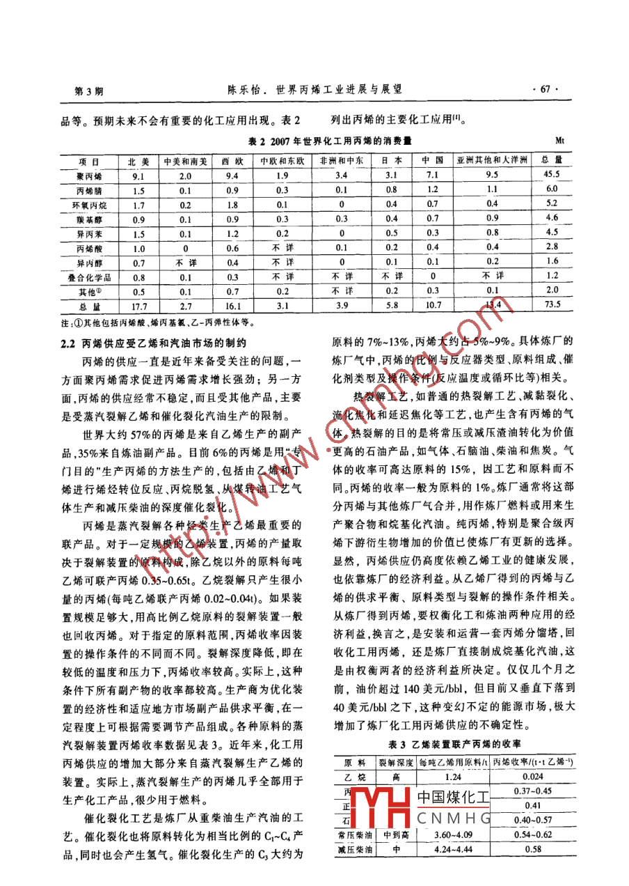 外能源第14卷第3期SINO-GLOBAL ENERGY2009年3月石油煉制與石油化工世界丙烯工業(yè)進(jìn)展與展望陳樂(lè)怡(中國(guó)石化經(jīng)濟(jì)技術(shù)研究院,北京10009)摘要介紹并分析了世界丙烯供求趨勢(shì)和資源狀況,指出盡管受乙烯和汽油市場(chǎng)制約但從長(zhǎng)遠(yuǎn)看,丙烯需求依然強(qiáng)勁介紹了已經(jīng)實(shí)現(xiàn)工業(yè)化或在不同程度上即將進(jìn)行工業(yè)化探索以及一些更高效率的為“專(zhuān)門(mén)日的"生產(chǎn)丙烯的工藝路線(xiàn)的研發(fā)情況關(guān)鍵詞丙烯供需趨勢(shì)生產(chǎn)工藝研發(fā)進(jìn)展1前言“專(zhuān)門(mén)目的”生產(chǎn)丙烯的技術(shù)研發(fā)取得顯著進(jìn)展。聚丙烯的發(fā)展促進(jìn)原料丙烯強(qiáng)勢(shì)增長(zhǎng),盡管?chē)?guó)2世界丙烯供需趨勢(shì)際金融危機(jī)將降低需求增速,但丙烯長(zhǎng)期前景依然2.1從長(zhǎng)遠(yuǎn)看丙烯需求依然強(qiáng)勁看好。中國(guó)和中東是丙烯發(fā)展最快的地區(qū)。丙烯供具有耐熱、質(zhì)輕、強(qiáng)度好等特點(diǎn)的聚丙烯廣泛應(yīng)受乙烯和汽油供求的制約,油價(jià)大幅波動(dòng)增加了用于包裝、家電、汽車(chē)和建筑等領(lǐng)域,近年來(lái)需求增市場(chǎng)的不確定性。一些為“專(zhuān)門(mén)目的”生產(chǎn)丙烯的工長(zhǎng)迅速,這對(duì)原料丙烯提出了更高的需求。表1列藝正在實(shí)現(xiàn)大規(guī)模工業(yè)化生產(chǎn);一些更高效率、為出斯坦福咨詢(xún)公司統(tǒng)計(jì)的2007年世界丙烯供求。表12007年世界化工用丙烯供求北美中莢和南關(guān)西歐」中歐和東歐非洲和中東日本」中岡亞洲其他和大洋洲總量能力(年底)(k·a)22053286l4617產(chǎn)量/kt33466358100601313173489凈出∏/kt表觀消費(fèi)量/178010760國(guó)內(nèi)需求/kt172126981610931213852580710748世界丙烯的生產(chǎn)和消費(fèi)集中在北美和西歐,占烯和丙烯的消費(fèi)量,很多機(jī)構(gòu)都下調(diào)了世界及各國(guó)總量的46%。亞太地區(qū)(包括日本和中國(guó))占世界總的經(jīng)濟(jì)增長(zhǎng)速度,聚丙烯和丙烯的增長(zhǎng)速度必然應(yīng)消費(fèi)量的41%。中國(guó)現(xiàn)已超過(guò)日本,成為亞洲最大該相應(yīng)下調(diào)。但隨著經(jīng)濟(jì)的恢復(fù),需求必然恢復(fù),因的消費(fèi)國(guó),2007年消費(fèi)量占世界的15%,僅次于美為丙烯的主要下游產(chǎn)品聚丙烯、丙烯腈(下游是國(guó)。過(guò)去10年中國(guó)和中東需求增長(zhǎng)迅速,今后5年ABS和腈綸等)與經(jīng)濟(jì)發(fā)展和民生息息相關(guān),因而增長(zhǎng)仍將超過(guò)已建立的石化中心。丙烯的增長(zhǎng)將繼丙烯需求的前景依然樂(lè)觀。續(xù)受聚丙烯工業(yè)需求的驅(qū)動(dòng)。2007~2012年世界丙聚丙烯的生產(chǎn)是丙烯需求的主要推動(dòng)力,到烯消費(fèi)量將年均增長(zhǎng)44%。增長(zhǎng)速度最高的地區(qū)2000年已增至世界丙烯消費(fèi)量的62%。其他市場(chǎng)是中東和非洲,增速為年均21%,其次是中國(guó),約包括丙烯腈、羰基醇、環(huán)氧丙烷、異丙苯和疊合化學(xué)8.5%。成熟的消費(fèi)地區(qū),即北美、西歐和日本增速只分別為1.2%、0.6%和0.2%。中國(guó)煤化工66年畢業(yè)于南開(kāi)大學(xué)2008年9月后,由美國(guó)次貸危機(jī)引發(fā)的國(guó)際金化學(xué)CNMH(G作,曾發(fā)表石化和合威融危機(jī)正在向?qū)嶓w經(jīng)濟(jì)蔓延,尤其對(duì)建筑、汽車(chē)、家樹(shù)脂綜速擻十篇,莪省部蟻獎(jiǎng)勵(lì)多項(xiàng)。電等耐用消費(fèi)品市場(chǎng)產(chǎn)生很大沖擊,必然影響聚丙E-ml: chenleyil34567163com第3期陳樂(lè)怡.世界丙烯工業(yè)進(jìn)展與展望品等。預(yù)期未來(lái)不會(huì)有重要的化工應(yīng)用出現(xiàn)。表2列出丙烯的主要化工應(yīng)用。表22007年世界化工用丙烯的消費(fèi)量項(xiàng)日北美「中美和南美「西歐中歐和東歐非洲和中東」日本」中國(guó)亞洲其他和人洋洲『總量環(huán)氧丙烷羰基醇0.94.6異丙苯丙烯酸0.4異內(nèi)醇不詳不詳2疊合化學(xué)品不0.201總量10.773.5注:①其他包括丙烯酸、烯丙基氯、乙-丙彈性體等。22丙烯供應(yīng)受乙烯和汽油市場(chǎng)的制約原料的7%-13%,丙烯大約占5%~9%。具體煉廠的丙烯的供應(yīng)一直是近年來(lái)備受關(guān)注的問(wèn)題,一煉廠氣中,丙烯的比例與反應(yīng)器類(lèi)型、原料組成、催方面聚丙烯需求促進(jìn)丙烯需求增長(zhǎng)強(qiáng)勁;另一方化劑類(lèi)型及操作條件(反應(yīng)溫度或循環(huán)比等)相關(guān)。面,丙烯的供應(yīng)經(jīng)常不穩(wěn)定,而且受其他產(chǎn)品,主要熱裂解工藝,如普通的熱裂解工藝、減黏裂化是受蒸汽裂解乙烯和催化裂化汽油生產(chǎn)的限制流化焦化和延遲焦化等工藝,也產(chǎn)生含有丙烯的氣世界大約57%的丙烯是來(lái)自乙烯生產(chǎn)的副產(chǎn)體。熱裂解的目的是將常壓或減壓渣油轉(zhuǎn)化為價(jià)值品,35%來(lái)自煉油副產(chǎn)品。目前6%的丙烯是用“專(zhuān)更高的石油產(chǎn)品,如氣體、石腦油、柴油和焦炭。氣門(mén)目的”生產(chǎn)丙烯的方法生產(chǎn)的,包括由乙烯和丁體的收率可高達(dá)原料的15%,因工藝和原料而不烯進(jìn)行烯烴轉(zhuǎn)位反應(yīng)、丙烷脫氫、從煤轉(zhuǎn)油工藝氣同。丙烯的收率一般