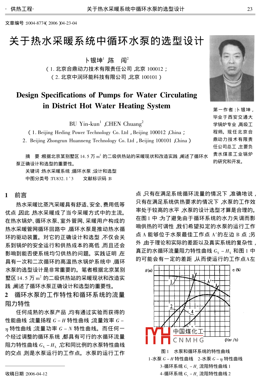 供熱工程.關(guān)于熱水采暖系統(tǒng)中循環(huán)水泵的選型設(shè)計(jì)23文章編號:1004-8774( 2006 )04-23-04 .卜銀坤'陳 闖( 1.北京合鼎動力技術(shù)有限責(zé)任公司北京100012 ;( 2.北京中潤環(huán)能科技有限公司北京100101 )Design Specifications of Pumps for W ater Circulatingin District Hot W ater Heating System第一作者:卜銀坤,畢業(yè)于西安交通大BU Yin-kun' CHEN Chuang學(xué)鍋爐專業(yè)高級工( 1. Bejing Heding Power Technology Co. Ltd , Bejing 100012 ,China ;程師?,F(xiàn)任北京合2. Beijing Zhongrun Huanneng Technology Co. Ltd , Beijing 100101 ,China )鼎動力技術(shù)有限責(zé)任公司總工主要負(fù)摘要根據(jù)北京某別墅區(qū)14.5萬m2的二級供熱站的采暖現(xiàn)狀和改造實(shí)踐闡述了循環(huán)水責(zé)水煤漿工業(yè)鍋爐的研究和開發(fā)。泵正確設(shè)計(jì)和選型的重要性。關(guān)鍵詞熱水采暖系統(tǒng);循環(huán)水泵設(shè)計(jì)和選型中圖分類號TU832. 1*3文 獻(xiàn)標(biāo)識碼:B1前言點(diǎn),只有在滿足系統(tǒng)循環(huán)流量的情況下,準(zhǔn)確地說,熱水采暖比蒸汽采暖具有舒適、安全、費(fèi)用低等只有在滿足系統(tǒng)供熱要求的情況下,水泵的工作效優(yōu)點(diǎn),因此熱水采暖成了當(dāng)今采暖方式中的主流。率處于較高的水平水泵的設(shè)計(jì)選型才算是合理的。在熱水鍋爐、循環(huán)水泵、室外管網(wǎng)、采暖用戶構(gòu)成的在圖1中:為了避免由于循環(huán)系統(tǒng)的水力失調(diào)而影熱水采暖管網(wǎng)循環(huán)回路中循環(huán)水泵是推動熱水循響供熱的可調(diào)性我們希望擬定的水泵的運(yùn)行工作環(huán)的驅(qū)動裝置。對它的正確設(shè)計(jì)和選型,不僅會關(guān)點(diǎn)A能夠位于水泵最佳工作點(diǎn)A'的左邊B點(diǎn);另系到鍋爐的安全運(yùn)行和供熱成本的高低,而且還會外,由于理論和實(shí)際的差距以及真實(shí)系統(tǒng)的復(fù)雜性,影響到能否使系統(tǒng)均勻供熱的問題。實(shí)踐證明在真正的水循環(huán)流量阻力特性曲線Gx -Hy和圖1中具有一次和二次循環(huán)的高溫?zé)崴仩t系統(tǒng)中,循環(huán)的可能會有-定的差距,從而使運(yùn)行的工作點(diǎn)A左水泵的選型設(shè)計(jì)是非常重要的。筆者根據(jù)北京某別H(m)η (%)t BF墅區(qū)14.5萬m2的二級供熱站的采暖現(xiàn)狀和改造實(shí)踐闡述了循環(huán)水泵正確設(shè)計(jì)和選型的重要性。2循環(huán)水泵的工作特性和循環(huán)系統(tǒng)的流量阻力特性任何成熟的水泵產(chǎn)品均有通過實(shí)驗(yàn)而獲得的性能曲線流量揚(yáng)程G-H特性曲線流量效率G-η特性曲線;流量功率G-N特性曲線。而任何一中國煤化工個經(jīng)過調(diào)整的循環(huán)系統(tǒng)都具有可行的水循環(huán)流量阻力特性曲線Gx - Hx ,它和同比例的水泵特性曲線MYHCNMHGQ(m3 /h)的交點(diǎn)則是水泵運(yùn)行的工作點(diǎn)。水泵的運(yùn)行工作圖1水泵和循環(huán)系統(tǒng)的特性曲線1-水泵G-H特性曲線2-水泵G-η特性曲線3-循環(huán)系統(tǒng)G,-H,流阻特性曲線1收稿日期2006-04-124_循環(huán)系統(tǒng)G、-H、流阻特性曲線224工業(yè)鍋爐2006年第4期(總第98期)右偏移。為了保持較穩(wěn)定的水泵壓頭,以便獲得較曲線Gx - H、較陡的循環(huán)系統(tǒng)2來說會更加嚴(yán)重;好的采暖效果應(yīng)當(dāng)選用C-H特性曲線較平坦的由繪圖表明對于流量阻力特性曲線Gx - H、較陡水泵單臺運(yùn)行的水泵,擬采用BA型、SH型、SA的循環(huán)系統(tǒng)2來說增加并聯(lián)水泵的臺數(shù)總流量增型1。加得十分有限然而系統(tǒng)運(yùn)行的效率卻明顯降低功3關(guān)于水泵的并聯(lián)運(yùn)行率自然會增加很多。在生產(chǎn)實(shí)踐中水泵的并聯(lián)運(yùn)行是常有的事了3.2不同水泵的并 聯(lián)運(yùn)行解它的機(jī)理對于合理運(yùn)用是十分必要的。兩臺不同型號的水泵并聯(lián)工作于一個循環(huán)系3.1相同水泵的并 聯(lián)運(yùn)行統(tǒng)用于分析并聯(lián)泵組工作特性的曲線圖其繪圖的特性曲線完全相同的水泵并聯(lián)工作于一個循環(huán)方法和前述類同。在圖3中過2*泵零流量的工作系統(tǒng),它們合成的流量揚(yáng)程G,-H,特性曲線應(yīng)該點(diǎn)的水平線,與!"泵的流量揚(yáng)程G-H特性曲線相稱其為泵組運(yùn)行特性曲線是由單機(jī)特性曲線疊加交于B點(diǎn)特性曲線不同的1*和2*水泵并聯(lián)后其而成的。即在同一合成的壓頭H,(縱坐標(biāo))下把各合成的流量揚(yáng)程特性曲線C,-H, ,只能從B點(diǎn)開單機(jī)的流量相加作為合成的流量Q.(橫坐標(biāo))。圖始。從圖3可以清楚地看出只有在1"泵的壓頭隨2是兩臺特性曲線完全相同的水泵,并聯(lián)后分別工著流量的增加而減少到相應(yīng)于圖中B點(diǎn)的數(shù)值時,作于兩個不同的循環(huán)系統(tǒng)序3循環(huán)系統(tǒng)1的流量2*泵才能有效地協(xié)同1"泵開始并聯(lián)運(yùn)行在此之前,阻力特性曲線G、-H、相對于序4循環(huán)系統(tǒng)2的要2*泵只能是空轉(zhuǎn)而做無用功;如果循環(huán)系統(tǒng)的阻力平坦一些。在圖2中:根據(jù)疊加繪圖的原理過c,較大其Gx-Hx流量阻力特性曲線與泵組合成特- H,特性曲線上的任意一點(diǎn)c 的水平線,與單機(jī)c性曲線G.-H 的交點(diǎn)比B點(diǎn)高則2"水泵將永遠(yuǎn)- H特性曲線的交點(diǎn
