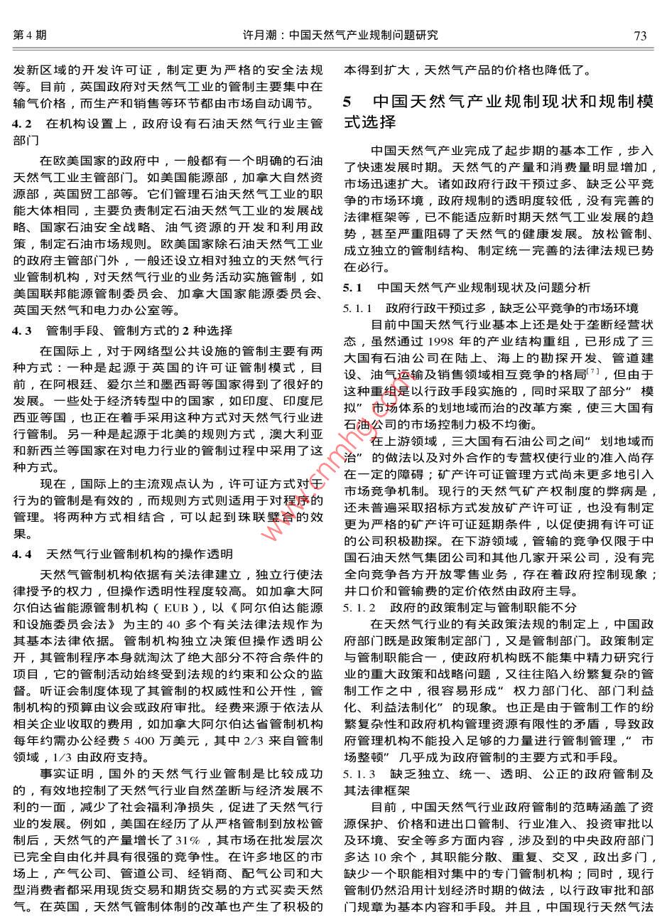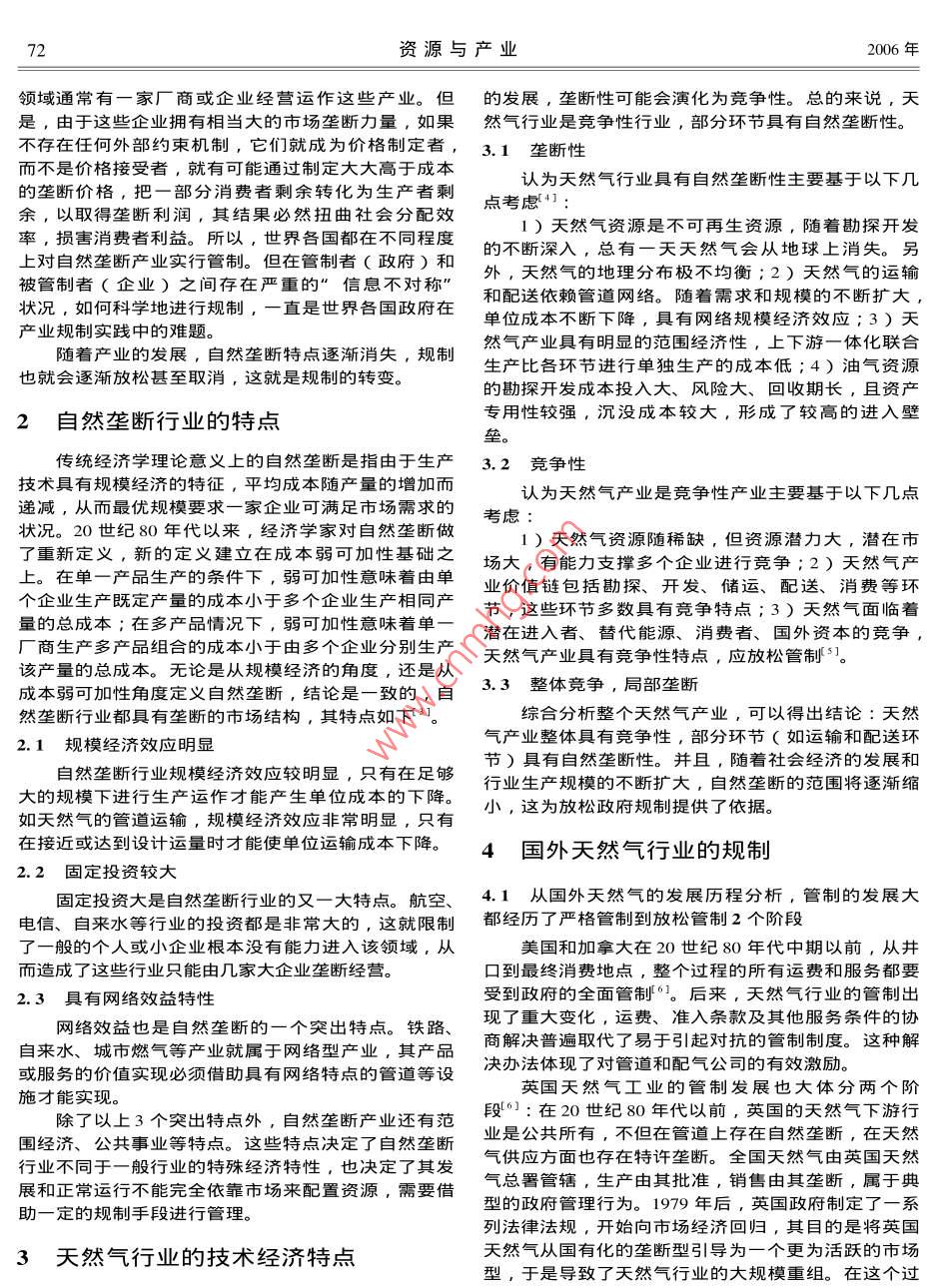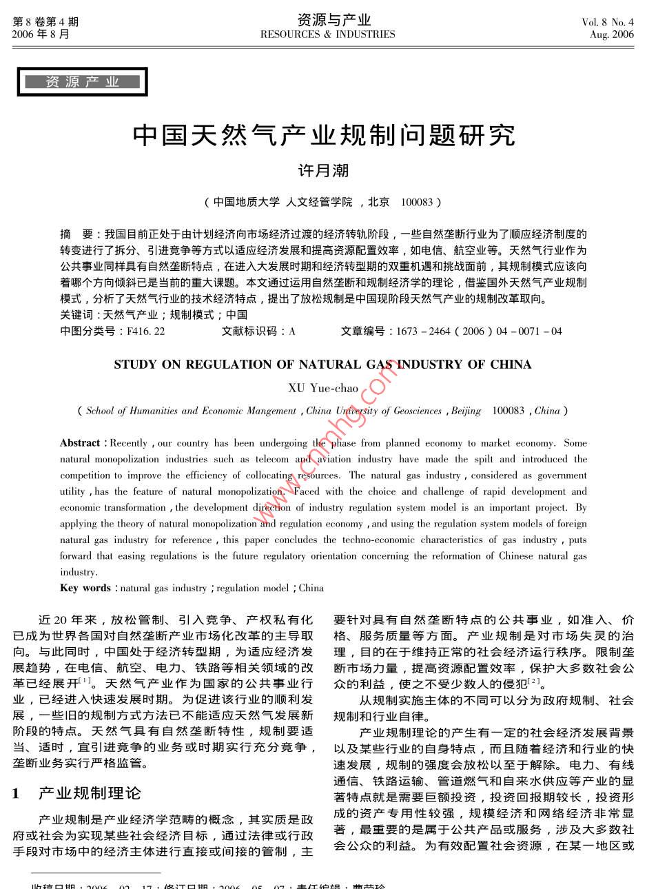 第8卷第4期資源與產(chǎn)業(yè)Vol 8 No. 42006年8月RESOURCeS IndustriesAug.2006資源產(chǎn)業(yè)中國天然氣產(chǎn)業(yè)規(guī)制問題研究許月潮中國地質(zhì)大學人文經(jīng)管學院,北京100083)摘要:我國目前正處于由計劃經(jīng)濟向市場經(jīng)濟過渡的經(jīng)濟轉(zhuǎn)軌階段,一些自然壟斷行業(yè)為了順應經(jīng)濟制度的轉(zhuǎn)變進行了拆分、引進競爭等方式以適應經(jīng)濟發(fā)展和提高資源配置效率,如電信、航空業(yè)等。天然氣行業(yè)作為公共事業(yè)同樣具有自然壟斷特點,在進入大發(fā)展時期和經(jīng)濟轉(zhuǎn)型期的雙重機遇和挑戰(zhàn)面前,其規(guī)制模式應該向著哪個方向傾斜已是當前的重大課題。本文通過運用自然壟斷和規(guī)制經(jīng)濟學的理論,借鑒國外天然氣產(chǎn)業(yè)規(guī)制模式,分析了天然氣行業(yè)的技術經(jīng)濟特點,提岀了放松規(guī)制是中國現(xiàn)階段天然氣產(chǎn)業(yè)的規(guī)制改革取向。關鍵詞天然氣產(chǎn)業(yè);規(guī)制模式;中國中圖分類號:F416.22文獻標識碼:A文章編號:1673-2464(2006)04-0071-04STUDY ON REGULATION OF NATURAL GAS INDUSTRY OF CHIINAXU Yue-chaoSchool of Humanities and Economic Mangement, China University of Geosciences, Beijing 100083, ChinaAbstract: Recently our country has been undergoing the phase from planned economy to market economy. Somenatural monopolization industries such as telecom and aviation industry have made theompetition to improve the efficiency of collocating resources. The natural gas industry, considered as governmentutility has the feature of natural monopolization. Faced with the choice and challenge of rapid development andeconomic transformation the development direction of industry regulation system model is an important project. Byapplying the theory of natural monopolization and regulation economy and using the regulation system models of foreignnatural gas industry for reference, this paper concludes the techno-economic characteristics of gas industry, putsforward that easing regulations is the future regulatory orientation concerning the reformation of Chinese natural gasndustryKey words: natural gas industry regulation model China近20年來,放松管制、引入競爭、產(chǎn)權私有化要針對具有自然壟斷特點的公共事業(yè),如準入、價已成為世界各國對自然壟斷產(chǎn)業(yè)市場化改革的主導取格、服務質(zhì)量等方面。產(chǎn)業(yè)規(guī)制是對市場失靈的治向。與此同時,中國處于經(jīng)濟轉(zhuǎn)型期,為適應經(jīng)濟發(fā)理,目的在于維持正常的社會經(jīng)濟運行秩序。限制壟展趨勢,在電信、航空、電力、鐵路等相關領堿旳改斷市場力量,提高資源配置效率,保護大多數(shù)社會公革已經(jīng)展開1。天然氣產(chǎn)業(yè)作為國家的公共事業(yè)行眾的利益,使之不受少數(shù)人的侵犯2業(yè),已經(jīng)進入快速發(fā)展時期。為促進該行業(yè)的順利發(fā)從規(guī)制實施主體的不同可以分為政府規(guī)制、社會展,一些舊的規(guī)制方式方法已不能適應天然氣發(fā)展新規(guī)制和行業(yè)自律。階段的特點。天然氣具有自然壟斷特性,規(guī)制要適產(chǎn)業(yè)規(guī)制理論的產(chǎn)生有一定的社會經(jīng)濟發(fā)展背景當、適時,宜引進競爭的業(yè)務或時期實行充分競爭,以及某些行業(yè)的自身特點,而且隨著經(jīng)濟和行業(yè)的快壟斷業(yè)務實行嚴格監(jiān)管。速發(fā)展,規(guī)制的強度會放松以至于解除。電力、有線通信、鐵路運輸、管道燃氣和自來水供應等產(chǎn)業(yè)的顯1產(chǎn)業(yè)規(guī)制理論著特點就是需要巨額投資,投資回報期較長,投資形產(chǎn)業(yè)規(guī)制是產(chǎn)業(yè)經(jīng)濟學范疇的概念,其實質(zhì)是政成的資產(chǎn)專用性較強,規(guī)模經(jīng)濟和網(wǎng)絡經(jīng)濟非常顯府或社會為實現(xiàn)某些社會經(jīng)濟目標,通過法律或行政著,最重要的是屬于公共產(chǎn)品或服務,涉及大多數(shù)社手段對市場中的經(jīng)濟主體進行直接或間接的管制,主會公眾的利益。為有效配置社會資源,在某一地區(qū)或資源與產(chǎn)業(yè)2006年領域通常有一家廠商或企業(yè)經(jīng)營運作這些產(chǎn)業(yè)。但的發(fā)展,壟斷性可能會演化為競爭性??偟膩碚f,天是,由于這些企業(yè)擁有相當大的市場壟斷力量,如果然氣行業(yè)是競爭性行業(yè),部分環(huán)節(jié)具有自然壟斷性。不存在任何外部約束機制,它們就成為價格制定者,3.1壟斷性而不是價格接受者,就有可能通過制定大大高于成本的壟斷價格,把一部分消費者剩余轉(zhuǎn)化為生產(chǎn)者剩點考慮1認為天然氣行業(yè)具有自然壟斷性主要基于以下幾余,以取得壟斷利潤,其結(jié)果必然扭曲社會分配效率,損害消費者利益。所以,世界各國都在不同程度1)天然氣資源是不可再生資源,隨著勘探開發(fā)上對自然壟斷產(chǎn)業(yè)實行管制。但在管制者(政府)和的不斷深入,總有一天天然氣會從地球上消失。另被管制者(企業(yè))之間存在嚴重的“信息不對殄冖外,天然氣的地理分布極不均衡;2)天然氣的運輸狀況,如何科學地進行規(guī)制,一直是世界各國政府在和配送依賴管道網(wǎng)絡。隨著需求和規(guī)模的不斷擴大,產(chǎn)業(yè)規(guī)制實踐中的難題單位成本不斷下降,具有網(wǎng)絡規(guī)模經(jīng)濟效應;3)天隨著產(chǎn)業(yè)的發(fā)展,自然壟斷特點逐漸消失,規(guī)