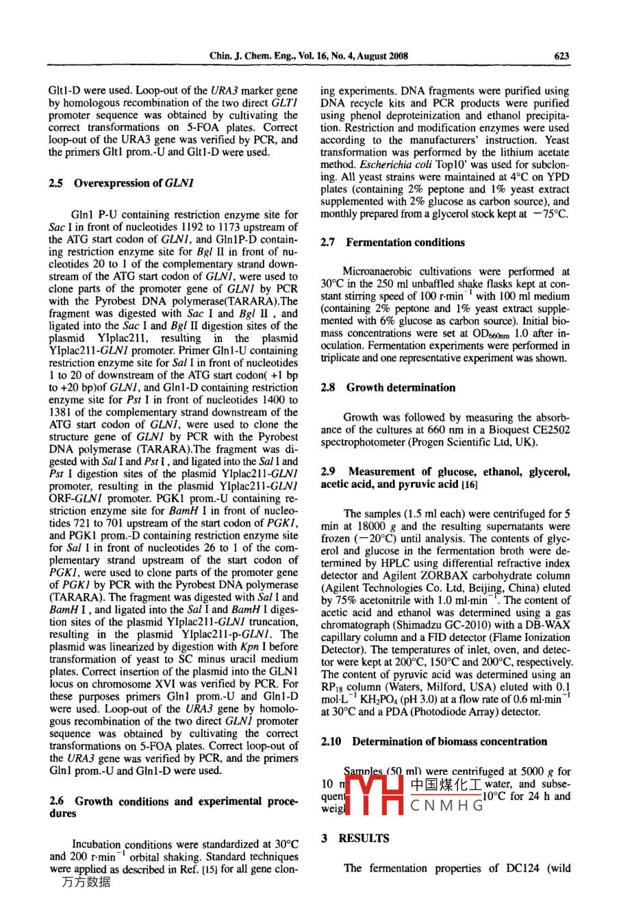 Chinese Joumal of Chemical Engineering, 16(4)620--625(2008)Improve ethanol Yield Through Minimizing glycerol Yield inEthanol Fermentation of Saccharomyces cerevisiaeZHANG Aili(張愛利) and CHEN Xun(陳洶)School of Chemical Engineering and Technology, Tianjin University. Tianjin 300072, ChinaAbstract In ethanol fermentation of Saccharomyces cerevisiae (S. cerevisiae), glycerol is one of the mainby-products. The purpose of this investigation was to increase ethanol yield through minimizing glycerol yieldn which FPS/ encoding a channel protein that mediates glycerol export and gPD2 encoding oneglycerol-3-phosphate dehydrogenase were knocked-out using one-step gene replacement. GLTI and GLNI that en-code glutamate synthase and glutamine synthetase, respectively, werement in psl△gpd2△ mutant. The fermentation properties of ZAL69sl△:EU2gpd2△:URA3)andupsLND)under miared with those of wild type(DC124) Consumption of glucose, yield of ethanol, yield of glycerol, acetic acid, andpyruvic acid were monitored. Compared with wild type, the ethanol yield of ZAL69 and ZAL808 were improved13. 17%and 6.66 %, respectively, whereas glycerol yield decreased by 37. 4 and 41.7 %. Meanwhile, aceticacid yield and pyruvic acid yield decreased dramatically compared to wild type. Our results indicate that FPS/ andGPD2 deletion of S. cerevisiae resulted in reduced glycerol yield and increased ethanol yield, but simultaneous over-expression of GLTI and GLNI in fps lAgpd2A mutant did not have a higher ethanol yield than fps / Agpd2A mutant.Keywords Saccharomyces cerevisiae, ethanol yield, glycerol yield, gene knock-out, gene over-express, FPSIGPD2, GLNI GLTI1 INTRODUCTIONGPPI is stimulated under anaerobicns[2-6Glycerol-3-Phosphate dehydrogenaseot glycIn ethanol fermentation of Saccharomyces cereerol phosphatase, is rate-limiting forvisiae(S cerevisiae), in addition to biomass and cartion in S cerevisiae (71bon dioxide, a number of byproducts are produced,Ammonium is often used as nitrogen source insuch as glycerol and organic acids (e.g, acetic acid industrial fermentations of S. cerevisand pyruvic acid, succinic acid). Approximately 5% across the membrane into the cytoplasm, ammoniumcarbon source is converted into glycerol in ethanols assimilated into glutamate by reaction withfermentation. Eliminating formation of glycerol can a-oxoglutarate This consists of two coupled reactionsbe used to increase ethanol yield of S. cerevisiae catalyzed by glutamate synthase(GOGAT)(Reactionwithout increasing the overall cost of carbon source. I), encoded by GLTI, and glutamine synthetase(GS)Fig. 1 presents important pathways of glycerol and (Reaction 2), encoded by GLNI. The expression andethanol metabolism in S cerevisiaeregulation of glutamate synthase (GoGAT) have beenGlycerol formation has two roles in the fermerreportedtation of S. cerevisiae [1]. Under anaerobic fermenta-a-oxoglutarate glutamine +NADH-tions when the respiratory chain is not functioning, netlutamate +NADformation of NADH produced during synthesis ofglycerol in order to avoid a serious imbue ormation of glutamate +NH4+ATP-gutamine ADP + Pibiomass and organic acids, i.e., acetic acid, and pyruvic acid, must be reoxidized to nad balance in theNAD/NADH ratio. Synthesis of I mol glycerol froma-oxoglutarate+NH4+NADH+ATP→→glucose leads to reoxidation of 1 mol NADH. Fur-thermore, during growth under osmotic stress condiglutamate NAD+ ADP + Pitions, glycerol is formed and accumulated inside theBy over-expressing both GLTI and GLNI it shouldcell where it works as an efficient osmolyte that pro- be possible to convert NADH to NAD in the synthe-tects the cell against lysis.sis of glutamate from ammonium and 2-oxoglutarateThe yield of glycerol is controlled by its biosyn- resulting in a reduced surplus formation of NADH andthetic pathway as well as by regulated transmembrane thus, a lower glycerol production. The geneticallycolytic intermediate dihydroxyacetone phosphate in quirement for synthesis of ATP because Reaction 2two steps catalyzed by NAD-dependent glycerol-3- requires ATP. Presumably the larger drain of ATP willphosphate dehydrogenase and glycerol-3-phosphate be compensated by a higher ethanol production[8].phosphatase. Both enzymes are encoded by two simibeen used for construction oflar isogenes, GPDI plus GPD2 and GPPI plus GPP2, high中國煤化工 violae, for examively. Expression of GPDIiPPduced by high osmolarity, whereas that of GPDZ and glycerCNMH Ge resulting higherReceived 2007-08-13, accepted 2008-03-26supported by the National High Technology Research and Development Program of China(2002AA647040)Towhomcorrespondenceshouldbeaddressed.E-mail:chenxun@tju.edu.cnChin J. Chem Eng, Vol. 16, No. 4, August 200621mass部fructose-1. 6BPbiomass eglyceraldenhvde- 3P+ dihydroxyacetone-PNADH GPDIGPD212NADGUT2phosphoglyceratebiomass +3-phosphoglycerateFPS/2-phosphoglyceratephosphNADH NADNADHTCAFigure 1 Important pathways of glycerol and ethanol metabolism in S cerevisiaeimportant enzyme: I--hexokinase(glucokinase); 2- phosphoglucose isomerase: 3-phasphofructokinase 4--aldolase5-triose phosphate isomerase: 6--NAD-dependent glycerol-3-phosphate dehydrogenase; 7--glycerol-3-phosphatase8-glycerolaldehyd-3-phosphate dehydrogenase; 9- phosphoglycerate kinase; I0--phosphoglycerate mutase: 11enolase: 12- pyruvate kinase; 13- pyruvate decarboxylase; 14--alcohol dehydrogenase: 15--aldehyde dehydrogenase16-glycerol kinase: 17--FAD-dependent glycerol-3-phosphate dehydrogenasethanol yield [9-11], deletion of FPSI to increase 2.2 Plasmids and strains constructionsethanol yield [12], and simultaneous overexpression ofGLTI and GLNI resulting in higher ethanol yield [8]he primers and plasmids used in this study wereBut there have been no reports about the applications described in Table 2 and Table 3, respectivelyof deletion of both fpsi and gPd or simultaneousoverexpression of GLT/ and GLNI in fps/△gpd2△mutant. Hence, the purpose of this study was to inves2.3 D