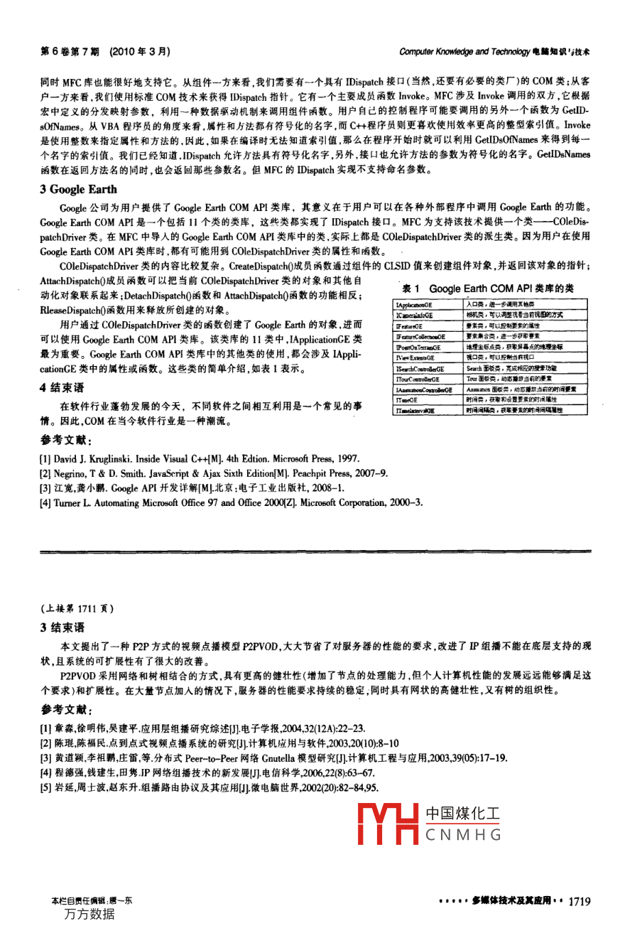 lssN10093044E-mail:eduf@cccc.net.cnCamputer Knowledge and Technology電知識(shí)與技術(shù)VoL6, No. 7, March 2010, pp. 1718-1719Tel:+86551-56909635690964coM組件技術(shù)的應(yīng)用沈樹茂(蘇州大學(xué)計(jì)算機(jī)科學(xué)與技術(shù)學(xué)院,江蘇蘇州215006)摘要:COM的全名為 Component Object Model. COM是一種協(xié)議,它建立了一個(gè)軟件模塊同另一個(gè)軟件模塊之間的連接,它是許多新的 Microsoft Activex技術(shù)的基礎(chǔ),它現(xiàn)在威了 Microsoft Windows整體的一部分。不久之后,大多數(shù)的 Windows程都會(huì)涉及到CoM。兩個(gè)模塊之間就可以通過稱為“接口”的機(jī)制來(lái)進(jìn)行通訊。這些接口既不需要靜態(tài)的或動(dòng)態(tài)的連捶入口點(diǎn),也不需要鳊碼很復(fù)雜的地址,這和那些勝于啟動(dòng)通訊過程的一般COM函數(shù)有所不同。我們可以利用它的特性做一些應(yīng)用。關(guān)鍵詞:COM;OLE;自動(dòng)化中圖分類號(hào):TP311文獻(xiàn)標(biāo)識(shí)碼:A文章編號(hào):1009-304(2010)07-1718-02組件可以分為進(jìn)程內(nèi)組件和進(jìn)程外組件兩類。進(jìn)程內(nèi)組件運(yùn)行效率較高,以DLL(動(dòng)態(tài)鏈接庫(kù))的形式出現(xiàn)。進(jìn)程外組件的運(yùn)行效率相對(duì)較低,但是進(jìn)程外組件可以被遠(yuǎn)程調(diào)用。當(dāng)外部程序與組件不在同一臺(tái)機(jī)器,甚至不在同一個(gè)網(wǎng)絡(luò),都可以調(diào)用進(jìn)程外組件。進(jìn)程外組件以EXE(可執(zhí)行程序)的形式出現(xiàn)。Oice自動(dòng)化 JavaScript, Google Earth屬于進(jìn)程組件的范疇。文章將具體討論進(jìn)程外組件的應(yīng)用。1 Office自動(dòng)化Ofce自動(dòng)化應(yīng)用又叫“OLE自動(dòng)化”基于COM(組件對(duì)象模型)的一項(xiàng)技術(shù)。這項(xiàng)技術(shù)可以嵌入到應(yīng)用程序中根據(jù)需要導(dǎo)出大量采集的數(shù)據(jù)并生成各類圖表。使用它可以帶來(lái)非常大的方便用戶根本不需要了解 office,就能使用 Excel,Word, PowerPoint的各種功能Oce自動(dòng)化應(yīng)用包含客戶端和服務(wù)器??蛻舳诉B接服務(wù)器才能夠使用服務(wù)器提供功能。從概念上可以知道,客戶端就是應(yīng)用程序,服務(wù)器就是Oice辦公軟件所有的 Microsoft office應(yīng)用程序都有自己的腳本語(yǔ)言。這就可以在應(yīng)用程序中用來(lái)實(shí)現(xiàn)一些我們想完成的一切功能。這種腳本語(yǔ)言就是ⅤBA( Microsoft Visual Basic for Applications)VBA程序組或宏的功能其實(shí)跟Omie自動(dòng)化應(yīng)用從外部實(shí)現(xiàn)是一樣的。所以可以把VBA翻譯成我們編寫客戶端的語(yǔ)言來(lái)實(shí)現(xiàn)自動(dòng)化1)Oice對(duì)象模型Microsoft Office程序使用可編程的對(duì)象集合來(lái)給外部使用。每一個(gè)內(nèi)容單元和功能在Oce中都是一個(gè)可編程測(cè)試和控制的對(duì)象。工作簿,文檔,表格,單元格和段落都是對(duì)象的 Microsoft Office提供的對(duì)象。2)對(duì)象,方法,屬性Microsoft Office程序每一個(gè)對(duì)象的層次結(jié)構(gòu)就像家庭樹一樣。這個(gè)結(jié)構(gòu)被稱之為對(duì)象模型。每個(gè)對(duì)象模型都有一個(gè)至高無(wú)上的對(duì)象,用來(lái)派生其它對(duì)象。一般這樣的對(duì)象代表程序的本身,取名為 Application對(duì)象Application對(duì)象擁有自己的子對(duì)象。為了讓我們更清楚地了解層次結(jié)構(gòu)。你可以看一下 Microsoft Excel提口供的對(duì)象。圖1顯示了 Excel對(duì)象部分層次結(jié)構(gòu)。□可見Exce對(duì)象的最高級(jí)別對(duì)象就是 Application, Application有兩個(gè)圖1 Excel部分對(duì)象模型和對(duì)象之間的關(guān)系子對(duì)象:工作簿集( Workbooks),工具欄集( Command Bars)。這兩個(gè)對(duì)象也包含其它的對(duì)象。 Workbooks包含多個(gè)工作簿( Workbook), Command Bars包含多個(gè)工具欄( Command Bar)。 Workbook包括兩個(gè)子對(duì)象,工作表集( Worksheets)和圖表集(Chas) Worksheet又包括范圍( Range)和形式集( Shapes)這樣的列毒還會(huì)繼續(xù)延續(xù),但這已經(jīng)能夠幫你理解對(duì)象模型的層次結(jié)構(gòu)。理解對(duì)象之間的關(guān)系是自動(dòng)化技術(shù)應(yīng)用的基礎(chǔ)個(gè)對(duì)象本身是不能做任何事情。你需要使用對(duì)象提供方法和屬性。屬性是一種用來(lái)設(shè)置和獲取對(duì)象特性的功能。方法是種用來(lái)實(shí)現(xiàn)對(duì)象特有的一些功能從 Excel對(duì)象模型可以看出什么是方法和屬性。 Range對(duì)象代表工作表中的一個(gè)或多個(gè)單元格所占區(qū)域 Range包含一些屬性:內(nèi)容數(shù)字格式,字體。這些屬性可以用 Range的性能來(lái)操作。此外還有一些方法來(lái)操作 Range: Select方法, delete方法,Copy方法。在 Visual Basic中你需要使用一個(gè)對(duì)象,必須從最高級(jí)對(duì)象開始。2 JavaScriptC+與 Javascript的相互通信需要用到 IDispatch接口, IDispatch是自H中國(guó)煤化工( marshaling))所支持CNMHG收稿日期:2010-01-021718··多體技術(shù)及其用:.4本欄目費(fèi)任編盟唐一東第6卷第7期(2010年3月Computer Knowledge and Technology電腦知識(shí)技術(shù)同時(shí)MFC庫(kù)也能很好地支持它。從組件一方來(lái)看我們需要有一個(gè)具有 IDispatch接口(當(dāng)然還要有必要的類廠)的COM類;從客戶一方來(lái)看我