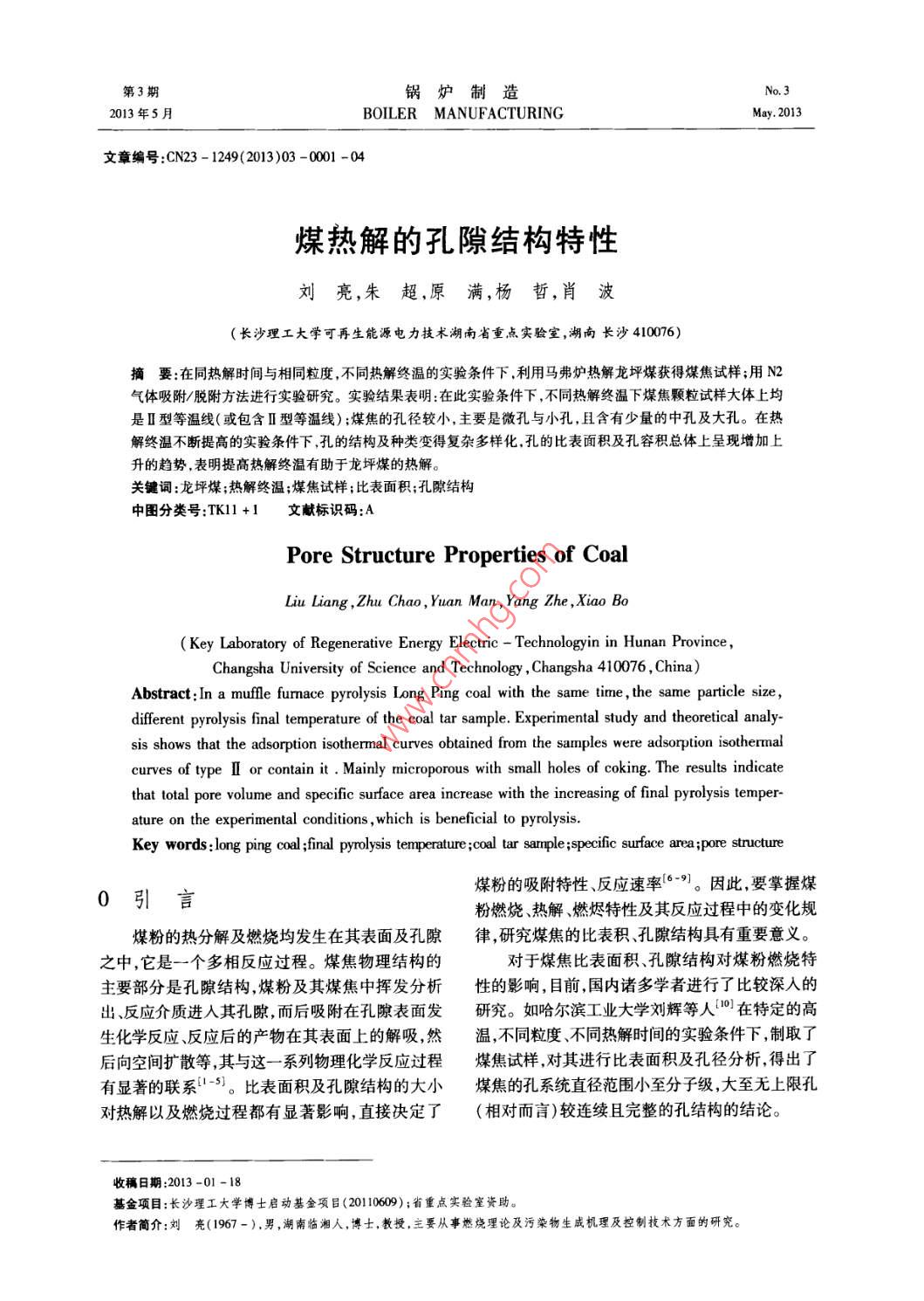 第3期鍋爐制造2013年5月BOILER MANUFACTURINGMay,2013文章編號:CN23-1249(2013)03-0001-04煤熱解的孔隙結(jié)構(gòu)特性劉亮,朱超,原滿,楊哲,肖波(長沙理工大學(xué)可再生能源電力技術(shù)湖南省重點(diǎn)實(shí)驗(yàn)室,湖南長沙410076)摘要:在同熱解時間與相同粒度,不同熱解終溫的實(shí)驗(yàn)條件下,利用馬弗爐熱解龍坪煤獲得煤焦試樣;用№2氣體吸附/脫附方法進(jìn)行實(shí)驗(yàn)研究。實(shí)驗(yàn)結(jié)果表明:在此實(shí)驗(yàn)條件下,不同熱解終溫下煤焦顆粒試樣大體上均是Ⅱ型等溫線(或包含Ⅱ型等溫線);煤焦的孔徑較小,主要是微孔與小孔,且含有少量的中孔及大孔。在熱解終溫不斷提高的實(shí)驗(yàn)條件下,孔的結(jié)構(gòu)及種類變得復(fù)雜多樣化孔的比表面積及孔容積總體上呈現(xiàn)增加上升的趨勢,表明提高熱解終溫有助于龍坪煤的熱解。關(guān)鍵詞:龍坪煤;熱解終溫;煤焦試樣;比表面積;孔隙結(jié)構(gòu)中圖分類號:TKl1+1文獻(xiàn)標(biāo)識碼:APore Structure Properties of CoalLiu liang, Zhu Chao, Yuan Man, Yang Zhe, Xiao BoKey Laboratory of Regenerative Energy Electric-Technologyin in Hunan ProvinceChangsha University of Science and Technology, Changsha 410076, China)Abstract: In a muffle furmace pyrolysis Long Ping coal with the same time, the same particle size,different pyrolysis final temperature of the coal tar sample. Experimental study and theoretical analy-sis shows that the adsorption isothermal curves obtained from the samples were adsorption isothermalcurves of type I or contain it. Mainly microporous with small holes of coking. The results indicatethat total pore volume and specific surface area increase with the increasing of final pyrolysis temper-ature on the experimental conditions, which is beneficial to pyrolysisKey words: long ping coal final pyrolysis temperature; coal tar sample; pecific surface area; pore structure0引言煤粉的吸附特性、反應(yīng)速率6”。因此,要掌握煤粉燃燒、熱解、燃燼特性及其反應(yīng)過程中的變化規(guī)煤粉的熱分解及燃燒均發(fā)生在其表面及孔隙律,研究煤焦的比表積、孔隙結(jié)構(gòu)具有重要意義。之中,它是一個多相反應(yīng)過程。煤焦物理結(jié)構(gòu)的對于煤焦比表面積、孔隙結(jié)構(gòu)對煤粉燃燒特主要部分是孔隙結(jié)構(gòu)煤粉及其煤焦中揮發(fā)分析性的影響,目前,國內(nèi)諸多學(xué)者進(jìn)行了比較深入的出、反應(yīng)介質(zhì)進(jìn)入其孔隙,而后吸附在孔隙表面發(fā)研究。如哈爾濱工業(yè)大學(xué)劉輝等人在特定的高生化學(xué)反應(yīng)、反應(yīng)后的產(chǎn)物在其表面上的解吸然溫,不同粒度、不同熱解時間的實(shí)驗(yàn)條件下,制取了后向空間擴(kuò)散等,其與這一系列物理化學(xué)反應(yīng)過程煤焦試樣,對其進(jìn)行比表面積及孔徑分析,得出了有顯著的聯(lián)系-)。比表面積及孔隙結(jié)構(gòu)的大小煤焦的孔系統(tǒng)直徑范圍小至分子級大至無上限孔對熱解以及燃燒過程都有顯著影響,直接決定了(相對而言)較連續(xù)且完整的孔結(jié)構(gòu)的結(jié)論。收稿日期:2013-01-18基金項(xiàng)目:長沙理工大學(xué)博士啟動基金項(xiàng)目(20110609);省重點(diǎn)實(shí)驗(yàn)室資助。作者簡介:劉亮(1967-),男,湖南臨湘人,博士,教授,主要從事燃燒理論及污染物生成機(jī)理及控制技術(shù)方面的研究。鍋爐制造總第239期燃燒煤粉過程中,燃燒反應(yīng)的條件及燃燒物顆孔隙的結(jié)構(gòu)特征:德·博爾(de·Boer)將吸附回線粒的物理結(jié)構(gòu)決定其燃燒速率、燃燼率;孔隙越多,歸納為A類、B類、C類、D類、E類五大類;在氣體與固體顆粒吸附表面積越大,接觸更良好,增德·博爾提出分類的基礎(chǔ)上,國際純化學(xué)與應(yīng)用化強(qiáng)了反應(yīng)的機(jī)會,對燃燒越有利,熱解過程的分析學(xué)聯(lián)合會推薦將吸附回線分為:田、丑2、H和H4也可依此類推。因此,本研究通過比表面積及孔隙四類;通過對煤樣曲線的分析陳萍和唐修義2歸分析儀對不同熱解終溫下產(chǎn)生的龍坪煤焦炭顆粒納出:L1、12和13三類吸附回線。因?yàn)楸疚闹械倪M(jìn)行等溫N2氣體吸/脫附實(shí)驗(yàn),旨在分析說明煤焦吸/脫附曲線類型更相似于陳萍和唐修義提出的吸表面積、內(nèi)部孔隙結(jié)構(gòu)對其燃燒特性的影響附回線類型,因此本文對孔隙結(jié)構(gòu)進(jìn)行分析選用陳實(shí)驗(yàn)方法及實(shí)驗(yàn)內(nèi)容萍和唐修義歸納的回線類型,其結(jié)果如圖1所示。煤焦熱解終溫為500℃時吸/脫附曲線如圖1.1煤樣、煤焦的制備l(a)所示,由此圖得到,煤焦熱解的吸/脫附曲線實(shí)驗(yàn)樣品為龍坪煤,將其經(jīng)105℃千燥、破較小,說明該煤焦的孔隙主要由一端封閉的不透碎、研磨、過細(xì)度200(75μm)目篩。利用5E-氣Ⅱ類孔(包括平行板狀孔、圓筒形孔、楔形孔以MACⅢ型工業(yè)分析儀進(jìn)行工業(yè)分析、 VARIO及錐形孔)組成,屬于典型的L型。MACRO CUBE型元素分析儀進(jìn)行元素分析熱解終溫為600℃、700℃時實(shí)驗(yàn)煤焦吸/脫SDACM4000型量熱儀進(jìn)行發(fā)熱量測定,其結(jié)果見附曲線分別如圖1(b)、(c)所示,通過兩圖對比表1、表2。將煤樣放入馬弗爐中燃燒7min得實(shí)可知,其具有相似的特點(diǎn),即在相對壓力(P/P=驗(yàn)所需焦顆粒,燃燒溫度分別為500℃、600℃、0.85)較大處,曲線出現(xiàn)明顯拐點(diǎn),與L2型曲線700℃