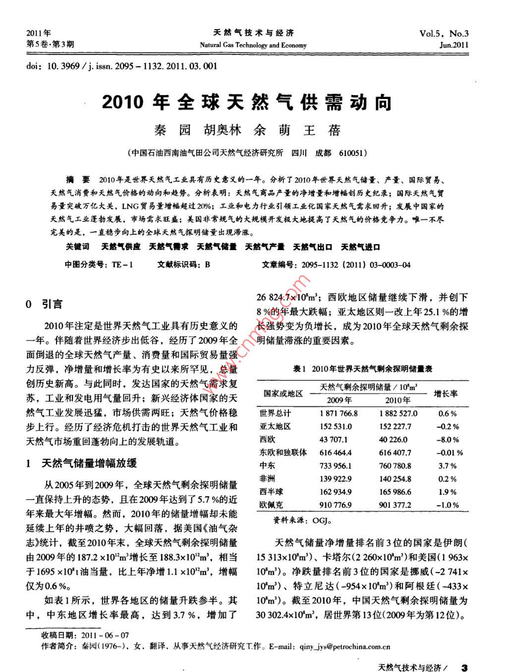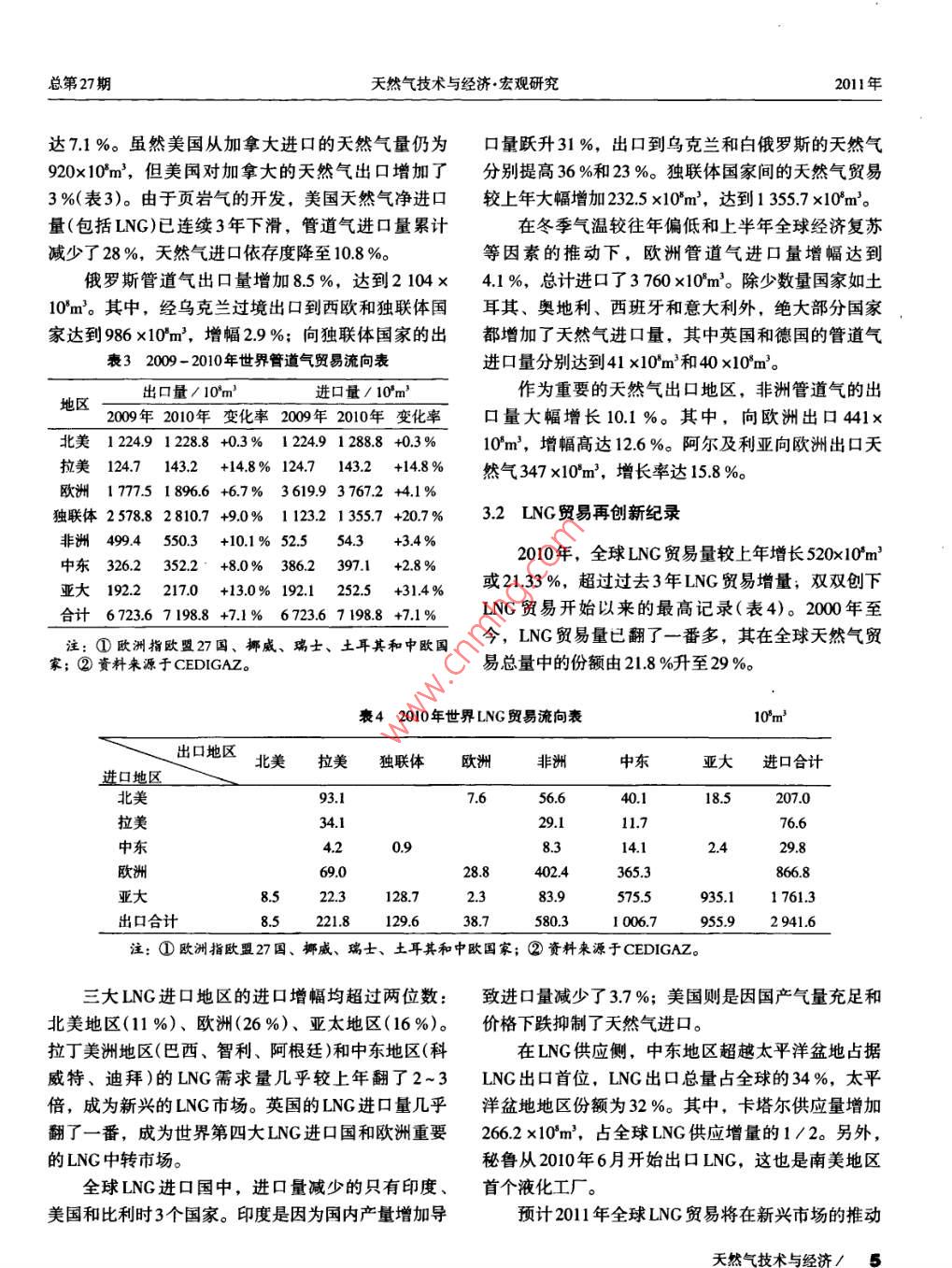 2011年天然氣技術(shù)與經(jīng)濟(jì)Vol5, No. 3第5卷·第3期Natural Gas Technology and EconomyJun.2011doi:10.3969/j.isn.2095-1132.2011.03.0012010年全球天然氣供需動(dòng)向秦園胡奧林余萌王蓓(中國石油西南油氣田公司天然氣經(jīng)濟(jì)研究所四川成都610051)摘要2010年是世界天然氣工業(yè)具有歷史意義的一年。分析了2010年世界天然氣儲(chǔ)量、產(chǎn)量、國際貿(mào)易、天然氣消費(fèi)和天然氣價(jià)格的動(dòng)向和趨勢(shì)。分析表明:天然氣商品產(chǎn)量的凈增量和增幅創(chuàng)歷史紀(jì)錄;國際天然氣貿(mào)易量突破萬億大關(guān),LNG貿(mào)易量增幅超過20%;工業(yè)和電力行業(yè)引領(lǐng)工業(yè)化國家天然氣需求回升;發(fā)展中國家的夭然氣工業(yè)蓬勃發(fā)展,市場(chǎng)需求旺盛;美國非常規(guī)氣的大規(guī)模開發(fā)極大地提高了天然氣的價(jià)格競(jìng)爭(zhēng)力。唯一不盡完美的是,一直穩(wěn)步向上的全球天然氣探明儲(chǔ)量出現(xiàn)滯漲。關(guān)鍵詞天懿氣供應(yīng)天然氣需求天然氣儲(chǔ)量天然氣產(chǎn)量天然氣出囗天然氣進(jìn)口中圖分類號(hào):TE-1文獻(xiàn)標(biāo)識(shí)碼:B文章編號(hào):2095-1132(2011)03-0003040引言268247×10m3;西歐地區(qū)儲(chǔ)量繼續(xù)下滑,并創(chuàng)下8%的年最大跌幅;亞太地區(qū)則一改上年25.1%的增2010年注定是世界天然氣工業(yè)具有歷史意義的長(zhǎng)強(qiáng)勢(shì)變?yōu)樨?fù)增長(zhǎng),成為2010年全球天然氣剩余探一年。伴隨著世界經(jīng)濟(jì)步出低谷,經(jīng)歷了2009年全明儲(chǔ)量滯漲的重要因素。面倒退的全球天然氣產(chǎn)量、消費(fèi)量和國際貿(mào)易量強(qiáng)力反彈,凈增量和增長(zhǎng)率為有史以來所罕見,總量表12010年世界天然氣剩余探明儲(chǔ)量表創(chuàng)歷史新高。與此同時(shí),發(fā)達(dá)國家的天然氣需求復(fù)天然氣剩余探明儲(chǔ)量/10m蘇,工業(yè)和發(fā)電用氣量回升;新興經(jīng)濟(jì)體國家的天增長(zhǎng)率200年2010年然氣工業(yè)發(fā)展迅猛,市場(chǎng)供需兩旺;天然氣價(jià)格穩(wěn)世界總計(jì)187176681882527006%步上行。經(jīng)歷了經(jīng)濟(jì)危機(jī)打擊的世界天然氣工業(yè)和亞太地區(qū)152531.01522277-0.2%天然氣市場(chǎng)重回蓬勃向上的發(fā)展軌道。西歐402260東歐和獨(dú)聯(lián)體616464461640770011天然氣儲(chǔ)量增幅放緩中東733956.13.7%從2005年到2009年,全球天然氣剩余探明儲(chǔ)量非洲1399229140254.802%西半球1629349165986.619%直保持上升的態(tài)勢(shì),且在2009年達(dá)到了57%的近歐佩克年來最大年增幅。然而,2010年的儲(chǔ)量增幅卻未能9107769901372-10%資料來源:OGJ。延續(xù)上年的井噴之勢(shì),大幅回落,據(jù)美國《油氣雜志》統(tǒng)計(jì),截至2010年末,全球天然氣剩余探明儲(chǔ)量天然氣儲(chǔ)量?jī)粼隽颗琶?位的國家是伊朗(由200年的1872×10m3增長(zhǎng)至1883×102m3,相當(dāng)15313×10m3)、卡塔爾(2260×10m3)和美國(1963x于1695×10t油當(dāng)量,比上年凈增1.1×10"m3,增幅10ym3)。凈跌量排名前3位的國家是挪威(-2741x僅為06%。10m3)、特立尼達(dá)(-954×10m3)和阿根廷(-433如表1所示,世界各地區(qū)的儲(chǔ)量升跌參半。其10m3)。截至2010年,中國天然氣剩余探明儲(chǔ)量為中,中東地區(qū)增長(zhǎng)率最高,達(dá)到37%,增加了303024×10m3,居世界第13位(2009年為第12位)收稿日期:2011-06-07作者簡(jiǎn)介:秦園(1976-),女,翻譯,從事天然氣經(jīng)濟(jì)研究T作。E-mail:qin_jys@petrochina.com.cn天然第5卷秦園,等:2010年全球天然氣供需動(dòng)向第3期2天然氣商品產(chǎn)量強(qiáng)勢(shì)反彈,增量和增幅均最高水平。另外兩個(gè)主要產(chǎn)氣國土庫曼斯坦和阿塞創(chuàng)歷史最高拜疆的產(chǎn)量也分別大增165%和11.6%在經(jīng)歷200年的大衰退后,2010年世界天然氣2北美:非常規(guī)氣推動(dòng)天然氣產(chǎn)量穩(wěn)定增長(zhǎng)商品產(chǎn)量以過去40年從未有過的力度反彈沖高。據(jù)雖然北美仍然保持世界各地區(qū)產(chǎn)量排名第一的國際天然氣信息中心( CEDIGAZ)統(tǒng)計(jì),2010年全球地位,但26%的增幅與其它地區(qū)相比顯得疲軟,其天然氣商品量達(dá)到320125×10m3,比2009年凈增占全球天然氣總產(chǎn)量的比重由20年的265%降至21909×10m3,增幅高達(dá)7.3%,甚至比金融危機(jī)前253%。美國天然氣產(chǎn)量較上年增長(zhǎng)48%,主要?jiǎng)拥?008年提高了約4%,創(chuàng)下歷史最高水平(圖1和力源自美國非常規(guī)天然氣產(chǎn)量的持續(xù)增加。其中表2)。頁巖氣產(chǎn)量的年增幅超過15%,占當(dāng)年全國干氣總世界主要天然氣產(chǎn)區(qū)的生產(chǎn)特點(diǎn)如下。產(chǎn)量的20%。但是,區(qū)域內(nèi)墨西哥和加拿大的產(chǎn)量繼續(xù)下降,其中,加拿大的產(chǎn)量下跌了45%,由上+2.9/8年的15953×10m3跌至15235×10m3。23歐洲:產(chǎn)量窄幅回升整個(gè)地區(qū)的天然氣商品量?jī)H較上年提高了2.1%,列倒數(shù)第一位。盡管產(chǎn)氣大國挪威和荷蘭的天然氣商品量分別增長(zhǎng)12%和25%,但英國、德國、丹麥、羅馬尼亞和匈牙利等國的產(chǎn)量仍表現(xiàn)為持續(xù)下跌。圖11975-2010年全球天然氣商品量圖24亞大地區(qū):中國和印度為產(chǎn)量增長(zhǎng)的主要力量資料來源: CEDIGAZ2010年,中國和印度的天然氣產(chǎn)量分別增加了表22010年全世界天然氣商品產(chǎn)量表