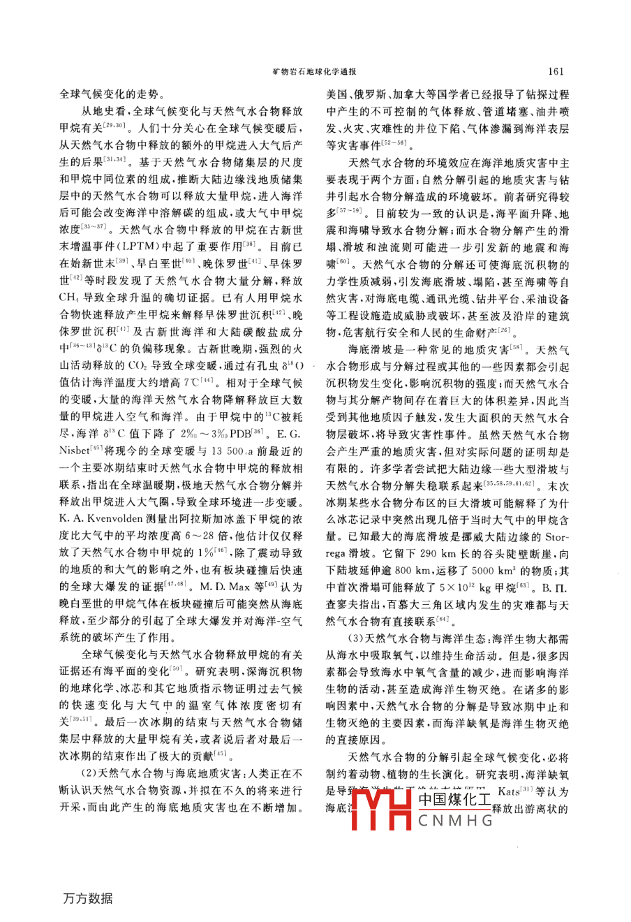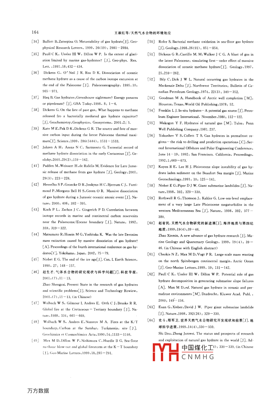 礦物巖石地球化學通報Bulletin of Mineralogy, Petrology and GeochemistryVo.23No.2,2004Apr.天然氣水合物的環(huán)境效應王淑紅,宋海斌2,顏文1.中國科學院南海海洋研究所和廣州地球化學研究所邊緣海地質重點實驗室,廣州510301;2.中國科學院地質與地球物理研究所,北京100101摘要:天然氣水合物是近些年來發(fā)現的一種新型超級潔凈能源,因其在能源勘探、海底災害環(huán)境和全球氣侯變化研究中的重要性而日益引起世界各國的高度重視。本文綜述了天然氣水合物在形成、分解過程中的加劇全球氣候變暖、海底災害和影嘲海洋生物等環(huán)境效應;指出將地質歷史時期的重大事件與天然氣水合物產生的這些環(huán)境效應結合將成為今后的主要研究方向。關鍵詞:天然氣水合物;環(huán)境效應;全球氣候變化;海底地質災害中圖分類號:P618.13文獻標識碼:A文章編號:1007-2802(2004)02-0160-06隨著社會經濟的快速發(fā)展,全球資源日益減少,物存在于地殼淺層(小于2000m),儲量巨大,當遇能源供需矛盾日趨緊張,環(huán)境和資源問題已成為21到環(huán)境變化時,溫度的升降、壓力的變化、海平面變世紀的主要議題。近年來,天然氣水合物成為開發(fā)化、沉積盆地的升降、上覆沉積物的增厚、構造活動新能源的焦點,各國都在爭先研究和開發(fā)。流體活動等都會影響天然氣水合物層的穩(wěn)定性,甚天然氣水合物( Natural Gas Hydrate,簡稱Gas至導致天然氣水合物層的破壞,釋放出天然氣,并最Hydrate),又稱籠形化合物( Clathrate)。它是在一終進入大氣圈0。定條件(合適的溫度、壓力、氣體飽和度、水的鹽度、天然氣水合物的主要成分是溫室氣體CH41pH值等)下由水和天然氣組成的類冰、非化學計CO2等,而目前進入平流層的溫室氣體中人為源量、籠形結晶化合物。天然氣水合物的主要成分為(360×102g/a)與自然源(150×102g/a)相比占有甲烷;甲烷含量大于99%的天然氣水合物通常稱為更大的通量612。20世紀60年代到1983年的測甲烷水合物-9。天然氣水合物主要分布于極地永定表明,大氣中的甲烷正以每年1%的速度增久凍土帶、海洋大陸坡、水下高地、邊緣海和內陸海,長18-2。冰芯中的氣體分析表明,在最后一次冰尤其是與泥火山、底辟構造以及大型構造斷裂有關期、間冰期的轉換過程中,空氣中的甲烷濃度變化接的地質環(huán)境1。近兩倍,即從350×10-°增加到650×10°(體積濃天然氣水合物的開發(fā)利用涉及兩個方面的問度)23-361。存在于地殼淺層的天然氣水合物含有巨題:從資源方面考慮,這一資源儲量巨大,能夠滿足大數量的甲烷(1015~10m3 at STP)2,至少是大人類未來清潔能源的需求;從環(huán)境方面考慮,作為溫氣中甲烷總量的3000倍。據報道,1mol甲烷對全室氣體甲烷的最大載體,它的開發(fā)利用又可能是引球氣候變暖產生的影響是相同量二氧化碳的3.7發(fā)全球氣候變化和海底地質災害的重要因素。因倍,如以重量計則為10倍,且甲烷氧化產物CO2此,必須有超前的防范措施,以防止其對環(huán)境造成的也是一種重要的溫室氣體,對全球環(huán)境有重大影響不良影響。天然氣水合物的環(huán)境效應已日益引起甲烷水合物的分解可能產生氣態(tài)甲烷并增加海水中世界各國的高度重視溶解態(tài)甲烷的濃度,甲烷將從過飽和的海水進入大下面我們從全球氣候變化、海底地質災害和海氣。使大氣中的甲烷濃度隨甲烷水合物的分解而增洋生態(tài)三個方面分析天然氣水合物的環(huán)境效應加。因此,存在于地殼淺表層的天然氣水合物穩(wěn)定(1)天然氣水合物與全球氣候變化:天然氣水合與否,對全球大氣組分變化造成巨大的沖擊,影響到收桶日期:2003-11-06收到,2004-0106改回基金項目:中國科學院南海海洋所創(chuàng)新領域前沿項目(byq200312)資助第一作者簡介:王淑紅(1977-),女,在讀博士生,海洋環(huán)境地球化學中國煤化工2001DA500)資助CNMHG礦物巖石地球化學通報全球氣候變化的走勢。美國、俄羅斯、加拿大等國學者已經報導了鉆探過程從地史看,全球氣候變化與天然氣水合物釋放中產生的不可控制的氣體釋放、管道堵塞、油井噴甲烷有關0。人們十分關心在全球氣候變暖后,發(fā)、火災、災難性的井位下陷、氣體滲漏到海洋表層從天然氣水合物中釋放的額外的甲烷進入大氣后產等災害事件s2生的后果3:3?;谔烊粴馑衔飪瘜拥某叨忍烊粴馑衔锏沫h(huán)境效應在海洋地質災害中主和甲烷中同位素的組成,推斷大陸邊緣淺地質儲集要表現于兩個方面:自然分解引起的地質災害與鉆層中的天然氣水合物可以釋放大量甲烷,進入海洋井引起水合物分解造成的環(huán)境破壞。前者研究得較后可能會改變海洋中溶解碳的組成,或大氣中甲烷多3-。目前較為一致的認識是,海平面升降、地濃度-3天然氣水合物中釋放的甲烷在古新世震和海嘯導致水合物分解;而水合物分解產生的滑末增溫事件(LPTM中起了重要作用。目前已塌、滑坡和濁流則可能進一步引發(fā)新的地震和海在始新世末劉、早白堊世、晚侏羅世、早侏羅嘯60。天然氣水合物的分解還可使海底沉積物的世等時段發(fā)現了天然氣水合物大量分解,釋放力學性質減弱,引發(fā)海底滑坡、塌陷,甚至海嘯等自CH導致全球升溫的確切證據。已有人用甲烷水然災害,對海底電纜通訊光纜、鉆井平臺、采油設備合物快速釋放產生甲烷來解釋早侏羅世沉積3、晚等工程設施造成威