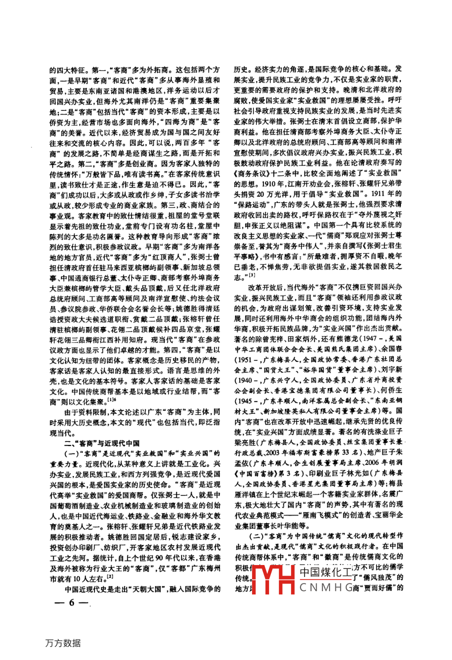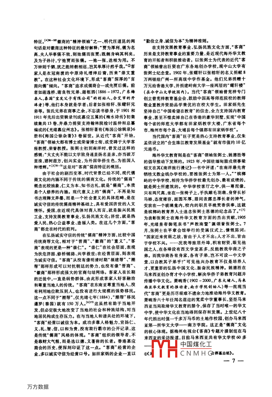 第26卷第1期嘉應(yīng)學(xué)院芓報(暫學(xué)社會科學(xué))Vol 26 No. 12008年2月JOURNAL OF JIAYING UNIVERSITY Philosophy Social Sciences)【客家學(xué)研究】“客商”與近現(xiàn)代中國O閆恩虎(嘉應(yīng)學(xué)院客商研究所,廣東梅州514015)[摘要]“客商”由傳純商幫發(fā)展成為今天跨國界的實業(yè)家組織,在近現(xiàn)代為國家復(fù)興與建設(shè)作為了杰出貢獻(xiàn)。“客商”不僅是“實業(yè)教國”和“實業(yè)興國”的重要力量,而且也是近現(xiàn)代民主革命和國家建設(shè)的積極支持者;"客商”為中國傳統(tǒng)“儒商”文化的現(xiàn)代轉(zhuǎn)型作出杰出貢獻(xiàn),是現(xiàn)代“儒商”文化的積極踐行者;“客商”也是近現(xiàn)代“華商”網(wǎng)絡(luò)的倡建者和積極推動者。新時期經(jīng)濟(jì)全球化競爭的進(jìn)一步加劇,要求當(dāng)代“客商”同所有華商一起,共同弘揚(yáng)優(yōu)秀儒商文化,團(tuán)結(jié)合作,樹立愛園濟(jì)世、誠實守信、自律自強(qiáng)的儒商情懷,提高競爭與發(fā)展素質(zhì),為國家害強(qiáng)和民族自強(qiáng)而繼續(xù)奮斗。關(guān)鍵詞]“客商”;近現(xiàn)代;實業(yè)興國;華商網(wǎng)絡(luò);“儒商”文化[中圖分類號]C955[文獻(xiàn)標(biāo)識碼]A[文章編號]1006-642X(200801-0005“客商"的內(nèi)涵、演變及其特征有羅芳伯〔1738-1795,廣東梅縣人,曾任東萬律(今印“客商”的說法源于明清時期中國傳統(tǒng)商幫中的“客尼加里曼丹)“大唐總長”〕、葉德來〔1837-1885,廣家商幫”?!翱图疑處汀笔敲髑鍟r期廣東四大商幫(潮商東惠陽人,吉隆坡開埠功臣,曾任吉隆坡的甲必丹(相當(dāng)幫、廣府商幫、客家商幫、海南商幫)之一。客家人在粵于今天的市長)〕。二是近代“客商”,以洋務(wù)運(yùn)動后回閩贛交界山區(qū)分布比較集中在明清以至民國時期這些國興辦實業(yè)的廣東客籍實業(yè)家為主體,以高舉實業(yè)救國客居地方都出現(xiàn)過許多杰出的商界巨子、實業(yè)家但由旗幟和弘揚(yáng)儒商文化為主要特征,代表人物有近代民族于傳統(tǒng)商幫的地域性很強(qiáng),一般江西的客籍商人歸屬工業(yè)的先驅(qū)者張弼士(1841-1916,廣東大埔人,中國葡“江右?guī)汀?福建的客籍商人歸屬“福建幫”。比如大名萄酒制造業(yè)、農(nóng)業(yè)機(jī)械制造業(yè)和玻璃制造業(yè)的創(chuàng)始人,鼎鼎的商界巨子胡文虎,雖是客籍商人,但是福建人,在中國近代海運(yùn)業(yè)、鐵路業(yè)和金融業(yè)的奠基人之一,近代商幫文化視野中仍歸屬“福建幫”。目前,中國商業(yè)史研海外華文教育的開創(chuàng)者和奠基人、海外“華商”組織的創(chuàng)究中的“客商”亦特指粵系“客商”,即廣東“客家商幫”,始人和早期領(lǐng)導(dǎo)者)、張榕軒、張耀軒兄弟(1851-1911、簡稱“客商”。經(jīng)過近現(xiàn)代社會的劇烈變革,傳統(tǒng)商幫大1861-1921,廣東梅縣人,曾任印尼的“甲必丹”和“雷珍都消失,但由于“客家商幫”強(qiáng)大的社團(tuán)組織作用,在劇蘭”,近代中國鐵路業(yè)發(fā)展的奠基者和推動者之一)、姚烈變革中不僅沒有消失,反而在存在中壯大?!翱蜕獭笔堑聞?1859-1915,廣東平遠(yuǎn)人,馬來西亞怡保的開埠功在現(xiàn)當(dāng)代仍然活躍的社團(tuán)組織,也是目前僅存的兩大傳臣,當(dāng)?shù)刂腥A商會的創(chuàng)始人,著名愛國僑領(lǐng),粵東山區(qū)近統(tǒng)商幫之一(潮商、客商)。由于客家社團(tuán)超地域甚至超代工業(yè)的先導(dǎo)者)。三是現(xiàn)當(dāng)代“客商”。屬于華商網(wǎng)絡(luò)國界的文化社會聯(lián)絡(luò)作用,目前“客商”已經(jīng)不再是傳統(tǒng)的重要成員沒有籍貫和國界限制,以客籍為標(biāo)志以海商幫的內(nèi)涵而是指全世界的客籍商人、實業(yè)家,是目前內(nèi)外的產(chǎn)業(yè)大王為領(lǐng)袖,以客家社團(tuán)為紐帶,以愛國愛華商網(wǎng)絡(luò)的重要成員和積極組織者鄉(xiāng)連結(jié)海外僑商積極支持國家建設(shè),尤其是文教事業(yè)為客商”的形成發(fā)展可以分為三個階段:一是早期主要特征,代表人物有曾憲梓(1934-,廣東梅縣人,全客商”,以清中后期“過番”到南洋的廣東客家人為主國人大常務(wù)委員會委員、原香港中華總商會會長、“領(lǐng)帶體活動時間在“洋務(wù)運(yùn)動”以前,以南洋墾殖開發(fā)和建大王”、香港金利來企業(yè)集團(tuán)董事局主席)、田家炳(1919設(shè)為主要活動特征。早期“客商”是當(dāng)時南洋各地的開-,廣東大埔人,著名慈善家、“人造革大王”、香港田氏埠先鋒,為南太平洋各國經(jīng)濟(jì)社會的發(fā)展作出杰出的貢化工廠有限公司董事長、田家炳基金董事會主席)。獻(xiàn),至今當(dāng)?shù)厝嗣襁€對他們塑像或立碑紀(jì)念。代表人物從“客商”的形成演變和發(fā)展看,“客商”具有明顯中國煤化工[收稿日期]2007-12-02[作者簡介同恩虎(1968-),男陜西隋城人,副教授,主要研究方向CNMHG的四大特征。第一,“客商”多為外拓商。這包括兩個方歷史。經(jīng)濟(jì)實力的角逐是國際競爭的核心和基礎(chǔ)。發(fā)面,一是早期“客商”和近代“客商”多從事海外墾殖和展實業(yè)提升民族工業(yè)的競爭力,不僅是實業(yè)家的職責(zé)貿(mào)易,主要是東南亞諸國和港澳地區(qū),洋務(wù)運(yùn)動以后才更