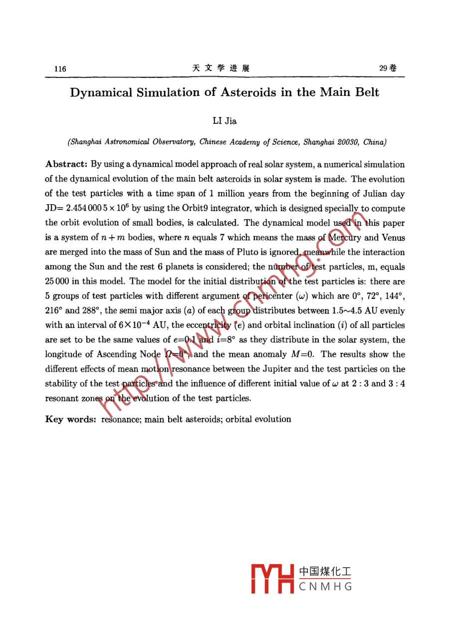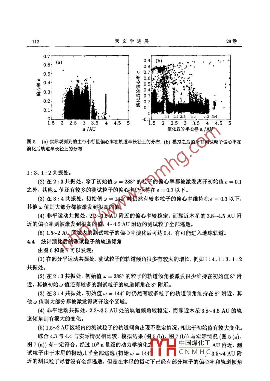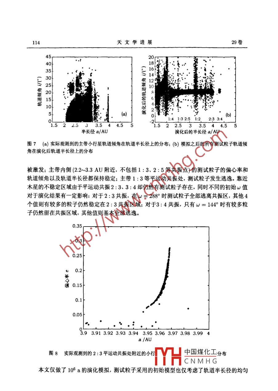 第29卷第1期天文學(xué)進展VoL 29, No. 12011年1月PROGRESS IN ASTRONOMY文章編號:10008349(2011)01010512主帶小行星的動力學(xué)模擬李嘉中國科學(xué)院上海天文臺,上海200030)摘要:采用接近真實太陽系的動力學(xué)模型,對主帶小行星的動力學(xué)演化進行了數(shù)值模擬。計算的起始時間是儒略日JD=24540005×10°,計算的時間長度為100萬年。力學(xué)模型采用n+m體模型,計算程序基于小行星軌道演化的軟件 Orbit9。對演化結(jié)果進行分析可以發(fā)現(xiàn)測試粒子與木星的平運動共振對測試粒子穩(wěn)定性的不同作用,以及在2:3、3:4共振處不同初始值對測試粒子演化結(jié)果的影響關(guān)鍵詞:共振;主帶小行星;軌道演化中圖分類號:P181引言1766年 Johann titius提出 Titius-Bode法則,即以天文單位(AU)計算6顆當時已知的大行星到太陽的距離,存在下面的經(jīng)驗公式d≈0.4+0.3×22,i=-0,0,1,2,4,5分析上面的公式,Bode指出在火星和木星中間的i=3處應(yīng)該存在一個尚未被發(fā)現(xiàn)的大行星。1801年意大利人 Piazzi在火星和木星之間發(fā)現(xiàn)第一顆小行星谷神星,在隨后200多年時間里人類在這個區(qū)域陸續(xù)發(fā)現(xiàn)的小行星多達37萬余顆,其中已經(jīng)被編號的有23萬顆左右。這些小行星間軌道半長徑95%集中在217~364AU內(nèi),平均偏心率大約015,平均軌道傾角大約8.6°,被稱為主帶小行星。因為小行星主帶可能保留了太陽系形成初期的一些信息,所以研究它的化學(xué)組成和動力學(xué)演化對于了解太陽系的形成和演化很有意義。而小行星帶的起源至今沒有統(tǒng)一的說法,主要有三種假設(shè):大行星爆炸說,半成品說和彗星形成說。大行星爆炸學(xué)說認為小行星是顆爆炸了的行星所留下的殘片;半成品說則認為小H中國煤化工星的前身,由CNMHG收稿日期:2010-03-19;修回日期:2010-04-15資助項目:國家自然科學(xué)基金(10633030)天文學(xué)進展卷于在太陽系形成的初期受到木星的引力攝動而停留在星子階段,最后演化成小行星帶;彗星形成說認為彗星經(jīng)過長時間的消耗后,其彗發(fā)變短,成為小行星,已有觀測證據(jù)表明某些彗星可能演變成小行星。1867年 Kirkwood對主帶小行星的數(shù)目按軌道半長徑進行統(tǒng)計時發(fā)現(xiàn)了 Kirkwood空隙( Kirkwood gap),在木星軌道周期和小行星軌道周期成4:1、3:1、5:2、7:3、2:1等整數(shù)比的平運動共振處明顯沒有小行星分布;在周期比為1:1、3:2、4:3等平運動共振處則有一定的聚集現(xiàn)象,3:2共振處聚集的小行星被稱作Hlda群,1:1處的稱作 Trojan群。自Kirkwood空隙被發(fā)現(xiàn)以后,解釋小行星帶的這種動力學(xué)結(jié)構(gòu)一直是個難題,隨后發(fā)展出了統(tǒng)計學(xué)假說、碰撞假說、宇宙學(xué)假說和引力假說等不同的假設(shè)。20世紀80年代以后,隨著計算機技術(shù)的發(fā)展,人們可以進行較長時間的軌道計算,1982年 Widows利用映射方法研究1:3共振處的演化,將演化時間推近到幾百萬年量級后發(fā)現(xiàn)小行星軌道是混沌的,軌道偏心率可以達到03,從而受到火星攝動而離開小行星主帶(最近的研究表明1:3共振處的小行星經(jīng)過一百萬年的演化后,偏心率e可以接近1,從而使小行星軌道穿過地球軌道,由此可認為與木星處于平運動共振的小行星帶可能是近地小天體(NEA)的來源之-)。1984年 Hadjidemetriou等人在限制性三體問題的框架下研究一些特殊的共振,發(fā)現(xiàn)1:3和3:5共振處會產(chǎn)生空隙而在1:2、2:3共振處會有小行星存在Dvorak等人分別在199年和1995年,對主帶小行星的動力學(xué)演化進行了模擬。在1993年的文章中,他們采用了太陽和木星的橢圓型限制性三體問題模型;在1995年的文章中,他們引入土星,考慮太陽、木星、土星間的相互作用。通過兩次對不同偏心率和軌道半長徑的小行星的動力學(xué)模擬,他們認為主帶的很多動力學(xué)結(jié)構(gòu)(1:3、1:2)共振可以通過限制性三體問題解決,主帶內(nèi)側(cè)的結(jié)構(gòu)由小行星和木星的長期共振決定,從1:2共振位置開始的小行星才會因過于靠近木星而受到木星的直接作用等本文將.用接近真實太陽系的動力學(xué)模型,利用Orb9程序?qū)χ鲙⌒行沁M行動力學(xué)模擬。同時我們重點關(guān)注小行星在初始狀態(tài)時的軌道取向?qū)τ谒旧硌莼挠绊憽?演化模型演化的起始時間為儒略日JD=24540005×10°(公元2006年9月22日0點0分0秒),大行星的質(zhì)量和此時的軌道根數(shù)從JPL星表中獲得。太陽系的演化歷史長達幾十億年,但是由于受制于計算機條件,本文中的演化時間長度沒定為10°a太陽系大天體的動力學(xué)模型采用n=7體模型,即將水星、金星質(zhì)量并入太陽質(zhì)量以太陽2項形式出現(xiàn),同時計算新的太聞質(zhì)心;氫略亡中國煤化量、土星、天王星、海王星與太陽間的相互作用。本文將著重關(guān)注初始狀態(tài)下測試粒子的不同軌追對化紹影啊,所以我們將選取若干組不同的近點角距u值;同時測試粒子的軌道半長徑要覆蓋整個主帶的寬度且均1期李嘉:主帶小行星的動力學(xué)模擬107勻分布。我們將測試粒子的初始軌道半長徑選取在15~45AU內(nèi),以6×10-4AU為間隔均勻分布;同時在0°~360°范圍內(nèi)以等差間隔選取5個不同的初始近點角距u值,分別為通過對已知主帶小行星的統(tǒng)計,得到主帶小行星平均偏心率為0.15左右,平均軌道傾角為8.6