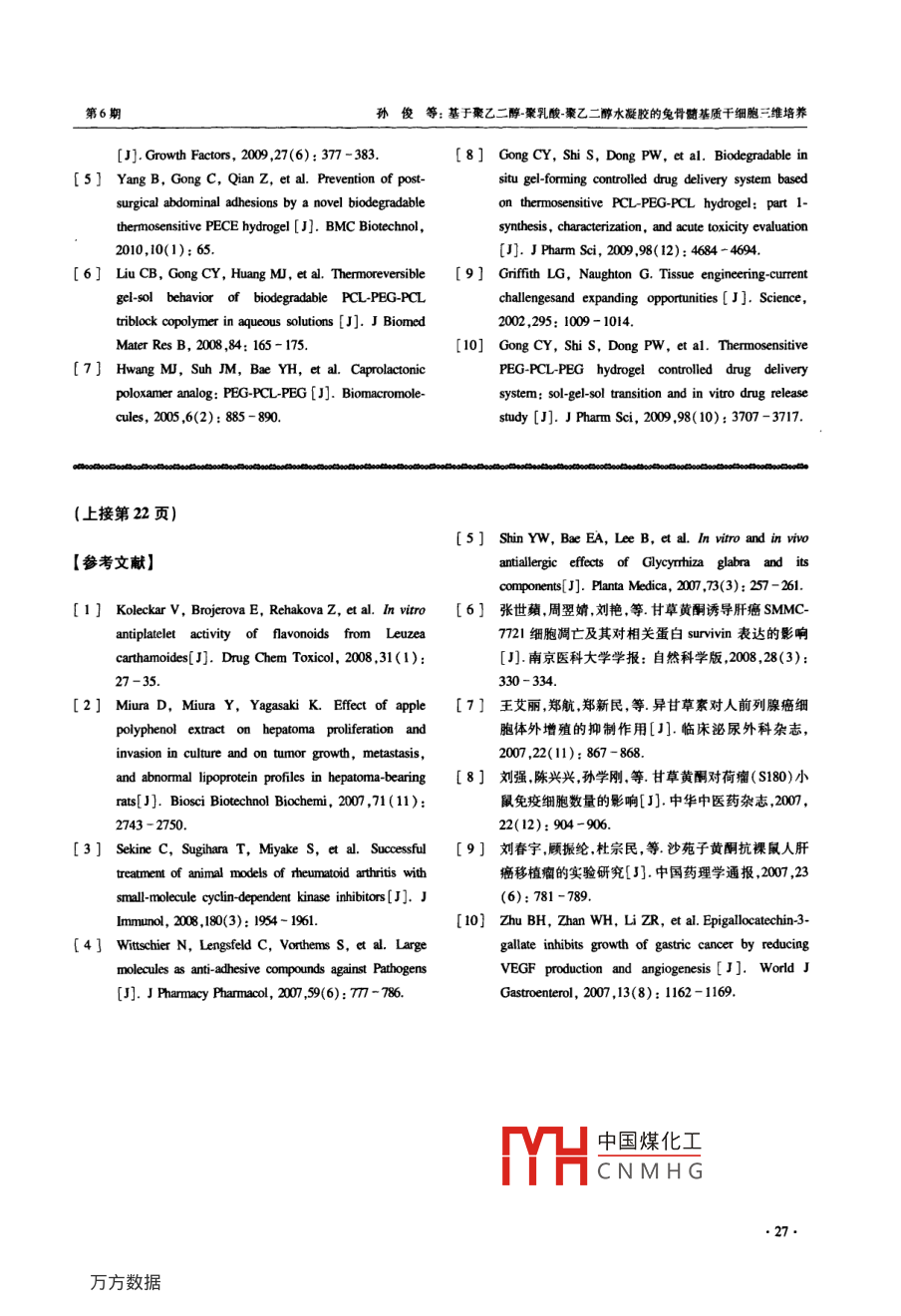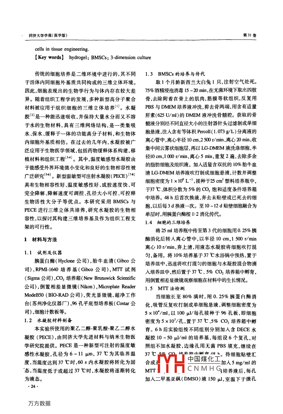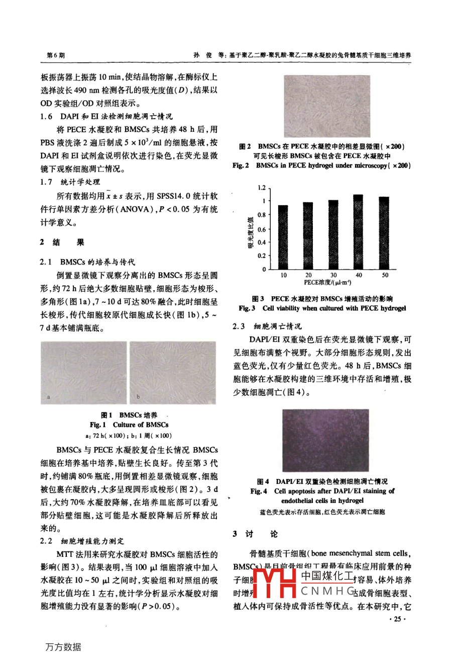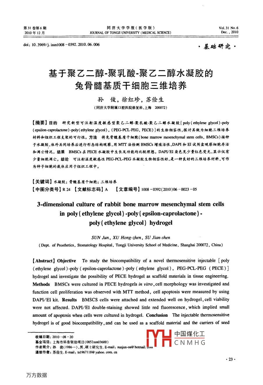 第31卷第6期同濟(jì)大學(xué)學(xué)報(bào)(醫(yī)學(xué)版)Vol.31 No.62010年12月JOURNAL OF TONGJI UNIVERSITY (MEDICAL SCIENCE)Dec.。2010doi: 10. 3969/j iss108 -0392. 2010.06. 006, 基礎(chǔ)研究●基于聚乙二醇-聚乳酸-聚乙二醇水凝膠的兔骨髓基質(zhì)干細(xì)胞三維培養(yǎng)孫俊,徐紅珍,蘇儉生(同濟(jì)大學(xué)附屬口腔醫(yī)院修復(fù)科,上海2002)[摘要]目的研究新型可注射溫度敏感型聚乙二醇聚乳酸-聚乙二醇水凝膠[ poly ( ethylene glycol )-poly(psilon-caprolactone)-poly( ethylene glycol), (PEG-PCL-PEG, PECE)]的生物相容性,探討其做為細(xì)胞三維培養(yǎng)材料和組織工程支架的可行性。方法將 兔骨髓基質(zhì)干細(xì)胞( bone marow mesenchymal stem cells, BMSCs)接種于水凝膠,體外共同培養(yǎng)后進(jìn)行形態(tài)結(jié)構(gòu)觀察,用MTT法檢測(cè)BMSCs增殖活性,DAPI和EI試劑盒觀察細(xì)胞存活和凋亡情況。結(jié)果BMSCs 在PECE水凝膠中生長(zhǎng)及功能均比較理想。DAPVEI染色見少量紅色熒光,顯示僅有少量細(xì)胞凋亡。結(jié)論可注射溫度敏感性 PEG-PCL-PEG水凝膠生物相容性好,是一種良好的三維培養(yǎng)材料,可作為種子細(xì)胞的載體應(yīng)用于組織工程中。[關(guān)鍵詞]水凝膠;骨髓基質(zhì)干細(xì)胞;三維培蕎[中圖分類號(hào)]R24 [文獻(xiàn)標(biāo)志碼] A[文章編號(hào)] 1008 -0392(2010)06 -0023 -053-dimensional culture of rabbit bone marrow mesenchymal stem cellsin poly ( ethylene glycol ) -poly ( epsilon-caprolactone)-poly ( ethylene glycol) hydrogelSUN Jun, XU Hong -zhen, SU Jian-shen(Dept. of Prosthetics, Stomatology Hospital, Tongji University School of Medicine , Shanghai 200072, China)[ Abstract] Objective To study the biocompatibility of a novel thermosensitive injectable [ poly(ethyene glycol )-poly ( epsilon-caprolactone )-poly ( ethylene glycol), PEG-PCL-PEG ( PECE)]hydrogel and investigate the possibility of PECE hydrogel as scaffold materials in tsse engineering.Methods BMSCs were cultured in PECE hydrogels in vitro , cell morphology was investigated andfunction cell proliferation was observed with MTT method, cell apoptosis were measured by usingDAPI/EI kit. Results BMSCS cells were attached and extended well on hydrogel , cell viabilitywere not affected. DAPI/EI double staining showed litle red fluorescence , which implied smallamount of apoptosis when cells were cultured in hydrogel. Conclusion The injectable thermosensitivehydrogel is of good biocompatibility, and can be used as a scaffold material and the carriers of seed中國(guó)煤化工收稿日期: 2010-08 -20基金項(xiàng)目:上海市科委資助項(xiàng)日(0852m03600)CHCNMHG作者簡(jiǎn)介:孫俊( 1986- ). 男,碩土:研究生. E-mail; sunjun-os@ hotmail. cou通信作者:蘇儉生. E-mail: ts197118@ yahoo. com. cn●23.同濟(jì)大學(xué)學(xué)報(bào)(醫(yī)學(xué)版)第31卷cells in tissue engineering.[Key words] hydrogel; BMSCs; 3-dimension culture傳統(tǒng)的細(xì)胞培養(yǎng)是二維環(huán)境中進(jìn)行的,其不同1.3 BMSCs的培養(yǎng)與傳代于活體內(nèi)同細(xì)胞外基質(zhì)共同構(gòu)成的三維立體環(huán)境。取1個(gè)月齡新西蘭大白兔1只,注射空氣處死。因此,細(xì)胞表現(xiàn)出的生物學(xué)行為與體內(nèi)存在較大差75%酒精浸泡消毒15 ~20 min,在無菌環(huán)境下取出四肢異。隨著組織工程學(xué)的發(fā)展,多種新型高分子聚合骨,去除附著在骨上的肌肉,筋膜等軟組織,反復(fù)用材料被應(yīng)用于組織細(xì)胞的三維立體培養(yǎng)"。水凝PBS與DMEM培養(yǎng)液沖洗,剪去骨兩端,用含有適量膠[2是一種能迅速吸收,并保持大量水分而又不溶肝素(625 U/ml)的DMEM液沖洗骨髓腔。獲取的骨于水的生物材料,具有三維網(wǎng)絡(luò)結(jié)構(gòu),是- -類集吸髓液分別經(jīng)不同直徑大小的注射器針頭過濾制成單細(xì)水保水、緩釋于一體的功能高分子材料,和生物體胞懸液,注人含有等體積Percoll(1.073 g/L)分離液的內(nèi)細(xì)胞外基質(zhì)相仿。在過去的幾年內(nèi),水凝膠被廣離心管中,離心半徑10 cm,2 500 r/min,離心20 min,收泛應(yīng)用于生物醫(yī)學(xué)領(lǐng)域,包括藥物緩釋體系構(gòu)建,移集中間云霧狀細(xì)胞層,再以LG-DMEM液洗滌細(xì)胞,半植材料和組織工程(34)。其中,溫度敏感型水凝膠由徑10 cm,1000 r/min,離心5 min,重復(fù)2遍,去除多余于能感受外界環(huán)境微小變化和良好的生物相容性被的脂肪細(xì)胞及組織液。加人適量含雙抗的10%胎牛血廣泛研究[56)。新型溫敏型可注射水凝膠( PECE)[7+]清LG-DMEM培養(yǎng)液吹打制成細(xì)胞懸液,計(jì)數(shù)并調(diào)整具有生物相容性好、溫度敏感性好、成膠速度快、可細(xì)胞密度為1x10* L-' ,接種于25 cm2塑料培養(yǎng)瓶中,完全降解降解速度可調(diào)控、孔徑大小可控、可控釋于37 C、體積分?jǐn)?shù)為5%的CO2飽和適度條件培養(yǎng)箱生物活性大分子等優(yōu)點(diǎn)。本研究采用BMSCs與中培養(yǎng)。48 h后首次換液,棄去未貼璧或已死去的細(xì)PECE進(jìn)行三維立體共培養(yǎng),研究水凝膠的生物相胞,以后每3d換液- ~次。至10~12 d貼壁細(xì)胞融合為容性,以探討其構(gòu)建三維培養(yǎng)基及作為組織工程支單層時(shí),用胰蛋白酶按1:2消化傳代。1.4 細(xì)胞的三維培養(yǎng)架的可行性。將25 ml培養(yǎng)瓶中傳至第3代的細(xì)胞用0. 25%胰1材料與方法酶消化后轉(zhuǎn)人離心管中,以半徑10 cm,1 500 r/min離心10r/min,棄上清,用液態(tài)水凝膠將細(xì)胞吹打混1.1 試劑及儀器.胰蛋白酶( Hyclone