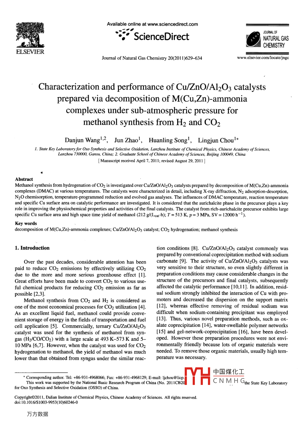 Available online at www.sciencedirect.comJOURNALOFScienceDirectNATURAL GASCHEMISTRYEL SEVIERJournal of Natural Gas Chemistry 20(2011)629 -634www.elsevier.com/locate/jngcCharacterization and performance of Cu/ZnO/Al2O3 catalystsprepared via decomposition of M(Cu,Zn)-ammoniacomplexes under sub-atmospheric pressure formethanol synthesis from H2 and CO2Danjun Wang';2,Jun Zhao',Huanling Song',Lingjun Choul*1. State Key Laboratory for Oxo Synthesis and Selective Oxidation, Lanzhou Instiute of Chemical Physics, Chinese Academy of Sciences,Lanzhou 730000, Gansu, China; 2. Graduate School of Chinese Academy of Sciences, Bejing 100049, China[ Manuscript recived Apil 7, 2011; revised August 29, 2011 ]AbstractMethanol synthesis from hydrogenation of CO2 is investigated over Cu/ZmO/Al2O3 catalysts prepared by decomposition of M(Cu,Zn)- ammoniacomplexes (DMAC) at various temperatures. The catalysts were characterized in detail, including X-ray diffraction, N2 adsorption-desorption,N2O chemisorption, temperature-programmed reduction and evolved gas analyses. The influences of DMAC temperature, reaction temperatureand specific Cu surface area on catalytic performance are investigated. It is considered that the aurichalcite phase in the precursor plays a keyrole in improving the physiochemical properties and activities of the final catalysts. The catalyst from rich-aurichalcite precursor exhibits largespecific Cu surface area and high space time yield of methanol (212 g/(Lcat:h); T =513K, p=3 MPa, SV= 12000 h-1).Key wordsdecompostion of M(Cu,Zn)-ammonia complexes; Cu/ZnO/Al2O3 catalyst; CO2 hydrogenation; methanol synthesis1. Introductiontion conditions [8]. Cu/ZnO/Al2O3 catalyst commonly wasprepared by conventional coprecipitation method with sodiumOver the past decades, considerable attention has beencarbonate [9]. The activity of Cu/ZnO/Al2O3 catalysts waspaid to reduce CO2 emissions by effectively utilizing CO2very sensitive to their structure, so even slightly different indue to the more and more serious greenhouse effect [1]. .preparation conditions may cause considerable changes in theGreat efforts have been made to convert CO2 to various use-structure of the precursors and final catalysts, subsequentlyful chemical products for reducing CO2 emission as far asaffected the catalytic performance [10,11]. In addition, resid-possible [2,3].ual sodium strongly inhibited the interaction of Cu with pro-Methanol synthesis from CO2 and H2 is considered asmoters and decreased the dispersion on the support matrixone of the most economical processes for CO2 utilization [4].[12], whereas effective removing of residual sodium wasAs an excellent liquid fuel, methanol could provide conve-difficult when sodium-containing precipitant was employednient storage of energy in the fields of transportation and fuel[13]. Thus, various novel preparation methods, such as ox-cell application [5]. Commercially, ternary Cu/ZnO/Al2O3alate coprecipitation [14], water-swellable polymer networkscatalyst was used for the synthesis of methanol from syn-[15] and gel-network coprecipitation [16], have been devel-gas (H2/CO/CO2) with a large scale at 493 K- 573 K and 5-oped. However these preparation procedures were not envi-10 MPa [6,7]. However, when the catalyst was used for CO2ronmentally friendly because lots of organic materials werehydrogenation to methanol, the yield of methanol was muchneeded. To remove those organic materials, usually high tem-lower than that obtained from syngas under the similar reac-perature was necessary.中國(guó)煤化工* Corresponding author. Tel: +86 931-4968066 Fax: +86 931-4968129; E-mail: ljchou@licp.This work was supported by the National Basic Research Program of China (No.201 1CB20MYHc N M.H Ghe Suate Key Lboarorfor Oxo Synthesis and Selctive Oxidation (OSSO) of China.CopyrightO2011, Dalian Instiute of Chemical Physics, Chinese Academy of Sciences. All rights reserved.doi:10.1016/S1003-9953(10)60246-0630Danjun Wang et al./ Joumal of Natural Gas Chemistry Vol. 20 No.6 2011In this work, a series of Cu/ZnO/Al2O3 catalysts wereprepared through decomposition of M(Cu,Zn)-ammonia com-Temperature-programmed reduction (TPR) experimentsplexes (DMAC) under sub-atmospheric pressure at vari-were also conducted on AMI- 100 instrument. The fresh cal-ous temperatures, and they were characterized by X-raycined catalyst about 20 mg (80- 100 mesh) was pretreated indiffraction (XRD), total surface area, N2O chemisorption,a helium flow of 50 mL /min at 623 K for 1 h and then cooledtemperature-programmed reduction (TPR) and evolved gasto room temperature. After that, a reducing gas composed ofanalyses (EGA). The catalytic performance of these catalysts5 vol% H2/He was employed at a flow rate of 50 mL/min,was evaluated and the relationship was correlated with thewith a heating rate of 10 K/min from room temperature tocharacterization results.673 K. The hydrogen consumption was monitored online byquadrupole mass spectrometer.2. ExperimentalThe specific surface area of Cu (Scu) was determined bydissociative N2O adsorption at 363 K using the procedure de-2.1. Catalyst preparationscribed by Huang et al. [17]. The catalysts were pre-reducedat 623 K for 1 h. After that they were flushed with helium gasA series of Cu/ZnO/Al2O3 catalysts (molar ratio ofand the temperature was decreased to 363 K. Subsequently,Cu:Zn:Al=6:3:1) were prepared via decomposition5 vol% N2O (99.995% purity) in N2 99.99% purity) was in-f M(Cu,Zn)-ammonia complexes (DMAC) under sub-troduced into the reactor at this temperature with a flow rateatmospheric pressure as follows. 6.18g CuO and 3.16gof 50 mL/min for 30 min. Finally, the samples were cooled toZnO powder were introduced into 100 mL 2 mol/L NH3.H2O-room temperature with flowing helium gas and then heated up(NH4)2CO3 (NH3:H2O : (NH4)2CO3= 1: 1) solution underto 673 K with a rate of 10 K/min. Dispersion of Cu (Dcu), di-vigorous stirring at 333 K for 5 h to form M(Cu,Zn)-ammoniaameter of Cu parti