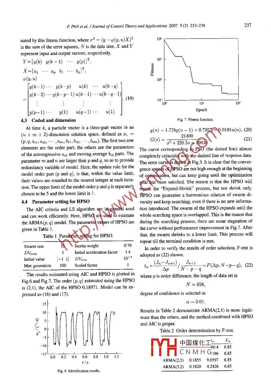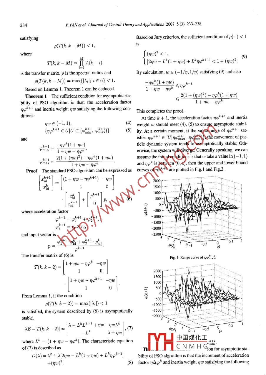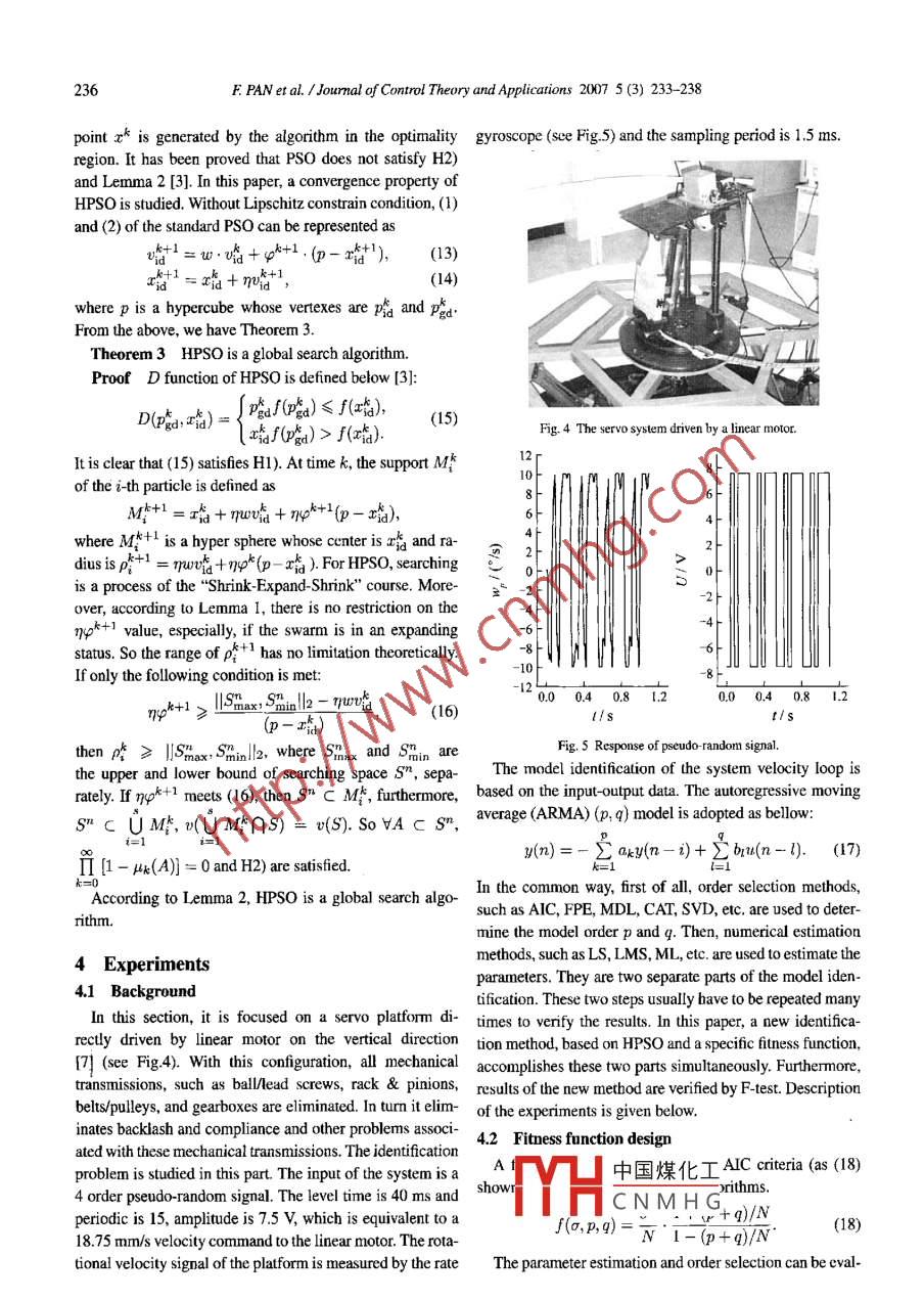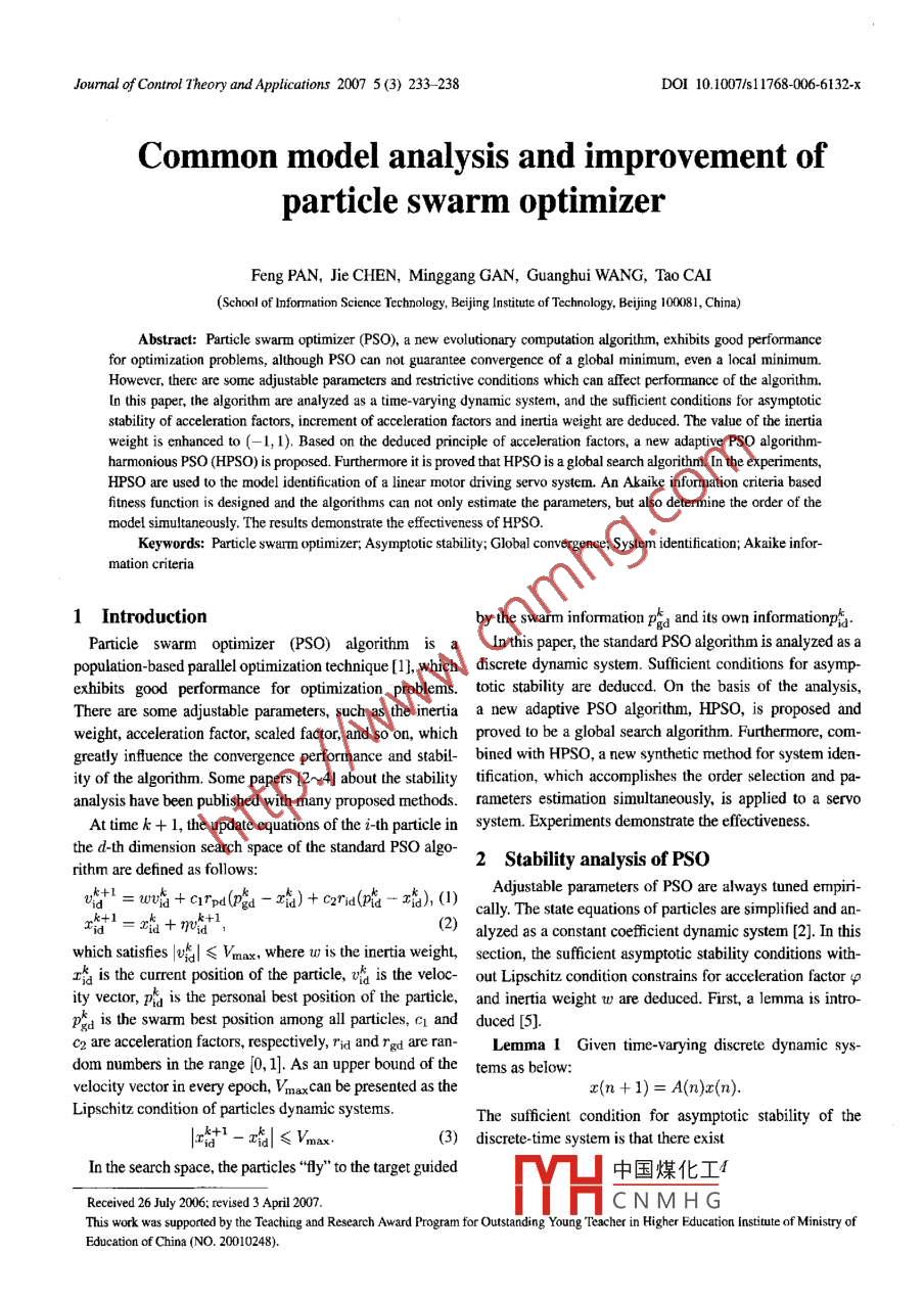 Joumnal of Control Theory and Applications 2007 5(3) 233 -238DOI 10.1007/s1 1768-006-6132-xCommon model analysis and improvement ofparticle swarm optimizerFeng PAN, Jie CHEN, Minggang GAN, Guanghui WANG, Tao CAI(School of Information Science Technology, Beijing Institute of Technology, Beijing 100081, China)Abstract: Particle swarm optimizer (PSO), a new evolutionary computation algorithm, exhibits good performancefor optimization problems, although PSO can not guarantee convergence of a global minimum, even a local minimum.However, there are some adjustable parameters and restrictive conditions which can affect performance of the algorithm.[n this paper, the algorithm are analyzed as a time-varying dynamic system, and the sufcient conditions for asymptoticstability of acceleration factors, increment of acceleration factors and inertia weight are deduced. The value of the inertiaweight is enhanced to (-1, 1). Based on the deduced principle of acceleration factors, a new adaptive PSO algorithm-harmonious PSO (HPSO) is proposed. Furthermore it is proved that HPSO is a global search algorithm. In the experiments,HPSO are used to the model identification of a linear motor driving servo system. An Akaike information criteria basedfitness function is designed and the algorithms can not only estimate the parameters, but also determine the order of themodel simultaneously. The results demonstrate the efectiveness of HPSO.Keywords: Particle swarm optimizer; Asymptotic stability; Global convergence; System identification; Akaike infor-mation criteria1 Introductionby the swarm information pga and its own informationpla.Particle swarm optimizer (PSO) algorithm is aIn this paper, the standard PSO algorithm is analyzed as apopulation-based parallel optimization technique [1], which discrete dynamic system. Sufficient conditions for asymp-exhibits good performance for optimization problems. totic stability are deduccd. On the basis of the analysis,There are some adjustable parameters, such as the inertia a new adaptive PSO algorithm, HPSO, is proposed andweight, acceleration factor, scaled factor, and so on, which proved to be a global search algorithm. Futhermore, com-greatly infuence the convergence performance and stabil- bined with HPSO, a new synthetic method for system iden-ity of the algorithm. Some papers [2~4] about the stability tification, which accomplishes the order selection and pa-analysis have been published with many proposed methods. rameters estimation simultaneously, is applied to a servoAt time k + 1, the update equations of the i-th particle in system. Experiments demonstrate the efctiveness.the d-th dimension search space of the standard PSO algo-2 Stability analysis of PSOrithm are defined as follows:Adjustable parameters of PSO are always tuned empini-嘴1= w0 + C1rpa(pgd -餾) + C2rid(哈-站), (1)cally. The state equations of particles are simplified and an-1物+1=嗡+ moa+1,(2alyzed as a constant coefficient dynamic system [2]. In thiswhich satisfies |u嘴|≤Vmax. where w0 is the inertia weight, section, the suffcient asymptotic stability conditions with-指is the current position of the particle, 哈is the veloc- out Lipschitz condition constrains for acceleration factor 中ity vector,嘴is the personal best position of the particle, and inertia weight w are deduced. First, a lemma is intro-is the swarm best position among all particles, C1 and duced [5].C2 are acceleration factors, respectively, rid and r'gd are ran-Lemma 1 Given time-varying discrete dynamic sys-dom poumbers in the range [0, 1]. As an upper bound of the termns as below:velocity vector in every epoch, Vmaxcan be presented as thex(n + 1)= A(n)x(n).Lipschitz condition of particles dynamic systems.The sufficient condition for asymptotic stability of the|脂1-哈| < Vmax.(3) discrete-time system is that there existIn the search space, the particles“fly" to the target guided中國(guó)煤化工4Received 26 July 2006; revised 3 April 2007.YHCNMHGThis work was supported by the Teaching and Rescarch Award Program for Outstanding Young Teacher in Higher Education Instiute of Ministry ofEducation of China (NO. 20010248).234F PAN et al. /Journal of Control Theory and Applications 2007 5(3) 233 -238satistfyingBased on Jury criterion, the sufcient conditionofp(.)< 1p(T(k,k- M))<1,where(mw)2 <1,(9)T(,k-M)=I A(k-i)1 |2rw- L*(1 +ru) + L*np*+1<1+ (mu).問1is the transfer matnix, ρ is the spectral radius andBy calculation, w∈(-1/n, 1/n) satisfying (9) and alsop(T(k,k- M) = max{|\l;i∈n}<1.-np*(1 + mw)≤p+1.Based on Lemma I, Theorem 1 can be deduced.1+mw-npkTheorem 1 The sufcient condition for asymptotic sta-。2(1 + (qu)2)- rp*(1 + mu)bility of PSO algorithm is that: the acceleration factor1+nw-npknpk+1 and inertia weight ηw satisfying the following con-This completes the proof.ditions:At time k + 1, the acleration factor npk + ' and inertianmw∈(-1,1);(4)weight w should meet (4), (5) l0 ensure asymptotic stabil-{πp+1∈U|U C (nt1, ptt)}(5) ity, At a certain moment, if the value range of nηpk+1 sat-andisfies rp*+1∈[UInpmx; mpmin1}, the movement of par--η4*(1 + mw)ticle dynamic system tends to asymptoically stablc; Oth-1+nw-nerwise, the system will diverge. Generally speaking, we canpk+1 =2(1 + (7w)2)- ηp*(1 + nw)assume the initial conditions is that w lake a value in(-1,1)1+mw- ηpand ny° is betwecn (0, 4), then the upper and lower boundProof The standard PSO algoithm can be expressed as curves of nph+1 are potted in Fig.1 and Fig.2.(1 + mw-np*+1) -pu20001500000 t(6)00上0fwhere acceleration factor-50(ψ*+1=p+1+qe+I,-1000-150p:+l=c;Xri,-2000and input vector is2500pf+1.嗜++-p管-0.50.5 1pk+1The transfer matrix of (6) isFig. 1 Range curve of npm故.T(k,k-2)1+mw-np* -nw |「1 + mw-npk+1 -ηw |1000o」500From Lemma 1, if the conditionp(T(k,k- 2)) = max()\i|)< 1- 1000is satisfed, the system described by (6) is asymptoticallystable.|λ- L*Ik+1 + mw nwLk).5|\E -T(k,k -2)1= _τλ+rpw|,(7)0-1-00中國(guó)煤化