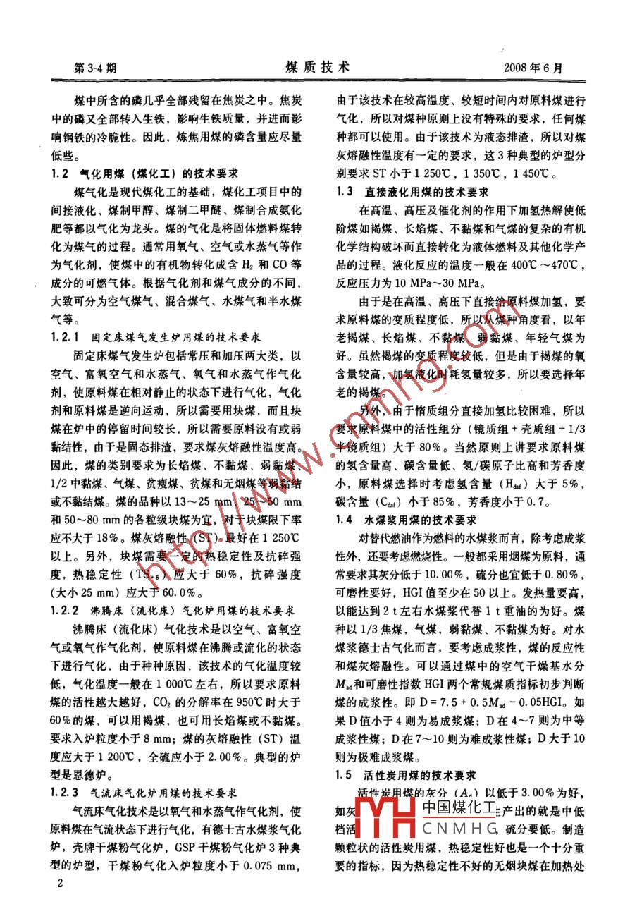 第3-4期煤質(zhì)技術(shù)2008年6月.煤化工煤化工用煤適應(yīng)性研究陳亞飛,姜英(煤炭科學(xué)研究總院北京煤化工研究分院,北京100013)摘要:各種煤化工轉(zhuǎn)化技術(shù)對(duì)原料煤有一定的要求,發(fā)展謀化工項(xiàng)目應(yīng)做好煤炭資源的適應(yīng)性研究,同時(shí)要保護(hù)及高附加值地利用“稀缺”煤種資源,鼓勵(lì)煤化工用原料煤使用“劣質(zhì)煤”資源,建議制訂相關(guān)標(biāo)準(zhǔn)以規(guī)范煤化工用煤。關(guān)鍵詞:煤化工;用煤;適應(yīng)性中圖分類(lèi)號(hào): TQ53文獻(xiàn)標(biāo)識(shí)碼: A文章編號(hào): 1007-7677 (2008) 3-4-0001-03Study on adaptability of raw material coal for coal chemical engineeringCHEN Ya-fei, JIANG Ying(Beiing Research Insitute of Coal Chemistry, China Coal Research Institute. Beijing 10013, China)Abstract: Various technologies of coal chemical engineering have certain requirements for material coal, so it is necessary toresearch the adaptability of material coal resource for various coal chemical engineering items. Besides, the scarce and special coalresources must be protected and utilized with high added value. The use of“poor quality coal resource" as raw material coal shouldbe encouraged. It is suggested that related standards should be drafted to standard the raw material coal of coal chemicalengineering.Key words: coal chemical engineering; raw material coal; adaptability隨著社會(huì)經(jīng)濟(jì)的發(fā)展,中國(guó)對(duì)清潔能源的需求度。煤質(zhì)的好壞對(duì)焦炭質(zhì)量有決定性的影響。越來(lái)越大,我國(guó)的資源特點(diǎn)又是富煤而貧油氣,所對(duì)煉焦用煤而言,結(jié)焦性和黏結(jié)性是最為重以通過(guò)煤化工生產(chǎn)清潔能源勢(shì)在必行。目前我國(guó)煤要的指標(biāo)。在GB 5751-86《中國(guó)煤炭分類(lèi)》中,化工產(chǎn)業(yè)的發(fā)展越來(lái)越受到重視。我國(guó)幅員遼闊,1/2中黏煤、氣煤、氣肥煤、1/3焦煤、肥煤、焦煤種齊全,煤質(zhì)差異較大,這為煤化工產(chǎn)業(yè)的發(fā)展煤、瘦煤、貧瘦煤均屬煉焦煤范疇,可作為煉焦.提供了資源保障。煤化工是以煤為原料,經(jīng)過(guò)化學(xué)(配)煤來(lái)使用。加工將煤轉(zhuǎn)化為多產(chǎn)品的過(guò)程,廣義地講,煤化工在煉焦過(guò)程中,煤中的灰分幾乎全部轉(zhuǎn)入焦炭項(xiàng)目和產(chǎn)品包括煤焦化生產(chǎn)焦炭、煤焦油、煤氣產(chǎn)之中。高溫時(shí),由于焦炭與灰分的熱膨脹性不同,品等;煤氣化生產(chǎn)化肥、甲醇、二甲醚、合成油、焦炭沿灰分顆粒周?chē)a(chǎn)生裂紋并擴(kuò)大,使焦炭碎裂烯烴產(chǎn)品等;煤直接液化生產(chǎn)油品;煤基活性炭;或粉化?;曳种蠸iO2. Al2O3 等酸性氧化物,熔融煤基炭素材料;煤基特殊產(chǎn)品等。該文在論述各種性溫度較高,在煉鐵過(guò)程中只能靠加入石灰石等助煤化工技術(shù)用煤技術(shù)條件的基礎(chǔ)上,結(jié)合我國(guó)煤炭熔劑以熔渣形式排出,因而會(huì)使?fàn)t渣量增加,降低的資源特點(diǎn),提出了煤化工用煤的適應(yīng)性研究的必生鐵產(chǎn)量。焦炭灰分高,則要求適當(dāng)提高高爐爐渣要性和應(yīng)考慮的問(wèn)題。堿度,高爐氣中鉀、鈉蒸氣含量也相應(yīng)增加,會(huì)加速焦炭與CO2的反應(yīng)而加速其消耗。.1煤化工技術(shù)用煤的技術(shù)要求由焦炭帶入的硫分,僅5% ~20%隨高爐煤氣1.1煉焦用煤的技術(shù)要求逸出,其余的參加爐內(nèi)硫循環(huán),只能靠爐渣排出。焦隨著煉鐵高爐大型化和強(qiáng)化冶煉技術(shù)的發(fā)展,炭含硫言合體出鐵今儒坦宜啪加生鐵的熱脆性,同對(duì)焦炭強(qiáng)度的要求也日益增高。冶金焦煉鐵過(guò)程時(shí)增炭耗!YH中國(guó)煤化工每增加0.1%,焦中,焦炭既要作為燃料為冶煉過(guò)程提供熱源,又作CN M H G產(chǎn)量約下降2%。為主要的還原劑,同時(shí)為維持爐內(nèi)料柱的透氣性,煉焦用煤的全碗含量應(yīng)在1.50%以下,且最好不使高爐能夠正常運(yùn)行,需要焦炭有一定的塊度和強(qiáng)超過(guò)1%。第3-4期.煤質(zhì)技術(shù)2008年6月煤中所含的磷幾乎全部殘留在焦炭之中。焦炭由于該技術(shù)在較高溫度、較短時(shí)間內(nèi)對(duì)原料煤進(jìn)行中的磷又全部轉(zhuǎn)入生鐵,影響生鐵質(zhì)量,并進(jìn)而影氣化,所以對(duì)煤種原則上沒(méi)有特殊的要求,任何煤響鋼鐵的冷脆性。因此,煉焦用煤的磷含量應(yīng)盡量種都可以使用。由于該技術(shù)為液態(tài)排渣,所以對(duì)煤低些?;胰廴谛詼囟扔幸?定的要求,這3種典型的爐型分1.2 氣化用煤(煤化工)的技術(shù)要求別要求ST小于1250C,1 350C, 1 450C。煤氣化是現(xiàn)代煤化工的基礎(chǔ),煤化工項(xiàng)目中的1.3 直接液化用煤的技術(shù)要求間接液化、煤制甲醇、煤制二甲醚、煤制合成氨化在高溫、高壓及催化劑的作用下加氫熱解使低肥等都以氣化為龍頭。煤的氣化是將固體燃料煤轉(zhuǎn)階煤如褐煤、長(zhǎng)焰煤、不黏煤和氣煤的復(fù)雜的有機(jī)化為煤氣的過(guò)程。通常用氧氣、空氣或水蒸氣等作化學(xué)結(jié)構(gòu)破壞而直接轉(zhuǎn)化為液體燃料及其他化學(xué)產(chǎn)為氣化劑,使煤中的有機(jī)物轉(zhuǎn)化成含H2和CO等品的過(guò)程。液化反應(yīng)的溫度一般在400C ~ 470C,成分的可燃?xì)怏w。根據(jù)氣化劑和煤氣成分的不同,反應(yīng)壓力為10 MPa~30 MPa。大致可分
