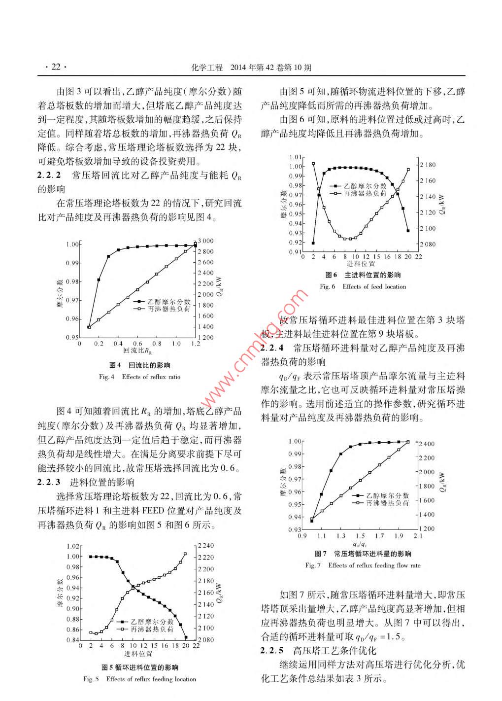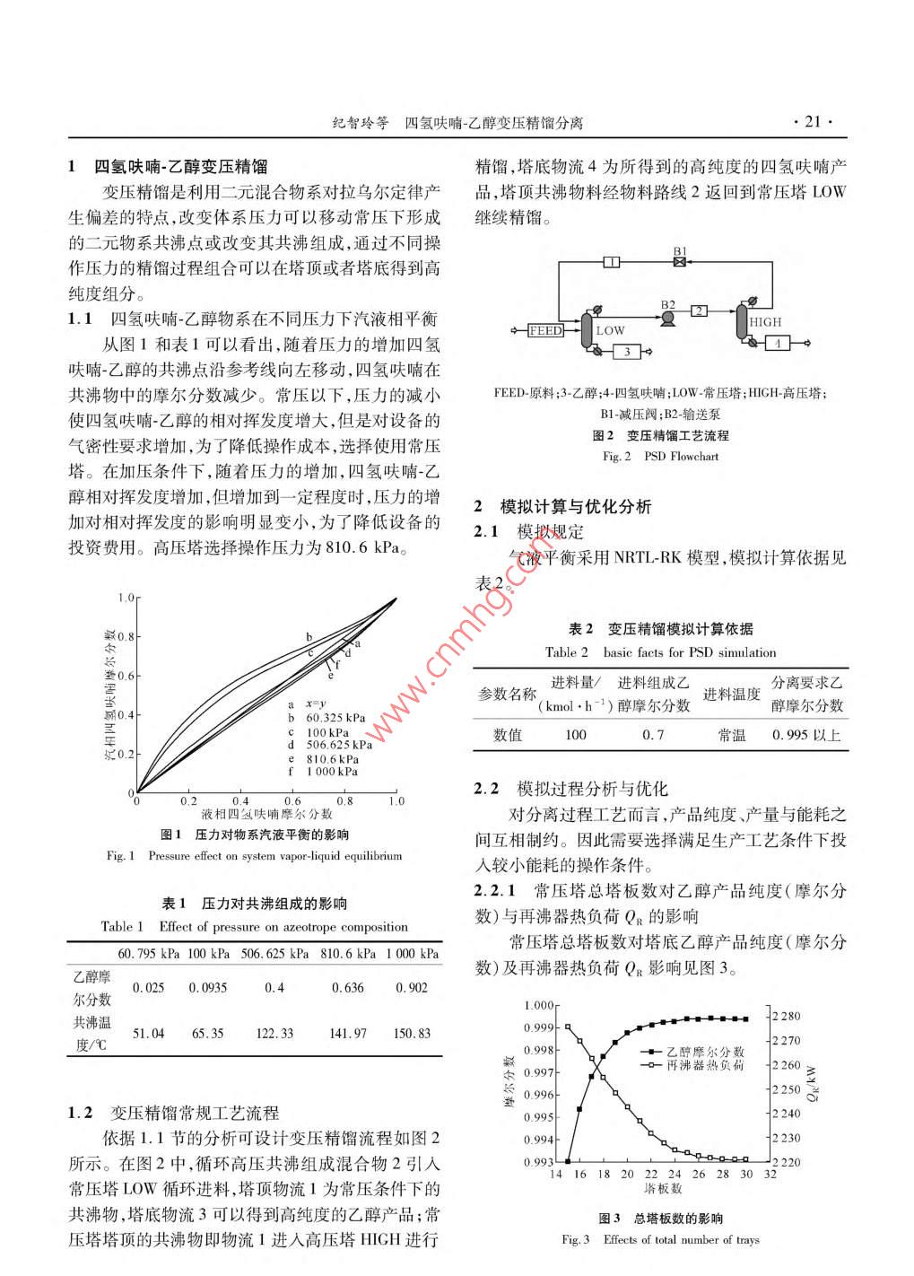 第42卷第10期化學(xué)工程Vol 42 No 102014年10月CHEMICAL ENGINEERING( CHINAOct.2014四氫呋喃-乙醇變壓精餾分離紀智玲,王志恒,李文秀,于三三,張志剛,李雙明,范俊剛,張弢(沈陽化工大學(xué)遼寧省化工分離技術(shù)重點實驗室,遼寧沈陽110142)摘要:共沸混合物分離是化工過程中常見的分離難題。變壓精餾是根據(jù)物系壓力改變而使液體混合物共沸點組成發(fā)生變化,進而使共沸物系得以分離的一種有效分離方法。在熱力學(xué)分析基礎(chǔ)上,提出了四氫呋喃-乙醇液體混合物變壓精餾分離雙塔工藝流程。以 NRTL-RK為物性計算方法,利用 Aspen Plus模擬軟件對變壓精餾分離工藝過程進行分析及模擬,并對工藝參數(shù)進行優(yōu)化。研究結(jié)果表明:在常壓塔和0.8MPa高壓塔組成的雙塔流程中變壓精餾可將四氫呋喃-乙醇最低共沸混合物進行較好的分離。關(guān)鍵詞:汽液平衡;共沸物;變壓精餾;模擬中圖分類號:TQ028.3文獻標識碼:A文章編號:10059954(2014)10002005DOI:10.3969/j.isn.10059954.2014.10.005Pressure-swing distillation separation oftetrahydrofuran-ethanol azeotropeJI Zhi-ling, WANG Zhi-heng, LI Wen-xiu, YU San-san, ZHANG Zhi-gang, LI Shuang- mingFAN Jun-gang, ZHANG TaoKey Lab of Chemical Separation Technology of Liaoning Province, Shenyang University of Chemical TechnologyShenyang 110142, Liaoning Province, ChinaAbstract: Azeotrope separations are tough issues commonly confronted in chemical processes. Pressure-swingdistillation( PSD) is based on the fact that azeotropic composition varies with the operational pressure, by whichazeotrope is then separated effectively. The azeotrope of tetrahydrofuran-ethanol characters that azeotropic pointappears in the vapor-liquid equilibrium, which makes it hard to separate tetrahydrofuran-ethanol liquid mixtureexperimentally and industrially. PSD is expected to fix this kind of separations effectively. In the research a dualcolumn process flow of tetrahydrofuran-ethanol pressure-swing distillation was put forward based on thermodynamicsanalysis. Aspen Plus simulation of pressure-swing distillation process of tetrahydrofuran-ethanol azeotrope wascarried out via NRTL-RK method. The technological parameters were optimized based on the process analysis. Itshows that tetrahydrofuran-ethanol azeotrope can be well separated by means of a two-column pressure-swingdistillation process, which is composed of atmospheric tower and high pressure tower(0. 8 MPa). It is helpful inguiding the process design for separation of tetrahydrofuran-ethanol azeotropeKey words: vapor-liquid equilibria; azeotrope; pressure-swing distillation; simulation四氫呋喃與乙醇是重要的有機溶劑,廣泛應(yīng)用優(yōu)點712于化工、制藥、染料等領(lǐng)域。工業(yè)生產(chǎn)中產(chǎn)生的四氫應(yīng)用 Aspen Plus模擬軟件,依據(jù)四氫呋喃呋喃和乙醇液體混合物具有最低共沸點,采用普通乙醇體系汽液平衡數(shù)據(jù)研究了其變壓精餾分離精餾無法對其實現(xiàn)有效分離。具有最低共沸點的難過程特性,并對過程工藝參數(shù)進行優(yōu)化分析,提出分離混合物,可以采用恒沸精餾,萃取精餾,加鹽精個具有較高分離效率的四氫呋喃-乙醇雙塔變壓精餾等6特殊精餾方法。但與之相比,變壓精餾更餾分離路線。研究結(jié)果將有助于指導(dǎo)該類共沸體系具有工藝簡單、不引入雜質(zhì)以及節(jié)約能耗等獨特分離過程的工業(yè)設(shè)計。收稿日期:201401406作者簡介:紀智玲(1962—),女,副教授,主要研究傳質(zhì)過程及新型分離技術(shù),電話:18602419780,E-mal:yizhiling@163.com。紀智玲等四氫呋喃-乙醇變壓精餾分離1四氫呋喃-乙醇變壓精餾精餾,塔底物流4為所得到的高純度的四氫呋喃產(chǎn)變壓精餾是利用二元混合物系對拉烏爾定律產(chǎn)品,塔頂共沸物料經(jīng)物料路線2返回到常壓塔DOW生偏差的特點,改變體系壓力可以移動常壓下形成繼續(xù)精餾。的二元物系共沸點或改變其共沸組成,通過不同操作壓力的精餾過程組合可以在塔頂或者塔底得到高純度組分。1.1四氫呋喃-乙醇物系在不同壓力下汽液相平衡HFEEDH LOW從圖1和表1可以看出,隨著壓力的增加四氫呋喃-乙醇的共沸點沿參考線向左移動,四氫呋喃在共沸物中的摩爾分數(shù)減少。常壓以下,壓力的減小FED原料;3-乙醇;4四氫呋喃;LOW-常壓塔;HGH高壓塔;使四氫呋喃-乙醇的相對揮發(fā)度增大,但是對設(shè)備的B1減壓閥;B2-輸送泵氣密性要求增加,為了降低操作成本,選擇使用常壓圖2變壓精餾工藝流程Fig2 PSD Flowchart塔。在加壓條件下,隨著壓力的增加,四氫呋喃-乙醇相對揮發(fā)度增加,但增加到一定程度時,壓力的增2模擬計算與優(yōu)化分析加對相對揮發(fā)度的影響明顯變小,為了降低設(shè)備的2.1模擬規(guī)定投資費用。高壓塔選擇操作壓力為810.6kPa。氣液平衡采用NRTL-RK模型,模擬計算依據(jù)見表2家0.8表2變壓精餾模擬計算依據(jù)Table 2 basic facts for PSd simulation0.6( kmol. h-1)醇摩爾分數(shù)進料溫度分離要求乙參數(shù)名稱進料量/進料組成乙醇摩爾分數(shù)b60,325kPac 100 kP數(shù)值1000.7常溫0.995以上0.2d506.625kPae 810.6kPf 1 000 k Pa2.2模擬過程分析與優(yōu)化液相四氫呋喃摩爾分數(shù)對分離過程工藝而言,產(chǎn)品純度、產(chǎn)量與能耗之圖1壓力對物系汽液平衡的影響間互相制約。因此需要選擇滿足生產(chǎn)工藝條件下投Fig. 1 Pressure effect on system vapor-liquid equilibrium人較小能耗的操作條件表1壓力對共沸組成的影響2.2.1常壓塔總塔板數(shù)對乙醇產(chǎn)品純度(摩爾分Table 1 