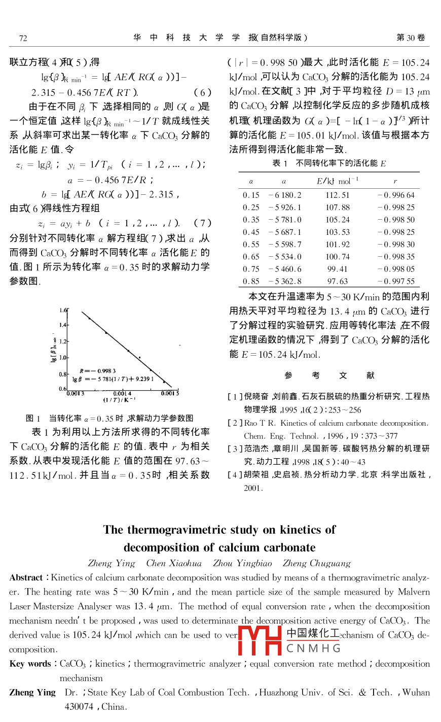第30卷第8期華中科技大學(xué)學(xué)報(bào)自然科學(xué)版)Vol, 30 No 82002年8月J. Huazhong Univ. of Sci. Tech Nature Science EditionAug.2002CaCO3分解動(dòng)力學(xué)的熱重研究鄭瑛陳小華周英彪鄭楚光華中科技大學(xué)煤燃燒國家重點(diǎn)實(shí)驗(yàn)室)摘要:在升溫逑率為5~30K/min的范圍內(nèi)利用熱天平對平均粒徑為13.4m的(aO進(jìn)行了分解過程的實(shí)驗(yàn)研究.應(yīng)用等轉(zhuǎn)化率法在不假定機(jī)理函數(shù)的情況下得到了CaO3分解的活化能E=105.24k/mol.該值與前人對于平均粒徑D=13m的CaO3分解以控制化學(xué)反應(yīng)的多步隨機(jī)成核機(jī)理機(jī)理函數(shù)為((a)=[-1(1-a)]所得到的活化能E=105.01k/mo非常一致關(guān)鍵詞:石灰石;反應(yīng)動(dòng)力學(xué);熱重分析;等轉(zhuǎn)化率法;分解機(jī)理中圖分類號:TK16文獻(xiàn)標(biāo)識(shí)碼:A文章編號:1671-451x2002)8007102石灰石的分解過程是一個(gè)相當(dāng)復(fù)雜的過程盡管許多研究人員對CaCO3的煅燒分解過程已d≈合s(是),(3)經(jīng)進(jìn)行了很多研究1-31但是,煅燒過程的復(fù)雜式中為升溫速率;o為初始溫度性以及對所采用的實(shí)驗(yàn)裝置的依賴性導(dǎo)致所報(bào)道前人關(guān)于CaO3分解動(dòng)力學(xué)過程的研究都的反應(yīng)級數(shù)n表觀活化能E以及指前因子A是先假定控制CaCO分解的機(jī)理函數(shù)f(a)減或在一個(gè)較寬的范圍內(nèi)變化并且存在許多不一致(Xa)然后利用熱重分析數(shù)據(jù)求出CaCO3分解的地方.的活化能E和指前因子A1-31本文采用德國 Netzsch公司Sta409熱天平所假定的機(jī)理函數(shù)的形式將直接影響所得到對平均粒徑為13.4m的CaO進(jìn)行了分解過的動(dòng)力學(xué)參數(shù)求解動(dòng)力學(xué)參數(shù)的等轉(zhuǎn)化率法即程的實(shí)驗(yàn)研究在不假定機(jī)理函數(shù)的情況下得到 Flynn-Wall-Ozawa法4],避開了反應(yīng)機(jī)理函數(shù)的了(aCO3分解的活化能E.實(shí)驗(yàn)條件為樣品質(zhì)選擇而通過不同升溫速率下的熱重分析曲線直接量為5.8mg升溫速率/Kmin-1分別為5,7,10,求出分解反應(yīng)的活化能E值避免了因反應(yīng)機(jī)理122030吹掃氣為N2流量為100ml/min函數(shù)的假設(shè)不同而可能帶來的誤差描述反應(yīng) CaCO(s)CaOs)+OO(g)的令u=ERT)由T=EARu)知有動(dòng)力學(xué)方程有微分和積分兩種不同的形式dT=-[E Ru huda/dt= kf( a);(1)于是方程3換成方程((a)0f(a)(2)((a)=ART式中a為CaO3轉(zhuǎn)化為CaO的份額;t為時(shí)間AEf(a內(nèi)為描述控制化學(xué)反應(yīng)的機(jī)理函數(shù)決為化學(xué)Pu)(4)反應(yīng)速度常數(shù),般以 Arrhenius形式表示成k=(a)的分部積分表達(dá)式為Aex-E/RT)]A為指前因子;E為活化能;R為通用氣體常數(shù);T為溫度Pu)對于非定溫的情形,T=To+t那么1)和式(2)可以變換為dalaT=(alB)f(a lexp-E/RT)]中國煤化工對對數(shù)展開項(xiàng)取一級((a)=AEdyhCNMHGlgP(u)=-2.315-0.4567EART).(5)收稿日期:200203-12作者簡介:鄭瑛1967-)男博士武漢華中科技大學(xué)煤燃燒國家重點(diǎn)實(shí)驗(yàn)室(430074)基金項(xiàng)目:國家重點(diǎn)基礎(chǔ)研究專項(xiàng)經(jīng)費(fèi)資助項(xiàng)目(G1902205)家自然科學(xué)基金資助項(xiàng)目500002華中科技大學(xué)學(xué)報(bào)自然科學(xué)版)第30卷聯(lián)立方程4和5)得|r|=0.99850)最大,此時(shí)活化能E=105.24IgiB x min-1= lg ae(RG( a ) )kJ/mol可以認(rèn)為CaO3分解的活化能為105.242.315-0.4567E/RT)(6)kJ/mo.在文獻(xiàn)3對于平均粒徑D=13m由于在不同β下選擇相同的a則(a是的CaCO分解以控制化學(xué)反應(yīng)的多步隨機(jī)成核個(gè)恒定值這樣lg{βkm-1~1/T就成線性關(guān)機(jī)理機(jī)理函數(shù)為(xa)=[-l(1-a)3所計(jì)系從斜率可求岀某一轉(zhuǎn)化率α下CaO3分解的算的活化能E=105.01k/mol.該值與根據(jù)本方活化能E值.令法所得到得活化能非常一致lg;y=1/T(i=1,2…,l);表1不同轉(zhuǎn)化率下的活化能Ea=-0.4567E/RE/k于mol1b=lAE/R((a))]-2.315,0.15-6180.2112.510.99664由式6線性方程組0.25-5926.1107.880.99825l).(7)0.35-5781.0105.240.99850分別針對不同轉(zhuǎn)化率a解方程組7)求出a隊(duì)從0.45-5687.1103.530.998250.55-5598.7101.920.99830而得到CaO3分解時(shí)不同轉(zhuǎn)化率a活化能E的0.65-5534.0100.740.99835值圖1所示為轉(zhuǎn)化率a=0.35時(shí)的求解動(dòng)力學(xué)0.75-5460.60.99805參數(shù)圖0.85-5362.80.99755本文在升溫速率為5~30K/min的范圍內(nèi)利用熱天平對平均粒徑為13.4m的CaO3進(jìn)行了分解過程的實(shí)驗(yàn)研究.應(yīng)用等轉(zhuǎn)化率法在不假定機(jī)理函數(shù)的情況下得到了CaCO3分解的活化能E=105.24kJ/molR=-09983lgf=-578l(7)+9239參考文獻(xiàn)[1]倪曉奮劉前鑫.石灰石脫硫的熱重分析研究.工程熱物理學(xué)報(bào),9951((2):253-25圖1當(dāng)轉(zhuǎn)化率α=0.35時(shí)求解動(dòng)力學(xué)參數(shù)圖2 ]Rao TR. Kinetics of calcium carbonate decomposition表1為利用以上方法所求得的不同轉(zhuǎn)化率Chem. Eng. Technol., 1996, 19: 373-377下CaOO分解的活化能E的值.表中r為相關(guān)[3]范浩杰章明川吳國新等碳酸鈣熱分解的機(jī)理研系數(shù).從表中發(fā)現(xiàn)活化能E值的范圍在97.63究動(dòng)力工程199885):40~43112.51kJ/nol.并且當(dāng)α=0.35時(shí),相關(guān)系數(shù)[4]胡榮祖,史啟禎熱分析動(dòng)力學(xué).北京科學(xué)出版社2001The thermogravimetric study on kinetics ofdecomposition of calcium carbonateZheng ying Chen Xiaohua Zhou yingbiao Zheng chuguan