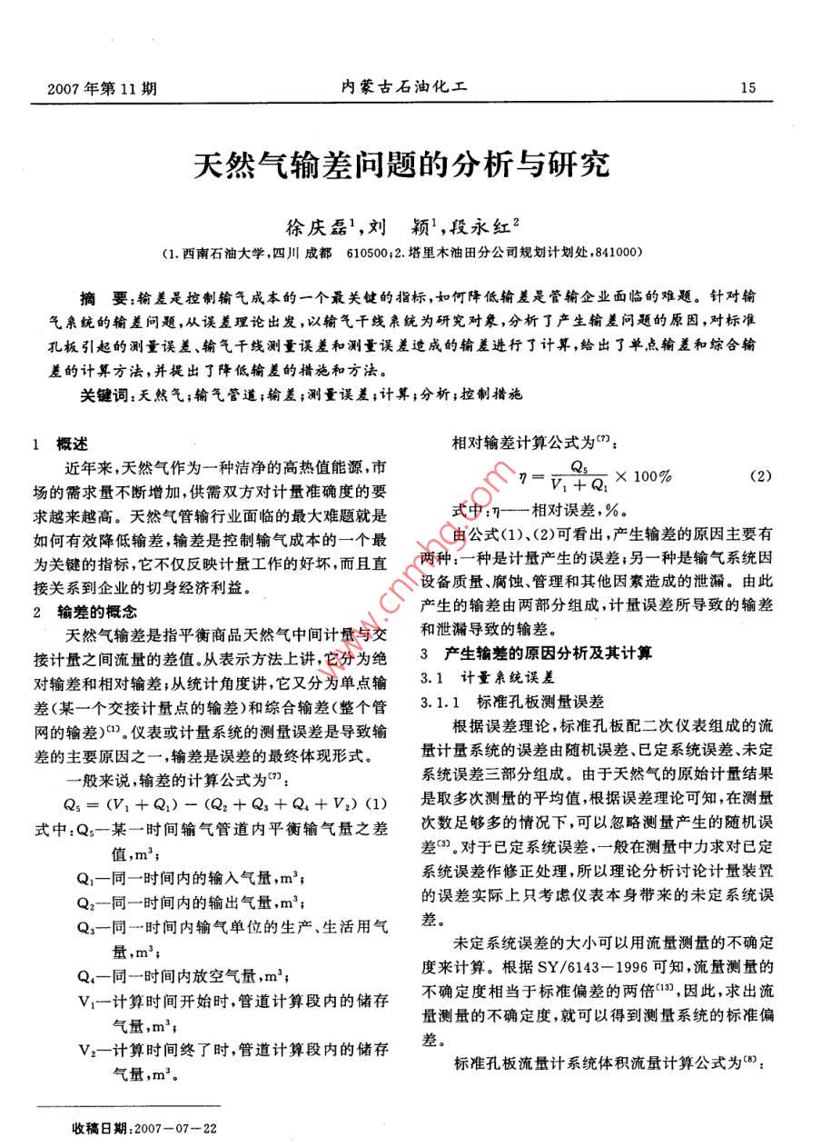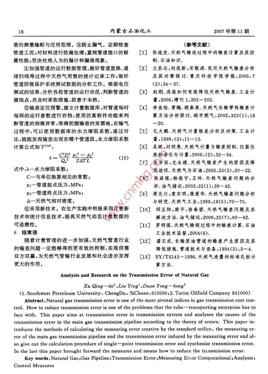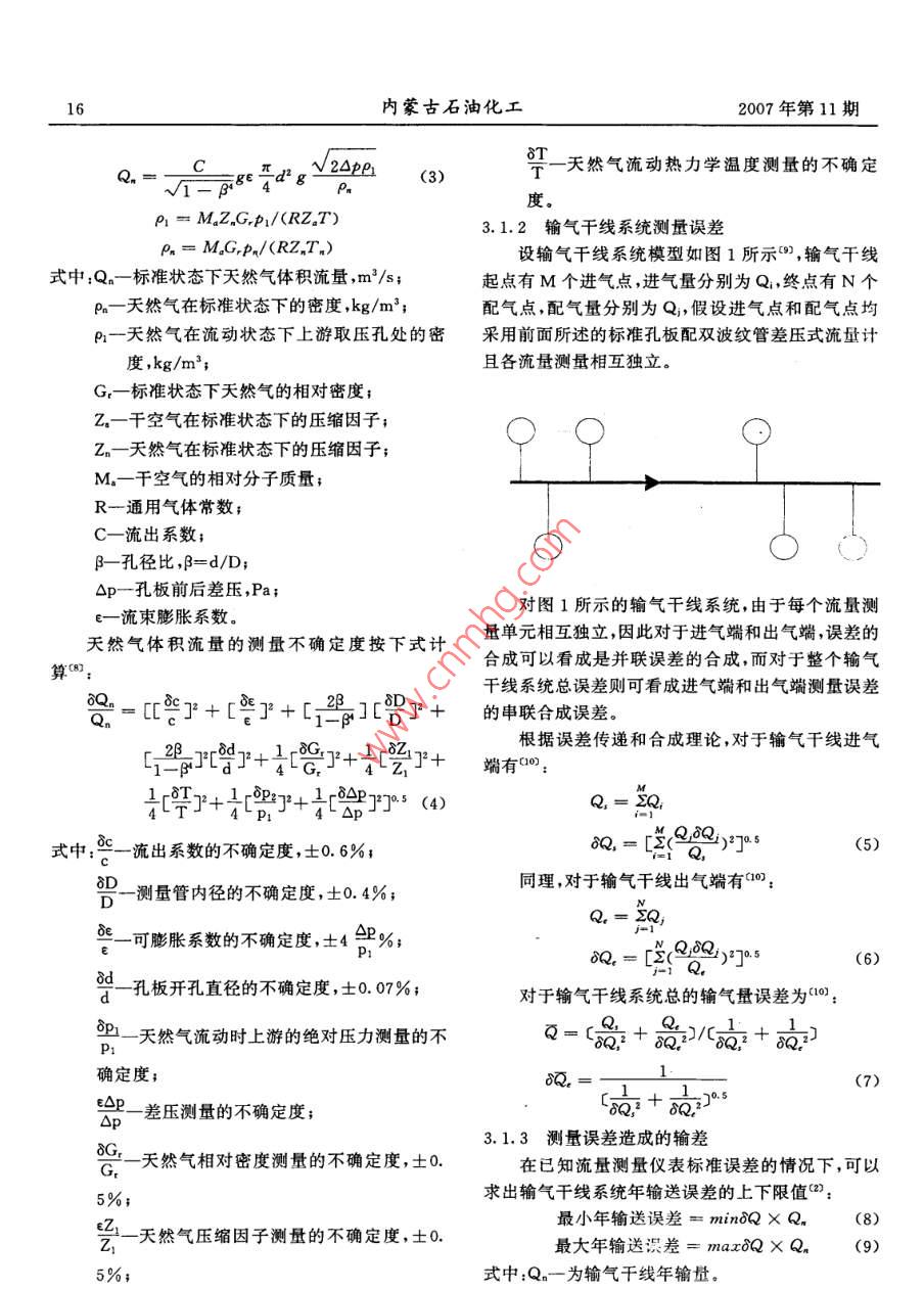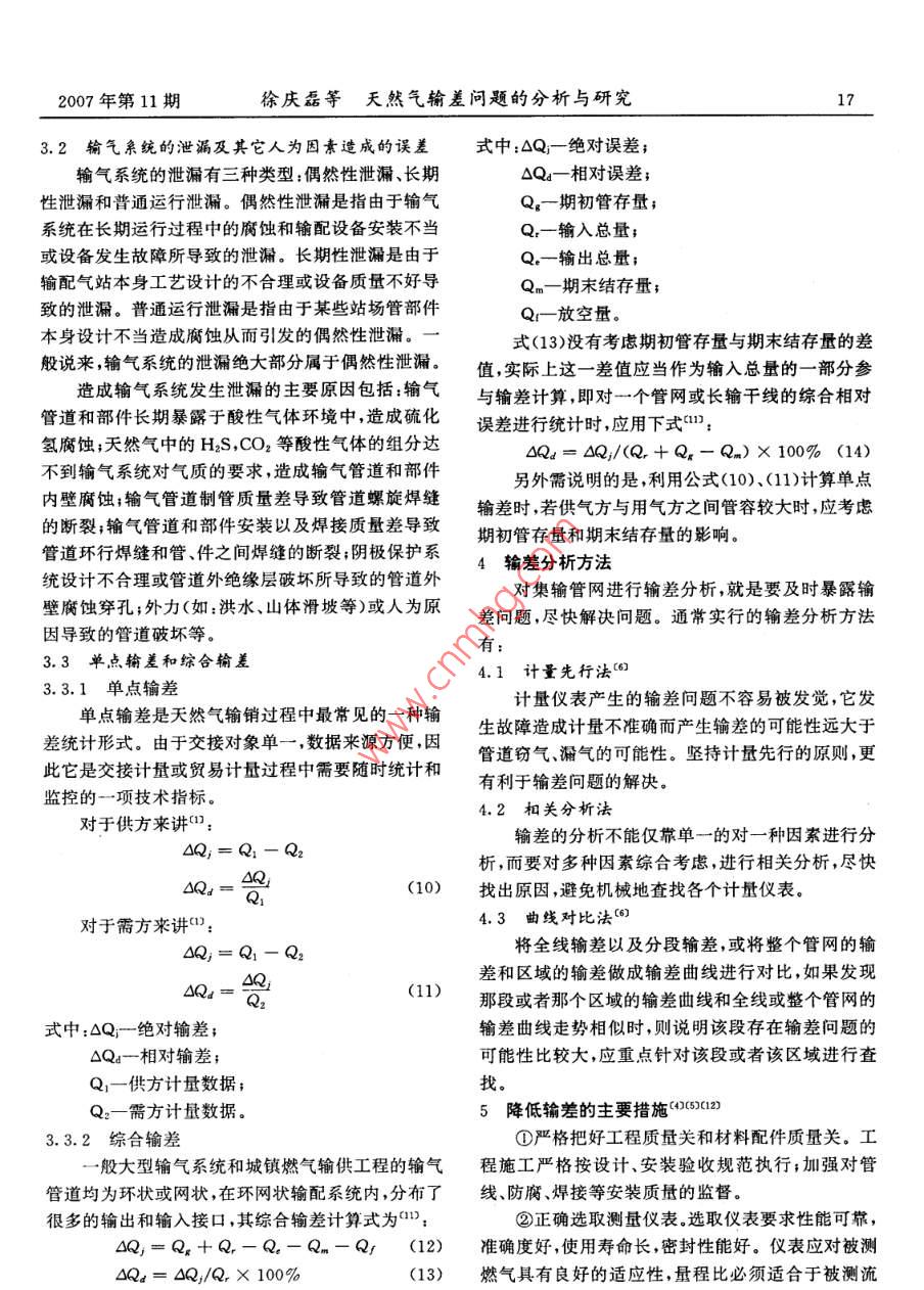2007年第11期內(nèi)蒙古石油化工天然氣輸差問題的分析與研究徐慶磊,劉穎,段永紅2(1.西南石油大學四川成都610500;2.塔里木油田分公司規(guī)劃計劃處,841000)摘要:輸差是控制輸氣成本的一個最關(guān)鍵的指標,如何降低輸差是管輸企業(yè)面臨的難題。針對輸氣親統(tǒng)的輸差問題,從誤差理論出發(fā),以輸氣干線親統(tǒng)為研究對象,分析丁產(chǎn)生輸差問題的原因,對標準孔板引起的測量誤差、輸氣干線測量誤差和測量誤差造成的輸差進行了計算,給出了單點輸差和綜合輸差的計算方法,并提出了降低輸差的措施和方法關(guān)鍵詞:天然氣;輸氣管道;輸差;測量誤差;計算;分析;控制措施概述相對輸差計算公式為()近年來,天然氣作為一種潔凈的高熱值能源,市場的需求量不斷增加,供需雙方對計量準確度的要7=v1+a×10%(2)求越來越高。天然氣管輸行業(yè)面臨的最大難題就是式中:相對誤差,%。如何有效降低輸差,輸差是控制輸氣成本的一個最由公式(1)、(2)可看出,產(chǎn)生輸差的原因主要有為關(guān)鍵的指標,它不僅反映計量工作的好壞而且直兩種:一種是計量產(chǎn)生的誤差;另一種是輸氣系統(tǒng)因接關(guān)系到企業(yè)的切身經(jīng)濟利益。設備質(zhì)量、腐蝕、管理和其他因素造成的泄漏。由此輸差的概念產(chǎn)生的輸差由兩部分組成,計量誤差所導致的輸差天然氣輸差是指平衡商品天然氣中間計量與交和泄漏導致的輸差。接計量之間流量的差值從表示方法上講,它分為絕3產(chǎn)生輸差的原因分析及其計算對輸差和相對輸差;從統(tǒng)計角度講,它又分為單點輸31計量親統(tǒng)誤差差(某一個交接計量點的輸差)和綜合輸差(整個管3.1.1標準孔板測量誤差網(wǎng)的輸差)0)儀表或計量系統(tǒng)的測量誤差是導致輸根據(jù)誤差理論,標準孔板配二次儀表組成的流差的主要原因之一,輸差是誤差的最終體現(xiàn)形式。量計量系統(tǒng)的誤差由隨機誤差、已定系統(tǒng)誤差、未定一般來說,輸差的計算公式為m:系統(tǒng)誤差三部分組成。由于天然氣的原始計量結(jié)果Q3=(v1+Q)-(Q2+Q3+Q+V2()是取多次測量的平均值,根據(jù)誤差理論可知,在測量式中:Q一某一時間輸氣管道內(nèi)平衡輸氣量之差次數(shù)足夠多的情況下,可以忽略測量產(chǎn)生的隨機誤值,m3;差(對于已定系統(tǒng)誤差,一般在測量中力求對已定Q1-同一時間內(nèi)的輸入氣量,m3系統(tǒng)誤差作修正處理,所以理論分析討論計量裝置Q2-同一時間內(nèi)的輸出氣量,m3;的誤差實際上只考慮儀表本身帶來的未定系統(tǒng)誤Q3-同一時間內(nèi)輸氣單位的生產(chǎn)、生活用氣差量未定系統(tǒng)誤差的大小可以用流量測量的不確定Q4-同一時間內(nèi)放空氣量,m3;度來計算。根據(jù)SY/6143-1996可知,流量測量的V1計算時間開始時管道計算段內(nèi)的儲存不確定度相當于標準偏差的兩倍,因此求出流氣量,m3;量測量的不確定度,就可以得到測量系統(tǒng)的標準偏v,計算時間終了時,管道計算段內(nèi)的儲存差。氣量,m3。標準孔板流量計系統(tǒng)體積流量計算公式為(:收稿日期:2007-07—-2216內(nèi)蒙古石油化工2007年第11期TT度天然氣流動熱力學溫度測量的不確定PI=M,Z,GPi/(RZaT)31.2輸氣干線系統(tǒng)測量誤差P.= MG-P.(RZ, T)設輸氣干線系統(tǒng)模型如圖1所示”,輸氣干線式中:Q一標準狀態(tài)下天然氣體積流量,m3/s起點有M個進氣點,進氣量分別為Q,終點有N個P一天然氣在標準狀態(tài)下的密度,kg/m3;配氣點,配氣量分別為Q,假設進氣點和配氣點均P2-天然氣在流動狀態(tài)下上游取壓孔處的密采用前面所述的標準孔板配雙波紋管差壓式流量計度,kg/m3;且各流量測量相互獨立G一標準狀態(tài)下天然氣的相對密度;Z。一干空氣在標準狀態(tài)下的壓縮因子;Zn天然氣在標準狀態(tài)下的壓縮因子;M。一干空氣的相對分子質(zhì)量;R一通用氣體常數(shù);C一流出系數(shù);B一孔徑比,B=d/D;△p-孔板前后差壓,Pa;E一流東膨脹系數(shù)。對圖1所示的輸氣干線系統(tǒng),由于每個流量測天然氣體積流量的測量不確定度按下式計量單元相互獨立,因此對于進氣端和出氣端,誤差的算合成可以看成是并聯(lián)誤差的合成,而對于整個輸氣干線系統(tǒng)總誤差則可看成進氣端和出氣端測量誤差=[]+[]+[2][0y+的串聯(lián)合成誤差。2[y+4c:y+乙y+端有根據(jù)誤差傳遞和合成理論,對于輸氣干線進氣4y+4y+9]5(4)Q,= 2Q式中:一流出系數(shù)的不確定度,士0.6%;Q,Q(5)D-測量管內(nèi)徑的不確定度,士0.4%同理,對于輸氣干線出氣端有(0:e可膨脹系數(shù)的不確定度,士42%Q, dQ(6)一孔板開孔直徑的不確定度,士0.07%;對于輸氣干線系統(tǒng)總的輸氣量誤差為0天然氣動葉上游的絕對壓力測量的不0-器+品(+h確定度;(7)E△P一差壓測量的不確定度;31.3測量誤差造成的輸差天然氣相對密度測量的不確定度,士0.在已知流量測量儀表標準誤差的情況下,可以5%;求出輸氣干線系統(tǒng)年輸送誤差的上下限值(2):2-天然氣壓縮因子測量的不確定度,士0最小年輸送誤差=minQ×Q(8)最大年輸送識差=maxQ×Qn(9)5%式中:Qn-為輸氣干線年輸量。2007年第11期徐慶磊等天然氣輸差問題的分析與研究173.2輸氣親統(tǒng)的泄漏及其它人為因素造成的誤差式中:△Q一絕對誤差;輸氣系統(tǒng)的泄漏有三種類型:偶然性泄漏、長期△Qa-相對誤差;性泄漏和普通運行泄漏。偶然性泄漏是指由于輸氣Q一期