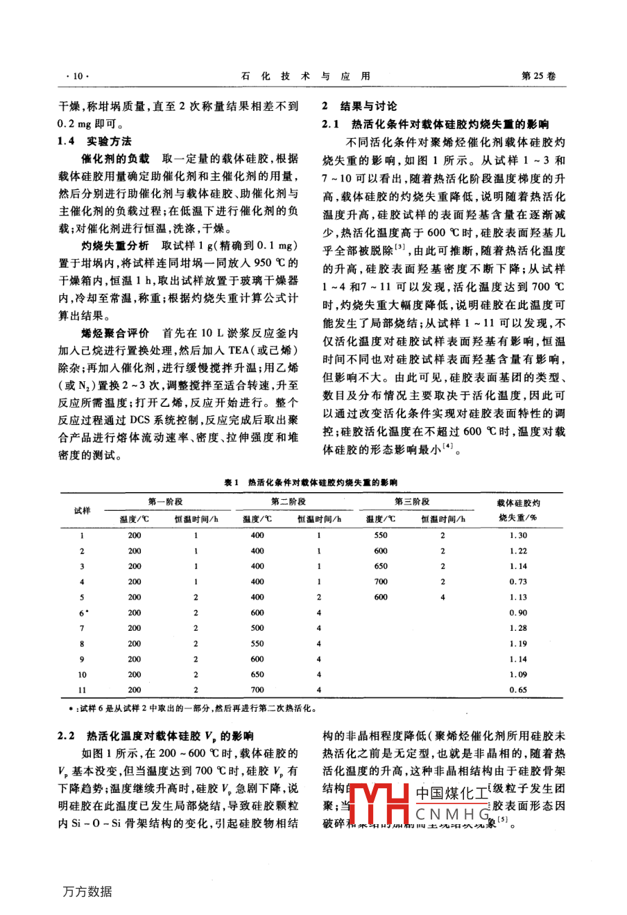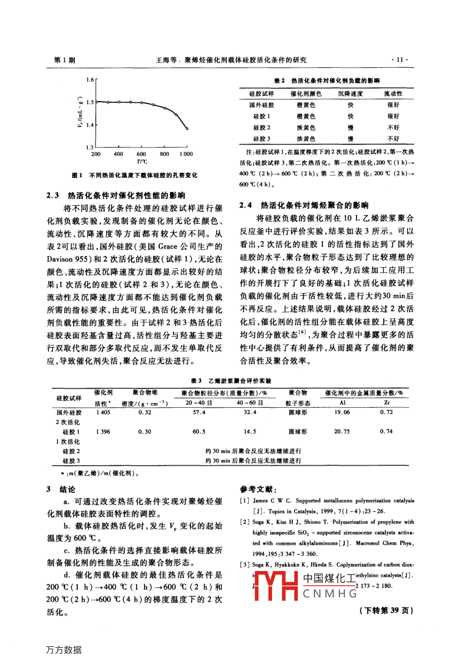 第25卷第1期石化技術(shù)與應(yīng)用Vol.25 No.12007年1月Petrochemical Technology & ApplicationJan.2007研究與開(kāi)發(fā)(9~11)聚烯烴催化劑載體硅膠活化條件的研究王海,曲其昌,姚培洪(中國(guó)石油蘭州石化分公司石油化工研究院,甘肅蘭州730060)摘要:研究了不同活化條件對(duì)聚烯烴催化劑載體硅膠的灼燒失重、表面形態(tài)、孔容以及催化劑的活性、聚合物形態(tài)的影響。實(shí)驗(yàn)結(jié)果表明:對(duì)聚烯烴催化劑載體硅膠表面特性的調(diào)控可通過(guò)改變熱活化條件實(shí)現(xiàn);熱活化條件的選擇直接影響載體硅膠所制備催化劑的性能及生成的聚合物形態(tài);載體硅膠熱活化時(shí),發(fā)生孔容變化的起始溫度為600C;聚烯烴催化劑載體硅膠的最佳熱活化條件是200C(1h)→400 C(1 h)- +600 C(2 h)和200 C(2 h)- -+600 C(4 h)的梯度溫度下的二次活化。關(guān)鍵詞:聚烯烴;催化劑載體;硅膠;熱活化;灼燒失重中圈分類(lèi)號(hào):TQ 426. 65文獻(xiàn)標(biāo)識(shí)碼:B文章編號(hào):1009 -0045(2007)01 -0009 -03目前聚烯烴工業(yè)催化劑以負(fù)載型催化劑為 式電阻爐,遼寧省沈陽(yáng)市長(zhǎng)城工業(yè)電爐廠(chǎng)產(chǎn)品;主,硅膠是氣相法工藝中應(yīng)用較廣的催化劑載101 A-2型干燥箱,上海市實(shí)驗(yàn)儀器廠(chǎng)產(chǎn)品;普體',由于其能對(duì)聚合物粒子具有良好的形態(tài)控通玻璃干燥器,浙江省臺(tái)州市中谷科技有限公司制,近年來(lái),在聚乙烯催化劑和茂金屬催化劑負(fù)產(chǎn)品;HJ-3型數(shù)碼恒溫磁力攪拌器,江蘇省常州載化領(lǐng)域中的應(yīng)用更為廣泛口。中國(guó)石油蘭州市國(guó)華電器有限公司產(chǎn)品;F-101型反應(yīng)釜,容石化分公司(以下簡(jiǎn)稱(chēng)為蘭州石化)石油化工研積為3.8m',甘肅銀光化學(xué)工業(yè)公司化工機(jī)械廠(chǎng)究|院經(jīng)過(guò)多年的探索與研究,成功開(kāi)發(fā)出具有自產(chǎn)品;烯烴聚合評(píng)價(jià)裝置,容積10 L,美國(guó)Xytel公主知識(shí)產(chǎn)權(quán)的載體硅膠(LSG-1),并進(jìn)行了工業(yè)司產(chǎn)品;AE 240型電子分析天平,精度為0.1 mg,化應(yīng)用,打破了國(guó)外長(zhǎng)期在催化劑載體硅膠領(lǐng)域瑞士Mettler公司產(chǎn)品。對(duì)市場(chǎng)的壟斷。載體硅膠在催化劑制備過(guò)程中.1.3實(shí)驗(yàn)準(zhǔn) 備首先必須進(jìn)行高溫活化,而不同的活化條件將產(chǎn)催化劑載體硅膠的制備采用 晶核粒子增生形態(tài)、活性及性能不同的催化劑。本工作主要長(zhǎng)凝膠方法在反應(yīng)釜中進(jìn)行硅膠產(chǎn)品制備,要求考察了熱活化條件對(duì)聚烯烴催化劑載體硅膠的產(chǎn)品形態(tài)為球狀粉末,比表面積為400.0 m2/g左灼燒失重量、孔容(V,)、表面形態(tài)、催化劑的活性右,V。為1.50 mL/g,平均孔徑為1.98x10 -°m,平及聚合物形態(tài)的影響。均粒徑為40μm,堆密度為0.29~0.31g/cm'。不同初含水量硅膠試樣的制備在箱式電1實(shí)驗(yàn)部分阻爐內(nèi),分批次進(jìn)行硅膠試樣于一定溫度梯度和1.1 原材料保溫時(shí)間的活化,然后將干燥好的硅膠試樣放置水玻璃,工業(yè)級(jí),其模數(shù)[n(SiO2)/于干燥器內(nèi),以備第二天進(jìn)行灼燒失重實(shí)驗(yàn)的n(Na,0)]為3.1 ~3.4,蘭州石化催化劑廠(chǎng)生產(chǎn);測(cè)試。硫酸(H2SO,) ,分析純,甘肅省白銀市銀環(huán)化學(xué)制坩堝恒重的測(cè)試將 瓷坩堝放在干燥箱內(nèi)劑廠(chǎng)生產(chǎn);已烷,蘭州石化石油化工廠(chǎng)生產(chǎn);三乙干燥,稱(chēng)坩堝質(zhì)量,再將坩堝放在干燥箱內(nèi)進(jìn)行基鋁(TEA) ,中國(guó)石油遼陽(yáng)化工公司生產(chǎn)。1.2 設(shè)備與儀器中國(guó)煤化工SX2-5 - 12型箱式電阻爐,天津市天驕工C NMH G06-11-13作看國(guó)燈:王博(1919- -),另,酮孔囊?jiàn)A人,助理工程師,主要業(yè)有限公司實(shí)驗(yàn)電爐廠(chǎng)產(chǎn)品;SX 2-4-10型箱從事催化劑載體的研究工作。已發(fā)表論文1篇?!?0.石化技術(shù)與應(yīng)用第25卷干燥. ,稱(chēng)坩堝質(zhì)量,直至2次稱(chēng)量結(jié)果相差不到2結(jié)果與討論.0.2 mg即可。2.1熱活 化條件對(duì)載體硅膠灼燒失重的影響1.4實(shí)驗(yàn)方法不同活化條件對(duì)聚烯烴催化劑載體硅膠灼催化劑的負(fù)載取- 一定量的載體硅膠,根據(jù)燒失重的影響,如圖1所示。從試樣1~3和載體硅膠用量確定助催化劑和主催化劑的用量,7~10可以看出,隨著熱活化階段溫度梯度的升然后分別進(jìn)行助催化劑與載體硅膠、助催化劑與高,載體硅膠的灼燒失重降低,說(shuō)明隨著熱活化主催化劑的負(fù)載過(guò)程;在低溫下進(jìn)行催化劑的負(fù)溫度升高,硅膠試樣的表面羥基含量在逐漸減載;對(duì)催化劑進(jìn)行恒溫,洗滌,干燥。少,熱活化溫度高于600C時(shí),硅膠表面羥基幾灼燒失重分析取試樣 1 g(精確到0.1 mg)乎全部被脫除「)],由此可推斷,隨著熱活化溫度置于坩堝內(nèi),將試樣連同坩堝一同放人950 C的的升高,硅膠表面羥基密度不斷下降;從試樣干燥箱內(nèi),恒溫1 h,取出試樣放置于玻璃干燥器1 ~4和7 ~11可以發(fā)現(xiàn),活化溫度達(dá)到700 C內(nèi),冷卻至常溫,稱(chēng)重;根據(jù)灼燒失重計(jì)算公式計(jì)時(shí),灼燒失重大幅度降低,說(shuō)明硅膠在此溫度可算出結(jié)果。烯烴聚合評(píng)價(jià)首先在10L淤漿反應(yīng)釜內(nèi)能發(fā)生了局部燒