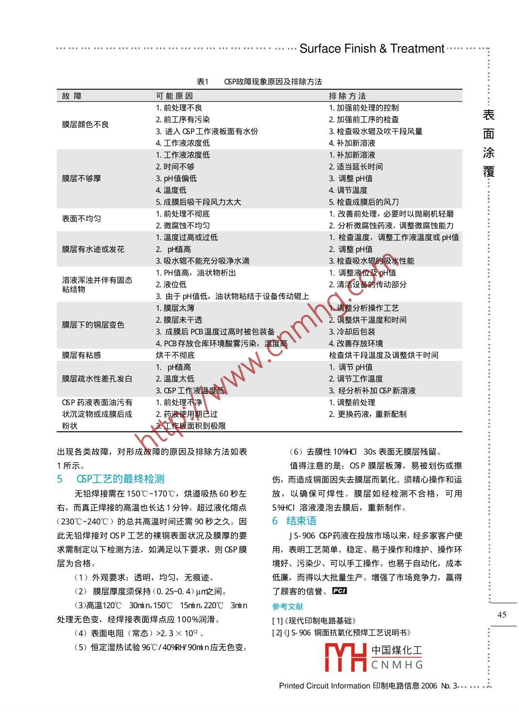 …… Surface Finish& TreatmentP工藝與應(yīng)用表面涂覆(恩森化學(xué)有限公司318020)羊秋福辛建樹摘要隨著環(huán)保領(lǐng)域?qū)﹄娮赢a(chǎn)品的要求,OP將成為PB表面涂覆的趨勢。本文就OP工藝應(yīng)用、維護及檢測進(jìn)行了闡述。關(guān)鍵詞有機助焊保護膜OSP Process and applicationYang Qiufu Xin JianshuAbstract With the requisition for electronic product of the environmental protection field, OSP will become thetrend of surface coating of PCB. This text has been explained on OSp process is used, maintained and measuredKey words organic solderability preservatives隨著歐盟L37《官方公報》公布了歐洲議會和歐1工藝流程盟部長理事會共同批準(zhǔn)的《報廢電子、電氣設(shè)備指令》除油→清洗→微蝕刻→去離子水清洗→酸洗→(EE2002/96/EC)和《關(guān)于限制在電氣電子設(shè)備中去離子水清洗→吸水輥吸干→冷風(fēng)吹干→S-906P使用某些有害物質(zhì)指令》(RoHs2002/95/EC),又于藥液涂覆→吹干→去離子水清洗→吹干→烘干2006年7月開始實施無鉛等六大有害物質(zhì)的禁用。無其中藥液的作用:以置疑,熱風(fēng)整平(涂鉛/涂錫)工藝將被淘汰?;?1)除油的作用是除去外形成型及測試后PCB表學(xué)鎳金、化學(xué)沉銀、化學(xué)沉錫、∝sP(有機助焊保護面的手漬,輕微油污等;膜,俗稱防氧化)等工藝將取代熱風(fēng)整平(涂鉛/涂(2)蝕刻的目的是經(jīng)過微蝕刻使PCB銅面微觀狀錫)工藝。但化學(xué)鎳金、化學(xué)沉銀、化學(xué)沉錫因成本態(tài)呈“森林”狀凹凸不平,保證耐熱防氧化膜的成膜高、制程復(fù)雜、穩(wěn)定性欠佳等原因,制約了大批量生厚度及焊錫流動性,防止虛焊的產(chǎn)生產(chǎn)的需求。而∝P工藝是通過化學(xué)的方法,在裸銅表(3)酸洗的作用:為了除去銅面經(jīng)微腐蝕后殘留面形成一層0.2μm0.5μm的憎水性有機保護膜。這層的銅離子、復(fù)式鹽,保證銅面潔凈;膜保護銅表面使其避免氧化,對多種焊劑兼容,并能(4)OSP處理:這是PCB抗氧化處理的技術(shù)核承受三次以上的熱沖擊,而且工藝操作溫度低,有利心,PCB裸銅經(jīng)αsP藥液處理后,即形成耐熱抗氧于保證印制板電裝前焊點的平整度與板面翹曲度,從化膜。43而成為了替代熱風(fēng)整平工藝的主流工藝。恩森公司適2O5P工藝各藥液維護與控制時推出了」S系列OP藥液,以適應(yīng)印制板行業(yè)的需PG表面貼裝要求OP膜厚度應(yīng)介于0.2m0.4μm求?,F(xiàn)對其工藝流程及維護與檢驗予以介紹。之間。有試驗中國煤化工2m)時在CNMHGPrinted Circuit Information印制電路信息2006№b.3.…∴:…… Surface Finish& Treatment:回流焊多次熱循環(huán)過程中導(dǎo)致銅面氧化而組裝失敗;作前,就先用5%堿液浸泡各槽,用水徹底清洗,然表當(dāng)膜厚大于0.4m時,膜層不能被錫膏里的助焊劑完后用5%SQ溶液漫泡,再用純水清洗干凈,以防止全去除,從而降低可焊性或虛焊,故應(yīng)以下面各要素污染物質(zhì)進(jìn)入O5P藥液。在設(shè)備選型時,最好考慮逆面涂覆維護藥液予以控制膜厚。流清洗,保證各清洗泵的壓力,以潔凈PCB表面及孔內(nèi)的清潔。保證各藥液的壽命,降低生產(chǎn)成本,同時保證pH值可以增加αP藥液主份的溶解度,促經(jīng)常檢測最后各槽-道水洗的pH值。進(jìn)結(jié)合保護膜的形成,但pH值過高會使銅表面保護2.6吸水輥及風(fēng)干膜溶解。一般pH值應(yīng)控制于2.5-2.8之間,最佳狀態(tài)為保持OsP藥液的平衡,在PCB板進(jìn)入OSP藥為2.6。實際生產(chǎn)中如發(fā)現(xiàn)藥液變渾濁或有白色絮狀液之前,應(yīng)用吸水輥吸干水份,并以冷風(fēng)刀的形式吹沉淀物產(chǎn)生時應(yīng)用精密pH計測量其pH值。測定之千孔內(nèi)的水份,防止水份帶入到OP藥液。一旦水份:前,必須用pH4及pH7標(biāo)準(zhǔn)緩沖液標(biāo)定pH計。pH未被吸干,可能出現(xiàn)膜層發(fā)花等弊病,此時應(yīng)檢查吸值調(diào)整可用少量的分析純甲酸(冰乙酸、醋酸)調(diào)整,水輥的吸水質(zhì)量,必要時更換吸水輥。定期檢查冷風(fēng)添加時,打開過濾泵,在藥液流動的狀態(tài)下緩緩添加,機進(jìn)風(fēng)口濾清器的運行狀況,以防止空氣中的粉塵吸直至要求值(注意:甲酸不能過量,若發(fā)現(xiàn)過量時,入而帶入OP藥液,影響穩(wěn)定,加速藥液老化,影響可用氨水調(diào)整)成膜質(zhì)量。2.2溫度3OP工作液成份及膜層厚度的分析方控制各藥液的溫度在工藝值并經(jīng)常驗證溫度的3.1總酸度測量準(zhǔn)確性是保證工藝穩(wěn)定的前提。若不控制除油液的取25m工作液,加150mh純水,(1-2)mh中性紅溫度,可能導(dǎo)致去油不干凈,微腐蝕藥液溫度不符指示劑,用1.0N№a滴定至紅色消失??偹岫?1.0N會造成微腐蝕液的分解或OsP膜層不夠厚,而且在№CH×消耗毫升數(shù)×4.3銅面微腐蝕量達(dá)到1.5um-2.μm才能確保焊接的3.2濃度的分析可靠性。因此控制微腐蝕溫度在25℃-30℃是很有必打開分光光度計,并讓其保溫10-20分鐘,取要的。同樣,操作溫度影響¤P藥液的成膜速度,溫4m工作液至1升容量瓶中,加去離子水至刻度,調(diào)度升高成膜速度加快,但會影響到膜層的致密度,控節(jié)分光光度計到270nm用去離子水裝滿1cm∪瓶制溫度在35℃~45℃,是形成致密度適中的有機保護并調(diào)整至零吸收。除去1cmU瓶用工作液裝滿1cm膜的關(guān)鍵。UV瓶,將該瓶放回分光光度計,記錄吸收率。2.3浸泡時間計算方式」S-906工作液9