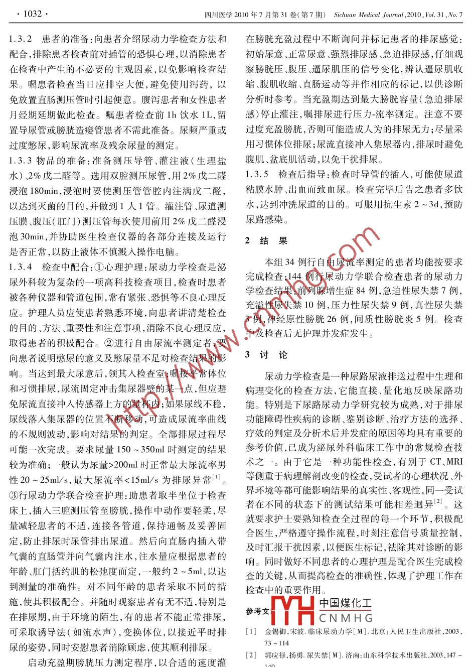 四川醫(yī)學(xué)2010年7月第31卷(第7期) Sichuan Medical Journal,2010,Vol.31,No.710尿動(dòng)力學(xué)檢查護(hù)理配合王琳,胡蓉(瀘州醫(yī)學(xué)院屬成都363醫(yī)院泌尿外科,四川成都610041)【摘要】目的探討尿動(dòng)力學(xué)檢查的護(hù)理特點(diǎn)和注意事項(xiàng)。方法總結(jié)178例患者尿動(dòng)力學(xué)檢查的護(hù)理措施。結(jié)果所有患者均能積極配合檢查,無(wú)護(hù)理并發(fā)癥。結(jié)論作為一項(xiàng)功能性檢查方法,積極的心理護(hù)理,熟練正確的操作配合對(duì)尿動(dòng)力學(xué)檢查的順利完成有重要意義?!娟P(guān)鍵詞】尿動(dòng)力學(xué);護(hù)理【中圖分類號(hào)】R473.6【文獻(xiàn)標(biāo)識(shí)碼】B【文章編號(hào)】10040501(2010)07-1031402尿流動(dòng)力學(xué)( urodynamics)是泌尿外科學(xué)的一門1.2檢查方法:使用 Laborie公司尿動(dòng)力學(xué)檢查儀和新興分支學(xué)科,主要研究排尿的生理活動(dòng)及其功能障專用尿動(dòng)力學(xué)檢查導(dǎo)管、生理鹽水。單純行自由尿流礙。其原理依據(jù)流體力學(xué)和電生理學(xué),檢測(cè)尿路各部率測(cè)定者,囑患者憋尿,達(dá)最大膀胱容量時(shí)盡全力將尿分壓力、流率及生物電活動(dòng),了解尿路排送尿液的功能全部排于集尿器,測(cè)定單位時(shí)間內(nèi)經(jīng)尿道排出的尿量和機(jī)制,以及排尿功能障礙性疾病的病理生理學(xué)變化,等多項(xiàng)尿流率指標(biāo);進(jìn)行尿動(dòng)力學(xué)聯(lián)合檢査者,亦囑患為臨床診斷提供準(zhǔn)確的客觀依據(jù)。我院2005年6月者憋尿,達(dá)最大膀胱容量時(shí)盡全力排尿,行自由尿流率2009年5月共進(jìn)行尿動(dòng)力學(xué)檢查178例,現(xiàn)將護(hù)理配測(cè)定,而后在無(wú)菌操作下將尿動(dòng)力學(xué)專用導(dǎo)管置入膀合體會(huì)報(bào)告如下。胱,測(cè)定膀胱剩余尿量,然后按ICS(國(guó)際尿控協(xié)會(huì))技資料與方法術(shù)規(guī)范行充盈性膀胱測(cè)壓和壓力-流率測(cè)定;病情需要者,可繼續(xù)行尿道壓力分布檢查。1.1一般資料:本組共178例,男115例,女63例;年1.3護(hù)理配合齡14~80歲;其中前列腺增生癥118例,急迫性尿失1.3.1檢查前準(zhǔn)備:環(huán)境準(zhǔn)備:排尿過程涉及患者隱禁7例,充溢性尿失禁10例,壓力性尿失禁9例,真性私,在有外界干擾時(shí),難于表現(xiàn)其真實(shí)排尿狀況,甚至尿失禁3例,神經(jīng)原性膀胱26例,間質(zhì)性膀胱炎5例;可能排不出尿,影響尿動(dòng)力檢査結(jié)果。所以尿動(dòng)力室單純行自由尿流率測(cè)定34例,進(jìn)行尿動(dòng)力學(xué)聯(lián)合檢查應(yīng)寬敞、安靜、舒適、清潔,要充分考慮患者的隱私,在144例檢查床和計(jì)算機(jī)操作區(qū)之間用拉簾相隔。護(hù)士的相對(duì)固定。這樣充分挖掘了護(hù)理人員的潛能,展。激勵(lì)了護(hù)理人員的工作積極性,激發(fā)了護(hù)理人員的創(chuàng)新精神。隨著??苹碚撝R(shí)和操作技能不斷的鞏固參考文獻(xiàn)和提高,有效的縮短了手術(shù)間接臺(tái)的準(zhǔn)備時(shí)間,并逐漸1郭艷紅探討和建立??谱o(hù)士制度提高護(hù)理專業(yè)技術(shù)水平[J.中摸索出適合醫(yī)院不同專科甚至不同手術(shù)醫(yī)生的手術(shù)準(zhǔn)華護(hù)理雜志,2004,39(12):952備要求,形成規(guī)范化,醫(yī)護(hù)手術(shù)配合更加默契,提高醫(yī)[2]王彩云,手術(shù)室設(shè)立??谱o(hù)士的做法與成效[J].中華護(hù)理雜志生的滿意度,縮短手術(shù)時(shí)間,保證手術(shù)順利安全完成。[3]王宇,付菊芳張慧杰,等手術(shù)室??谱o(hù)士培養(yǎng)思路及實(shí)踐[J此外,手術(shù)器械的專人管理,有利于及時(shí)發(fā)現(xiàn)故障、及護(hù)理研究,2006,20(1):83時(shí)維修,保證了儀器設(shè)備的正常使用4]張靜,楊彬?qū)O少瓊.等.手術(shù)室專科護(hù)士的培訓(xùn)體會(huì)[J.西南軍近幾年經(jīng)過系統(tǒng)的理論培訓(xùn)和實(shí)踐培訓(xùn),手術(shù)室中國(guó)煤化工護(hù)士??苹炎C明此方法可培養(yǎng)出高度專業(yè)化和一專[5]CNMH果評(píng)價(jià)[J.泰山醫(yī)學(xué)院學(xué)報(bào),2007,28(12):990-991多能的現(xiàn)代化手術(shù)室護(hù)士6,是激勵(lì)護(hù)士努力學(xué)習(xí)進(jìn)[6]毛小萍,手術(shù)室??谱o(hù)士組的設(shè)置和管理[J].解放軍護(hù)理雜志取的一種手段,是提高手術(shù)室護(hù)理質(zhì)量的科學(xué)的管理2005,22(8):83~84方法,從而更好的適應(yīng)現(xiàn)代化大型醫(yī)院、手術(shù)室的發(fā)(收稿日期:2010403407)1032四川醫(yī)學(xué)2010年7月第31卷(第7期) Sichuan Medical journal,2010,Vol.31,No.71.3.2患者的準(zhǔn)備:向患者介紹尿動(dòng)力學(xué)檢查方法和在膀胱充盈過程中不斷詢問并標(biāo)記患者的排尿感覺:配合,排除患者檢査前對(duì)插管的恐懼心理,以消除患者初始尿意、正常尿意、強(qiáng)烈排尿感、急迫排尿感,仔細(xì)觀在檢查中產(chǎn)生的不必要的主觀因素,以免影響檢査結(jié)察膀胱壓、腹壓、逼尿肌壓的信號(hào)變化,辨認(rèn)逼尿肌收果。囑患者檢査當(dāng)日應(yīng)排空大便,避免使用瀉藥,以縮、腹肌收縮、直腸運(yùn)動(dòng)等并作相應(yīng)的標(biāo)記,以供診斷免放置直腸測(cè)壓管時(shí)引起便意。腹瀉患者和女性患者分析時(shí)參考。當(dāng)充盈期達(dá)到最大膀胱容量(急
