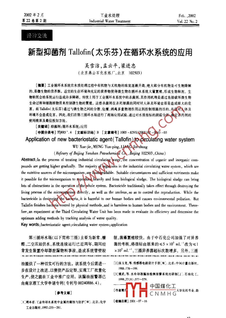 2002 年2月T業(yè)水處理Feb. ,2002第22卷第2期Industrial W alter TreatmentVol. 22 No.2經(jīng)驗(yàn)交流新型抑菌劑Tallofin(太樂芬)在循環(huán)水系統(tǒng)的應(yīng)用吳雪潔,孟云平,梁進(jìn)忠(北京燕山石化東煉廠,北京102503)[摘要]工業(yè)循環(huán)水系統(tǒng)在水質(zhì)處理過程中有機(jī)物與無機(jī)物的濃度逐漸升高,絕大部分有機(jī)物是明生物降解的,是微生物的營(yíng)養(yǎng)源。適宜的生存環(huán)境和充足的營(yíng)養(yǎng)物使得微生物在循環(huán)水系統(tǒng)大量繁殖,形成生物粘泥。生物粘泥會(huì)給系統(tǒng)運(yùn)行造成許多障礙。傳統(tǒng)l:用于工業(yè)循環(huán)水系統(tǒng)中的殺菌劑,其作用機(jī)理是通過直接破壞微生物生命過程和細(xì)胞核物質(zhì)來控制微生物的繁殖。這些殺菌劑在殺死細(xì)菌的同時(shí)對(duì)人體及環(huán)境也容易造成極大的危害:而Taloin(太樂芬)通過與微生物之間的分散、包覆、剝離多重物理作用達(dá)到控制細(xì)菌的目的,并且對(duì)人體及環(huán)境不會(huì)造成危害。因此.我們?cè)诘谌h(huán)水場(chǎng)進(jìn)行了現(xiàn)場(chǎng)應(yīng)用試驗(yàn).通過對(duì)水質(zhì)指標(biāo)的跟蹤分析.確定該藥劑的使用效果及最佳投加方法。[關(guān)鍵詞]抑菌劑;循環(huán)水系統(tǒng);應(yīng)用[中團(tuán)分類號(hào)] T0085*.4 [文獻(xiàn)標(biāo)識(shí)碼]B [文章編號(hào)] 1005 -829X(2002)02 -0043 -03Application of new bacteriostatic agent( Tallofin)to circulating water systemWU Xue-jie , MENG Yun-ping, LIANG Jin-zhong(Refinery of Beijing Yanshan Petrochemical Co. , Bejing 102503 ,China)Abstract:In the process of treating industrial eirculaing water , the concentration of organie and inorganic com-pounds are gtting higher gradully. The majority of organisms in the industrial eirculating water system, which arethe nutritive sources of the microorganism, are biodegradable. Suitable circumstances and sufficient nutriments makeit possible for the miroorganism l0 reproduce heavily and form biological sludge. The biological sludge can bringlots of obstructions in the operation of the whole system. Bactericide traditinally lakes efect through destroying theliving process of the microorganism directly, as well as the uncleus, so as to control the reproduction. While thebactericide is destroying the bacleria, it is harmful to our human bodies and causes environmental pollution. ButTallofn finishes bacteria control by physical methods , and is harmless to human bodies and the environment. There-fore , an experiment at the Third Circulating Water Unit has been made to evaluate its eficiency and determine theoptimum adding methods by tracking analysis of water quality.Key words :baceriostatic agent;circulating water system;pplication第三循環(huán)水場(chǎng)(以下簡(jiǎn)稱三循)主要為新常、楝臟,菌藻繁殖較快。由于中石化公司加強(qiáng)了對(duì)異養(yǎng)醛、二空壓站供水,系統(tǒng)連續(xù)運(yùn)行已近兩年,期間經(jīng)菌的考核,將指標(biāo)由原來的≤5x10' mL"'改為≤1常發(fā)生裝置冷卻器泄漏物料事故,造成系統(tǒng)管壁較x10° ml.-I ,三循異養(yǎng)菌超標(biāo)次數(shù)增多。另外,三循|●制+1|1+[1l1I◆HI +l1+1+1+1號(hào)+10+1號(hào)1+|]1)1]|+| 1川+|1川川|◆11=1|+|+1|+1|◆1)◆+副+◆l:◆+|◆l國(guó)◆1+|◆+ +1判油提供了一-種切實(shí)可行的方法。該系統(tǒng)今后需進(jìn)一[2]張玉龍,等傳憾器電路設(shè)計(jì)手冊(cè)[ M].北京:中國(guó)計(jì)量出版社,步在設(shè)計(jì)上改進(jìn)以便使產(chǎn)品定型,實(shí)現(xiàn)工廠批量化1988:178-199.生產(chǎn).使之能在工業(yè)中推廣應(yīng)用。該漏油報(bào)警器已[3]雷武,等水冷卻器漏油檢測(cè)報(bào)警系統(tǒng)的研制[J].石油化L.1998 ,27(8) :577-579.由南京理工大學(xué)申請(qǐng)專利(專利號(hào)00240886. 4)。[作者簡(jiǎn)中國(guó)煤化工大學(xué)化機(jī)專業(yè).助[參考文獻(xiàn)]YHCNMHGI周本省.工業(yè)冷卻水系統(tǒng)中金屬的腐蝕與防護(hù)[M].北京:化學(xué)[收稿日期] 2001 -07-16 .工業(yè)出版社199255-261.43 -工業(yè)水處理2002 -02 ,22(2)經(jīng)驗(yàn)交流沖擊性投加非氧化性殺菌劑造成系統(tǒng)水質(zhì)不平穩(wěn),60 kg/d,每月沖擊性投加非氧化性殺菌劑2次,每置換水量較大,生產(chǎn)成本增加。針對(duì)這種情況,我們次500 kg.采用新型抑菌劑Tllolin(太樂芬)在三循進(jìn)行現(xiàn)場(chǎng)1.3 試驗(yàn)數(shù)據(jù).應(yīng)用試驗(yàn)。現(xiàn)場(chǎng)加藥及補(bǔ)水情況見表|,水質(zhì)分析見表2,Tllo是德國(guó)斯托克豪森公司開發(fā)的一-種新監(jiān)測(cè)換熱器試驗(yàn)數(shù)據(jù)見表 3,掛片腐蝕數(shù)據(jù)見表4。-代全新機(jī)制的用于工業(yè)水處理和水循環(huán)過程中的表1現(xiàn)場(chǎng)加藥及補(bǔ)水粘泥和沉積物挖制劑。據(jù)介紹, Tllofio是從生物中時(shí)間補(bǔ)水量Tllofio投加量藥劑質(zhì)量濃度提取的復(fù)雜化合物,分子中含有很強(qiáng)表面活性的基/(kg.h')/(ag”)團(tuán)和高吸附性能的基團(tuán)。這種產(chǎn)品的作用機(jī)理與傳基礎(chǔ)投加3020統(tǒng)殺菌劑的作用機(jī)理完全不同,傳統(tǒng)殺菌劑是通過06-23-07-13連續(xù)投加30~40 ..20直接破壞徽生物的生命過程和細(xì)胞核物質(zhì),從而降07-14-40-50:0低其繁殖速度,而Tlofon則不同,它之所以能控制08-11和消除水系統(tǒng)的微生物滋生弊病是基于以下三種作從表2數(shù)據(jù)可以看出.投加Tlloion以