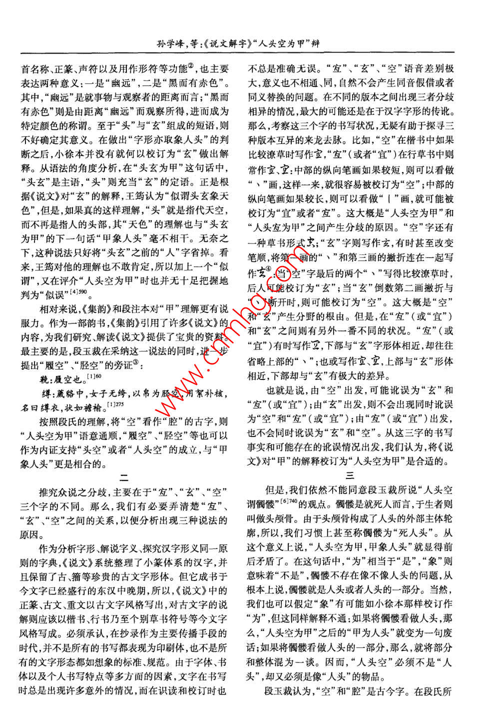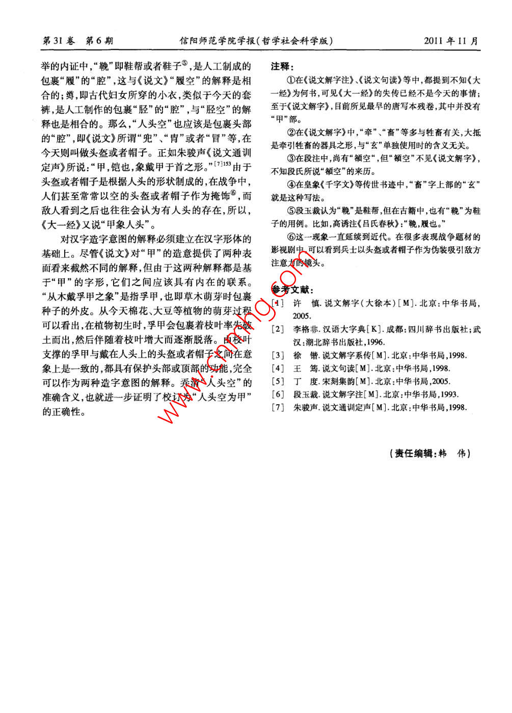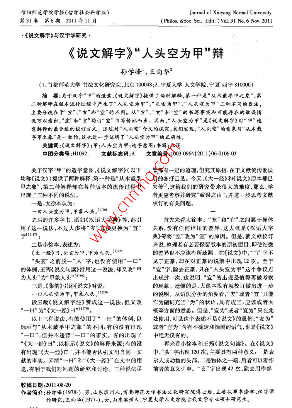信陽(yáng)師范學(xué)院學(xué)報(bào)(哲學(xué)社會(huì)科學(xué)版)Journal of Xinyang Normal University第31卷第6期2011年11月Philos. &Soc. Sci. Edit.)Vol 31 No 6 Nov. 2011《說(shuō)文解字》與漢字學(xué)研究·《說(shuō)文解字》“人頭空為甲”辯孫學(xué)峰!,王向華2(1.首都師范大學(xué)書(shū)法文化研究院,北京100048;2.寧夏大學(xué)人文學(xué)院,寧夏西寧810000)摘要:關(guān)于漢字“甲”的造意,《說(shuō)文解字》提供了兩種解釋,第一種是“從木戴乎甲之象”,第二種解釋在版本流傳過(guò)程中產(chǎn)生了“人頭宜為甲”、“頭玄為甲”、“人頭空為甲”三種不同的說(shuō)法,主要分歧在于“空”、“玄”和“空”的不同。從“空”、“玄”和“空”的書(shū)寫(xiě)事實(shí)和可能存在的訛誤情況可以看出,“空”和“玄”均由“空”書(shū)寫(xiě)傳訛而出。因而,“人頭空為甲”是《說(shuō)文解字》對(duì)“甲”造意解釋的最合適的校訂方式。通過(guò)對(duì)“人頭空”含義的探究,我們發(fā)現(xiàn),“人頭空”的意象與“從木戴孚甲之象”是一致的,這也進(jìn)一步證明了“人頭空為甲”的正確性。關(guān)鍵詞:《說(shuō)文解字》;甲;人頭空為甲;造字意圖;書(shū)寫(xiě);訛誤中圖分類(lèi)號(hào):H1092.文獻(xiàn)標(biāo)志碼:A文章編號(hào):100340964(201106010603關(guān)于漢字“甲”的造字意圖,《說(shuō)文解字》(以下管都有一定的道理,但究其原初,在于文獻(xiàn)流傳訛誤均稱(chēng)《說(shuō)文》)提供了兩種解釋,第一種是“從木戴孚后的各抒己見(jiàn)。今天,《大一經(jīng)》和《說(shuō)文》原本都已甲之象”,第二種解釋卻在各種版本的流傳過(guò)程中失傳①,這給我們的研究帶來(lái)很大的難度,那么,學(xué)出現(xiàn)了三種不同的說(shuō)法。者更應(yīng)考察并研究“致誤之由”,并進(jìn)一步思考文獻(xiàn)是,大徐本認(rèn)為校訂的有關(guān)問(wèn)題。一曰人頭空為甲,甲象人頭。130之后的許多字書(shū),諸如《漢語(yǔ)大字典》等,都引首先來(lái)看大徐本。“”和“宜”之間屬于異體用了這一說(shuō)法,不過(guò)大多將“發(fā)”直接更換為“宜”關(guān)系,沒(méi)有任何語(yǔ)用的差異,這大概是《漢語(yǔ)大字2]1173典》等將“”改為“宜”的原因。但是,就文獻(xiàn)校訂二是小徐本,表述為來(lái)說(shuō),整理者有必要保留版本的原初面目,即使細(xì)微《太一經(jīng)》曰,頭玄為甲,甲為人頭。13278的差異也不應(yīng)該有所疏漏。在《說(shuō)文》中,“宜”字不頭玄”之前脫一“人”字,也沒(méi)有使用“一曰”見(jiàn)于正篆,卻在對(duì)正篆的說(shuō)解中出現(xiàn)12次。至于的體例,王筠《說(shuō)文句讀》沿用這一說(shuō)法,卻又改“甲“友”字,除去正篆,只在“人頭定為甲”這個(gè)爭(zhēng)議點(diǎn)為人頭”為“甲象人頭”;出現(xiàn)過(guò)一次,這說(shuō)明,“”的出現(xiàn)是值得再做考察三是,《集韻》引述《說(shuō)文》時(shí)說(shuō):的現(xiàn)象。遺憾的是,大徐本沒(méi)有就校訂做出進(jìn)一步一曰人頭空為甲,甲象人頭。5126的說(shuō)明。從語(yǔ)法分析的角度看,“友”或者“宜”只能段玉裁《說(shuō)文解字注》贊成這一說(shuō)法,但又改作為副詞充當(dāng)“為”的狀語(yǔ),具有應(yīng)當(dāng)、應(yīng)該或者大日”為“《大一經(jīng)》日”6。概等方面的意思。但是,“家為”或者“宜為”只在此以上三種說(shuō)法,有的使用了“一曰”的體例,以處使用,可見(jiàn)這個(gè)表述不是《說(shuō)文》的通例;“為標(biāo)示與“從木戴孚甲之象”的不同;有的沒(méi)有出現(xiàn)或者“宜為”含有不確定和揣測(cè)的語(yǔ)氣,也是《說(shuō)文》“一日”,但并不違背“一日”的事實(shí)。有的出現(xiàn)了中絕無(wú)僅有的。《大一經(jīng)》曰”,以標(biāo)示《說(shuō)文》的解釋來(lái)源;有的沒(méi)再來(lái)看小徐本和王筠《說(shuō)文句讀》。在《說(shuō)文》有出現(xiàn)“《大一經(jīng)》曰”,并不能否認(rèn)引文出自同一文中,“頭”字出現(xiàn)120次,主要具有兩種意義:一是表獻(xiàn)的事實(shí)。弄清“一日”和“《大一經(jīng)》”在文中的用示人或動(dòng)物的頭部,二是物體之一端,后者可以看作途,有利于我們對(duì)問(wèn)題的研究和討論。三種說(shuō)法盡前者的意義引申?!靶弊殖霈F(xiàn)42次,除去用作部收稿日期:2011408-20作者簡(jiǎn)介:孫學(xué)峰(1978-),男,山東濱州人,首都師范大學(xué)書(shū)法文化研究院博士后,主要從事書(shū)法學(xué)、漢字學(xué)的研究;王向華(1977-),女,山東濱州人,寧夏大學(xué)人文學(xué)院古代文學(xué)專(zhuān)業(yè)碩士研究生。孫學(xué)峰,等:《說(shuō)文解字》“人頭空為甲”辯首名稱(chēng)、正篆、聲符以及用作形符等功能,也主要不總是準(zhǔn)確無(wú)誤?!鞍病薄ⅰ靶?、“空”語(yǔ)音差別極表達(dá)兩種意義:一是“幽遠(yuǎn)”,二是“黑面有赤色”。大,意義也不相通、同,自然不會(huì)產(chǎn)生同音假借或者其中,“幽遠(yuǎn)”是就事物與觀察者的距離而言;“黑而同義替換的問(wèn)題。在不同的版本之間出現(xiàn)三者分歧有赤色”則是由距離“幽遠(yuǎn)”而觀察所得,進(jìn)而成為相異的情況,最大的可能還是在于漢字字形的傳訛。特定顏色的稱(chēng)謂。至于“