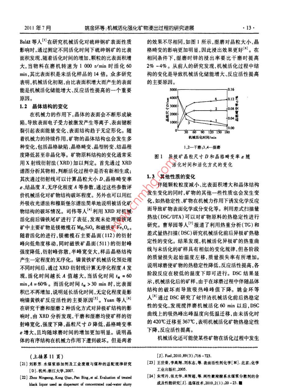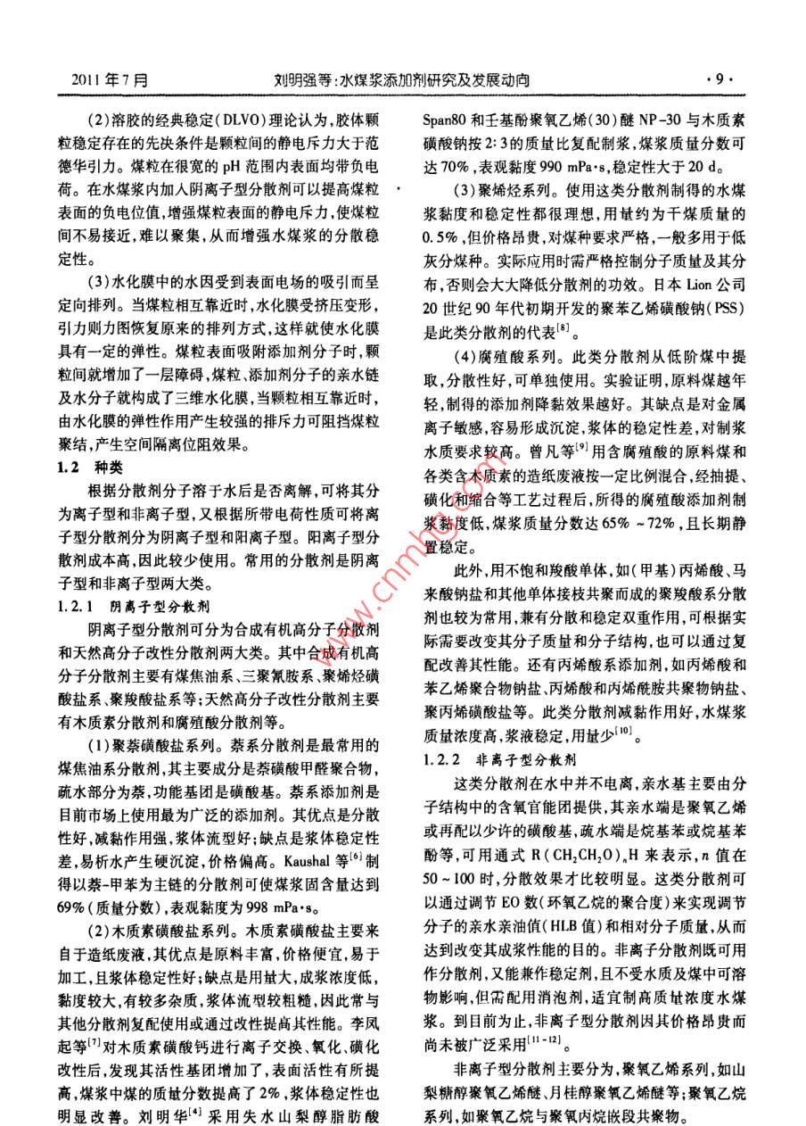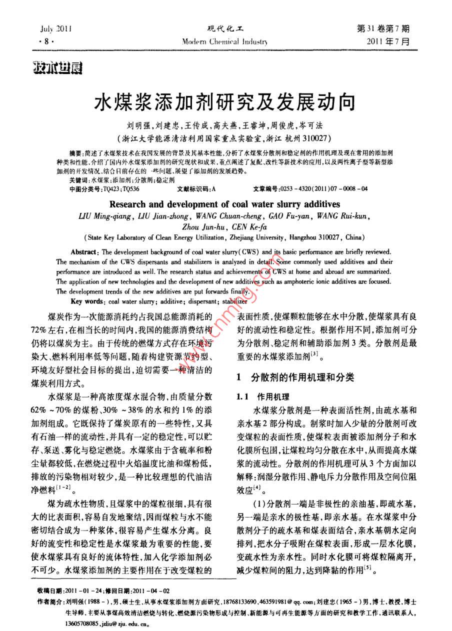 July 201I現(xiàn)代化工第3卷第7期Morem Chemical Industry2011年7月士水煤漿添加劑研究及發(fā)展動(dòng)向劉明強(qiáng),劉建忠,王傳成,高夫燕,王睿坤,周俊虎,岑可法浙江大學(xué)能源清潔利用國(guó)家重點(diǎn)實(shí)驗(yàn)室,浙江杭州310027摘要:簡(jiǎn)述了水煤漿技術(shù)在我國(guó)發(fā)展的背景及其基本性能分析了水煤漿分散劑和穩(wěn)定劑的作用機(jī)理及現(xiàn)在常用的添加劑種類和性能介紹了國(guó)內(nèi)外水煤漿添加劑的研究現(xiàn)狀和成果,重點(diǎn)闡述了復(fù)配、改性等新技術(shù)的應(yīng)用,以及兩性離子型等新型添加劑的開發(fā)情況結(jié)合前存在的些向題展望了裕加劑的發(fā)展趨勢(shì)。關(guān)鍵詞:水煤漿;添加劑;分散劑;穩(wěn)定劑中圖分類號(hào):TQ423;TQ536文獻(xiàn)標(biāo)識(shí)碼:A文章編號(hào):0253-4320(2011)07-0008-04Research and development of coal water slurry additivesLIU Ming-giang, LIU Jian-zhong, WANG Chuan-cheng, GAO Fu-yan, WANG Rui-kunZhou Jun-hu, CEN Ke-faState Key Laboratory of Clean Energy Utilization, Zhejiang University, Hangzhou 310027, China)Abstract: The development background of coal water slurry( CWS)and its basic performance are briefly reviewedThe mechanism of the Cws dispersants and stabilizers is analyzed in detail. Some commonly used additives and theirperformance are introduced as well. The research status and achievements of CWS at home and abroad are summarizedThe application of new technologies and the development of new additives such as amphoteric ionic additives are focusedThe development trends of the new additives are put forwards finally.Key words: coal water slurry; additive; dispersant; stabilizer煤炭作為一次能源消耗約占我國(guó)總能源消耗的表面性質(zhì),使煤顆粒能夠在水中分散使煤漿具有良72%左右,在相當(dāng)長(zhǎng)的時(shí)間內(nèi),我國(guó)的能源消費(fèi)結(jié)構(gòu)好的流動(dòng)性和穩(wěn)定性。根據(jù)作用不同,添加劑可分仍將以煤炭為主。由于傳統(tǒng)的燃煤方式存在環(huán)境污分散劑穩(wěn)定劑和輔助添加劑3類。分散劑是最染大燃料利用率低等問題,隨著構(gòu)建資源節(jié)約型、重要的水煤漿添加劑環(huán)境友好型社會(huì)目標(biāo)的提出,迫切需要一種清潔的煤炭利用方式。1分散劑的作用機(jī)理和分類水煤漿是一種高濃度煤水混合物,由質(zhì)量分?jǐn)?shù)1.1作用機(jī)理6%~70%的煤粉、30%~38%的水和約1%的添水煤漿分散劑是一種表面活性劑,由疏水基和加劑組成。它既保持了煤炭原有的一些特性,又具親水基2部分構(gòu)成。制漿時(shí)加入少量的分散劑可改有石油一樣的流動(dòng)性,并具有一定的穩(wěn)定性,可以貯變煤粒的表面性質(zhì),使煤粒表面被添加劑分子和水存、泵送、霧化與穩(wěn)定燃燒。水煤漿由于含硫率和粉化膜所包圍,讓煤粒均勻分散在水中,從而提高水煤塵量都較低,在燃燒過程中火焰溫度比油和煤粉低,漿的流動(dòng)性。分散劑的作用機(jī)理可從3個(gè)方面加以排放的污染物相對(duì)較少,是一種比較理想的代油潔解釋:潤(rùn)濕分散作用、靜電斥力分散作用及空間位阻凈燃料效應(yīng)。煤為疏水性物質(zhì),且煤漿中的煤粒很細(xì),具有很(1)分散劑一端是非極性的親油基,即疏水基大的比表面積容易自發(fā)地聚結(jié)因而煤粒與水不能另端是親水的極性基,即親水基。在水煤漿中分密切結(jié)合成為一種漿體,很容易產(chǎn)生煤水分離。良散劑分子的疏水基和煤表面結(jié)合,親水基朝水定向好的流變性和穩(wěn)定性是水煤漿最為重要的性能,要排列,把水分子吸附在煤粒表面形成一層水化膜使水煤漿具有良好的流體特性,加入化學(xué)添加劑必變疏水性為親水性。同時(shí)水化膜可將煤粒隔離開,不可少。水煤漿添加劑的主要作用在于改變煤粒的減少煤粒間的阻力,達(dá)到降黏的作用。收稿日期:2011-01-24;修回日期:2011-04-02作者簡(jiǎn)介:劉明強(qiáng)(1988-),男,碩士生,從事水煤漿添加劑方面研究1876813390,463591981@qcm;劉建忠(1965-)男博士教授博士生導(dǎo)師,主要從事煤高效清潔燃燒與轉(zhuǎn)化、燃燒源污染物形成與控制、新能源與可再生能源等方面的研究和教學(xué)工作,通訊聯(lián)系人,13605708085,jiu@zju.edu.cn.20ll年7月劉明強(qiáng)等:水煤漿添加劑研究及發(fā)展動(dòng)向(2)溶膠的經(jīng)典穩(wěn)定(DLVO)理論認(rèn)為,膠體顆Span80和壬基酚聚氧乙烯(30)醚NP-30與木質(zhì)素粒穩(wěn)定存在的先決條件是顆粒間的靜電斥力大于范磺酸鈉按2:3的質(zhì)量比復(fù)配制漿煤漿質(zhì)量分?jǐn)?shù)可德華引力。煤粒在很寬的pH范圍內(nèi)表面均帶負(fù)電達(dá)70%,表觀黏度990mPa…s,穩(wěn)定性大于20d荷。在水煤漿內(nèi)加人陰離子型分散劑可以提高煤粒(3)聚烯烴系列。使用這類分散劑制得的水煤表面的負(fù)電位值增強(qiáng)煤粒表面的靜電斥力,使煤粒漿黏度和穩(wěn)定性都很理想,用量約為干煤質(zhì)量的間不易接近,難以聚集,從而增強(qiáng)水煤漿的分散穩(wěn)0.5%,但價(jià)格昂貴,對(duì)煤種要求嚴(yán)格,一般多用于低定性。灰分煤種。實(shí)際應(yīng)用時(shí)需嚴(yán)格控制分子質(zhì)量及其分(3)水化膜中的水因受到表面電場(chǎng)的吸引而呈布否則會(huì)大大降低分散劑的功效。日本Limn公司定向排列。當(dāng)煤粒相互靠近時(shí),水化膜受擠壓變形,20世紀(jì)90年代初期開發(fā)