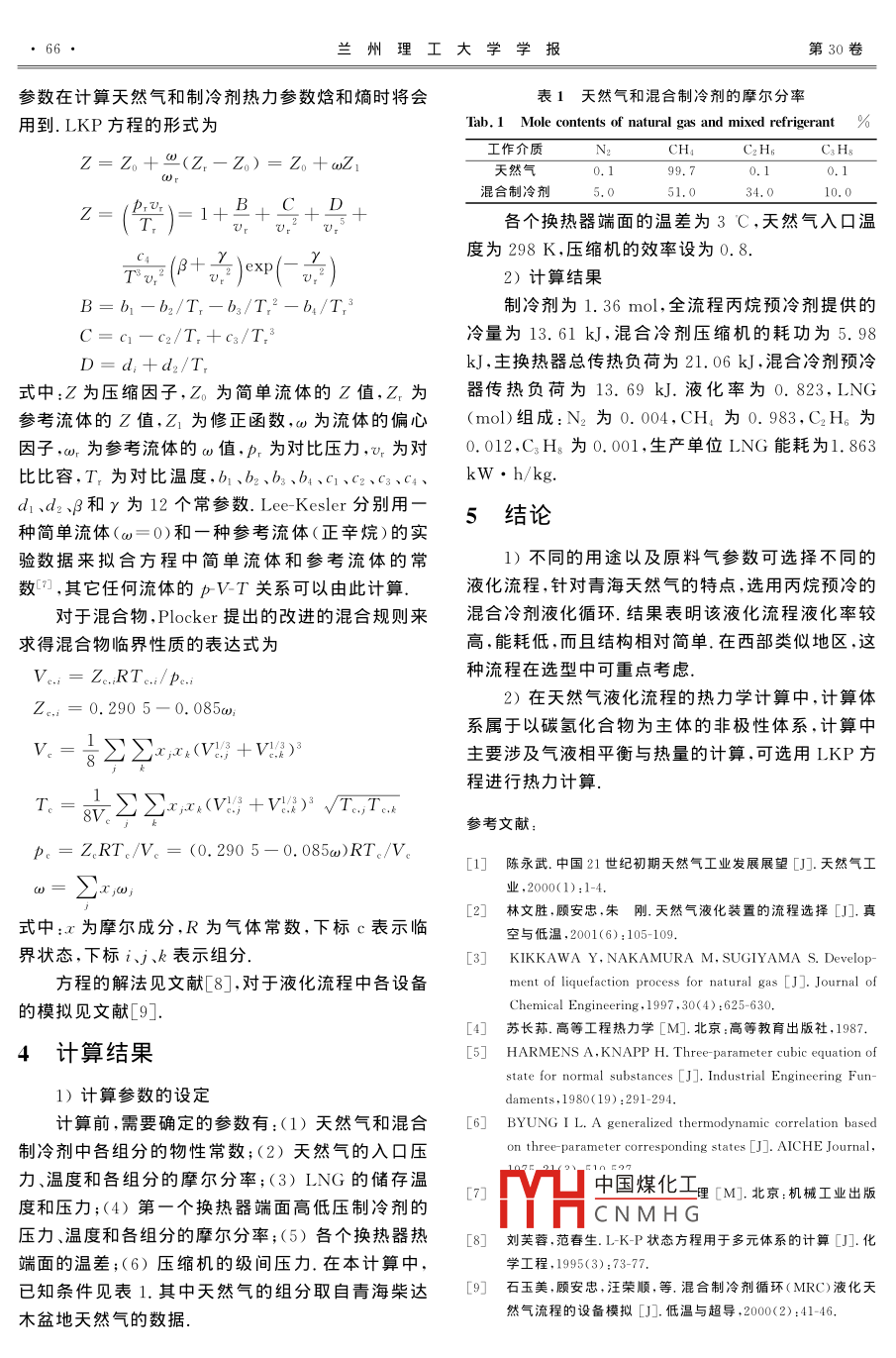 第30卷第6期蘭州理工大學(xué)學(xué)報(bào)Vol 30 No 62004年12月Journal of Lanzhou University of TechnologyDec.2004文章編號(hào):1000-5889(2004)06-0064-03天然氣液化技術(shù)的研究安彭軍1,陳叔平,劉振全1,王峰1.蘭州理工大學(xué)石油化工學(xué)院,甘肅蘭州730050;2.新疆化工集團(tuán)石油化工機(jī)械有限責(zé)任公司,新疆烏魯木齊830002)摘要:針對(duì)青海天然氣甲烷質(zhì)量分?jǐn)?shù)高的特點(diǎn),選用帶丙烷預(yù)冷的混合制冷劑循環(huán),并基于LKP狀態(tài)方程,在對(duì)各單元設(shè)備進(jìn)行分析計(jì)算的基礎(chǔ)上,對(duì)天然氣液化全流程進(jìn)行了熱力計(jì)箅.結(jié)果表明:液化率達(dá)0.823,單位LNG能耗為1.863kW·h/kg.該流程在西部天然氣液化中可優(yōu)先考慮關(guān)鍵詞:液化天然氣(ⅠNG);液化流程;混合制冷劑;熱力學(xué)計(jì)算中圖分類號(hào):TE646文獻(xiàn)標(biāo)識(shí)碼:AStudy of liquefying technique of natural gasAN Peng-jun, CHEN Shu-ping, LiU Zhen-quan, WANG Feng(1. College of Petrochemical Technology, Lanzhou Univ. of Tech, Lanzhou 730050, China: 2. Petroleum &. Chemical Machinery Co.Ltd, Xinjiang Chemical Group, Urumchi 830002, China)Abstract: According to the characteristics of Qinghai natural gas, the mixed-refrigerant cycle with pro-pane precooling is applied for gas liquefaction. And, based on LKP equation, the thermodynamic calculationof the whole cycle was carried out through analyzing every plant,s unit The result shows that liquefactionrate is 0. 823, energy consumption of LNG is 1. 863kw. h/kg. The priority of using this process may begiven to the liquefaction of natural gas in west China.Key words: liquefied natural gas(LNG); liquefied process; mixed refrigerant; thermodynamic calculation天然氣與煤炭、石油一起并稱為世界能源的三不利組分(酸性組分、水分、重?zé)N組分等),之后再進(jìn)大支柱η.天然氣經(jīng)過低溫液化,其體積將縮小到原入制冷系統(tǒng)的高效換熱器不斷降溫,并將丁烷、丙體積的1/625,十分有利于運(yùn)輸和儲(chǔ)存.我國西部有烷、乙烷等逐級(jí)冷凝分離,最后在常壓下使溫度降低豐富的天然氣資源,但起步較晚,LNG工業(yè)長(zhǎng)期以到一162C左右,即可得到LNG產(chǎn)品來幾乎為空白,缺乏對(duì)LNG工業(yè)鏈的基礎(chǔ)性研究,天然氣旳液化工藝流程根據(jù)所采用的制冷循環(huán)又缺少對(duì)國外LNG工業(yè)的系統(tǒng)了解,這些都不能可以分為3種:階式制冷循環(huán)混合制冷劑循環(huán)和膨與西部天然氣大規(guī)模開發(fā)利用相適應(yīng).因此從熱力脹機(jī)制冷循環(huán)」學(xué)、傳熱學(xué)和流體力學(xué)角度對(duì)西部天然氣的低溫液1.1階式制冷循環(huán)化流程進(jìn)行研究,對(duì)于開發(fā)立足于國內(nèi)技術(shù)的西部階式制冷循環(huán)是用丙烷(或丙烯)、乙烷(或乙LNG工廠和LNG終端接收站,具有重要的應(yīng)用價(jià)烯)、甲烷等純烴冷劑(蒸發(fā)溫度分別為-38℃值和遠(yuǎn)大的前景85℃、-160℃)進(jìn)行的三級(jí)冷凍,使天然氣在多1天然氣的液化及流程個(gè)溫度等級(jí)的制冷階中分別與相應(yīng)的制冷劑換熱,從中國煤化工該循環(huán)工藝熱效率高,天然氣的液化一般包括天然氣凈化(也稱預(yù)處操作CNMHG、設(shè)備投資及維修費(fèi)用理)過程和天然氣液化過程兩部分,其核心是制冷循高環(huán).首先將原料天然氣經(jīng)過預(yù)處理,脫除液化過程的1.2混合制冷劑循環(huán)混合制冷劑(又稱多組分制冷劑)循環(huán)是采用收稿日期:2004-03-29作者簡(jiǎn)介:安彭軍(1978-),男,甘肅天水人,碩士N2和C1~C3烴類混合物作為循環(huán)制冷劑的工藝第6期安彭軍等:天然氣液化技術(shù)的研究65混合制冷劑的制冷原理與純組分制冷劑的制冷原理3膨脹機(jī)制冷循環(huán)大致相同,即都是通過冷劑液體的汽化,并與被冷介以膨脹機(jī)制冷循環(huán)為基礎(chǔ)的天然氣液化工藝流質(zhì)進(jìn)行熱交換使其降溫.與純組分制冷劑不同的是,程是通過采用透平膨脹杋進(jìn)行等熵膨脹而達(dá)到降溫混合制冷劑產(chǎn)生的冷量是在一個(gè)連續(xù)的溫度范圍之目的的過程.根據(jù)進(jìn)入膨脹機(jī)的介質(zhì)的不同,膨脹機(jī)內(nèi),純組分冷劑產(chǎn)生的冷量是在一個(gè)固定的溫度上.制冷循環(huán)分為2種混合制冷劑制冷循環(huán)工藝流程的特點(diǎn)是在制冷循環(huán)1)天然氣膨脹機(jī)工藝是采用天然氣膨脹制冷中采用混合制冷劑,其加熱曲線可與被冷卻介質(zhì)的的循環(huán),又稱開式膨脹機(jī)循環(huán)冷卻曲線很好地匹配,有效地增加了兩者的一致性2)循環(huán)膨脹機(jī)工藝是采用氮(或氮甲烷混合可見,混合制冷劑制冷循環(huán)即保留了階式制冷循環(huán)物)膨脹制冷(閉式)的工藝流程.的優(yōu)點(diǎn),而且只用了一臺(tái)壓縮機(jī),使流程大大簡(jiǎn)化降低了造價(jià)2工藝流程混合制冷劑工藝可以分為全混合制冷劑工藝選用丙烷預(yù)冷的混合冷劑液化循環(huán)(見圖1)(FMR)和預(yù)冷十混合制冷劑工藝.目前有多家公司原料天然氣經(jīng)由燃?xì)庖鎺?dòng)的壓縮機(jī)兩級(jí)壓縮,開發(fā)出了各具特色丙烷預(yù)冷的混合制冷劑循環(huán)工藝經(jīng)冷卻后,通過MEA單元除去酸性組分(CO2、硫(APCⅠ公司的C3/ MCRTM工藝、 TECHNIP公司組分等),然后進(jìn)入分子篩干燥系統(tǒng)進(jìn)行深度脫水的 Tealarc工藝、 JF Prichard8Co.的 PRICO工藝、(水