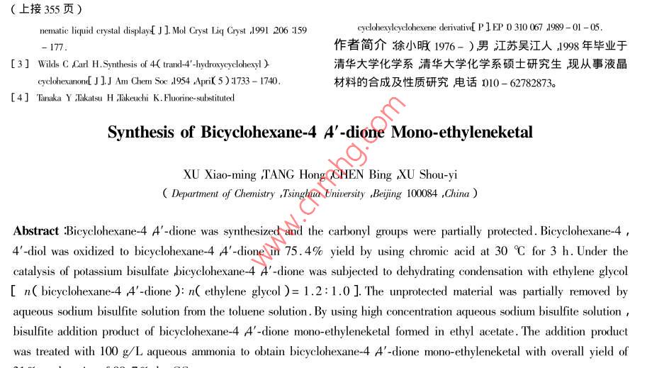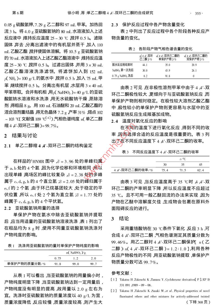 第18卷第6期精細(xì)化工Vol 18. No 62001年6月FINE CHEMICALSJune 200 I單乙二醇縮4A′雙環(huán)己二酮的合成研究徐小明唐洪陳兵徐壽頤(清華大學(xué)化學(xué)系北京100084)摘要對(duì)4A′雙環(huán)己二酮的合成以及單保護(hù)反應(yīng)進(jìn)行了研究在30℃下用重鉻酸作為氧化劑,反應(yīng)3h將44-雙環(huán)己二醇氧化為44′-雙環(huán)己二酮產(chǎn)率為75.4%。在硫酸氫鉀催化下用n乙二醇)κ4A雙環(huán)己二酮)=1.2:1.0進(jìn)行脫水縮合反應(yīng)在甲苯溶液中除去部分未保護(hù)的原料在乙酸乙酯溶液中用亞硫酸氫鈉提取單保護(hù)產(chǎn)物用NH3)=100g/L的氨水脫去亞硫酸氫鈉單乙二醇縮4A雙環(huán)己二酮的產(chǎn)率31%氣相色譜測定其質(zhì)量分?jǐn)?shù)為99.7%。關(guān)鍵詞斗μ雙環(huán)己二酮單保護(hù)憚乙二醇縮4A′-雙環(huán)己二酮中圖分類號(hào)Q24.4文獻(xiàn)標(biāo)識(shí)碼文章編號(hào):003-52142001)6-0354-03單乙二醇縮4A-雙環(huán)己二酮作為制備各種液NaHSO3晶材料和有機(jī)合成的重要中間體受到越來越廣泛的關(guān)注。由于只保護(hù)了一個(gè)羰基故此結(jié)構(gòu)具有向0兩邊延伸出不同結(jié)構(gòu)和官能團(tuán)的功能1。尤其是由原料44′-雙環(huán)己二醇有多種順反異構(gòu)體由于于羰基的活性各種未端基團(tuán)的變換和反應(yīng)很容易氧化產(chǎn)物是酮故沒有異構(gòu)體。羰基保護(hù)反應(yīng)時(shí)生實(shí)現(xiàn)。此外由于其雙環(huán)己烷的結(jié)構(gòu)合成的液晶鳯成一個(gè)羰基被保護(hù)和兩個(gè)羰基都被保護(hù)的產(chǎn)物。此有高清亮點(diǎn)、低黏度的特性在化學(xué)穩(wěn)定性、抗紫外外還有部分未反應(yīng)的原料。在非極性溶劑中用較線、熱穩(wěn)定性等方面優(yōu)點(diǎn)也較顯蓍2桸濃度的亞硫酸氫鈉溶液除去部分極性較大的44′雙環(huán)己二酮葹后在極性溶劑中用濃亞硫酸氫鈉作者通過對(duì)原料4A′-雙環(huán)己二醇的氧化和4,溶液與極性較小的單保護(hù)產(chǎn)物反應(yīng)生成鹽沉淀出4′雙環(huán)己二酮的單保護(hù)反應(yīng)的研究得到了單乙二醇縮44′-雙環(huán)己二酮找到了較理想的反應(yīng)條件。來在堿性條件下脫保護(hù)可生成一端保護(hù)的酮在極性溶劑中用稀的亞硫酸氬鈉溶液洗去殘留的4,1實(shí)驗(yàn)4′雙環(huán)己二酮,可得到純度較高的單乙二醇縮4A1.1主要原料和測試儀器雙環(huán)己二酮。4μ-雙環(huán)己二醇,重鉻酸鈉,乙酸,甲苯,乙二1.3步驟醇硫酸氫鉀亞硫酸氬鈉,氨水濃硫酸乙酸乙酯在2L三口瓶中加入103.5g4A′雙環(huán)己二醇等均為分析純。和414m甲苯。將143g二水合重鉻酸鈉、190g濃硫酸、57μL醋酸溶解于543mL水配成溶液并緩慢TA-2010DSC分析儀,DMX-300MMR譜儀,地滴加至三囗瓶中維持反應(yīng)溫度為30℃左右反HP-5890氣相色譜儀1.2反應(yīng)原理應(yīng)時(shí)間3h。反應(yīng)完畢后分離甲苯層水層用3反應(yīng)方程式如下所示150mL甲苯萃取。合并有機(jī)層分別用NaCO3)50g/L的水溶液、水洗滌用無水硫酸鈉干燥減OH Na2 Cr2O,H2>0壓蒸除甲苯得粗品用300m四氯化碳重結(jié)晶3],O一CH2CH2-OH得到44′-雙環(huán)己二酮固體76.5g產(chǎn)率為75.4%o=0+熔點(diǎn)115~116(文獻(xiàn)值117~118%41),氣相色譜純度v(4A-雙環(huán)己二酮)=99.46%。在500m三口瓶中加入18.9g44-雙環(huán)己二酮、第6期徐小明等憚乙二醇縮4A′-雙環(huán)己二酮的合成研究3550.05g硫酸氫鉀、7.2g乙二醇和97m甲苯。加熱回2.3保護(hù)反應(yīng)過程中各產(chǎn)物含量變化流3h將40g亞硫酸氫鈉的8m水溶液加入上述表2中列出了反應(yīng)過程中各個(gè)階段各種反應(yīng)產(chǎn)反應(yīng)液中維持反應(yīng)溫度25~30℃攪拌0.5h濾除物含量的變化。固體棄去分離出濾液中的有機(jī)層并蒸干加入110mL乙酸乙酯攪拌使固體溶解。將10.5g亞硫酸氫鈉表2各階段產(chǎn)物氣相色譜含量的變化的丌0mL水溶液加入上述乙酸乙酯溶液中維持反應(yīng)溫a(4A-雙環(huán)(44雙環(huán)己二酮的n(44-雙環(huán)己二酮的己二酮y%單保護(hù)產(chǎn)物y%保護(hù)產(chǎn)物y度25~30℃攪拌0.5h過濾出固體并用3×30mL脫水反應(yīng)剛結(jié)束時(shí)4乙酸乙酯溶液洗滌濾餅。將濾餅加入到152mL,N第一次洗后劉ANH3)=100g/L的氨水中攪拌0.5h加入75m甲075gMH為洗后苯繼續(xù)攪拌0.5h。分離出有機(jī)層水層用3×40mL由表2可見在非極性溶劑甲苯中由于44-雙甲苯萃取。合并有機(jī)相用NHBO)=40g1L的亞硫環(huán)己二酮極性較大更傾向于與亞硫酸氫鈉反應(yīng)而酸氫鈉水溶液和水洗滌用無水硫酸鈉干燥蒸除溶單保護(hù)產(chǎn)物則相對(duì)穩(wěn)定。在極性較大溶劑乙酸乙酯劑得粗品8g用0n油醚和20mdZ酸乙酯的中極性較小的單保護(hù)產(chǎn)物則更容易與水層中的亞混合洛劑重結(jié)晶得無色晶體2g產(chǎn)率31%烙點(diǎn)1D硫酸氫鈉反應(yīng)生成羰基加成物。1B8文獻(xiàn)值104)氣相色譜純度單乙二醇2.4溫度對(duì)氧化反應(yīng)的影響縮44雙環(huán)己二酮)=99.7%在不同的溫度下進(jìn)行氧化反應(yīng)得到不同的收2結(jié)果與討論率因而選擇合適的反應(yīng)溫度是很重要的。表3列出了在不同反應(yīng)溫度下4A雙環(huán)己二酮的收率。2.1單乙二醇縮4A′-雙環(huán)己二酮的結(jié)構(gòu)鑒定表3不同反應(yīng)溫度下44-雙環(huán)己二酮的收率在樣品的 IHNMR圖中,δ=3.96處的單峰歸屬t/