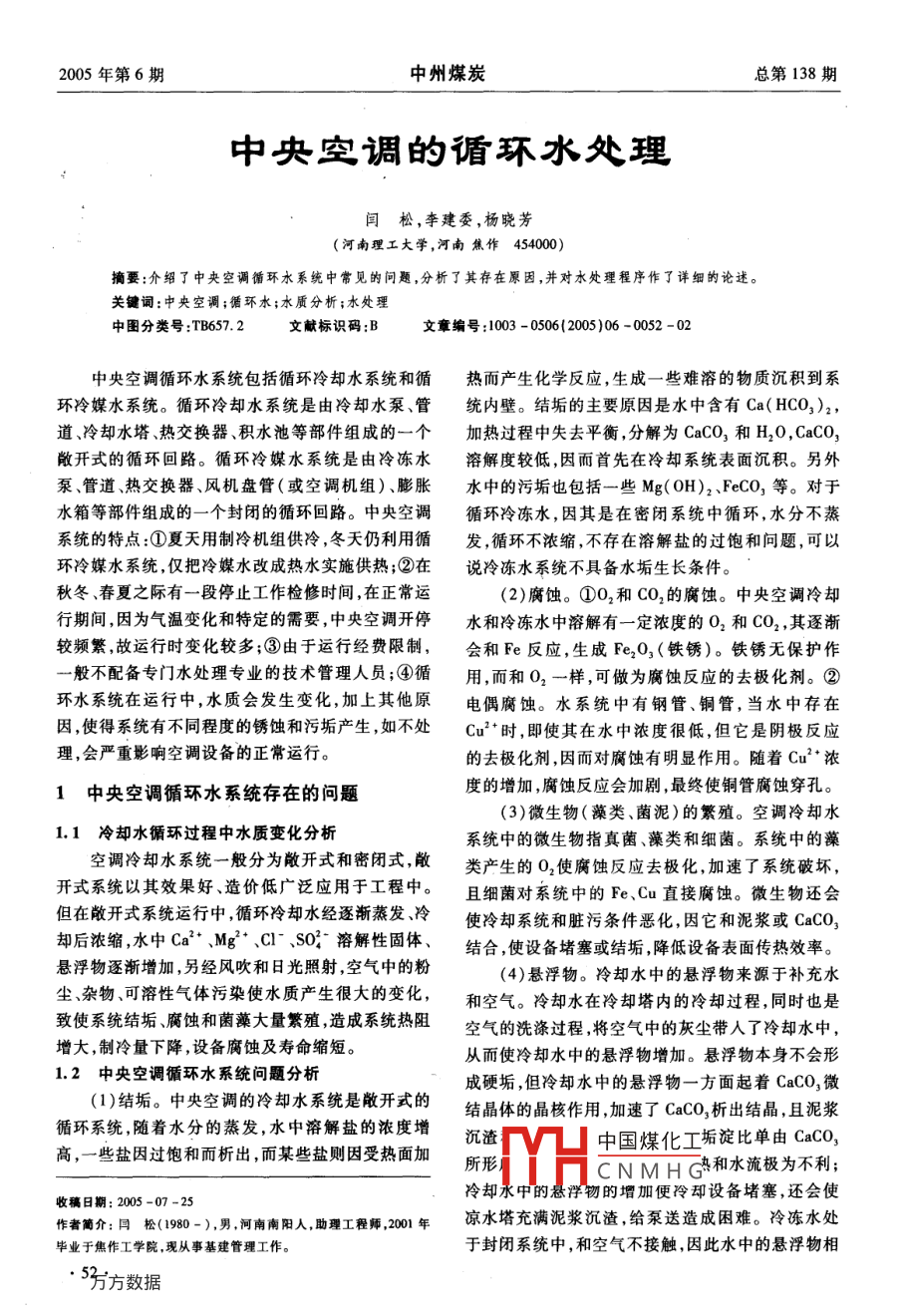 2005年第6期中州煤炭總第138期中央變調(diào)的循環(huán)水處理閆松,李建委,楊曉芳(河南理工大學(xué),河南焦作454000)摘要:介紹了中央空調(diào)循環(huán)水系統(tǒng)中常見的問題,分析了其存在原因,并對水處理程序作了詳細(xì)的論述。關(guān)鍵詞:中央空調(diào);循環(huán)水;水質(zhì)分析;水處理中圖分類號:TB657.2文獻(xiàn)標(biāo)識碼:B文章編號:1003-0506(2005)06-0052-02中央空調(diào)循環(huán)水系統(tǒng)包括循環(huán)冷卻水系統(tǒng)和循熱而產(chǎn)生化學(xué)反應(yīng),生成一些難溶的物質(zhì)沉積到系環(huán)冷媒水系統(tǒng)。循環(huán)冷卻水系統(tǒng)是由冷卻水泵、管統(tǒng)內(nèi)壁。結(jié)垢的主要原因是水中含有Ca(HCO3)2,道、冷卻水塔、熱交換器、積水池等部件組成的一個(gè)加熱過程中失去平衡,分解為CaCO3和H2O,CaCO3敞開式的循環(huán)回路。循環(huán)冷媒水系統(tǒng)是由冷凍水溶解度較低,因而首先在冷卻系統(tǒng)表面沉積。另外泵、管道、熱交換器、風(fēng)機(jī)盤管(或空調(diào)機(jī)組)、膨脹水中的污垢也包括一些Mg(OH)2、FeCO3等。對于水箱等部件組成的一個(gè)封閉的循環(huán)回路。中央空調(diào)循環(huán)冷凍水,因其是在密閉系統(tǒng)中循環(huán),水分不蒸系統(tǒng)的特點(diǎn):①夏天用制冷機(jī)組供冷,冬天仍利用循發(fā),循環(huán)不濃縮,不存在溶解鹽的過飽和問題,可以環(huán)冷媒水系統(tǒng),僅把冷媒水改成熱水實(shí)施供熱;②在說冷凍水系統(tǒng)不具備水垢生長條件。秋冬、春夏之際有一段停止工作檢修時(shí)間,在正常運(yùn)(2)腐蝕。①O2和CO2的腐蝕。中央空調(diào)冷卻行期間,因?yàn)闅鉁刈兓吞囟ǖ男枰?中央空調(diào)開停水和冷凍水中溶解有一定濃度的O2和CO2,其逐漸較頻繁故運(yùn)行時(shí)變化較多;③由于運(yùn)行經(jīng)費(fèi)限制,會(huì)和Fe反應(yīng),生成Fe2O3(鐵銹)。鐵銹無保護(hù)作一般不配備專門水處理專業(yè)的技術(shù)管理人員;④循用,而和O2一樣,可做為腐蝕反應(yīng)的去極化劑。②環(huán)水系統(tǒng)在運(yùn)行中,水質(zhì)會(huì)發(fā)生變化,加上其他原電偶腐蝕。水系統(tǒng)中有鋼管、銅管,當(dāng)水中存在因使得系統(tǒng)有不同程度的銹蝕和污垢產(chǎn)生如不處Cu2時(shí),即使其在水中濃度很低,但它是陰極反應(yīng)理,會(huì)嚴(yán)重影響空調(diào)設(shè)備的正常運(yùn)行的去極化劑,因而對腐蝕有明顯作用。隨著Cu2濃1中央空調(diào)循環(huán)水系統(tǒng)存在的問題度的增加,腐蝕反應(yīng)會(huì)加劇,最終使銅管腐蝕穿孔(3)微生物(藻類菌泥)的繁殖??照{(diào)冷卻水1.1冷卻水循環(huán)過程中水質(zhì)變化分析系統(tǒng)中的微生物指真菌、藻類和細(xì)菌。系統(tǒng)中的藻空調(diào)冷卻水系統(tǒng)一般分為敞開式和密閉式敞類產(chǎn)生的O使腐蝕反應(yīng)去極化,加速了系統(tǒng)破壞開式系統(tǒng)以其效果好、造價(jià)低廣泛應(yīng)用于工程中。且細(xì)菌對系統(tǒng)中的Pe、Cu直接腐蝕。微生物還會(huì)但在敞開式系統(tǒng)運(yùn)行中,循環(huán)冷卻水經(jīng)逐漸蒸發(fā)冷使冷卻系統(tǒng)和臟污條件惡化,因它和泥漿或CaCO3卻后濃縮,水中Ca2、Mg2、Cl-、SO4溶解性固體結(jié)合,使設(shè)備堵塞或結(jié)垢,降低設(shè)備表面?zhèn)鳠嵝省腋∥镏饾u增加,另經(jīng)風(fēng)吹和日光照射,空氣中的粉(4)懸浮物。冷卻水中的懸浮物來源于補(bǔ)充水塵、雜物、可溶性氣體污染使水質(zhì)產(chǎn)生很大的變化和空氣。冷卻水在冷卻塔內(nèi)的冷卻過程,同時(shí)也是致使系統(tǒng)結(jié)垢腐蝕和菌藻大量繁殖,造成系統(tǒng)熱阻空氣的洗滌過程,將空氣中的灰塵帶入了冷卻水中增大,制冷量下降,設(shè)備腐蝕及壽命縮短。從而使冷卻水中的懸浮物增加。懸浮物本身不會(huì)形1.2中央空調(diào)循環(huán)水系統(tǒng)問題分析成硬垢,但冷卻水中的懸浮物一方面起著CaCO3微(1)結(jié)垢。中央空調(diào)的冷卻水系統(tǒng)是敞開式的結(jié)晶體的晶核作用,加速了CaCO析出結(jié)晶,且泥漿環(huán)系統(tǒng)著水分的發(fā),水中解鹽的款沉V□凵中國煤化工垢淀比單由GCO所形CNMHG和水流極為不利收稿日期:2005-07-25冷卻永中的懸浮物的增加便冷卻設(shè)備堵塞,還會(huì)使作者簡介:松(1980-),男,河南南陽人助理工程師,201年涼京水塔充滿泥漿沉渣,給泵送造成困難。冷凍水處畢業(yè)于焦作工學(xué)院,現(xiàn)從事基建管理工作于封閉系統(tǒng)中,和空氣不接觸,因此水中的懸浮物相5分方數(shù)據(jù)2005年第6期閆松等:中央空調(diào)的循環(huán)水處理總第138期對比較少。養(yǎng)處理是必要的。定期保養(yǎng)的作用在于補(bǔ)償化學(xué)劑2中央空調(diào)的水處理的消耗和調(diào)整水質(zhì)成分的化學(xué)平衡。主要應(yīng)用3類化學(xué)藥劑:緩蝕劑、殺菌劑、阻垢劑。中央空調(diào)循環(huán)(1)清洗設(shè)備。使用高效的分散劑、滲透劑、清冷卻水的保養(yǎng)周期一般為30d。中央空調(diào)冷凍水的洗劑等,徹底清除系統(tǒng)內(nèi)的淤泥懸浮物銹和垢等,處理程序基本上和冷卻水處理程序一樣。直至金屬表面光潔。例如某中央空調(diào)制冷設(shè)備選用的是蒸汽雙效溴化鋰機(jī)組,在機(jī)組冷卻水與系統(tǒng)管3結(jié)語道相連的進(jìn)、出口處加