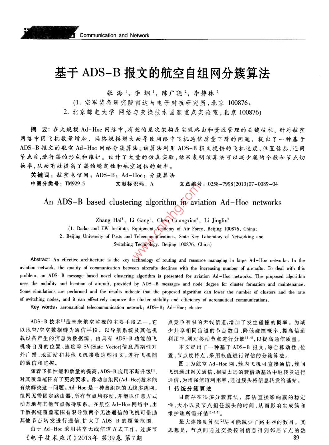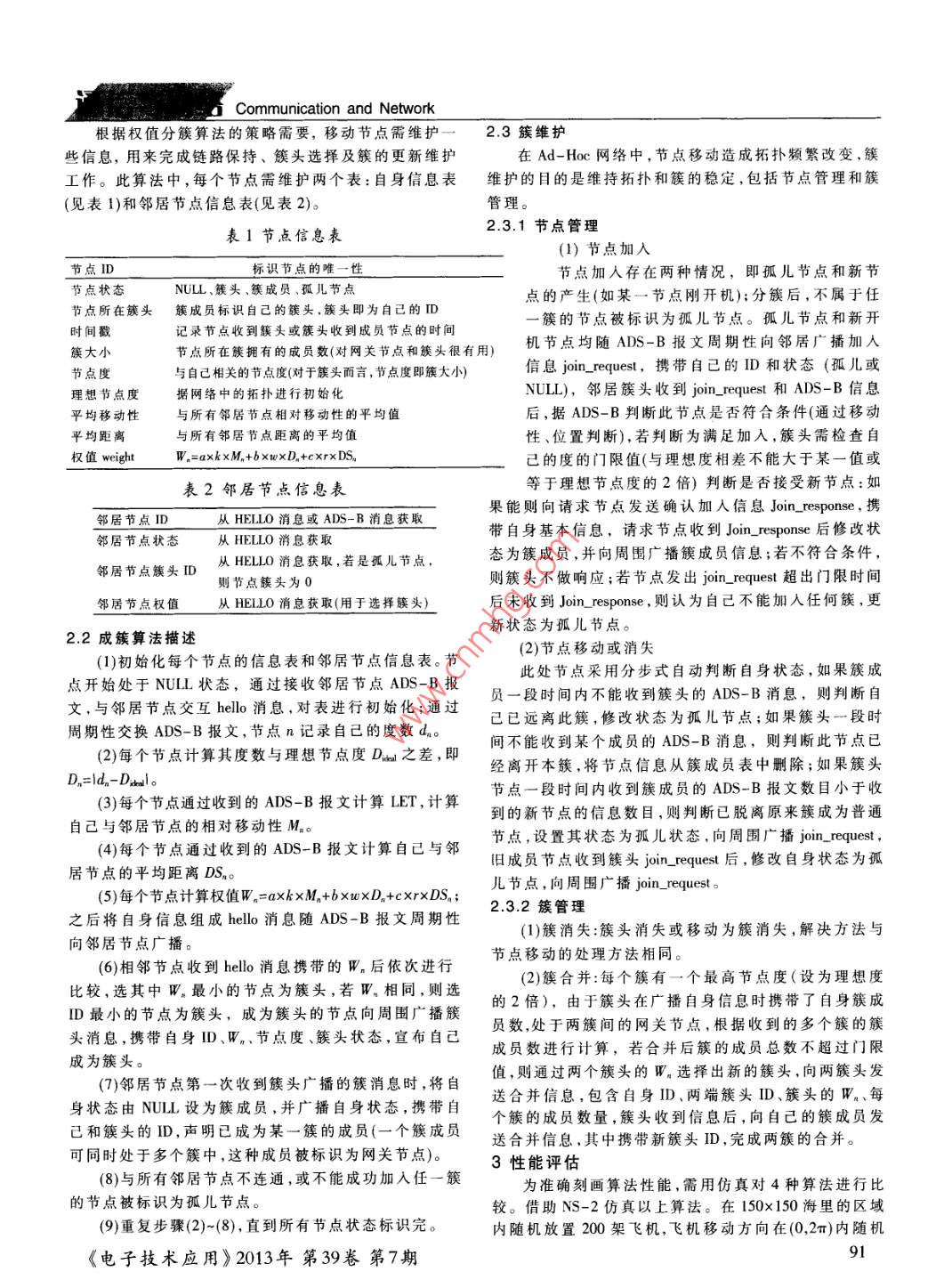 a Communication and Network基于ADS-B報文的航空自組網(wǎng)分簇算法張海',李綱,陳廣曉2,李靜林2(1.空軍裝備研究院雷達與電子對抗研究所,北京100876;2.北京郵電大學網(wǎng)絡與交換技術國家重點實驗室,北京100876)摘要∶在大規(guī)模Ad-loc網(wǎng)絡中,有效的層次架構(gòu)是實現(xiàn)路由和資源管理的關鍵技術。針對航空網(wǎng)絡中因飛機數(shù)量增加、網(wǎng)絡規(guī)模増大而導致網(wǎng)絡中飛機通信質(zhì)量下降的問題,提出了一種基于ADS-B報文的航空Ad-Hoc網(wǎng)絡分簇算法。該算法利用ADS-B報文提供的飛機速度、位置信息、連同節(jié)點度,進行簇的形成和維護。設計了大量的仿真實驗,結(jié)果表明該算法可以減少簇的個數(shù)和節(jié)點切換率,從而有效提高了簇的穩(wěn)定性和航空通信的效率。關鍵詞:航空電信網(wǎng);ADS-B;Ad-Hoc;分簇算法中圖分類號:TM929.5文獻標識碼:A文章編號:0258-7998(2013)07-0089-04An ADS-B based clustering algorithm in aviation Ad-Hoc networksLi jinglin(1. Radar and EW Institute, Equipment Academy of Air Force, Beijing 100876,China2. Beijing University of Posts and Telecommunications, State Key Laboratory of Networking andSwitching Technology, Beijing 100876, ChinaAbstract: An effective architecture is the key technology of routing and resource managing in large Ad-Hoc networks. In theaviation network, the quality of communication between aircrafts declines with the increasing number of aircrafts.Todeal with thisproblem, an ADS-B message based novel clustering algorithm is presented for aviation Ad-Hoc networks. The piuses the mobility and location of aircraft, provided by ADS-B messages and node degree for cluster formation and maintenanceSome simulations are performed and the results indicate that the proposed algorithm can lower the number of clusters and the rateof switching nodes, and it can effectively improve the cluster stability and efficiency of aeronautical communicationsKey words: aeronautical telecommunication network: ADS-B: Ad-Hoc: clusterADS-B技術是未來航空監(jiān)視的主要手段之一,它點競爭有限的無線信道,增加了發(fā)生碰撞的概率。為減以地空/空空數(shù)據(jù)鏈為通信手段,以導航系統(tǒng)及其他機少共享相冋信道的節(jié)點數(shù)目、降低碰撞概率、提高信道載設備產(chǎn)生的信息為數(shù)據(jù)源,由具有ADS-B功能的飛利用率須對移動節(jié)點進行分簇14,以提高通信質(zhì)量。機將自身的位置、速度等SV( State Vector)信息周期性對本文提出了一種基于ADS-B報文,綜合移動性、位外廣播,地面站和其他飛機接收這些報文,進行飛機間置、節(jié)點度特點,采用權值進行評估的分簇算法的通信和監(jiān)控。圖1為航空Ad-Hoc網(wǎng),簇內(nèi)飛機可直接通信,簇間隨著飛機性能和數(shù)量的提高,ADS-B應用不斷升級,飛機通過網(wǎng)關通信,相隔太遠的簇對其覆蓋范圍有了更高要求。移動自組網(wǎng)(Ad-Hoc)技術能通信,為增強信道利用率,通過簇頭將信息轉(zhuǎn)發(fā)給基站有效解決這一問題。Ad-Hoc是一種自組織的無線多跳網(wǎng),1傳統(tǒng)分簇算法組網(wǎng)無需固定路由器,所有節(jié)點均移動,并能以任意方式目前存在很多分簇算法,算法直接影響簇的穩(wěn)定動態(tài)地與其他節(jié)點保持聯(lián)系。在航空Ad-Hoc網(wǎng)絡中,由性、大小以及節(jié)點擔任簇頭的時間,從而影響生成簇和于數(shù)據(jù)鏈覆蓋范圍有限導致兩個無法通信的飛機可借助維護簇所需開銷12-51。其他節(jié)點轉(zhuǎn)發(fā)進行通信,擴大了ADS-B的覆蓋范圍最大連接度算法1盡可能減少了路由器的數(shù)目。其由于Ad-Hoc采用共享無線信道方式工作,過多節(jié)思想是,節(jié)點間通過交換控制信息得到鄰居節(jié)點的數(shù)《電子技術應用》2013年第39卷第7期通信與網(wǎng)絡Communication and NetworkO簇成員關系。此時,已在一個簇中的節(jié)點可能離開所在的簇加簇頭入別的簇,而簇頭可能進入別的簇頭的范圍或被毀,簇⊙網(wǎng)關節(jié)點維護是對初始簇形成后上述事件的補救。下面將描述所提出的成簇算法,包括成簇采用的度1簇范圍量、成簇算法和簇維護。2.1簇的度量權值 weight的定義分簇算法要求簇能很好地適應網(wǎng)絡拓撲的動態(tài)變化,在航空網(wǎng)絡中,由于飛機高速移動,移動方向不定08地選擇族頭防止選擇邊緣節(jié)點作為族頭造成的不穩(wěn)飛機的移動性對簇的穩(wěn)定性有很大影響。同時位置信息反映鄰居節(jié)點間的距離,通過位置信息和節(jié)點度能很好定。因此,本文提出一種基于多種因素的權值計算方法,權值為weight=axk x mobility +6 xwxdegree+cxrxdistance (1)圖1航空Ad-Hoc網(wǎng)其中,a,b,c是權值因子,a+b+c=1,據(jù)不同應用場景,設目,該節(jié)點和其鄰居節(jié)點中具有最大度的被選為簇頭,置3個因子的值;k,,r是常數(shù)因子,需保證3個影響因度數(shù)相同時,選D最小的作為簇頭,簇頭的一跳鄰居節(jié)素最后計算時在同一量級上,提高wit精度點為該簇普通成員。其優(yōu)點是簇數(shù)目較少,減少分組投mobility為飛機相對移動性度量,節(jié)點從ADs-B報遞時延,但信道空間重用率較低。文中提取速度和位置信息,采用LET計算兩節(jié)點的相最低移動性算法2-3盡量保持了簇結(jié)構(gòu)的穩(wěn)定性,其對移動性思想是節(jié)點的移動性越高,其權重越低,選最高權重的LET=-(ab+cd)+va+e2)r-(ad-bc 2(2)節(jié)點作為簇頭。該算法需要一種機制來量化節(jié)點的