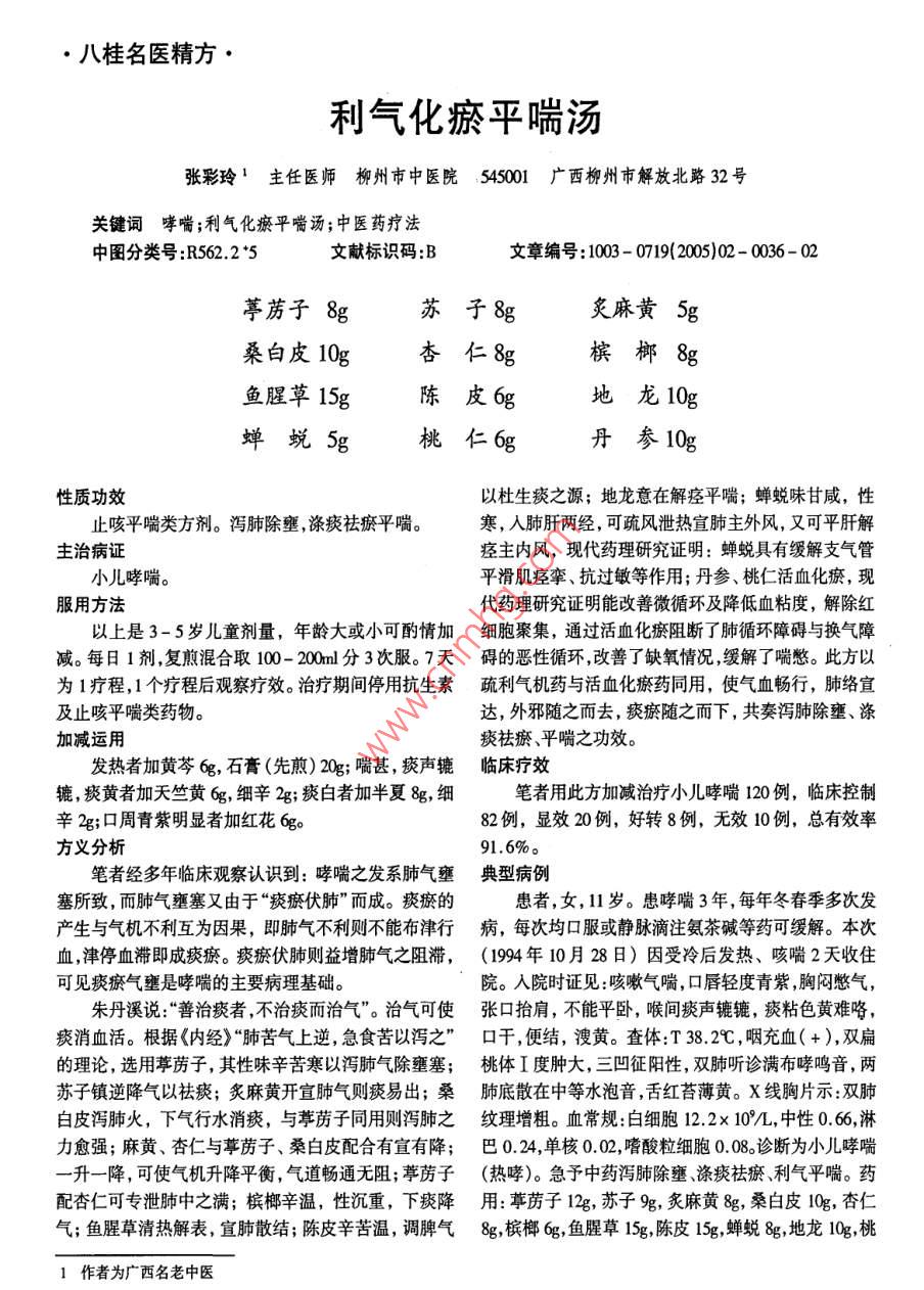 ●八桂名醫(yī)精方●利氣化瘀平喘湯張彩玲'主任醫(yī)師柳州市中醫(yī)院 545001 廣 西柳州市解放北路32號(hào)關(guān)鍵詞哮喘;利氣化瘀平喘湯;中醫(yī) 藥療法中圖分類號(hào):R562.2*5文獻(xiàn)標(biāo)識(shí)碼:B文章編號(hào):1003- 0719(2005)02- 0036 - 02葶藶子8g蘇子8g炙麻黃5g桑白皮10g杏仁8g檳榔8g魚(yú)腥草15g陳皮6g地龍10g蟬蛻5g桃仁6g丹參10g性質(zhì)功效以杜生痰之源;地龍意在解痙平喘;蟬蛻味甘咸,性止咳平喘類方劑。瀉肺除壅,滌痰祛瘀平喘。寒,人肺肝兩經(jīng),可疏風(fēng)泄熱宣肺主外風(fēng),又可平肝解主治病證痙主內(nèi)風(fēng),現(xiàn)代藥理研究證明:蟬蛻具有緩解支氣管小兒哮喘。平滑肌痙攣、抗過(guò)敏等作用;丹參、桃仁活血化瘀,現(xiàn)服用方法代藥理研究證明能改善微循環(huán)及降低血粘度,解除紅以上是3- 5歲兒童劑量,年齡大或小可酌情加細(xì)胞聚集,通過(guò)活血化瘀阻斷了肺循環(huán)障礙與換氣障減。每日1劑,復(fù)煎混合取100- 200ml分3次服。7天礙的惡性循環(huán),改善了缺氧情況,緩解了喘憋。此方以為1療程,1個(gè)療程后觀察療效。治療期間停用抗生素疏利氣機(jī)藥與活血化瘀藥同用,使氣血暢行,肺絡(luò)宣及止咳平喘類藥物。達(dá),外邪隨之而去,痰瘀隨之而下,共奏瀉肺除壅、滌加減運(yùn)用痰祛瘀、平喘之功效。發(fā)熱者加黃芩6g,石膏(先煎) 20g;喘甚,痰聲轆臨床療效轆,痰黃者加天竺黃6g,細(xì)辛2g;痰白者加半夏8g,細(xì)筆者用此方加減治療小兒哮喘120例,臨床控制辛2g;口周青紫明顯者加紅花6g。82例,顯效20例,好轉(zhuǎn)8例,無(wú)效10例,總有效率方義分析91.6%。筆者經(jīng)多年臨床觀察認(rèn)識(shí)到:哮喘之發(fā)系肺氣壅典型病例塞所致,而肺氣壅塞又由于“痰瘀伏肺"而成。痰瘀的患者,女,11歲。患哮喘3年,每年冬春季多次發(fā)產(chǎn)生與氣機(jī)不利互為因果,即肺氣不利則不能布津行病,每次均口服或靜脈滴注氨茶堿等藥可緩解。本次血,津停血滯即成痰瘀。痰瘀伏肺則益增肺氣之阻滯,(1994年10月28日)因受冷后發(fā)熱、咳喘2天收住可見(jiàn)痰瘀氣壅是哮喘的主要病理基礎(chǔ)。院。人院時(shí)證見(jiàn):咳嗽氣喘,口唇輕度青紫,胸悶憋氣,朱丹溪說(shuō):“善治痰者,不治痰而治氣”。治氣可使張口抬肩,不能平臥,喉間痰聲轆轆,痰粘色黃難咯,痰消血活。根據(jù)《內(nèi)經(jīng)》“肺苦氣上逆,急食苦以瀉之”口干, 便結(jié),溲黃。查體:T 38.29,咽充血(+),雙扁的理論,選用葶藶子,其性味辛苦寒以瀉肺氣除壅塞;桃體I度腫大,三凹征陽(yáng)性,雙肺聽(tīng)診滿布哮鳴音,兩蘇子鎮(zhèn)逆降氣以祛痰;炙麻黃開(kāi)宣肺氣則痰易出;桑肺底散在中等水泡音,舌紅苔薄黃。X線胸片示:雙肺白皮瀉肺火,下氣行水消痰,與葶藶子同用則瀉肺之紋理增粗。血常規(guī):白細(xì)胞12.2x 10%/L,中性0.66,淋力愈強(qiáng);麻黃、杏仁與葶藶子、桑白皮配合有宣有降;巴 0.24,單核0.02,嗜酸粒細(xì)胞0.08。診斷為小兒哮喘-升一降,可使氣機(jī)升降平衡,氣道暢通無(wú)阻;葶藶子(熱哮)。急予中藥瀉肺除壅、滌痰祛瘀、利氣平喘。藥配杏仁可專泄肺中之滿;檳榔辛溫,性沉重,下痰降用:葶藶子12g,蘇子9g,炙麻黃8g,桑白皮10g,杏仁氣;魚(yú)腥草清熱解表,宣肺散結(jié);陳皮辛苦溫,調(diào)牌氣8g, 檳榔6g,魚(yú)腥草15g,陳皮l5g,蟬蛻8g,地龍l0g,桃1作者為廣西名老中醫(yī)健胃口服液李桂賢'主任醫(yī)師 廣西中醫(yī)學(xué)院第一附屬醫(yī)院 530023 南寧市園湖路 2號(hào)關(guān)鍵詞健胃口服液;李桂賢;方 劑中圖分類號(hào):R57文獻(xiàn)標(biāo)識(shí)碼:B文章編號(hào): 1003- 0719(2005)02 -全瓜蔞15g白芍15g蒲公英l5g制半夏10g郁金10g柴胡10g黃連6g甘草6g性質(zhì)功效臨床實(shí)驗(yàn)曾以麗珠鉍三聯(lián)(麗珠得樂(lè)膠囊、阿莫清熱燥濕、理氣和胃劑。清熱燥濕,祛痰消痞,理西林膠囊 、甲硝唑片)為對(duì)照組,觀察健胃口服液治療氣和胃,柔肝止痛。HP相關(guān)性慢性胃炎的臨床療效,結(jié)果發(fā)現(xiàn)健胃口服液主治病證組治療胃炎總有效率達(dá)88.3%, HP根除率達(dá)86.7%;食管炎,胃炎,胃潰瘍,結(jié)腸炎等。癥見(jiàn)胃脘疼痛,而 西藥對(duì)照組治療胃炎總有效率為85.0%,HP 根除或脘痞不舒,噯氣,泛酸,胸痛,腹脹,嘈雜,惡心嘔吐,率 90.0% ,兩組療效無(wú)顯著性差異。但健胃口服液組口于口苦等癥,舌質(zhì)紅,脈滑,或滑數(shù)。具有費(fèi)用低,副作用少等優(yōu)點(diǎn)。服用方法典型病例健胃口服液由本院制劑室生產(chǎn),每毫升藥液含生患者,男,46歲,2002年5月17 日初診。因“胃脘藥1g,每次口服20ml,每天3次,1個(gè)月為- -療程.亦可脹痛反復(fù)六年余,癥狀加重一周”來(lái)診,癥見(jiàn)胃脘部脹作湯劑,每日1劑,水煎服;或作散劑,每次10g,每日3痛, 泛酸,噯氣,胃納不佳,消瘦,口于口苦,夜寐夢(mèng)多,次;1個(gè)月為一療程。溲黃,大便稍硬,舌紅,苔黃厚,脈滑數(shù)。電子胃鏡檢查加減運(yùn)用示:十二指腸球部潰瘍(A2期);慢性淺表性胃竇炎伴胃痛甚者加延胡索10g, 香附15g; 泛酸者加烏賊隆起糜爛 ;HP( + )。中醫(yī)診斷為胃痛(脾胃濕熱證)。治骨15g,瓦楞子20g;腹脹者加木香6g,佛手10g。以清熱燥濕,和胃止痛。投健胃口服液每次20mnl,每日方義分析3次。3日后復(fù)診,自訴胃痛減輕,泛酸,噯氣減輕,胃慢性胃炎、胃潰瘍及食管炎,尤其是合并幽門螺