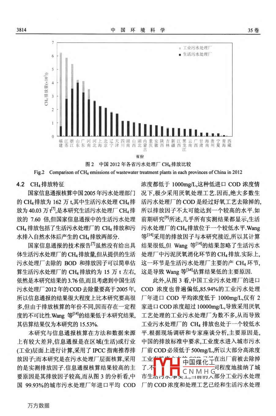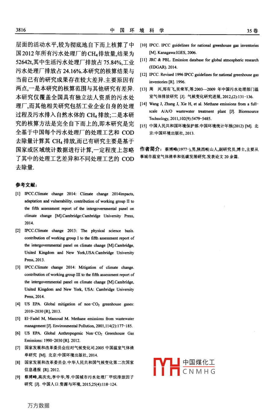 中國環(huán)境科學(xué)2015,35(12): 3810-~3816China Environmental Science中國污水處理廠甲烷排放研究蔡博峰',高慶先,李中華,吳靜3",王軍霞4(.環(huán)境保護(hù)部環(huán)境規(guī)劃院,氣候變化與環(huán)境政策研究中心,北京100012; 2.中國環(huán)境科學(xué)研究院,北京100012; 3.清 華大學(xué)環(huán)境學(xué)院,環(huán)境模擬與污染控制國家重點(diǎn)實(shí)驗(yàn)室,北京100084; 4.中國環(huán)境監(jiān)測總站,北京100012)摘要:基于實(shí)測排放因子矩陣和排放源(污水處理廠)層面的活動(dòng)水平,較為徹底地自下而上核算了中國2012年所有污水處理廠的CH排放量結(jié)果表明,中國污水處理廠總CH4排放為52642,其中生活污水處理廠排放39921,占75.84%,工業(yè)污水處理廠排放12721t占 24.16%.福建、江蘇、浙江等省的CH4排放量最高,寧夏、青海、西藏等省的排放量最低生活污水處理廠的CH4排放占主體,主要原因是全國生活污水處理廠去除的COD量遠(yuǎn)高于工業(yè)污水處理廠的去除量全國僅福建和江蘇兩省的工業(yè)污水處理廠的CH4排放量超過了生活污水處理廠的排放量相比國家信息通報(bào)2005年排放結(jié)果,本研究的結(jié)果比其低,主要是由活動(dòng)水平和排放因子的差異造成中國99.93%的城市污水處理廠年平均COD進(jìn)口濃度都低于100m/L,85.94%的工業(yè)污水處理廠年平均COD進(jìn)口濃度低于100m/L,導(dǎo)致厭氧工藝處理的COD量較少.中國污水處理廠去除掉的COD量僅是全國COD總?cè)コ康男〔糠?而大多數(shù)(64.98%)的COD是在工業(yè)企業(yè)內(nèi)部被去除掉的,而這部分廢水的COD濃度較高,故企業(yè)內(nèi)部的廢水處理應(yīng)該是污水處理部門主要的CH4排放源此外,還有相當(dāng)于全國COD產(chǎn)生量三分之一的COD排入自然環(huán)境,這-環(huán)節(jié)的排放因子研究較為缺乏關(guān)鍵詞:生活污水處理廠:工業(yè)污水處理廠; CH4排放中圖分類號: X32文獻(xiàn)標(biāo)識碼: A文章編號: 1000 6932(2015)12 -3810-06Estimation of methane emissions of wastewater treatment plants in China. CAI Bo-feng', GAO Qing xian', LIZhong-hua', WU Jing", WANG Jun- xia' (1.The Center for Climate Change and Environmental Policy, Chinese Academyfor Environmental Planning, Beijing 100012, China; 2.Chinese Research Academy of Environmental Sciences, Bejjig100012, China; 3.School of Environment, Tsinghua University, Beijing 100084, China; 4.China National EnvironmentalMonitoring Centre, Bejing 100012, China). China Environmental Science, 2015,35(12): 3810 -3816Abstract: The CH4 emissions of each (domestic and industrial) wastewater treatment plants (WTP) in China in 2012 areestimated based on our field measured emission factors and detailed informnation of each WTP. The results show that thetotal emissions are 52642 tons, 39921 tons from domestic WTP and 12721 tons from industrial WTP, accounting for75.84% and 24.16% of the total emissions respectively. Fujian, Jiangsu and Zhejiang are the top 3 emitters and Ningxia,Qinghai and Tibet are the lowest three emitters. The domestic WTP dominate the total emissions due to their high share oftotal COD treatment. The CH4emissions from industrial WTP are higher than that from domestic WTP only in Jiangsu andFujian provinces. Compared with the CH4 emissions in 2005 reported in the Second National Communication on ClimateChange of The People's Republic of China, the result of this paper was lower than that due to the discrepancies of activitydata and emission factors. It is estimated that 99.93% and 85.94% of annual entrance COD concentration of domesticWTP and industrial WTP respectively, are lower than 1000mg/L. The low annual entrance COD concentration leads tolow use of anaerobic biological treatment. The COD removed in WTP only occupies a small part of total COD removed. Alarge part of removed COD (64.98%) is disposed by enterprises themselves. This part is probably the predominant sourceof CH4 emissions of wastewater treatment sectors in China, due to its huge volume of COD with high concentration.There is large quantity of COD released into nature, which is equivalent to one third of the COD generated in China. The收稿日期: 2015-05-09中國煤化工基金項(xiàng)目:環(huán)境保護(hù)部重點(diǎn)項(xiàng)目“非二氧化碳溫室氣體核算研究”;國家自然.MYHC N M H G華大學(xué)自主科研計(jì)劃資助(20121087922);長江學(xué)者和創(chuàng)新團(tuán)隊(duì)發(fā)展計(jì)劃(IRT1152)*責(zé)任作者,副研究員, wu jing@tsinghua.edu.cn12期蔡博峰等:中國污水處理廠甲烷排放研究3811emission factors research is far from sufficient in this field.Key words: domestic wastewater treatment plant: industrial wastewater treatment plant; CHemissions甲烷(CH4)是最重要的氣候影響污染物的研究成果較多 ,所以本研究總結(jié)和對比分析中(CAPs)",也是全球第二大溫室氣體,政府間氣候國 2005年污水處理部門CH4排放研究相關(guān)成果.變化專門委員會(IPCC)第五次評估第一工作組信 息通報(bào)8中報(bào)告的中國2005年污水處理部門報(bào)告給出的CH4 100年增溫潛勢是28,其減排對的CH4排放相對權(quán)威,代表我國官方數(shù)據(jù),其核算于未來全球控制增溫和對流層臭氧有非常重要結(jié)果是 162萬t,核算范圍是IPCC的2006年國家的意義[2!廢棄物領(lǐng)域是IPCC國家清單指南中五清單指南范圍[1),相對較為全面.美國環(huán)保署0)和大領(lǐng)域之一,其排放的主要溫室氣體是CH(占其EDGAI("I的核算結(jié)果分別是 613萬t和637萬總溫室氣體排放的90%B).廢棄物處理部門(垃t,相對比較接近分別是信息通報(bào)數(shù)據(jù)的3.78