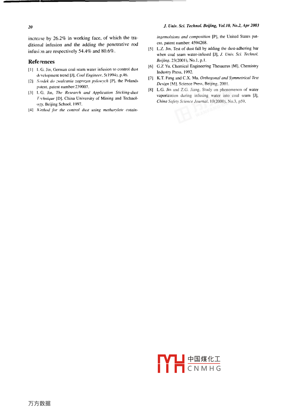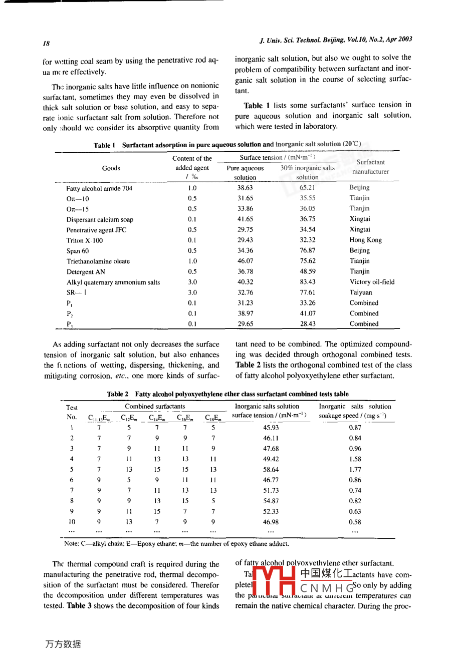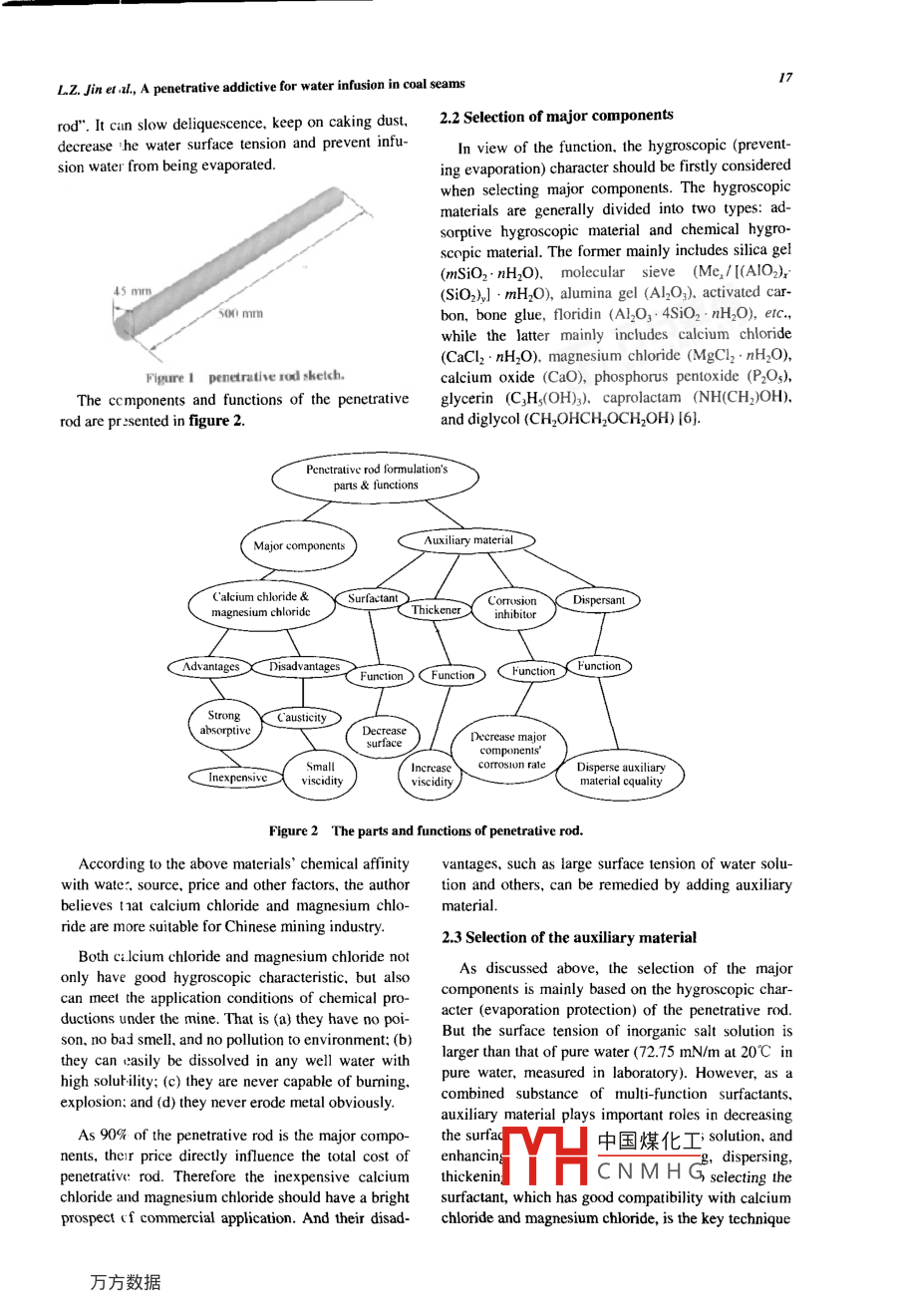 Journal of University of Science and Technology BeijingMineralVolune 10, Number 2, April 2003, Page 16A penetrative addictive for water infusion in coal seamsLonszhe Jin, Wen Ni, Qingsong Wang, and Wei WeiTD8 ACivil und Enironmental Enineering Scool, Univesity of Science and Tchnologoy Beijing. Bejing 100 China(Receved 2002-05-31)Abstract: The manufacturing process. charateristics. and application results of a rod-lie penetrative additive (the penetrative rod)were discussed. The components and functions of the penetrative rod were studied carefully. A large number of otbogonal combinedtests were crried out and over 100 sample molds were made. Utimately the components were decided after careful selection amongthese molds, mainly including hygroscopic major components and auxiliary material. The results of on-site practical applicationshow that such an addictive can increase the water penetrative ability efectively and has a remarkable effect on preventing dust pro-ducti )n during coal scam excavation. The penetrating radius, the infusing velocity and the dust-preventive effect were systeaticallystudicd.Key words: coal seam water infusion; penetrative; penetrative rod: additive1 I.troductionproduce a high efficient penetrative addictive with arod-like shape. To enable the technology to be com-The earliest study of using additive in infusion wa-mercially practical in the large-scale application. de-ter to prevent dust was made by some German re-tailed researches have been done to simplify the op-sear:hers. A test of increasing glutinosity by addingerational progress for use.matcrial, such as Retatin 819, Retatin FS62, etc.. intothe infusion water was carried out successfully in2 Composition of the penetrative rodRuh- Mine of German in 1968 [1]. The results weregood and the effects were evident. However, the2.1 Components and functionscommercial application was not achieved due to itsBesides determining reasonable infusion parame-inconvenient process of adding into the water and itsters, decreasing the water surface tension and pre-over sensitivity to the characteristics of coal seams.venting it from being evaporated are considered asSome further researches were carried out in Poland [2],two primary ways to further increase the efficiency ofGernan [川Former Soviet Union [3] and France [4].dust prevention when the technology of coal seamSome good results were also reported. In the 1990s thewater infusion is used [5].technology of dust prevention by glutinosity wasResearches and analyses have conclusively estab-quickly developed. Good results of dust preventionlished that appending hygroscopic material can pre-wer: achieved by adding glutinosity into the infusionwater during coal seam excavation in Germany, USA,vent infusion water from being evaporated, while ad-ding surfactant material can decrease the water surfaceFrance and other countries.tension. A large number of orthogonal combined testsThe studies of adding some surfaclants into the in-between more than 40 kinds of organic monomers andfusion water were carried out in some research insti-hygroscopic material were carried out. Over 100 sam-tute: of China in 1990's. Some industrial experimentsple molds were made. Ultimately the componentswer: done in Datun Mine, Yinggangling Mine,were decided after careful selection among theseZhenizhou Mine, etc. Some desirable results were re-molds, mainly including hygroscopic major compo-port:d [3].nents and functionary surfactant combined substanceEven though good experimental results of dust pre-(als中國(guó)煤化工/hich can lower thevention were achieved, many of these techniqueswat iYhCNMH(_mitigating corrosiondidn't reach a commercial level of application due tond..site application, thetheir complicated process of use and inconvenient op-additive was made into solid rod-like material aseration. To overcome these shortages, this study is toshown in figure 1, here shorly named as "penetrativeCorn:sponding author: Longzhe jin, E-ml: logheji001@ 163.com17L.z. Jin et al, A penetraive adictive for water infusion in coal seamsrod". It can slow deliquescence, keep on caking dust,2.2 Selection of major componentsdecrease !he water surface tension and prevent infu-In view of the function, the hygroscopic (prevent-sion water from being evaporated.ing evaporation) character should be firstly consideredwhen selecting major components. The hygroscopicmaterials are generally divided into two types: ad-sorptive hygroscopic material and chemical hygro-scopic material. The former mainly inctudes silica ge(mSiO2. nH2O),molecular sieve (Me,/ [(AI02)45 mm(SiO2)J1 . mH2O), alumina gel (Al2O3), activated car-500 mrbon, bone glue, floridin (Al2O3;" 4SiO2 : nH2O), etc.while the latter mainly includes calcium chloride(CaCl2 . nH2O), magnesium chloride (MgCl2 . nH2O),Figure 1 penerutive rod sketch.calcium oxide (CaO), phosphorus pentoxide (P2O3),The ccmponents and functions of the penetrativeglycerin (C;H(OH)3). caprolactam (NH(CH)OH),rod are pr :sented in fgure 2.and diglycol (CH2OHCH2OCH2OH) [6].Penetraive rod formulation'sparls & functionsAuxiliary materialMajor components('alcium chloride &SurfactantCorusionDispersantmagnesium chlorideThickenerinhibitorC AdvantagesDisadvantagesFunction ) ( FunctionFunctionFunction)StronpC austicityahsorpivabsorptivesurfaceDecrease majorcompunenis'SmallIncrease' corrosion rateDisperse auxiliaryInexpensivevisciditymaterial equalityFigure 2 The parts and functions of penetrative rod.According to the above materials' chemical affinityvantages, such as large surface tension of water solu-with wate. source, price and other factors, the authortion and others, can be remedied by adding auxiliarybelieves t1at calcium chloride and magnesium chlo-material.ride are more suitable for Chinese mining industry.2.3 Selection of the auxiliary materialBoth Ci lcium chloride and magnesium chloride notAs discussed above, the selection of the majoronly have good hygroscopic characteristic. but alsocan