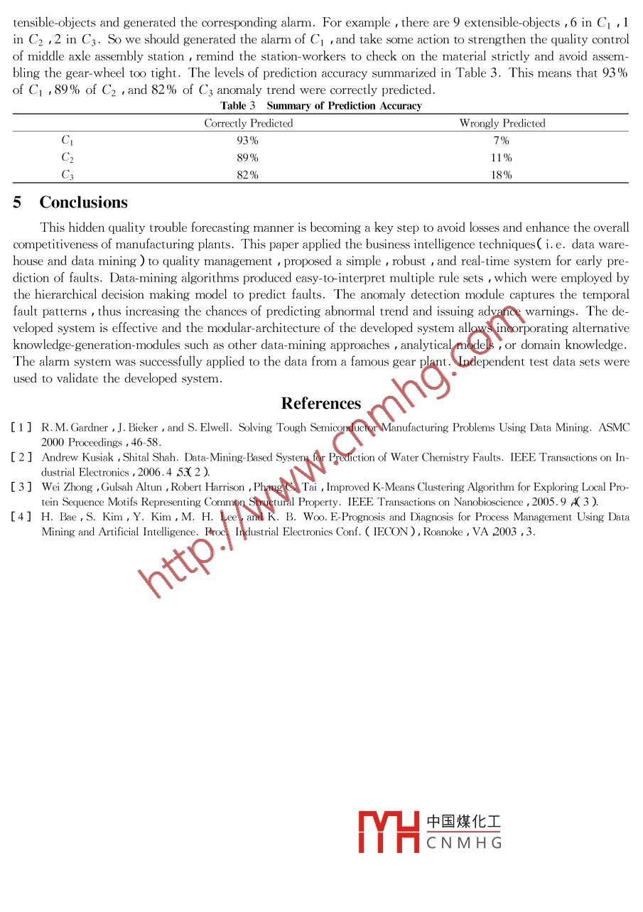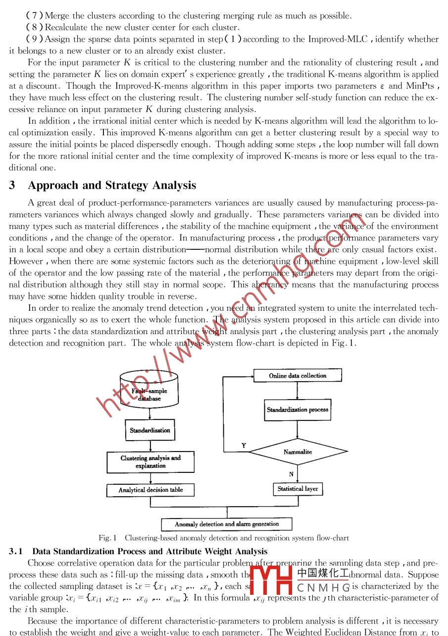 Improved K-means Algorithm for Manufacturing Process AnomalyDetection and RecognitionZHOU Xiaomin' 2 PENG Wei' SHI Haibo'( 1. Shenyang Institution of Automation Chinese Academy of Sciences , Shenyang 1 10016 China E-mail xmzhou@sia. cn ;2. Graduate School , Chinese Academy of Sciences , Beiing 100039 China )Abstract : Anomaly detection and recognition are of prime importance in process industries. Faults are usually rare ,and,therefore , predicting them is difficult. In this paper ,a new greedy initialization method for the K-means algorithm is proposed toimprove traditional K -means clustering techniques. The new initialization method tries to choose suitable initial points , which arerwell separated and hare the potential to form high- quality clusters. Bused on the clustering result of historical disqualificationproduct data in manufacturing process which generated by the Improved- K -means algorithm ,a prediction model which is used todetect and recognize the abnormal trend of the quality problems is constructed . This simple and robust alarmn-system architecture forpredicting incoming faults realizes the transition of quality problems from diagnosis afteruard to prevention be forehand indeed. Inthe end , the alarm model was applied for prediction and avoidance of gear. wheel assembly faults at a gear. plant .Key words: data mining ; clustering ; quality management ; anomaly detection and recognition1 IntroductionFor an enterprise , quality is the life of product and service so implementing the precaution principle is thecore and distillation of modern quality management. The current lag fault diagnosis method is of lttle use to thereal-time manufacturing process quality-control. When the product disqualification is detected , the loss is irre-trievable and this affects the quality and efficiency of production greatly. So how to recognize the early failuresymptom and performance falling-trend , then take a corresponding fault-elimination action beforehand throughmonitoring the process information and product characteristic information becomes more and more important.This manufacturing process excursion forecasting manner is becoming a key step to avoid losses and create a goodproduct reputation.Gearbox is an important component of vehicle drivetrain system and almost 60% gearbox-faults are causedby gear-wheel ,so it is very important to monitor the gear-wheel assembly process and detect the abnormal trendin the gearbox assembly-line. Based on a mass of gearbox performance testing data from a gear plant , this paperanalyzed the gear-wheel assembly process with clustering technology first , then explained the clustering result indomain- expert' s help and formed an anomaly. analysis decision table. To find the hidden quality problem and toprovide abundant decision- making information for the enterprise quality control , the status of each work- stationis monitored with the help of the anomaly forecasting model.2 An Improved K-means Clustering AlgorithmData Clustering is an important technique for exploratory data analysis. Clustering techniques are used forcombining observed objects into clusters which satisfy the criteria that each cluster is homogeneous and should bedifferent from other clusters. K-means is a traditional simple and effective clustering method in common use ,however , there are problems with such a technique :a ) K-means requires the number of clusters to be specifiedbeforehand , but determining the number of clusters is not easy. b ) K-means requires one centroid for each clus-ter , these centroids shoud be placed in a cunning way because of different initial centroids cause different results.c) The abnormality data may be very large , and this may affect the estimation of the data distribution , so thisalgorithm is very sensitive to the abnormality data. To overcome these defects as much as possible , this paperproposed an Improved- K-means clustering algorithm.2.1 Basic Idea of The Improved Algorithm中國煤化工We' II give you several definitions before describing the id.MYHCNMHGhm:Definition 1 :( ε -neighborhood of a point ) The ε-neighborhood ofapoint p ,denoted by N( p ) , is definedby N( p)= {q∈D|dis( p q)≤e}Definition 2 :( sparse-point ) If the number of points in a e-neighborhood of a point is less than the giventhreshold value MinPts , then this point is called sparse- point , otherwise it is called non- sparse point._ 103Definition 3 :( clustering merging rule ) The cluster center of cluster C; is O; , the cluster center of clusterC;isO{( j≠i ),the center of all the points both in C; and in C; is Ok , then cluster C; and C; satisfty the clus-tering merging ruleif 21p-O;|+ 2|p-0;2q+x2p-O%| (λ∈(0.75 1.5 )). Otherwise ,they don' t satisfy this merging rule. .Definition 4 :( cluster radius ) The maximum distance from points in a cluster to the cluster center.Definition 5 :( the subjection degree of a point to a cluster ) Suppose the center of cluster C; is O; , the clus-ter radius is R , the subjection of a random sample point to cluster C; is :Sul(X ,C)=?。-(r-R312(1)In this formula :r= |X- Ok| , the smaller the σ-value is , the steeper the GAUSS Function is , in general , theσ-value is between 0 and 0.5( σ∈(0 0.5 )).Definition 6 :( the improved maximum- likelihood-classification ) Let the two biggest subjection degree ofsample point X be Sul( X ,Ca )=a andSul( X ,C;)=b ,X belongs to cluster Ca if a and b satisfying the con-dition that a≥( 1 + μ )b otherwise, X belongs to a new cluster. The value of μ is chosen acording to thestrictness of classificatory judgement , they are in direct ratio( commonly μ∈[0 ,1 ]).( 1 ) Because the initialized cluster centroids are crucial to the clustering result of this algorithm , the resultwill be more reasonable and the convergence rate will be faster on the base of the reasonable initialized clustercentroids. So ,the better choice is to place them as much as possible far away from each other. In o