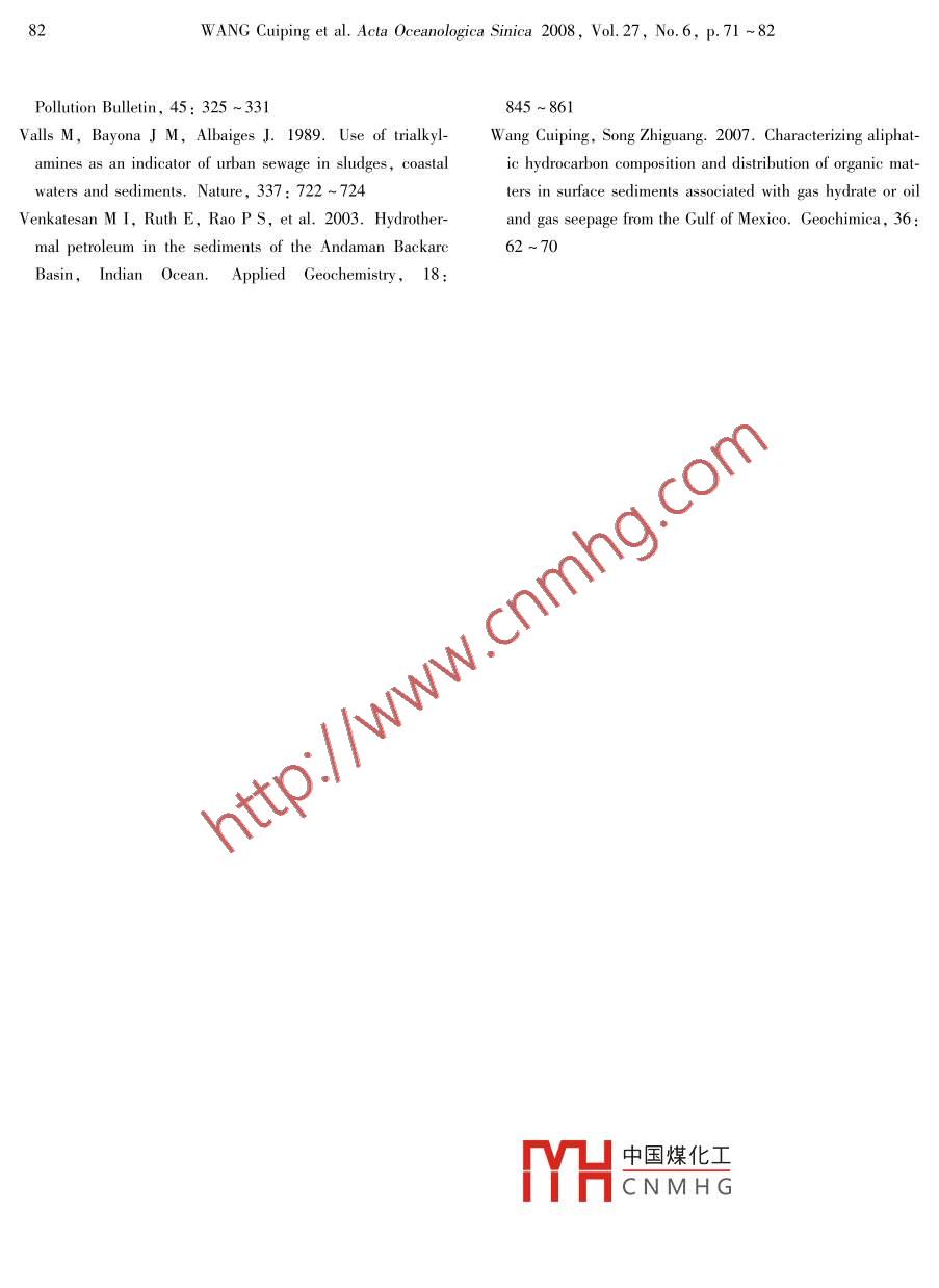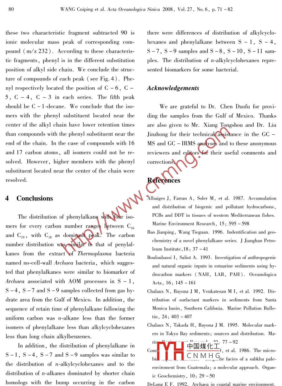 Acta Oceanologica Sinica 2008, Vol 27, No 6, p 71-82http://www.oceanpress.com.cnE-mail,hyxbe@263.netThe distribution of phenylalkanes in the modern sediment associatedwith gas hydrate from the gulf of MexicoWANG Cuiping, SUN Hongwen, SoNG Zhiguang, ZHANG Tao1. College of Environmental Science and Engineering, Nankai University, Tianjin 300071, China2. State Key Laboratory of Organic Geochemistry, Guangzhou Institute of Geochemistry, Chinese Academy of Sciences, Guang-zhou 510640. ChinaReceived 31 July 2007; accepted 2 November 2007AbstractPhenylalkanes with carbon numbers between 16 and 19, characterized by the main carbon-18, have been identified in the modern sediments collected from gas hydrate area from the Gulf of Mexico. The structure of pheny alkanes with four isomers for ever-y carbon number was determined by means of their mass spectra and previous studies. The distribution of the series character-ized by a low molecular mass was similar to the distribution of n-alkane, alkylcyclohexanes and alkylbenzenes in each sampleThere were differences in the distribution of the pheny alkane series between the s-1, s-4,s-7,s-9 samples and the s8, S-10 and S-1l samples. The phenylalkanes might be derived from Archaea associated with anaerobic oxidation of methane(AOM)processes in S-1, S-4,S-7 and S-9 samples according to their distribution resembled with the distribution of theextract from a type of Archaea. The distribution of alkylcyclohexanes and alkylbenzenes in S-1, S-4,S-7 and S-9 samplewas found to be similar to each other. The odd-over-even predominance of alkylcyclohexanes was seen as the input of some bacKey words: phenylalkane, gas hydrate, Gulf of Mexico1 IntroductionHartmann et al., 2000: Chalaux et al. 1995Takada et al. 1994: bouloubassi and saliotPhenylalkanes have been identified in sam- 1993; Chalaux et al., 1992; Taada et aples from natural sources, they have been usually 1992; Valls et al., 1989; Eganhouse and Kapregarded as indictors of contamination because of lan, 1988; Albaiges et al., 1987; Murray ettheir presence in surfactant formulations and thekada and Hiwatari, 1987; Egan-lack of credible precursor natural products for this中國(guó)煤化工=83: Ishiwatari et alclass. Detection and distribution of alkylbenzenes 198CNMHtilized as molecularwere reported in many coastal zones in the world markers of sewage inputs to the coastal waters overFoundation item. The Chinese academy of science under contract Nos KZCX3-SW-224 and KGCX2-SW-309Correspond數(shù)據(jù)-mal:wepphs@sohu.comWANG Cuiping et al. Acta Oceanologica Sinica 2008, Vol 27, No 6, p. 71-8220 a( Takada and Eganhouse, 1998). In some tra and the previous reports( Eganhouse, Blumfieldcases, from geochemical samples, naturally-deet al., 1983; Ishiwatari et al., 1983 ). We tried torived phenylalkane was also identified in crude oil provide some information for the investigation of gasand sediments( Ellis et al., 1996: Ellis et al1995) and in the saturated fraction of the LowerPaleozonic and Pre-Cambrian rock( Bao and 2 Samples and experimentWang, 1996). They have been reported as indigenous components of sedimentary organic matte2. 1 Sample collectionHowever, only a very few reports have beenavailable on the detection of naturally-derived phenyduring dives of the "Johnson Sea-Linkalkane in marine sediment. Moreover, the occur-("JSL") research submarine to the Gulf of Mexicorence of phenylalkane in marine sediment associated on 18--27 May 2002, a total of nine samples werewith gas hydrate has received much less attention collected. The" Johnson Sea-Link"("JSL")re-than the archaea lipids biomarkers suchsearch submersible was used to recover sedimentane,2,6, 10, 15, 19-pentamethylicosane( PMI) from the Green Canyon ( GC) 238, 527 andIs well as the glycerol ether lipid archaeol. So, their Ew1001 site in the Gulf of Mexico where gas ven-distribution in the samples collected from gas hydrate ting and gas hydrates are in abundance. Samplingarea has not been reportedlocations were far from sewage outfalls or urban rivHedrilling leto report the phenylalkits of six sedications. Samples were collected by use of Van Veenments and carbonate sample(s-4)and compareab. Samples descriptions, location, water temtheir distributions with those obtained from the previ- peratures, and depth are listed in Table 1. In thisous studies Bao and Wang, 1996; Ellstudy, seven samples were chosen for the analysis of1996)in order to forecast the origin of these com- sedimentary organic matter. All samplespounds in sediments collected from the gas hydrate at -20 C immediately upon recovery at the sea sur-area from the Gulf of Mexico, as well as to identify face and kept frozen until analysisphenylalkane and guess their structure by mass specTable 1. Characteristics of samples in the Gulf of MexicoDescription of samplesLatitude and longitudeT℃black mud sediments onbacteria mats27°4.4453N,91°03.0470′Wwhere have smell of h sblack mud sediments on the bacteria mats mud no detail5.41901.01volcano with gas ventingblack mud sediments on the bacteria mats中國(guó)煤化工7.86517.6EW1001 S-9plack mud sediments on the bacteria mats mud 27HCNMHG 7.8olcano with gas ventingblack mud sediments on the bacteria mats27°57.937lN.90°23.7770W7.84521.6black mud sediments on the bacteria mats27°58.01l4′N23.5835′W7.84529.39WANG Cuiping et al. Acta Oceanologica Sinica 2008, Vol 27, No 6, p. 71-82mode(70 eV). The temperature of ms detector was2. 2 Experimental procedures180C and the mass scanning ranged from m/z 50 toThe sediment samples from the Gulf of MeexIcom/z 550. Helium was the carrier gas at a 1.2 mvere air-dried in a desiccator and stirred to homoge- min flow rate. The oven temperature was initiallynize. Forty-five grams of the hoiheld at 80 C for 5 min, and then programmed at awere subjected to Soxhlet extraction for 72 h using a heating rate of 3 C/min to 290C and maintained9: 1 mixture of dichloromethane/methanol. Activated for 10mncop