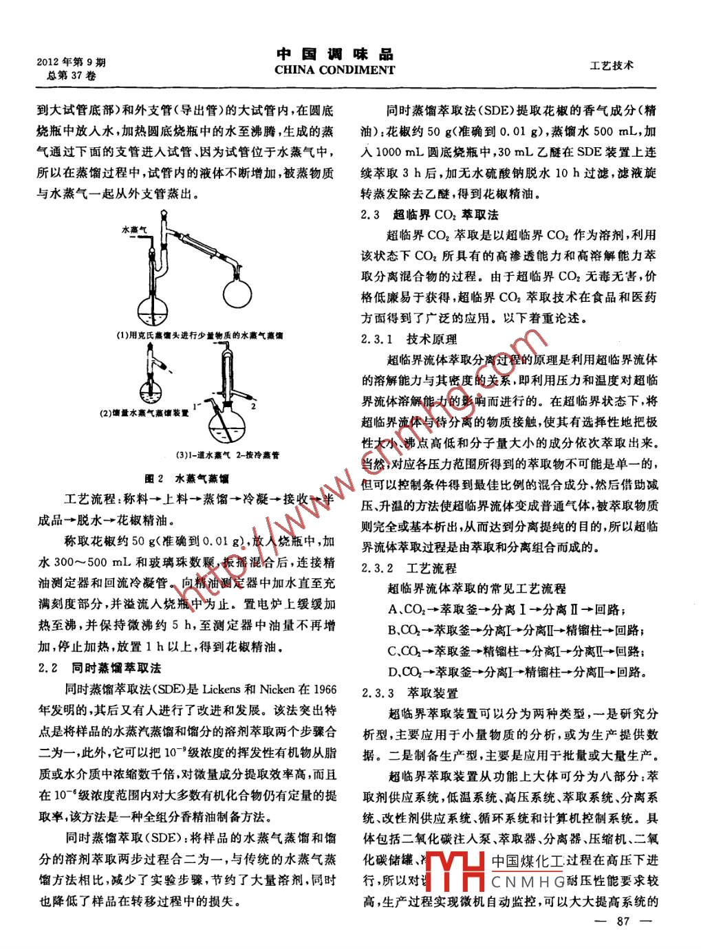 2012年第9期中國(guó)調(diào)味品工藝技術(shù)總第37卷CHINA CONDIMENT花椒精油的加工工藝胡建平‘,史碧波(西昌學(xué)院輕化工程學(xué)院,四川西昌615013)摘要:花椒精油是食品加工企業(yè)和香料行業(yè)理想的調(diào)香原料,花椒精油的制得方法很多。文章主要綜述了花椒精油的水蒸氣燕餾方法、同時(shí)燕餾萃取法、超臨界CO2萃取法。關(guān)鍵詞:花椒;精油;加工中圖分類號(hào):TS264.3文獻(xiàn)標(biāo)識(shí)碼:A文章編號(hào):1000-9973(2012)09-0085-04Processing Techniques of the Zanthoxylum OilHU Jian-ping, SHI Bi-bo(School of Applied and Chemical Engineering of Xichang College, Xichang 615013, China)Abstract: Zanthoxylum oil food processing enterprises and spices trade- ideal for raw materials, Chineseprickly ash oil preparation method. This paper mainly reviews the pepper zanthoxylum oil steam distillation method, simultaneous distillation and extraction, supercritical CO2 extraction methodKey words: zanthoxylum; oil; process精油是從植物上取得的具有香氣的物質(zhì),是由植物中的花、葉、種子、果皮、枝干、樹皮、木質(zhì)、根地下1精油的取得方式莖、樹膠或油性樹脂中萃取出來的液體。具有該植物1.1水蒸氣蒸餾法的特殊芳香氣味及復(fù)雜特殊的化學(xué)成份。就如同中草利用水來熬煮或蒸煮或在高壓鍋爐煮的方式來萃藥一般,每一種植物或同一種植物不同部位,都會(huì)有不取,在經(jīng)過沉淀、過濾等多道復(fù)雜的手續(xù)來取得精油的同的氣味與作用同樣的植物、同樣的部份也會(huì)因?yàn)檩洼腿》椒ㄈ〉姆绞讲煌玫降臍馕杜c作用也有可能不相同。1.2有機(jī)溶劑抽提法因?yàn)楸惠腿〕鑫镔|(zhì)濃度高,因此具有特殊的物理或化這種萃取方法常被用在不能使用水蒸氣蒸餾法,學(xué)作用,所以芳香精油才會(huì)有著特別的功能,例如抑制因?yàn)橛行┏煞轃o(wú)法承受高溫,因?yàn)楦邷貢?huì)破壞萃取物細(xì)菌、治療傷口、情緒放松、振奮精神等?;钚宰饔没虮苊飧邷囟冑|(zhì)或不易透過水蒸氣蒸餾法從花椒中提取出的揮發(fā)性油稱為花椒精油,是花取得之成份,再經(jīng)過濾及去除有機(jī)溶劑或其它凈化程椒香氣的主要有效成份,每公斤精油相當(dāng)于60~序,取得成品。100kg原料花椒所具有的香氣程度??芍苯踊蛳♂尯?.3壓榨法用于調(diào)制產(chǎn)生花椒的特有香氣,是食品加工企業(yè)和香這種萃取方法用在水蒸氣蒸餾法或化學(xué)溶劑萃取料行業(yè)理想的調(diào)香原料。同時(shí)花椒精油具有較強(qiáng)的殺法都不適用時(shí)其原因可能是:高溫問題、無(wú)合適的有機(jī)蟲活性與一定的抑菌活性,深受老百姓的青睞。溶劑、有合適的有機(jī)溶劑但無(wú)法去除、取得產(chǎn)量太低收稿日期:2012-04-05通訊作者中國(guó)煤化工基金項(xiàng)目:西昌學(xué)院碩士科研啟動(dòng)基金資助(XAo515)CNMHG作者簡(jiǎn)介:胡建平(1980-),男,副教授,研究方向:食品開發(fā)與研究。2012年第9期中國(guó)調(diào)味品CHINA CONDIMENT工藝技術(shù)總第37卷等等因此才會(huì)使用這種方法。例如芝麻用水煮的方用。如果系統(tǒng)發(fā)生阻塞,水會(huì)從管的上口噴出,這時(shí)應(yīng)停法煮不出什么,用溶劑反而成本太高還會(huì)有異味,取出止蒸餾,查找原因。D為蒸餾瓶,E為蒸氣導(dǎo)入管。后更失去原有之特色及作用,因此壓榨法反而是最有安全管效、最安全、最簡(jiǎn)單的方法,但此法最后還要經(jīng)過許多氣導(dǎo)人晉后續(xù)手續(xù)才能取得成品。水晶氣發(fā)生1.4冷浸法或溫浸法顧名思義是利用浸泡的方式將被萃取物里的物質(zhì)溶出,在可接受的溫度范圍里用加溫的方式來增加溶出速度與產(chǎn)量。1.5SCF超臨界流體萃取法( Super Critical Fluids)超臨界流體是指操作溫度及壓力超過臨界點(diǎn)的狀態(tài)圖1水蒸氣蒸餾裝置實(shí)物圖下流體具有許多獨(dú)特的物理及化學(xué)性質(zhì)。如相似于氣2.1.2安裝體的低黏度及液體的高密度特性,另有高擴(kuò)散系數(shù)低表蒸餾瓶是500mL以上的長(zhǎng)頸圓底燒瓶,燒瓶向面張力、溶解能力可隨溫度及壓力改變等特性。發(fā)生器方向傾斜45°角,以免濺起的液沫被蒸氣帶進(jìn)萃取方式應(yīng)用超臨界流體,可輕易萃取出所需的冷凝管中;瓶?jī)?nèi)液體不超過其容積的1/3。在水蒸氣成份,而且無(wú)溶劑殘留和產(chǎn)品受熱破壞等缺點(diǎn),可以說發(fā)生器與蒸氣導(dǎo)人管之間用橡膠管連接一個(gè)T形管,是綠色環(huán)保的萃取方法。T形管下端連接一段帶有螺旋夾的乳膠管。打開螺旋幾種常用的方法夾,可以及時(shí)放掉蒸氣冷凝形成的水滴。蒸氣發(fā)生器至蒸餾瓶之間的蒸氣導(dǎo)管應(yīng)盡可能短,以減少蒸氣的2.1水蒸氣蒸餾法冷凝。蒸氣導(dǎo)管的下端應(yīng)盡量接近瓶底,但不應(yīng)與瓶原理:水蒸氣蒸餾,簡(jiǎn)言之,就是當(dāng)水和不(或難)底接觸,彎曲部分位于瓶中液體的中央并與瓶底垂直,溶于水的化合物一起存在時(shí),整個(gè)體系的蒸氣壓力根以便于水蒸氣與蒸餾物質(zhì)充分接觸并起攪動(dòng)作用。與據(jù)道爾頓分壓定律,應(yīng)為各組分蒸氣壓力之和。冷凝管連接的導(dǎo)管F為30°角。進(jìn)行蒸餾時(shí),打開T即:P=P水十PA[PA為與不(或難)溶化合物的蒸形管下端的螺旋夾,加熱水蒸氣發(fā)生器,直至水沸騰,氣壓]當(dāng)P與外界大氣壓相等時(shí),混合