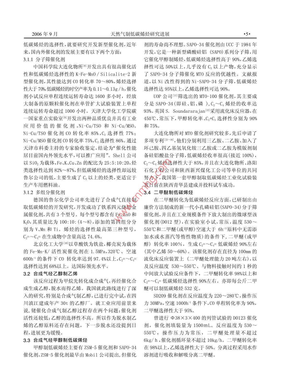 2006年9月天然氣制低碳烯烴研究進(jìn)展●3●綜述與專(zhuān)論苑慧敏,張永軍,張志翔1,王湛2(1.大慶石化分公司研究院,黑龍江大慶,163714; 2.大慶石化分公司煉油廠,黑龍江大慶,163714)摘要:對(duì) 當(dāng)前低碳烯烴技術(shù)發(fā)展進(jìn)行了簡(jiǎn)要介紹,并具體介紹了天然氣甲烷氧化偶聯(lián)制乙烯、合成氣直接制乙烯和合成氣經(jīng)甲醇制乙烯技術(shù)的催化劑及工藝路線研究情況。為低碳烯烴技術(shù)的長(zhǎng)遠(yuǎn)發(fā)展提供了參考。關(guān)鍵詞:天然氣;低碳烯烴;氧化偶聯(lián);合成氣中圖分類(lèi)號(hào):TE646; 0643.36+1文獻(xiàn)標(biāo)識(shí)碼:A 文 章編號(hào):1006- -253x(2006)09-003- 4.Research Progress of Light Olefins from Natural GasYUAN Hui-min' ,ZHANG Yong- -jun' ,ZHANG Zhi- -xiang',WANG Zhan2(1.Research Insitiute of Daqing Pretrochemical Company, Daqing 163714, China;2.Refinery of Daqing Pretrochemical Company, Daqing 163714, China )Abstract:The technical progress of producing light olefins by natural gas was reviewed. And catalystsand technical routes of OCM and GSTO and GSMTO were introduced detailedly. It offered a refer-ence for long- -term development of producing light olefins.Key words: natural gas;light olefins;OCM;synthesis gas1前言大舉措。因此,實(shí)現(xiàn)天然氣制烯烴的工業(yè)化具有重大的意義。低碳烯烴主要是指乙烯和丙烯,它們是極為重要的有機(jī)化工原料,是合成洗滌劑、塑料、纖維和各類(lèi)化2甲 烷轉(zhuǎn)化法工材料的關(guān)鍵中間體,構(gòu)成龐大的有機(jī)化學(xué)工業(yè)的基礎(chǔ),市場(chǎng)需求一直供不應(yīng)求。 而且目前,90%以上的低2.1 甲烷氧化偶聯(lián)制乙烯碳烯烴主要來(lái)自輕油裂解,隨著石油資源的日漸缺1982年美國(guó)的Union Carbide 化學(xué)公司的G. E.乏,急需尋找替代資源。所以以天然氣替代石油制取keller和M. M. bhasia叫首次公開(kāi)發(fā)表了甲烷催化偶烯烴的研究工作則被重視起來(lái),世界上一些著名的石聯(lián)制乙烯的研究成果,該工藝克服了甲烷經(jīng)脫氫偶聯(lián)油公司和科研院所都進(jìn)行了這方面的研究開(kāi)發(fā)工作,制乙烯需800°C以上高溫以及脫氫反應(yīng)需吸收大量熱并取得了令世人矚目的成果。尤其是以天然氣為原料量的缺 點(diǎn),使該工藝無(wú)論從反應(yīng)熱力學(xué)還是經(jīng)濟(jì)上考經(jīng)甲醇制烯烴的工藝技術(shù)(簡(jiǎn)稱GSMTO)基本具備了大慮 都有其現(xiàn)實(shí)意義。型工業(yè)化的條件。如果天然氣制烯烴裝置建成,必將甲烷氧化偶聯(lián)制乙烯的技術(shù)關(guān)鍵在催化劑。經(jīng)過(guò)為天然氣化工的發(fā)展開(kāi)辟新途徑,也有助于天然氣資多 年來(lái)的研究,人們已經(jīng)篩選出了數(shù)千種催化劑,申源的大規(guī)模開(kāi)發(fā)利用,是解決石油資源持續(xù)短缺的重請(qǐng)了上百篇專(zhuān)利。其中,堿金屬-堿土金屬、稀土金收稿日期:2006-7-14作者簡(jiǎn)介:苑慧敏(1981-),女,工程師,2002 年畢業(yè)于大慶石油學(xué)院化學(xué)工程專(zhuān)業(yè),目前從事天然氣轉(zhuǎn)化利用方面研究。.2006年9月天然氣制低碳烯烴研究進(jìn)展.5.低碳烯烴的選擇性,就要研究開(kāi)發(fā)新型催化劑,近年劑的壽命尚不理想。SAPO-34催化劑由UCC于1984年來(lái),國(guó)內(nèi)外催化劑的發(fā)展主要有以下兩個(gè)方面:開(kāi)發(fā),它是一種新型磷酸硅鋁(SAPO) 系列分子篩,用3.1.1分子篩催化劑它催化甲醇制烯烴,低碳烯烴選擇性高于90%,乙烯選中國(guó)科學(xué)院大連化物所8開(kāi)發(fā)出具有很高催化活擇性可達(dá)50%以上,幾乎沒(méi)有C。以上產(chǎn)物,充分顯示性和低碳烯烴選擇性的K Fe-Mn0/ Silicalite-2新了 SAP0- -34分子篩催化MTO反應(yīng)的優(yōu)越性。文獻(xiàn)報(bào)型催化劑,其性能達(dá)到CO轉(zhuǎn)化率70~80%,烯烴選擇道,以Ni改性得到的Ni-SAPO-34分子篩,低碳烯烴性大于70%,低碳烯烴的時(shí)空產(chǎn)率為0.11~0.13g/h,催化選擇性達(dá) 95%以上,乙烯選擇性可達(dá)90%。劑小試反應(yīng)單程連續(xù)運(yùn)轉(zhuǎn)壽命達(dá)1600 多小時(shí),經(jīng)放UOP公司"篩選出的MTO-100催化劑,其主要成大制備的原顆粒催化劑在單管擴(kuò)大試驗(yàn)裝置上單程分是SAP0-34(即硅、鋁、磷),C2~C4烯烴的收率達(dá)連續(xù)運(yùn)轉(zhuǎn)壽命超過(guò)1000小時(shí)。天津大學(xué)化工學(xué)院碳93%。英國(guó)S. Soundararajan(采用流 化床反應(yīng)器,在-國(guó)家重點(diǎn)實(shí)驗(yàn)室回開(kāi)發(fā)出兩種品質(zhì)優(yōu)良并具有工業(yè) 450C,常壓下,甲醇轉(zhuǎn)化率、C2+C3選擇性分別為90%應(yīng)用價(jià)值的催化劑,Ni-Cu/TS0 和Ni-Cu/MSO。 和75%。Ni--Cu/TSO催化劑CO轉(zhuǎn)化率85%,C2選擇性77%;大連化物所對(duì)MTO催化劑研究較多,先后申請(qǐng)了Ni-Cu/MSO催化劑co轉(zhuǎn)化率75%,C2選擇性86%。通過(guò)多 項(xiàng)專(zhuān)利[(3~16] ,他們分別利用三乙胺、:二乙胺、加入了天津市科委主持的專(zhuān)家驗(yàn)收鑒定,結(jié)論為“催化性能環(huán)己胺、四乙基氫氧化銨三乙胺或二乙胺為模版劑制居目前國(guó)內(nèi)外領(lǐng)先水平,可以推廣應(yīng)用”。Shell 公司備硅鋁酸鹽分子篩,低碳烯烴收率很高(接近100%),以Si02為載體, Fe、K、Cu、Zn的配比為25:5:10:20,烴C2~C,烯烴選擇性大于85%,并且在大連化物所、洛陽(yáng)類(lèi)選擇性達(dá)到82%~87%,但低碳烯烴的選擇性