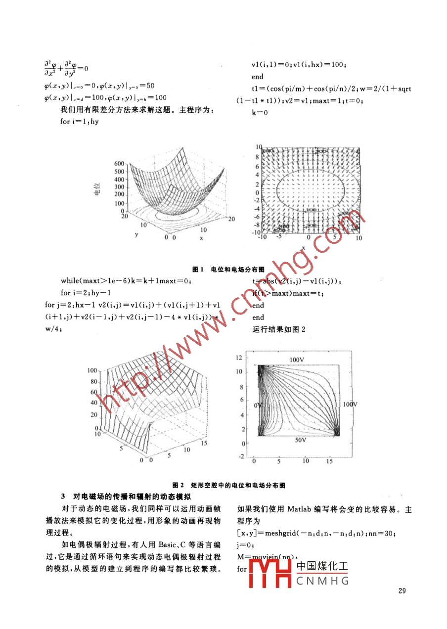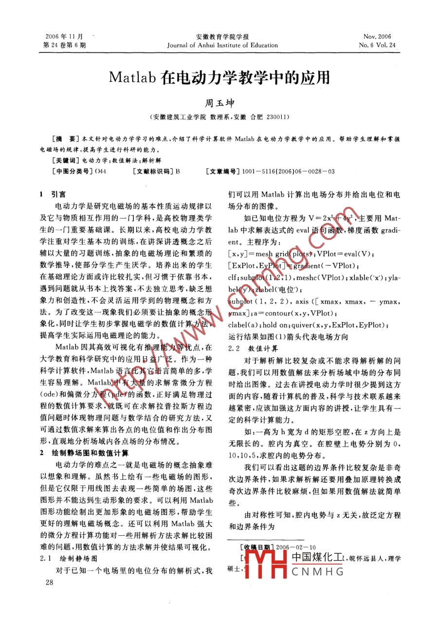 安徽教育學(xué)院學(xué)報(bào)第24卷第6期Journal of Anhui Institute of EducationNo 6 Vol. 24Matlab在電動(dòng)力學(xué)教學(xué)中的應(yīng)用周玉坤(安徽建筑工業(yè)學(xué)院數(shù)理系,安徽合肥230011[擴(kuò)要]本文針對(duì)電動(dòng)力學(xué)學(xué)習(xí)的難點(diǎn),介紹了科學(xué)計(jì)算軟件 Matlab在電動(dòng)力學(xué)教學(xué)中的應(yīng)用。幫助學(xué)生理解和掌捱電磁場(chǎng)的規(guī)律,提高學(xué)生進(jìn)行科研的能力[關(guān)鍵詞]電動(dòng)力學(xué);數(shù)值解法;解析解[中圖分類號(hào)](44[文獻(xiàn)標(biāo)識(shí)碼]B文章編號(hào)]1001-5116(2006)06-0028-031引言們可以用 Matlab計(jì)算出電場(chǎng)分布并給出電位和電電動(dòng)力學(xué)是研究電磁場(chǎng)的基本性質(zhì)運(yùn)動(dòng)規(guī)律以場(chǎng)分布的圖像及它與物質(zhì)相互作用的一門學(xué)科,是高校物理類學(xué)如已知電位方程為V=2x2+4y2,主要用Mat生的一門重要基礎(chǔ)課。長(zhǎng)期以來,高校電動(dòng)力學(xué)教ab中求解表達(dá)式的eva語句函數(shù),梯度函數(shù)grad-學(xué)注重對(duì)學(xué)生基本功的訓(xùn)練,在講深講透概念之后ent。主程序?yàn)檩o以大量的習(xí)題訓(xùn)練,抽象的電磁場(chǎng)理論和繁瑣的[x,y]= mesh grid( plots); PLot:=evl(V);數(shù)學(xué)推導(dǎo),使部分學(xué)生產(chǎn)生厭學(xué)。培養(yǎng)出來的學(xué)生 ExPlot, EyPlot]= gradien(- PLot)在基礎(chǔ)理論方面或許比較扎實(shí),但習(xí)慣于依靠書本,cl; subplot(1,2,1),mesh( PLot); cable(x);yla遇到問題就從書本上找答案,不去獨(dú)立思考,缺乏想bel(y); zlabel(電位);象力和創(chuàng)造性,不會(huì)靈活運(yùn)用學(xué)到的物理概念和方 subplot(1,2,2),axis([xmax,xmax,-ymax,法。為了改變這一現(xiàn)象我們必須要讓抽象的概念形ymax];a= contour(x,y, PLot);象化,同時(shí)讓學(xué)生初步掌握電磁學(xué)的數(shù)值計(jì)算方法, clabel(a); hold on; quiver(x,y, ExPlor, EyPlot)提高學(xué)生實(shí)際運(yùn)用電磁理論的能力。運(yùn)行結(jié)果如圖(1)箭頭代表電場(chǎng)方向Matlab因其髙效可視化有推理能力等優(yōu)點(diǎn),在2.2數(shù)值計(jì)算大學(xué)教育和科學(xué)研究中的應(yīng)用日益廣泛。作為一種對(duì)于解析解比較復(fù)雜或不能求得解析解的問科學(xué)計(jì)算軟件, Matlab語言比其它語言簡(jiǎn)單的多,學(xué)題,我們可以用數(shù)值解法來分析場(chǎng)域中場(chǎng)的分布同生容易理解。 Matlab中有大量的求解常微分方程時(shí)給出圖像。過去在講授電動(dòng)力學(xué)時(shí)很少提到這方(ode)和偏微分方程(pde)的函數(shù),正好滿足物理過面的內(nèi)容,隨著計(jì)算機(jī)的普及,科學(xué)與技術(shù)聯(lián)系越來程的數(shù)值計(jì)算要求,就既可在求解拉普拉斯方程邊越緊密,應(yīng)該加強(qiáng)這方面內(nèi)容的講授,讓學(xué)生具有一值問題時(shí)體現(xiàn)物理問題與數(shù)學(xué)結(jié)合的研究方法,又定的科學(xué)計(jì)算能力可通過數(shù)值求解來算出各點(diǎn)的電位值和作出分布圖如:一高為h寬為d的矩形空腔,在z方向上是形,直觀地分析場(chǎng)域內(nèi)各點(diǎn)場(chǎng)的分布情況無限長(zhǎng)的。腔內(nèi)為真空。在腔壁上電勢(shì)分別為02繪制靜場(chǎng)圖和數(shù)值計(jì)算10,10,5,求腔內(nèi)的電勢(shì)分布電動(dòng)力學(xué)的難點(diǎn)之一就是電磁場(chǎng)的概念抽象難我們可以看出這題的邊界條件比較復(fù)雜是非奇以想象和理解。雖然書上繪有一些電磁場(chǎng)的圖形,次邊界條件,如果求解析解還要用疊加原理轉(zhuǎn)換成但是它僅限于用線圖去表現(xiàn)一些簡(jiǎn)單的場(chǎng)圖,這些奇次邊界條件比較麻煩,但如果用數(shù)值解法就簡(jiǎn)單圖形并不能達(dá)到生動(dòng)形象的要求??梢岳?Matlab此圖形功能繪制出更加形象的電磁場(chǎng)圖形,幫助學(xué)生由對(duì)稱性可知,腔內(nèi)電勢(shì)與z無關(guān),故泛定方程更好的理解電磁場(chǎng)概念。還可以利用 Matlab強(qiáng)大和邊界條件為的微分方程計(jì)算功能對(duì)一些用解析方法求解比較困難的問題,用數(shù)值計(jì)算的方法求解并使結(jié)果可視化06-02-102.1繪制靜場(chǎng)中國煤化工,皖懷遠(yuǎn)縣人,理學(xué)對(duì)于已知一個(gè)電場(chǎng)里的電位分布的解析式,我碩士CNMHGtI=(cos(pi/m)+cos(pi/n)/2; w=2/(1+sqrtx,y)|x=4=100,g(x,y)|y=h=100(1-t1*t1);v2=vl;maxt=1;t=0;我們用有限差分方法來求解這題。主程序?yàn)?6¥H10圖1電位和電場(chǎng)分布圖while(maxt>le-6)k=k+Imaxt=0:t=abs (v2(i,j)-vI(i,j));for i=2; hy-1if(t>maxt)maxt=tfor j=2: hx-1 v2 (i, j)=vl(i,j)+(vl(i,j+1)+v1(i+1,j)+v2(i-1,j)+v2(i,j-1)-4*vl(i,j)*w/4;運(yùn)行結(jié)果如圖2100V10840圖2矩形空腔中的電位和電場(chǎng)分布圖3對(duì)電磁場(chǎng)的傳播和輻射的動(dòng)態(tài)模擬對(duì)于動(dòng)態(tài)的電磁場(chǎng),我們同樣可以運(yùn)用動(dòng)畫幀如果我們使用 Matlab編寫將會(huì)變的比較容易。主播放法來模擬它的變化過程用形象的動(dòng)畫再現(xiàn)物程序?yàn)槔磉^程[x, y]=meshgrid(-n:d: n,-n:d: n):nn=30:如電偶極輻射過程,有人用 Basic、C等語言編過,它是通過循環(huán)語句來實(shí)現(xiàn)動(dòng)態(tài)電偶極輻射過程M= moviein(n2),的模擬,從模型的建立到程序的編寫都比較繁瑣。for中國煤化工CNMHGz=(x/sqrt(x. 2+y. 2).2.*(-si