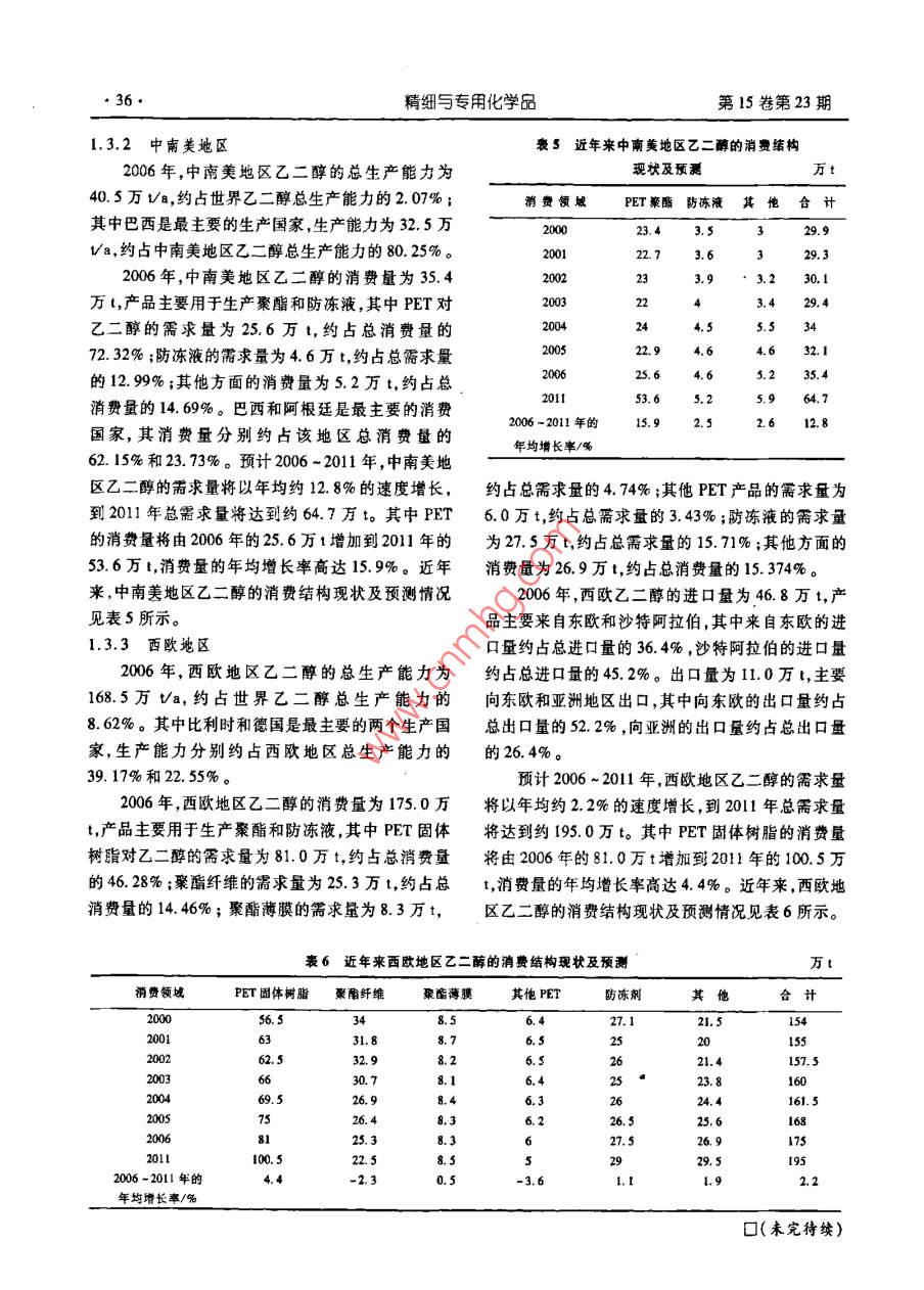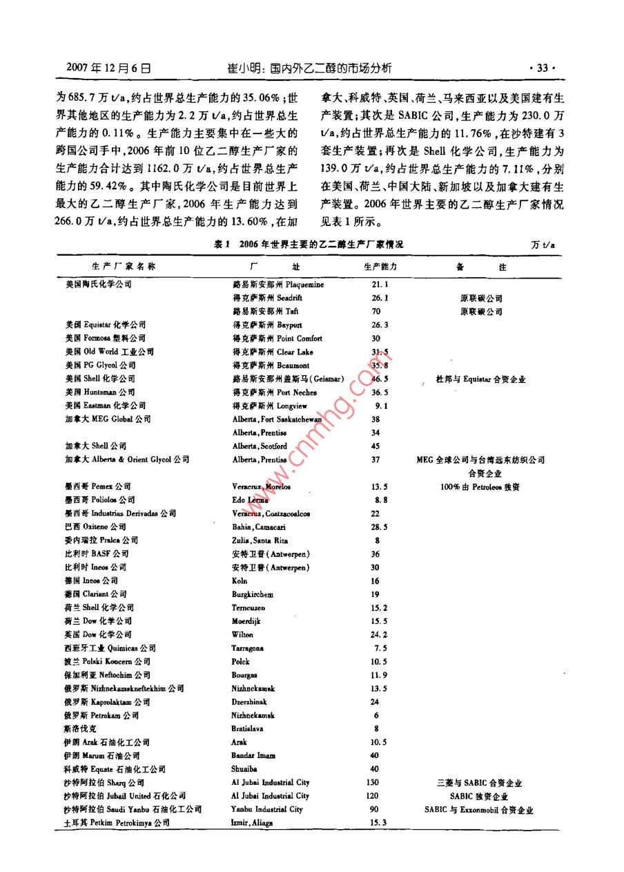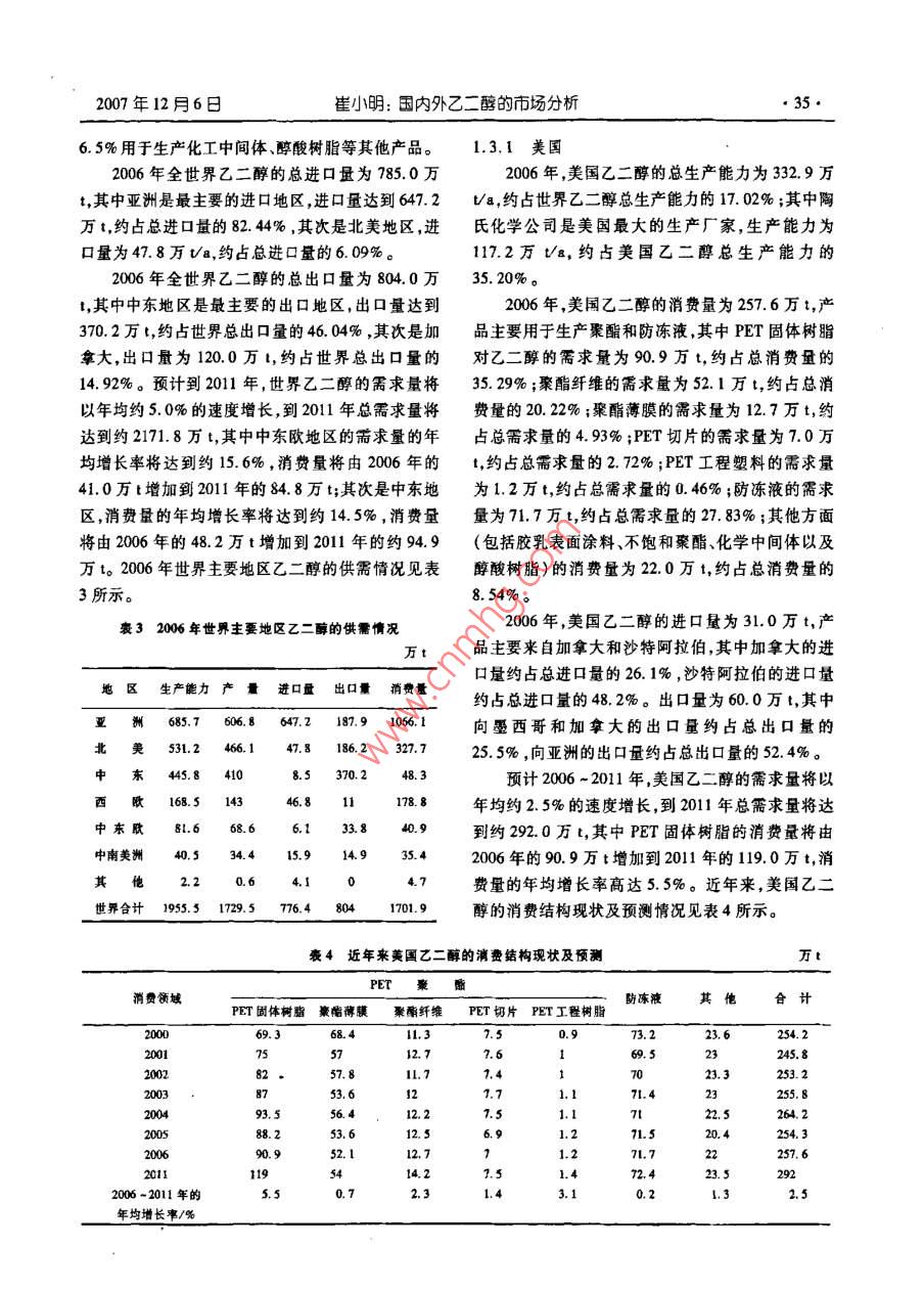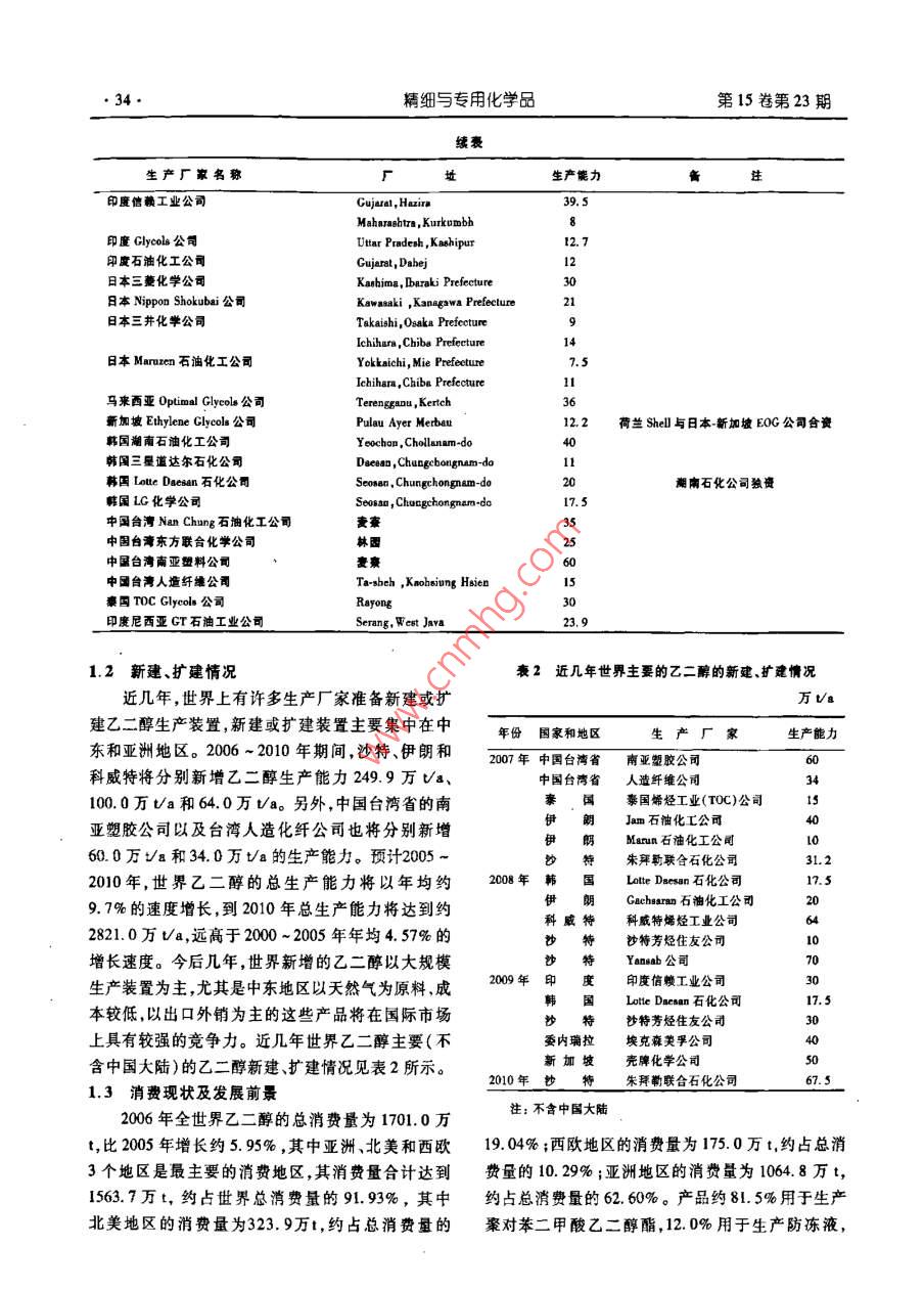 Vol 15. No 23精細(xì)與專(zhuān)用化學(xué)品第15卷第23期Fine and Specialty Chemicals2007年12月6日國(guó)內(nèi)外2二醇的市揚(yáng)分析(一)崔小明北京燕山石油化工公司研究院,北京102550)摘要:2006年全球乙二醇的總生產(chǎn)能力為19555萬(wàn)ta,總消費(fèi)量為1701.0萬(wàn)t預(yù)計(jì)到2011年總消費(fèi)量達(dá)到約21718萬(wàn)t。目前我國(guó)乙二醇的總生產(chǎn)能力為2078萬(wàn)/a,2006年消費(fèi)量為562.0萬(wàn)t,預(yù)計(jì)到2010年我國(guó)乙二醇的總生產(chǎn)能力將達(dá)到約4200萬(wàn)t/a,消費(fèi)量將達(dá)到約710.0萬(wàn)t。針對(duì)存在的問(wèn)題提出了我國(guó)乙二醇今后的發(fā)建議關(guān)鍵詞:乙二醇;環(huán)氧乙烷;碳酸乙烯酯;聚酯;防凍液Market Analysis of Ethylene Glycol at Home and Abroad(I)CUI Xiao-mingResearch Institute of Beijing Yanshan Petrochemical Corp . Beijing 102550, China)Abstract: In 2006, the total capacity of ethylene glycol in the world was about 19. 555mt/a, with total consumption a.bout 17. 01mt/a. It is forecasted that the total consumption of ethylene glycol worldwide will reach about 21. 718mt/a2011. At present, the production capacity of ethylene glycol in China is about 2078kt/a, with total consumption about5620kt/a in 2006. In 2010, the total production capacity and consumption of ethylene glycol in China will reach abou4200kV a and 7100kt/a respectively. According to the status and problems existing in production of ethylene glycol in Chi-na, suggestions for further development of ethylene glycol in China are put forwardKey words: ethylene glycol; ethylene oxide; vinyl carbonate; polyester; antifreezing agent乙二醇(EG)是一種重要的有機(jī)化工原料,主要用于生產(chǎn)聚酯纖維、防凍劑、不飽和聚酯樹(shù)脂潤(rùn)滑1世界乙二醇的供需現(xiàn)狀及發(fā)展前景12劑、增塑劑、非離子表面活性劑以及炸藥等,此外還1.1生產(chǎn)現(xiàn)狀可用于涂料、照相顯影液、剎車(chē)液以及油墨等行業(yè)近年來(lái),隨著全球聚酯產(chǎn)品市場(chǎng)消費(fèi)的急劇增用做過(guò)硼酸銨的溶劑,用于生產(chǎn)特種溶劑乙二醇醚長(zhǎng),世界乙二醇的生產(chǎn)發(fā)展很快。2000年世界乙二等,用途十分廣泛。醇的總生產(chǎn)能力只有1423.0萬(wàn)t/a,203年增加到目前國(guó)內(nèi)外大型乙二醇的工業(yè)化生產(chǎn)都采用環(huán)1586.2萬(wàn)va,2006年達(dá)到1955.5萬(wàn)v/a,同比增長(zhǎng)氧乙烷直接水合即加壓水合法的工藝路線(xiàn),生產(chǎn)技約991%。其中北美的生產(chǎn)能力為531.2萬(wàn)v/a,術(shù)基本上由She美國(guó)Hlon-SD以及美國(guó)UCC3約占世界乙二醇總生產(chǎn)能力的27.16%;中南美地家公司所壟斷。區(qū)的生產(chǎn)能力為40.5萬(wàn)∽a,約占世界總生產(chǎn)能力近年來(lái),隨著聚酯纖維、聚酯塑料和防凍液等對(duì)的207%;西歐地區(qū)的生產(chǎn)能力為168.5萬(wàn)∽/a,約乙二醇的旺盛需求,人們開(kāi)始致力于乙二醇新合成占世界乙二醇總生產(chǎn)能力的862%;中東歐地區(qū)的技術(shù)的研究和開(kāi)發(fā)工作,其中環(huán)氧乙烷催化水合法生產(chǎn)能力為81.6萬(wàn)Ua,約占世界總生產(chǎn)能力的和碳酸乙烯酯法被認(rèn)為是今后乙二醇最有發(fā)展前景4.17%;中東地區(qū)的生產(chǎn)能力為45.8萬(wàn)ta,約占的兩種工業(yè)化生產(chǎn)方法。世界總生產(chǎn)能力的22.80%;亞洲地區(qū)的生產(chǎn)能力·收稿日期:20070724作者簡(jiǎn)介:崔小明(1966-),男高級(jí)工程師主要從事情報(bào)調(diào)研和信息研究工作。200年12月6日崔小明:國(guó)內(nèi)外乙二靜的市場(chǎng)分析33為6857萬(wàn)∽a,約占世界總生產(chǎn)能力的3506%;世拿大科威特、英國(guó)、荷蘭馬來(lái)西亞以及美國(guó)建有生界其他地區(qū)的生產(chǎn)能力為22萬(wàn)a,約占世界總生產(chǎn)裝置;其次是SABC公司,生產(chǎn)能力為230.0萬(wàn)產(chǎn)能力的0.11%。生產(chǎn)能力主要集中在一些大的∽a,約占世界總生產(chǎn)能力的11076%,在沙特建有3跨國(guó)公司手中,2006年前10位乙二醇生產(chǎn)廠家的套生產(chǎn)裝置;再次是hl化學(xué)公司,生產(chǎn)能力為生產(chǎn)能力合計(jì)達(dá)到1162.0萬(wàn)U/a,約占世界總生產(chǎn)139.0萬(wàn)Ua,約占世界總生產(chǎn)能力的71%,分別能力的5942%。其中陶氏化學(xué)公司是目前世界上在美國(guó)荷蘭、中國(guó)大陸新加坡以及加拿大建有生最大的乙二醇生產(chǎn)廠家,2006年生產(chǎn)能力達(dá)到產(chǎn)裝置。2006年世界主要的乙二醇生產(chǎn)廠家情況260萬(wàn)va,約占世界總生產(chǎn)能力的13.60%,在加見(jiàn)表1所示。安1206年世界主要的乙二醇生產(chǎn)廠取情況生產(chǎn)廠家名稱(chēng)生產(chǎn)能力美國(guó)陶氏化學(xué)公司路易斯安那州 Plaquemine21.1得克薩斯州 Seadrift26.1原聯(lián)碳公司路易斯安那州Taft原聯(lián)公司美國(guó) equistar化學(xué)公司得克薩斯洲 Bayu26.3美國(guó)Fomo塑料公司得克薩斯州 Point Comfo美國(guó)0 d World工業(yè)公司得克薩斯州 Clear Lake31.5美國(guó) PG Glycol公司得克薩斯州 Beaumont35美國(guó) Shell化學(xué)公司路易斯安那州蓋斯馬( Geismar46.5杜邦與 Quistor合資企業(yè)美國(guó) Huntsman公司得克薩斯州 Port Neches美國(guó)Emn化學(xué)公司得克薩斯州 Longview加拿大 MEG Global公司Alberta. Fort Saskatchewan加拿大She公司Alberta, Scotford加拿大Aber& Orient Glycol公司Alberta, PrentissMEG全球公司與臺(tái)灣遠(yuǎn)東