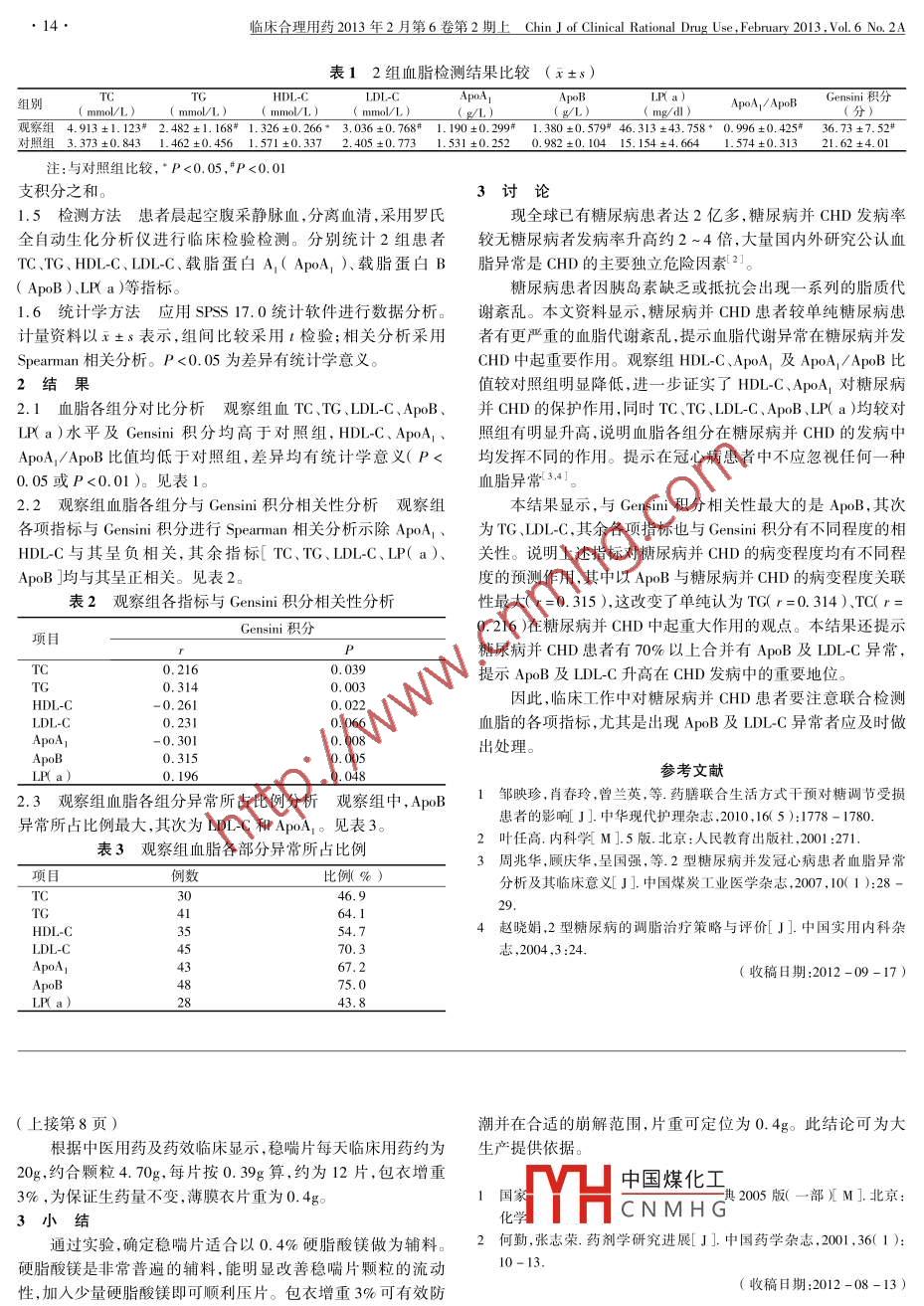 臨床合理用藥2013年2月第6卷第2期上 Chin J of Clinical Rational Drug Use, Februar2013,Vl.6No2A9 Soyseth V Statin use is associated with reduced mortality in COPD J J疾病診治指南(2007修訂版)J].中華結(jié)核和呼吸雜志,2007,30European Respiratory Journal, 2007, 29(2): 279-28310 Ishida w. Decrease in mortality rate of chronic obstructive pulmonary14章琳,楊渭臨,鄭華東,等.老年慢性阻塞性肺病穩(wěn)定期血漿ET-ldiseased COPD )with statin use: a population-based analNO水平與肺動(dòng)脈高壓的相關(guān)性J].山西醫(yī)科大學(xué)學(xué)報(bào),2011,42[J. Tohoku J Exp Med,2007,212(3):265-27(7):572-57411 Keddissi JI The use of statins and lung function in current and former 15 Ruperez M, Rodrigues-Diez R, Blanco-Colio LM, et al. HMG-CoA resmokers]. Chest,2007,132(6):1764-1771ductase inhibitors decrease angiotensin II-induced vascular fibrosis: role12王秋芬,廖玉華.歐洲心臟病協(xié)會(huì)2004年肺動(dòng)脈高壓診斷和治療f RhoA/ROCK and MAPK pathways[ J ]. Hypertension, 2007指南簡(jiǎn)介[J].臨床心血管病雜志,2005,21(7):385-386377-38313中華醫(yī)學(xué)會(huì)呼吸病學(xué)分會(huì)慢性阻塞性肺疾病學(xué)組.慢性阻塞性肺(收稿日期:2012-09-17)藥物檢測(cè)穩(wěn)喘片成型工藝研究于林怡,張志剛,蘇聰娟,黃占周【摘要】目的研究穩(wěn)喘片適宜壓片包衣工藝的制定。方法以休止角、片面光滑度、片子硬度脆碎度、包衣后增重及崩解時(shí)限為評(píng)價(jià)指標(biāo),篩選岀合適的壓片包衣工藝。結(jié)果0.4%硬脂酸鎂為輔料,直接壓片,包衣片增重3%。結(jié)論該穩(wěn)喘片成型工藝可為大生產(chǎn)提供可靠依據(jù)【關(guān)鍵詞】穩(wěn)喘片;壓片;包衣成型工藝;輔料;片重【中圖分類號(hào)】R94【文獻(xiàn)標(biāo)識(shí)碼】A【文章編號(hào)】1674-3296(2013)02A-0008-0穩(wěn)喘膠囊是由麻黃、白果、黃芩、連翹等十幾味中藥加工制表2休止角與片面光滑度比較成,具有平喘和緩解胸悶、咳嗽的功能,原工藝為湯劑,考慮患加入量(%)0.2者服用不方便、口感差,因此我院依據(jù)藥品性質(zhì)將其制為片劑休止角(度)38.23735.6本實(shí)驗(yàn)以休止角、片面光滑度、片子硬度脆碎度、包衣后增重及片面光滑度較粗糙較好光滑光滑崩解時(shí)限為考察目標(biāo),對(duì)穩(wěn)喘片的成型工藝進(jìn)行研究量硬度。分別取10片,放入硬度儀中測(cè)試。測(cè)量崩解時(shí)限:將1儀器設(shè)備及材料6片試藥放入崩解儀中測(cè)試,取6片全部溶解的時(shí)間。結(jié)果休止角測(cè)定儀(自制),梅特勒電子天平(萬(wàn)分之一),旋轉(zhuǎn)由表3可知,加入硬脂酸鎂后壓片硬度、崩解時(shí)限符合要求,所壓片機(jī)(上海天祥健臺(tái)制藥),多功能制丸·包衣機(jī)(重慶佳瑪以不必加入其他賦形劑,直接壓片,可節(jié)約成本減少工時(shí)。機(jī)械制造有限公司),PYC-A型片劑硬度儀(上海黃海藥檢儀表3硬脂酸鎂量相同情況下硬度與崩解時(shí)限比較器廠),崩解測(cè)定儀(天津大學(xué)無(wú)線電廠);材料:穩(wěn)喘片顆粒、序號(hào)顆粒量g)硬脂酸鎂量(g)硬度(kg)崩解時(shí)限(min)硬脂酸鎂3.2183.32實(shí)驗(yàn)方法210002.1不加任何輔料情況下直接以顆粒壓片,以休止角、片面光2.3包衣材料用量選擇包衣材料用量不同,增重不同,防潮滑度為考察項(xiàng)目休止角測(cè)定:將3只漏斗串聯(lián)并固定于水平效果也不同,用量越大,防潮效果越好,但會(huì)影響溶出,增加成放置的坐標(biāo)紙上1cm高度處,小心將藥粉沿漏斗倒入最上層本。故作以下實(shí)驗(yàn),取樣品1、2、3、4包衣分別增重1%、2%、的漏斗中,直至坐標(biāo)紙上藥粉圓錐體尖端接觸到為止。由坐標(biāo)3%、4%各60片,至于相對(duì)濕度92.5%、溫度37℃環(huán)境中,1紙測(cè)出圓錐底部的直徑(2R),計(jì)算出休止角(tg=H/R)。由3、5、7d后觀察吸濕量及崩解時(shí)限。由表4、5可知,3%、4%用表1可知,顆粒休止角大,流動(dòng)性不好,片面不光滑。所以添加量比1%、2%用量防潮效果好,3%、4%防潮效果差別不大,崩定量的硬脂酸鎂作為助流劑,加入量分別為0.2%、0.3%、解時(shí)限有所增加,為節(jié)約時(shí)間和成本,選取3%包衣增重量0.4%、0.5%、0.6%。由表2可知,加入硬脂酸鎂后流動(dòng)性得表4不同樣品吸濕量比較(%)到改善,加入量為0.4%后休止角較小、穩(wěn)定。且加入量為樣品序0.4%后片面光滑。故采用加入0.4%硬脂酸鎂作為輔料8.179.83表1休止角與片面光滑度比較3.18中國(guó)煤化工1.88休止角(度)38.538.739.638.939.4片面光滑度。較粗糙。較粗糙。較粗糙。較粗糙。較粗糙CNMHG比較(min)2硬度、崩解時(shí)限為片劑重要考察項(xiàng)目由于在制粒過(guò)程樣品序號(hào)1d中以淀粉漿進(jìn)行噴霧制粒,含有一定黏性,故采用直接壓片,測(cè)2021作者單位:050035石家莊市,石家莊以嶺醫(yī)藥股份有限公司制劑車間(下轉(zhuǎn)第14頁(yè))14臨床合理用藥2013年2月第6卷第2期上 Chin J of Clinical Rational Drug Use, Februar2013,Vl.6No2A表12組血脂檢測(cè)結(jié)果比較(x±s)組別ApoA,/ApobGensini積分mmol/L(mg/dI觀察組4.913±1.123*2.482±1.168*1.326±0.266·3.036±0.768#1.190±0.299#1.380±0.579#46.313±43.758·0.996±0.425#36.73±7.52#付照組3.37注:與對(duì)照組比較,P<0.05,“P<0.01支積分之和。3討論1.5檢測(cè)方法患者晨起空腹采靜脈血,分離血清,采用羅氏現(xiàn)全球已有糖尿病患者達(dá)2億多,糖尿病并CHD發(fā)病率全自動(dòng)生化分析儀進(jìn)行臨床