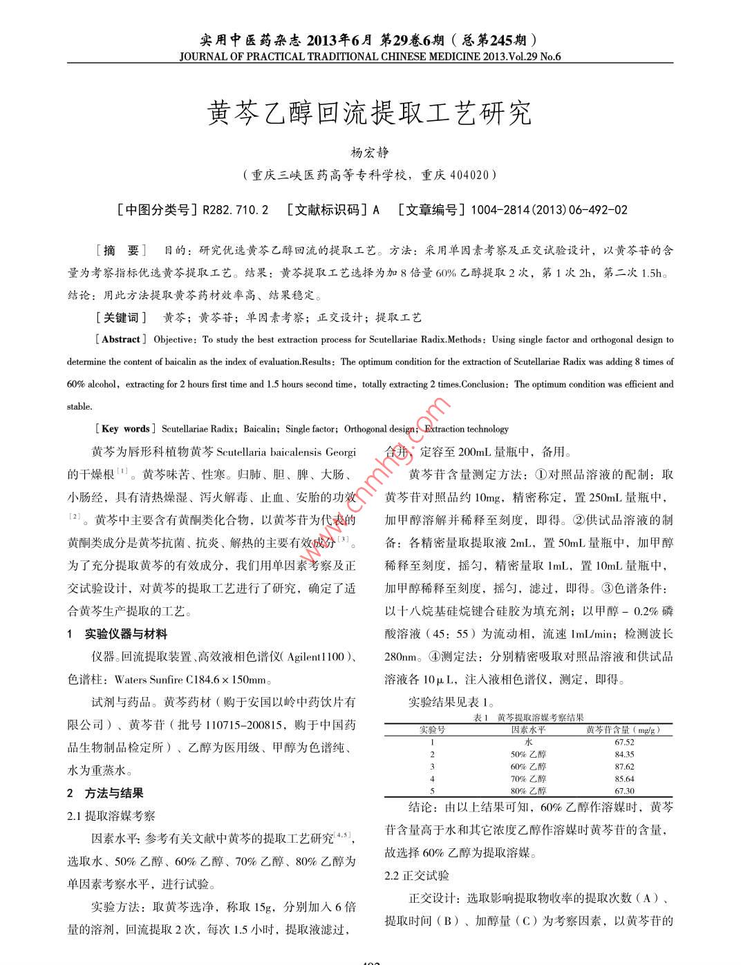 實用中醫(yī)藥雜志2013年6月第29卷6期(總第245期)JOURNAL OF PRACTICAL TRADITIONAL CHINESE MEDICINE 2013. VoL 29 No6黃芩乙醇回流提取工藝研究楊宏靜(重慶三峽醫(yī)藥高等??茖W校,重慶404020)[中圖分類號]R282.710.2[文獻標識碼]A[文章編號]1004-2814(2013)06-492-02[摘要]目的:研究優(yōu)選黃芩♂醇回流的提取工藝。方法:采用單因素考察及正交試驗設計,以黃芩苷的含量為考察指標優(yōu)選黃芩提取工藝。結果:黃芩提取工藝選擇為加8倍量σ%乙醇提取2次,第1次2h,第二次1.5h。結論:用此方法提取黃芩藥材效率高、結果穩(wěn)定。[關鍵詞]黃芩;黃芩苷;單因素考察;正交設計;提取工藝[Abstract]Objective: To study the best extraction process for Scutellariae Radix.Methods: Using single factor and orthogonal design todetermine the content of baicalin as the index of evaluation Results: The optimum condition for the extraction of Scutellariae Radix was adding 8 times of60% alcohol, extracting for 2 hours first time and 1.5 hours second time, totally extracting 2 times. Conclusion: The optimum condition was efficient andI Key words Scutellariae Radix; Baicalin; Single factor; Orthogonal design; Extraction technology黃芩為唇形科植物黃芩 Scutellaria baicalensis Georgi合并,定容至20mnL量瓶中,備用。的干燥根。黃芩味苦、性寒。歸肺、膽、脾、大腸、黃芩苷含量測定方法:①對照品溶液的配制:取小腸經,具有清熱燥濕、瀉火解毒、止血、安胎的功效黃芩苷對照品約10mg,精密稱定,置250mL量瓶中,2。黃芩中主要含有黃酮類化合物,以黃芩苷為代表的加甲醇溶解并稀釋至刻度,即得。②供試品溶液的制黃酮類成分是黃芩抗菌、抗炎、解熱的主要有效成分3。備:各精密量取提取液2mL,置50mL量瓶中,加甲醇為了充分提取黃芩的有效成分,我們用單因素考察及正稀釋至刻度,搖勻,精密量取1mL,置10mL量瓶中交試驗設計,對黃芩的提取工藝進行了研究,確定了適加甲醇稀釋至刻度,搖勻,濾過,即得。③色譜條件合黃芩生產提取的工藝以十八烷基硅烷鍵合硅膠為填充劑;以甲醇-0.2%磷1實驗儀器與材料酸溶液(45:55)為流動相,流速1mL/min;檢測波長儀器回流提取裝置、高效液相色譜儀( Agilent 1100)、280m。④測定法:分別精密吸取對照品溶液和供試品色譜柱: Waters Sunfire184.6×150mm。溶液各10μL,注入液相色譜儀,測定,即得。試劑與藥品。黃芩藥材(購于安國以嶺中藥飲片有實驗結果見表1。限公司)、黃芩苷(批號110715-200815,購于中國藥表1黃芩提取溶媒考察結果實驗號黃芩苷含量品生物制品檢定所)、乙醇為醫(yī)用級、甲醇為色譜純、水675250%乙醇水為重蒸水。60%乙醇0%乙醇2方法與結果結論:由以上結果可知,60%乙醇作溶媒時,黃芩2.1提取溶媒考察因素水平參考有關文獻中黃芩的提取工藝研究*3,苷含量高于水和其它濃度乙醇作溶媒時黃芩苷的含量,選取水、50%乙醇、60%乙醇、70%乙醇、80%乙醇為故選擇60%乙醇為提取溶媒。單因素考察水平,進行試驗。22正交試驗實驗方法:取黃芩選凈,稱取15g,分別加入6倍正交設計:選取影響提取物收率的提取次數(A)量的溶劑,回流提取2次,每次1.5小時,提取液濾過提取時間(B)、加醇量(C)為考察因素,以黃芩苷的實用中醫(yī)藥雜志2013年6月第29卷6期(總第245期)JOURNAL OF PRACTICAL TRADITIONAL CHINESE MEDICINE 2013. VoL 29 No6含量為指標,選取如下水平進行試驗,見表2。定的工藝為AB32C2,即加8倍量60%乙醇提取2次,表2因素水平表第1次2h,第2次1.5h。水平提取次數提取時間加醇量(相當于藥材倍數23驗證試驗取藥材,凈選干燥,粗碎,按處方配比,稱取黃芩15g,以60%乙醇為提取溶媒,按最佳工藝A3B3C3組實驗方法:取藥材,凈選干燥,粗碎,按處方配比,合條件和選定工藝A2B(3,2)C2的組合條件進行重復稱取島根15.以6%乙醉為提取溶蝶在平行操作的驗證對比實驗,測定黃芩苷的含量,測定結果見表5條件下,按I9(3)4正交表,回流提取,提取液合并,濾過,減壓回收乙醇,適量濃縮,轉移至1000mL量瓶中,點這里,物世A, B,C3110.07放冷至室溫,加60%乙醇稀釋至刻度,搖勻,備用。A, B, C307,72A, B,C3106.68黃芩苷的含量測定方法:同上。4A2B(3.2)C2I0408102.96A2B(3.2)C210264實驗結果見表3和表4。6A2B(3.2)C2表3黃芩正交實驗表列號由上表可見,以黃芩苷的含量為考察指標,最佳工實驗號4(次)B(h)C(倍)D(空白)Yi(mgg)藝ABC和選定工藝AB(3,2C2的差距均不大;但選定12331223工藝省工節(jié)能,故選定AB(3,2C2為提取工藝,即藥材加8倍量60%乙醇提取提取2次,第1次2h,第2次1.5h。101.693討論106.54102,58黃芩中所含黃酮類成分為其主要有效成分,此類成lj2268426616263.8626669分易溶于乙醇。通過單因素提取溶媒的考察,得出此類296.7928175276.302824031.222869429469285.76成分在60%乙醇中溶解度較大。用正交實驗設計,優(yōu)選l251456.3970884.1569622.1071123.5688084.3079383.0676341697974976C574161了影響提取物收率的3個因素,得出最佳提取工藝,結Rj=32+i2+112363985823258.72328059923253209合實際生產,對各影響因素進行了優(yōu)化,最終確定了黃Si=Ri/3芩的提取工藝為加8倍量60%乙醇提取2次,第1次提表4方差分析方差來源離均差平方和自由度均方F值取2h,第2次提取1.5h。135791678.96ABCD[參考文獻2.321]國家藥典委員會.中華人民共和國藥典(一部)注;Fo0s(2,2)=1900,Fo01(2,2)=9900(2010版)[M].北京:中國醫(yī)藥科技出版社,結果:由表3可知,3個因素的影響大小順序為提2010:283取次數大于加醇量大于提取時間。最佳工藝為A3BC3,即加10倍量60%乙醇提取3次,每次2h。表4中方[2]高學敏.中藥學[M].北京:人民衛(wèi)生出