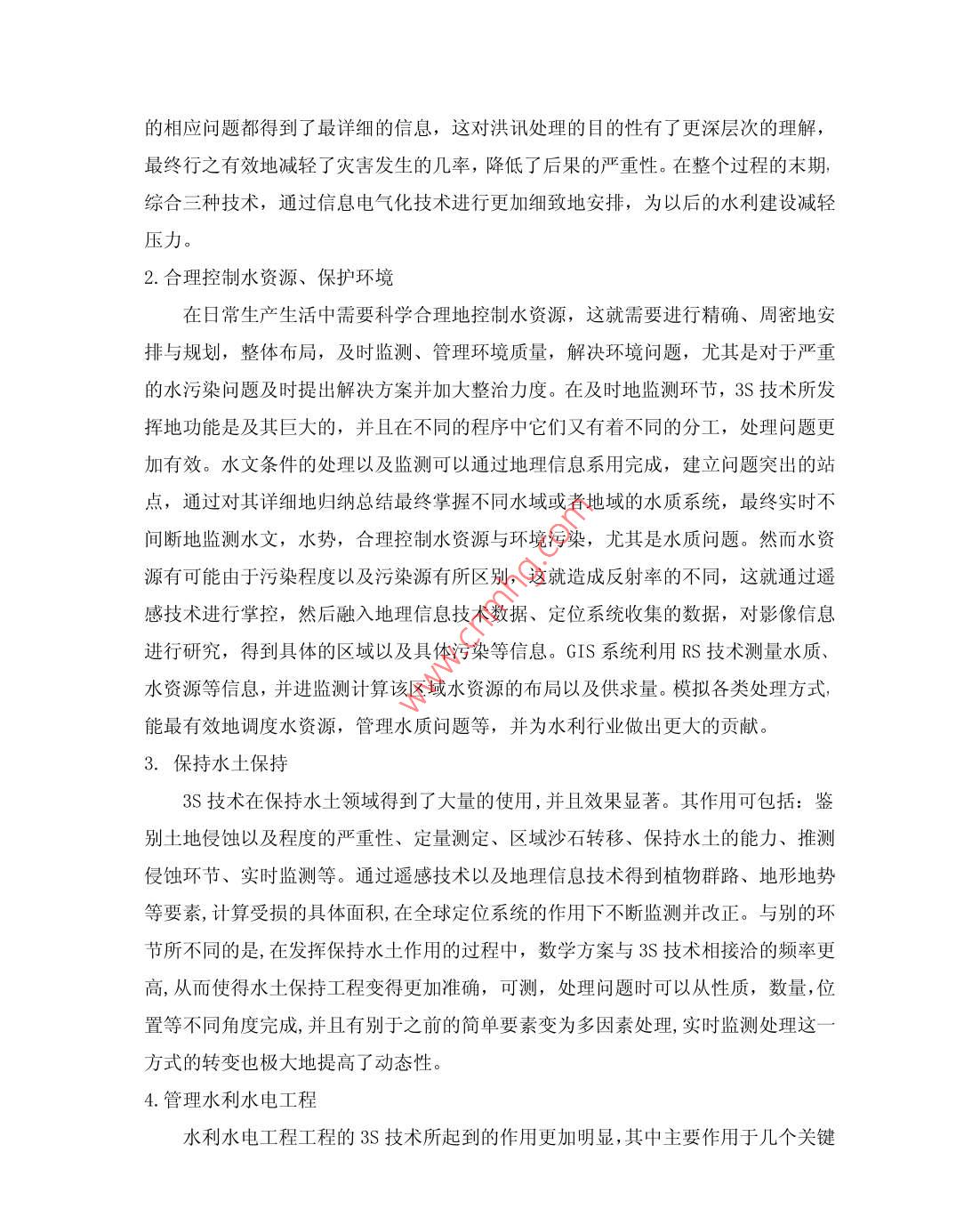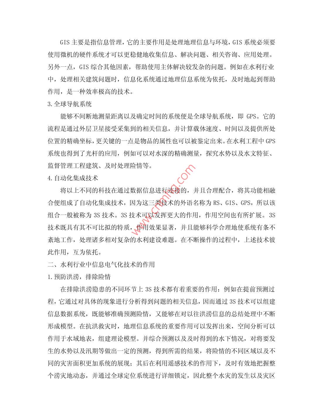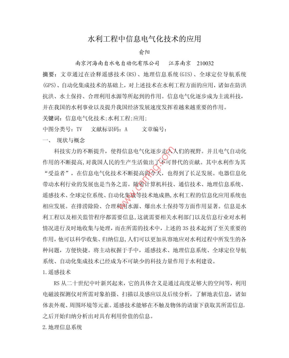 水利工程中信息電氣化技術(shù)的應(yīng)用俞陽(yáng)南京河海南自水電自動(dòng)化有限公司江蘇 南京210032摘要:文章通過(guò)在詮釋遙感技術(shù)(RS)、地理信息系統(tǒng)(GIS)、全球定位導(dǎo)航系統(tǒng)(GPS)、自動(dòng)化集成技術(shù)的基礎(chǔ)上,對(duì)上述技術(shù)在水利工程方面的應(yīng)用,諸如在防洪抗洪、水土保持、合理利用水源等所起到的作用。信息電氣化逐步成為主流科技,并在我國(guó)的水利事業(yè)以及提升我國(guó)經(jīng)濟(jì)發(fā)展速度發(fā)揮著越來(lái)越重要的作用。關(guān)鍵詞:信息電氣化技術(shù);水利工程;應(yīng)用;中圖分類號(hào): TV文獻(xiàn)標(biāo)識(shí)碼: A文 章編號(hào):-一、現(xiàn)狀與概念科技實(shí)力的不斷提升,使得信息電氣化逐步走入人們的視野。并且電氣自動(dòng)化作用的不斷提高,對(duì)我國(guó)人民的生產(chǎn)生活做出了不可替代的貢獻(xiàn)。其中水利作為其“受益者”,在信息電氣化技術(shù)不斷提高的今天,也得到了長(zhǎng)足發(fā)展。電器信息化帶動(dòng)水利行業(yè)的發(fā)展也是當(dāng)務(wù)之需。隨著計(jì)算機(jī)科技、通信技術(shù)、地理信息系統(tǒng)、遙感技術(shù)、全球定位系統(tǒng)、自動(dòng)化集成等技術(shù)地成熟,水利工程的信息化應(yīng)用系統(tǒng)也相應(yīng)發(fā)展。在排澇除險(xiǎn)、合理利用水源、爆出水土保持等方面作用顯著。信息是水利工程以及相關(guān)監(jiān)管程序都需要信息,這就需要相關(guān)水利部門以及信息行業(yè)對(duì)水利情況進(jìn)行及時(shí)地收集與處理,而在所需的技術(shù)中,上述的3S技術(shù)起到了至關(guān)重要的作用,他可以科學(xué)收集、歸納信息,人們可以更加從容地應(yīng)對(duì)水利過(guò)程中所發(fā)生的各種問(wèn)題,方便快捷。將主動(dòng)權(quán)握于手中,遙感技術(shù)、地理信息系統(tǒng)、全球定位導(dǎo)航系統(tǒng)、自動(dòng)化集成技術(shù)已經(jīng)成為不可缺少的科技力量作用于水利建設(shè)。1.遙感技術(shù)RS從二十世紀(jì)中葉新興起來(lái),它的具體含義是通過(guò)高度足夠大的空間等,利用電磁波探測(cè)儀對(duì)所需對(duì)象拍攝、掃描以及感應(yīng)以及后續(xù)分析,了解地表信息,諸如體表外觀、周圍環(huán)境等元素。遙感技術(shù)能夠在不觸及物體的請(qǐng)康下獲取其所需信息,之后開(kāi)始?xì)w納分析出對(duì)具有利用價(jià)值的信息。2.地理信息系統(tǒng)GIS主要是指信息管理,它的主要作用是處理地理信息與環(huán)境, GIS系統(tǒng)必須要使用微機(jī)的硬件系統(tǒng)才可以更穩(wěn)健地收集信息、解決問(wèn)題、相關(guān)咨詢、應(yīng)用處理。另外一點(diǎn),GIS綜合其他因素,幫助使用主體解決較發(fā)雜的問(wèn)題。例如在水利行業(yè)中,處理相關(guān)建筑問(wèn)題時(shí),信息化系統(tǒng)通過(guò)地理信息系統(tǒng)為依托,及時(shí)地起到幫助作用,是一種效率極高的技術(shù)。3.全球?qū)Ш较到y(tǒng)能夠不間斷地測(cè)量距離以及確定時(shí)間的系統(tǒng)便是全球?qū)Ш较到y(tǒng),即GPS。它的流程是通過(guò)外層衛(wèi)星接受采集到的相關(guān)信息,并計(jì)算載體速度、時(shí)間以及提供所處位置的精確坐標(biāo),更關(guān)鍵的一點(diǎn)是物品的屬性也可以被鑒定出來(lái)。在水利工程中GPS系統(tǒng)也得到了光桿的應(yīng)用,例如可以對(duì)水深的精確測(cè)量,探究水勢(shì)以及水文特征、監(jiān)督管理工程建筑、及時(shí)處理險(xiǎn)情等。4.自動(dòng)化集成技術(shù)將以上不同的科技在通過(guò)數(shù)據(jù)信息進(jìn)行連接的,并且合理配合,將其功能相融合便組成了自動(dòng)化集成技術(shù),因?yàn)檫@三類技術(shù)的外語(yǔ)名稱為RS、GIS、 GPS, 所以該組合- -般被稱為3S技術(shù)。3S技術(shù)可以發(fā)揮更大的作用,作用空間也有所擴(kuò)展。3S技術(shù)既具有其不可比擬的特質(zhì),作用效果顯著,并且能夠科學(xué)合理地使系統(tǒng)有條不.紊地工作,處理諸多相對(duì)復(fù)雜的水利建設(shè)難題。在不斷操作的過(guò)程中,.上述技術(shù)彼此作用,互為依托。二、水利行業(yè)中信息電氣化技術(shù)的作用1.預(yù)防洪澇,排除險(xiǎn)情在排除洪澇隱患的不同環(huán)節(jié)上3S技術(shù)都有著重要的作用:例如在提前預(yù)測(cè)過(guò)程,它通過(guò)對(duì)具體的現(xiàn)象進(jìn)行分析得到問(wèn)題的相關(guān)信息,因而通過(guò)3S技術(shù)可以組建信息數(shù)據(jù)系統(tǒng),既能夠準(zhǔn)確預(yù)測(cè)險(xiǎn)情,又能夠在對(duì)以往洪澇信息的總結(jié)處理中不斷形成模型。在抗洪救災(zāi)時(shí),地理信息系統(tǒng)的重要作用可以發(fā)揮出來(lái),空間分析可以作用于水域地表,組建理論模型。并綜合預(yù)測(cè)以及及時(shí)得到的水下情況,對(duì)將要發(fā)生的水勢(shì)以及汛期等做出一定的預(yù)測(cè),得到所需的結(jié)果,將險(xiǎn)情的不同區(qū)域以及不同的災(zāi)害面積更加系統(tǒng)的展現(xiàn);其后在利用遙感技術(shù)的作用下,及時(shí)有效地把握整個(gè)澇災(zāi)地動(dòng)態(tài),并通過(guò)全球定位系統(tǒng)進(jìn)行詳細(xì)鎖定,因此整個(gè)水災(zāi)的發(fā)生以及災(zāi)區(qū)的相
