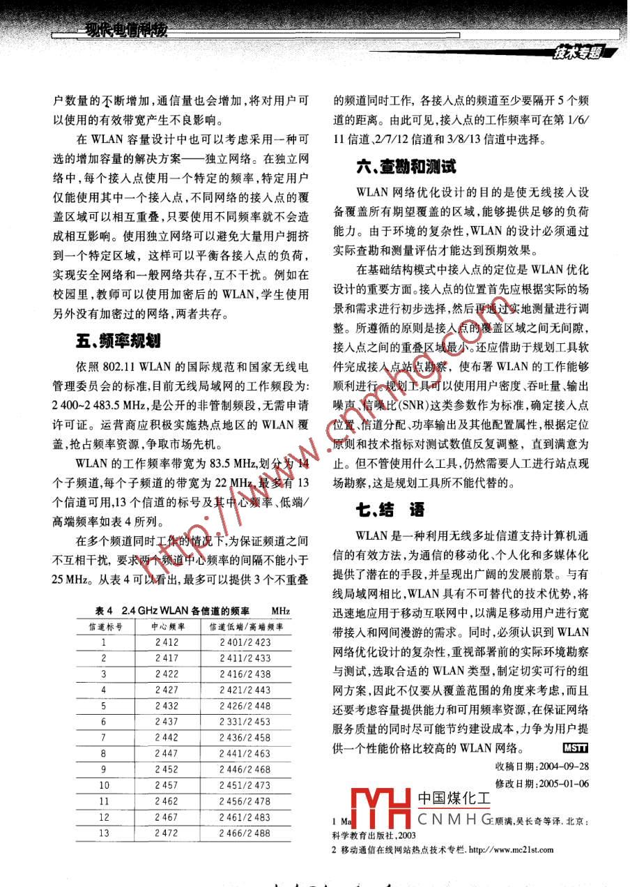 NOD洲IEIETEHAOO聽E0A防EeaturesWLAN網(wǎng)絡(luò)優(yōu)化設(shè)計李軍北京郵電大學(xué)電子工程學(xué)院博士研究生陳虎諾基亞北京有限公司網(wǎng)絡(luò)部業(yè)務(wù)經(jīng)理◎摘"要”與有線局域網(wǎng)相比,WLAN的技術(shù)優(yōu)勢是可以在熱點地區(qū)為用戶提供無線寬帶業(yè)務(wù)。在WLAN網(wǎng)絡(luò)優(yōu)化設(shè)計方面值得探討和研究的問題很多,這里主要針對WLAN的類型選擇、無線組網(wǎng)、覆蓋設(shè)計、容量設(shè)計頻率規(guī)劃、查勘測試等方面進行論述。◎關(guān)鍵調(diào)一無線局域網(wǎng),接入點,網(wǎng)絡(luò)設(shè)計,優(yōu)化設(shè)計,組網(wǎng)方案,頻率規(guī)劃Abstract: Compared with LAN, WLAN owns obvious technical advantages such as providing wireles broadband set-.vice in cental areas. Many isues in WLAN network optimization design are worth studying and researching. This paperdiscuses and amalyses WLAN slection, wireles networking, covernge desin, capacity desig, frequency planning, andnetwork testing in detail.無線局域網(wǎng)(WLAN)是近年來計算機網(wǎng)絡(luò)與無線通信技術(shù)相結(jié)合的產(chǎn)物,它采用無線傳送方式支持計算機之間的通信,為移動或半移動的用戶提供無線寬帶接入服務(wù)。在大多數(shù)運營商的市場運作中,一般將WLAN部署在局部熱點地區(qū),為移動高端用戶提供高速數(shù)據(jù)的無線接入,滿足移動辦公、信息搜索、比網(wǎng)娛樂等需求。與傳統(tǒng)有線局域網(wǎng)相比,WLAN具有安裝便捷、移動性好、使用靈活、傳輸速率高、經(jīng)濟節(jié)約等技術(shù)優(yōu)勢。與此同時,如何優(yōu)化設(shè)計WLAN網(wǎng)絡(luò)為業(yè)界提出了新的課題。本文主要針對WLAN的類型選擇、無線組網(wǎng)、覆蓋區(qū)域設(shè)計、容量設(shè)計、頻率規(guī)劃、查勘測試等方面進行詳細論述。-.合理選擇WLAN類型WLAN無線網(wǎng)絡(luò)包括無線網(wǎng)卡和接人點(AP)兩部分。接入點作為橋接的無線基站,一方面通過無線傳輸媒質(zhì)連接無線網(wǎng)卡,另一方面連接有線局域網(wǎng),無線終端通過接人點與有線局域網(wǎng)相連。WLAN發(fā)送和接收信息可以采用紅外系統(tǒng)或射頻系統(tǒng)?;谏漕l方式的WLAN利用無線電波作為傳輸媒質(zhì),因具有傳輸距離遠、可穿透非金屬物體、適合室內(nèi)外傳播等優(yōu)點而被大量采用?;诩t外方式的WLAN由于受到紅外線特性的限制,只能用于室內(nèi)短距離傳播,且傳輸速率較低,僅能應(yīng)用在傳輸敏感數(shù)據(jù)的特殊場合,實際應(yīng)用很少。射頻方式的WLAN主要通過跳頻擴頻(HSS)和直接序列擴頻(SSS)兩種方式對無線信號進行擴展,兩者之間最重要的區(qū)別在于傳輸帶寬不同:前者的使用帶寬僅為1MHz,最高傳輸速率僅能達到3 Mbiv/s;后者則可在22 MHz的頻率上實現(xiàn)5.5 Mbi/s和11 Mbiv5<(EEE 802.1 Ib標準)的高速數(shù)據(jù)傳輸。在大多數(shù)WLAN的設(shè)計中,最理想的選擇是采用射步中國煤化工廣展方式。二. WLAN組網(wǎng)方案YHCNMHG規(guī)劃WLAN的關(guān)鍵在于無線網(wǎng)絡(luò)結(jié)構(gòu)的優(yōu)化設(shè)計,它直接關(guān)系到WLAN建成使用后的網(wǎng)絡(luò)質(zhì)量37,現(xiàn)長電利技,技術(shù)專題和投資效益。目前,在WLAN無線組網(wǎng)方案中廣泛采用載波監(jiān)聽多路訪問/沖突避免(CSMA/CA)機采用點對點和基礎(chǔ)結(jié)構(gòu)兩種模式。這兩種模式各有制,試圖在發(fā)送信息過程中避免發(fā)生沖突。在點對其應(yīng)用場合和優(yōu)缺點,目的都是在無線信道中為用點模式WLAN設(shè)計中,應(yīng)主要考慮各個無線工作站戶提供與有線局域網(wǎng)相近的數(shù)據(jù)傳輸速率。的位置要恰當(dāng)、距離要合適,盡可能避免隱藏節(jié)點1.點對點模式的問題,以使每個無線工作站都能夠與其他工作站點對點模式又稱對等網(wǎng)絡(luò)或獨立基本服務(wù)集之間進行通信。圖1可以很直觀地說明隱藏節(jié)點問(IBSS)。采用這種模式時,無線工作站之間可自行組題:工作站A.B、C都在接人點的覆蓋范圍之內(nèi),但網(wǎng)、直接通信而不需要經(jīng)過接入點轉(zhuǎn)接。該組網(wǎng)方工作站A不在工作站B、C的通信范圍之內(nèi),因此可式適合在尚未建設(shè)有線網(wǎng)絡(luò)或根本不需要有線網(wǎng)能造成3個工作站無法實現(xiàn)信息的接收和發(fā)送,所絡(luò)的地方實現(xiàn)簡單快捷地組網(wǎng),以滿足暫時需要的.以工作站A必須再靠近-定距離才能相互通信。通信服務(wù)。但無線工作站只能相互通信,不能對大型外部網(wǎng)絡(luò)或Internet進行訪問。工作站A2.基礎(chǔ)結(jié)構(gòu)模式基礎(chǔ)結(jié)構(gòu)模式也稱基本服務(wù)集(BSS),這種網(wǎng)絡(luò)由工作站和接人點組成,各無線工作站之間通過-個或多個接人點來實現(xiàn)通信。僅使用一個接入點的無線網(wǎng)絡(luò)稱為基本服務(wù)集,兩個或多個基本服務(wù)接入點工作站B工作站C集可以連接組成擴展服務(wù)集(ESS)。當(dāng)采用擴展服務(wù)集工作模式即使用多個接人點時,就可以覆蓋某個區(qū)域,類似移動通信系統(tǒng)中的蜂窩小區(qū),組成蜂窩結(jié)構(gòu)時它的覆蓋范圍能夠很好地支持漫游和服圖1隱藏節(jié)點的問題圖務(wù)區(qū)之間的切換。在工程設(shè)計中采用哪種工作模式取決于組網(wǎng)2.基礎(chǔ)結(jié)構(g