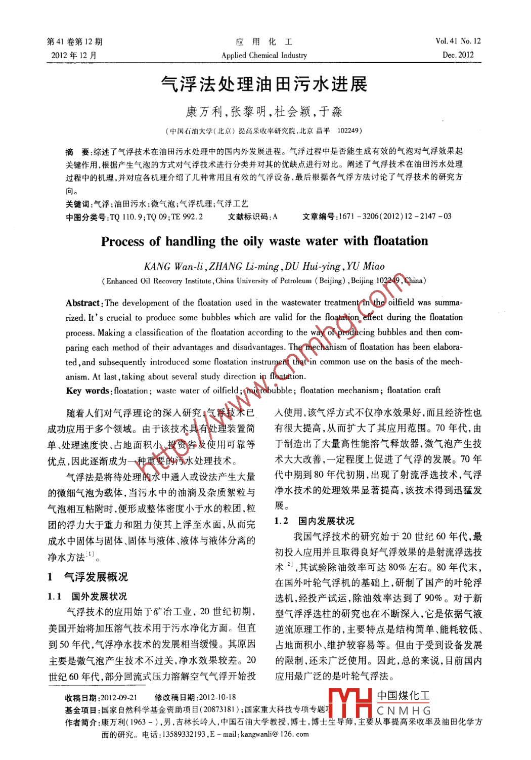 第41卷第12期應(yīng)用化工Vol. 41 No. 122012年12月Applied Chemical IndustryDec. 2012氣浮法處理油田污水進(jìn)展康萬利,張黎明,杜會(huì)穎,于淼(中國(guó)石油大學(xué)(北京)提高采收率研究院.北京昌平102249)摘要:綜述了氣浮技術(shù)在油田污水處理中的國(guó)內(nèi)外發(fā)展進(jìn)程。氣浮過程中是否能生成有效的氣泡對(duì)氣浮效果起關(guān)鍵作用,根據(jù)產(chǎn)生氣泡的方式對(duì)氣浮技術(shù)進(jìn)行分類并對(duì)其的優(yōu)缺點(diǎn)進(jìn)行對(duì)比。闡述了氣浮技術(shù)在油田污水處理過程中的機(jī)理,并對(duì)應(yīng)各機(jī)理介紹了幾種常用且有效的氣浮設(shè)備,最后根據(jù)各氣浮方法討論了氣浮技術(shù)的研究方向關(guān)鍵詞:氣浮;油田污水;微氣泡;氣浮機(jī)理;氣浮工藝中圖分類號(hào):TQ 110. 9;TQ 09;TE 992.2文獻(xiàn)標(biāo)識(shí)碼:A文章編號(hào):1671 -3206(2012)12 -2147 -03.Process of handling the oily waste water with floatationKANG Wan-li , ZHANG Li-ming ,DU Hui-ying , YU Miao( Enhanced 0il Recovery Institute , China University of Petroleum ( Beijing) , Beijing 102249 , China)Abstract : The development of the floatation used in the wastewater treatment in the oilfield was summa-rized. It's crucial to produce some bubbles which are valid for the floatation effect during the floatationprocess. Making a classification of the floatation according to the way of producing bubbles and then com-paring each method of their advantages and disadvantages. The mechanism of floatation has been elabora-ted , and subsequently introduced some floatation instrument that in common use on the basis of the mech-anism. At last , taking about several study direction in floatation.Key words : floatation; waste water of oilfield ; microbubble; floatation mechanism ; floatation craft隨著人們對(duì)氣浮理論的深入研究,氣浮技術(shù)已人使用,該氣浮方式不僅凈水效果好,而且經(jīng)濟(jì)性也成功應(yīng)用于多個(gè)領(lǐng)域。由于該技術(shù)具有處理裝置簡(jiǎn)有很大提高,從而擴(kuò)大了其應(yīng)用范圍。70 年代,由單、處理速度快、占地面積小、投資省及使用可靠等于制造出了大量高性能溶氣釋放器,微氣泡產(chǎn)生技優(yōu)點(diǎn),因此逐漸成為-.種重要的污水處理技術(shù)。術(shù)大大改善,-定程度上促進(jìn)了氣浮的發(fā)展。70年.氣浮法是將待處理的水中通人或設(shè)法產(chǎn)生大量代中期到80年代初期,出現(xiàn)了射流浮選技術(shù),氣浮的微細(xì)氣泡為載體,當(dāng)污水中的油滴及雜質(zhì)絮粒與.凈水技術(shù)的處理效果顯著提高,該技術(shù)得到迅猛發(fā)氣泡相互粘附時(shí),便形成整體密度小于水的粒團(tuán),粒展。團(tuán)的浮力大于重力和阻力使其上浮至水面,從而完1.2國(guó)內(nèi) 發(fā)展?fàn)顩r成水中固體與固體、固體與液體、液體與液體分離的我國(guó)氣浮技術(shù)的研究始于20世紀(jì)60年代,最初投人應(yīng)用并且取得良好氣浮效果的是射流浮選技凈水方法。術(shù)2,其試驗(yàn)除油效率可達(dá)80%左右。80年代末,1氣浮發(fā)展概況在國(guó)外葉輪氣浮機(jī)的基礎(chǔ)上,研制了國(guó)產(chǎn)的葉輪浮1.1國(guó)外 發(fā)展?fàn)顩r選機(jī),經(jīng)投產(chǎn)試運(yùn),除油效率達(dá)到了90%。對(duì)于新氣浮技術(shù)的應(yīng)用始于礦冶工業(yè),20世紀(jì)初期,型氣浮浮選柱的研究也在不斷深人,它是依據(jù)氣液美國(guó)開始將加壓溶氣技術(shù)用于污水凈化方面。但直逆流原理工作的,主要特點(diǎn)是結(jié)構(gòu)簡(jiǎn)單、能耗較低、到50年代,氣浮凈水技術(shù)的發(fā)展相當(dāng)緩慢。其原因占地面積小、維護(hù)較容易等。但由于受到設(shè)備發(fā)展主要是微氣泡產(chǎn)生技術(shù)不過關(guān),凈水效果較差。20的限制,還未廣泛使用。因此,總的來說,目前國(guó)內(nèi)世紀(jì)60年代,部分回流式壓力溶解空氣氣浮開始投應(yīng)用最廣泛的是葉輪氣浮法。收稿日期:2012-09-21修改稿日期:2012-10-18中國(guó)煤化工基金項(xiàng)目:國(guó)家自然科學(xué)基金資助項(xiàng)目(20873181);國(guó)家重大科技專項(xiàng)專題工MHCNMHG作者簡(jiǎn)介:康萬利(1963-),男,吉林長(zhǎng)嶺人,中國(guó)石油大學(xué)教授,博士,博士生導(dǎo)師,主要從事提高采收率及油田化學(xué)方面的研究。電話: 13589332193 ,E - mail: kangwanli@ 126. com應(yīng)用化工第41卷2氣浮理論的發(fā)展或設(shè)法使水中產(chǎn)生氣泡,使污水中粒徑為0.25 ~根據(jù)微 氣泡產(chǎn)生的方式,常見的氣浮凈水技術(shù)25 μm的乳化油和分散在水中的懸浮顆粒粘附在氣主要可分為3類'):溶氣氣浮法(DAF)、散氣氣浮泡上,隨氣泡- -起上浮到水面并加以回收,從而達(dá)到法(CAF)、電解氣浮法(EAF)。此外,還有化學(xué)氣浮從含油污水去除油和懸浮物的目的01 ,但是,有時(shí)法以及其他氣浮凈水技術(shù)。要根據(jù)出水水質(zhì)的情況加入浮選劑或混凝劑,以便溶氣氣浮法是在一定壓力下將空氣通人水中使能使更多的氣泡粘附更多的油滴或懸浮顆粒,最大之溶解并達(dá)到飽和狀態(tài).然后再使廢水壓力突然降程度的提高除油率。低,這時(shí)溶解于水中的空氣便以微氣泡的形式從水出水水質(zhì)對(duì)氣浮效果至關(guān)重要,要想得到好的中釋放出來,以進(jìn)行氣浮廢水處理。主要包括加壓氣浮效果.就必須認(rèn)清氣浮過程,全面分析能夠引起溶