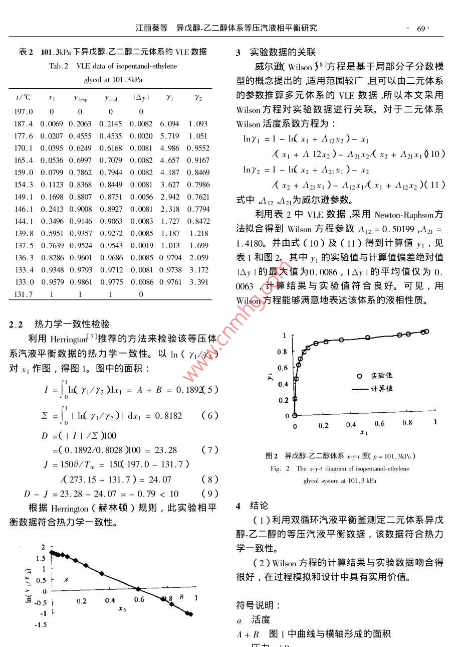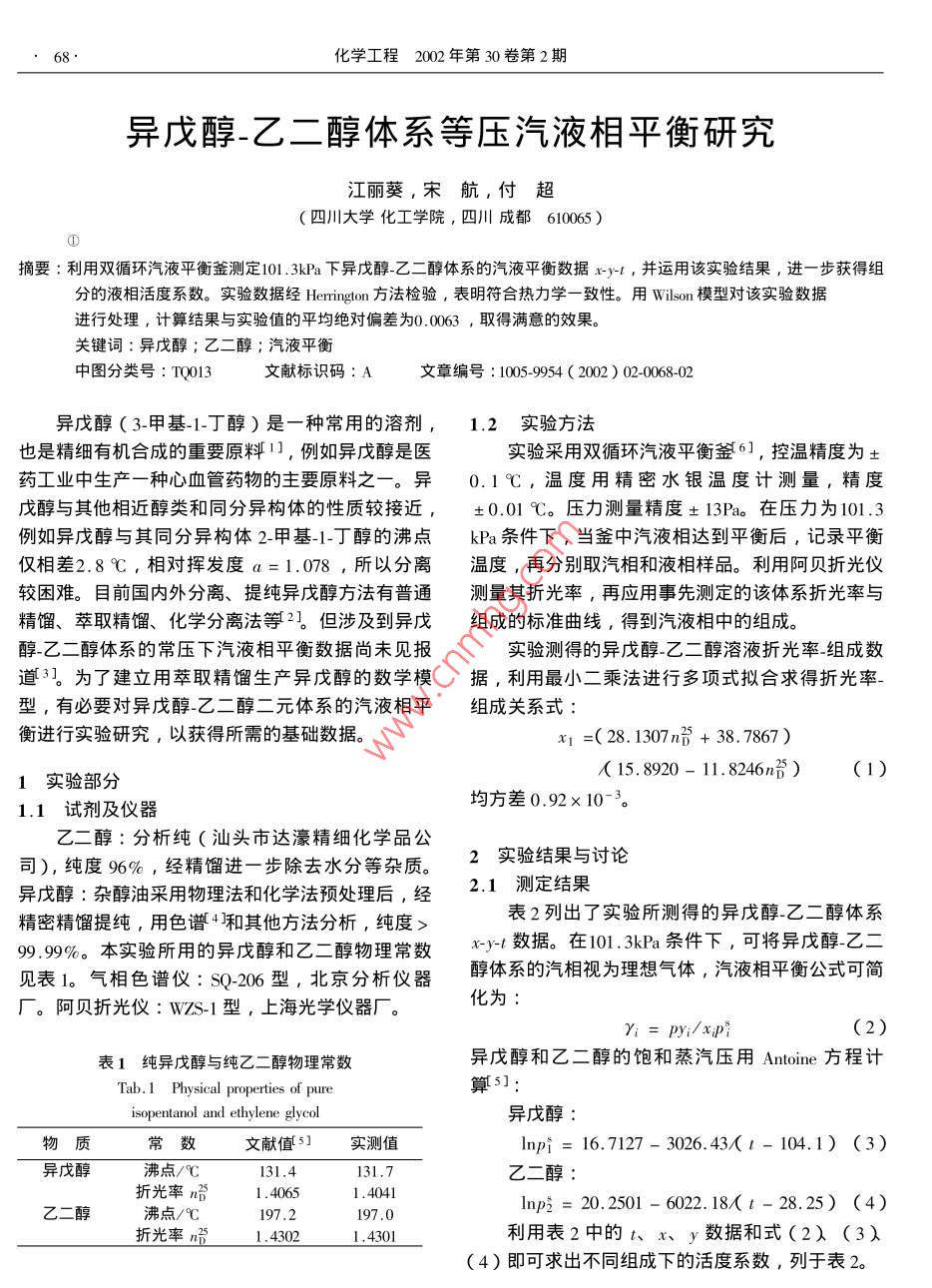 異戊醇-乙二醇體系等壓汽液相平衡研究
