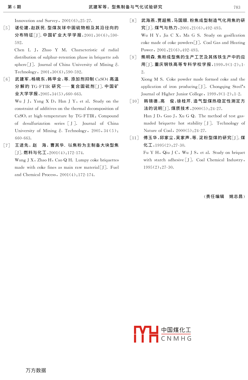 第34卷第6期中國礦業(yè)大學學報Vol 34 No 62005年11月Journal of China University of Mining & TechnologOV文章編號:1000-1964(2005)06-0779-05型焦制備與氣化試驗研究武建軍,韓甲業(yè),諶天兵,應瑩,李飛明(中國礦業(yè)大學化工學院,江蘇徐州221008)摘要:以焦粉為原料,添加一種有機-無機復合黏結劑,采用冷壓成型的方法,研究開發(fā)出了冷強度≥70kgf/球,熱強度≥30kgf/球,灰熔點大于1500C的高質(zhì)量氣化型焦通過在移動床氣化爐的造氣實驗表明,該氣化型焦完全符合工業(yè)化造氣用煤要求,可替代焦炭作為生產(chǎn)半水煤氣的原料.關鍵詞:焦粉;氣化型焦;冷壓成型;氣化爐中圖分類號:TQ523.4文獻標識碼:AStudy of Formed Coke Production and Gasification ExperimentWU Jian-jun, hAn Jia-ye, CHEN Tian-bing, YING Ying, LI Fei-ming(School of Chemical Engineering and Technologyhina University of Mining & Technology, Xuzhou, Jiangsu 221008, ChinaAbstract: The major objective of this study was to explore the use of coke powder as main materiaof producing formed coke which is formed under a certain pressure at room temperature added withan organic-inorganic multiple binder. The result show that the ashy melting point of the formedcoke is above 1 500C and its cold strength over 70 kg as well as its thermal strength also surpasseskg. It has been proved that the formed coke is qualified to be used as industrial gasification coalbed gasify furnaceKey words: coke powder; gasification formed coke; cold briquetting; gasify furnace焦粉是冶金、化工、電石等生產(chǎn)企業(yè)將工業(yè)焦害人身健康③.焦粉氣化型焦工藝的開發(fā)則可解決炭破碎時產(chǎn)生的一種副產(chǎn)物,因粒度小,不符合生造氣用塊煤或塊焦供不應求和焦粉大量積壓的矛產(chǎn)工藝要求而被廢棄.據(jù)調(diào)查,焦化廠通常焦粉盾,使制出的型焦達到高強防水,在氣化爐的高溫、產(chǎn)率約為5%.然而,今年由于煉焦煤經(jīng)常被人為強制通風、快速反應、料層移動條件下能夠使的混雜,配煤質(zhì)量下降,因而許多焦化廠焦粉的實用6.用焦粉生產(chǎn)氣化型焦,提高了焦粉的經(jīng)濟附際產(chǎn)率高達7%~8%2.目前我國大多數(shù)用焦企加值,是焦粉加工利用的一條新的技術途徑.本業(yè)因沒有找到解決焦粉成型的有效辦法,廢棄焦粉文介紹以焦粉為原料,添加一種有機-無機復合黏只能當作低級燃料廉價處理.工業(yè)廢棄焦粉不能再結劑,采用冷壓成型的方法生產(chǎn)出了冷、熱強度利用,這不僅造成了大量能源浪費,生產(chǎn)成本上升,高,熱穩(wěn)定性好的氣化型焦.在山西焦化有限公司經(jīng)濟效益下降,更為重要的是廢棄焦粉堆積露天,的諧氣嶠結里表明,該氣化型焦完全符風吹日曬,四處飛揚,造成對環(huán)境嚴重的粉塵污染中國煤化工它來替代焦炭作為生產(chǎn)直接影響到生產(chǎn)廠區(qū)及周圍的工作和生活環(huán)境,危RYCNMHG收稿日期:基金項P影業(yè)大學科技基金項目(H949作者簡3-),男,河南省鄭州市人,副教授,博士,從事型煤、型焦和固硫方面的研究780中國礦業(yè)大學學報第34卷原料制備及工藝方案成型水分:10%~14%型煤干重:(30±1)g/個1原料制備干燥條件:105C(2h);焦粉,破碎至3mm以下;成型溫度:室溫;風化煤,粉碎至177m以下;摻混時間:10~15min黏土,粉碎至125gm以下2.2黏結劑對型焦質(zhì)量的影響實驗用粉分析見表1型煤的熱穩(wěn)定性是指型煤在高溫燃燒或氣化表1試驗用粉工業(yè)分析過程中對熱的耐受程度,即型煤在高溫作用下保持Table 1 Proximate anal ysis of coke powder原來形狀的性質(zhì)0.型焦的熱穩(wěn)定性是影響型焦名稱造氣效果的關鍵因素,而黏結劑在粉焦成型的過程83.32中起著非常重要的作用,不同的黏結劑對同一種原2工藝方案料煤具有不同的黏結效果,同一種黏結劑的不同添粉焦成型工藝見圖1加量對同一種原料煤也具有不同的黏結效果.基于□匾四【四這個理,同冶粉,通過使用不同的粘結涼干叫澤翩定溶解律,為最終確定氣化型焦生產(chǎn)配方提供理論基礎向聞南威座2.2.1Y3黏結劑對型焦冷熱強度的影響制備[制備從圖2可以觀察到:型煤的冷強度隨著Y3配比的增加而明顯提高,Y3的添加量對型煤冷強度的影響很明顯,在不加Y3時型煤的冷強度很低,成型仟千燥入爐造氣當Y3的配比大于2%時型煤的冷強度就達到粉焦成型工藝流程99%以上,但當配比大于4%時,變化就不明顯了;Fig1 Processof coke powder formedY3對型煤熱穩(wěn)定性的影響也是非常明顯的,從沒影響型焦質(zhì)量的一個重要因素就是黏結劑無有Y3時的58.23%增加到Y3為2%時的機黏結劑成型后的冷、熱強度好,熱穩(wěn)定性好,價格96.32%,當Y3配比增大到4%時,型煤熱穩(wěn)定性低,但防水性能差,型焦的發(fā)熱量降低,灰分提高的變化就不明顯了,到10%還稍微有點下降有機黏結劑成型的型焦機械強度和防水性能能滿熱強度足要求,也不會降低發(fā)熱量,但熱穩(wěn)定性差,價格偏冷強度高,生產(chǎn)成本高8.本文提出了一種有機-無機復合黏結劑,采用冷壓成型的方法,用此黏結劑冷壓成型的氣化型焦具有冷、熱強度高,熱穩(wěn)定性好和防水效果優(yōu)良的特性,其指標完全滿足普通煤氣發(fā)生爐用煤質(zhì)量要求.另外,所研發(fā)的有機-無機復合黏結劑型煤黏結劑還具有來源廣、價廉、灰分增加量圖2Y3的添加量對氣化型焦冷熱強度的影響少的特點Fig 2 Influence of Y3 content on cold strength andhermal strength of formed coke for gasfication produced2型焦配方的研制Y3