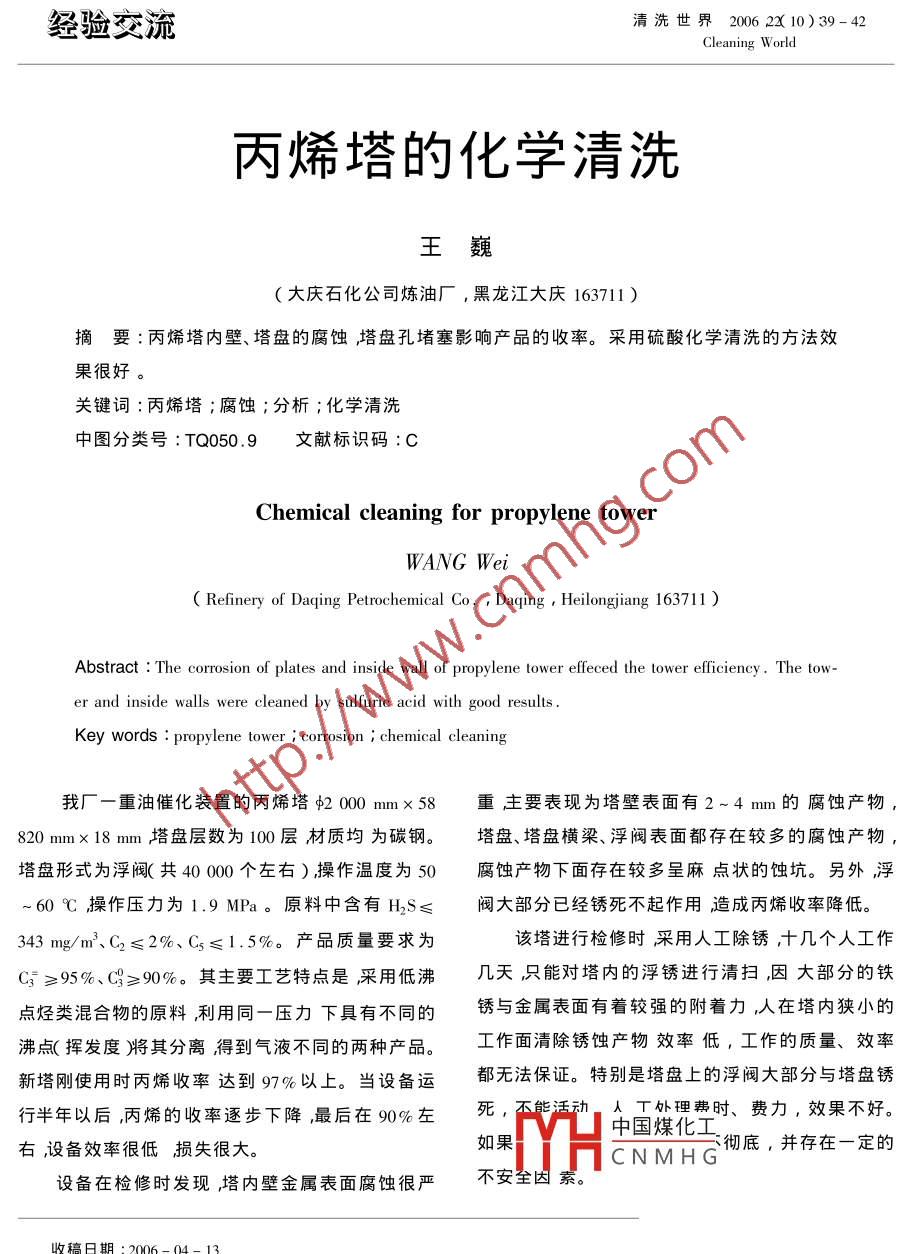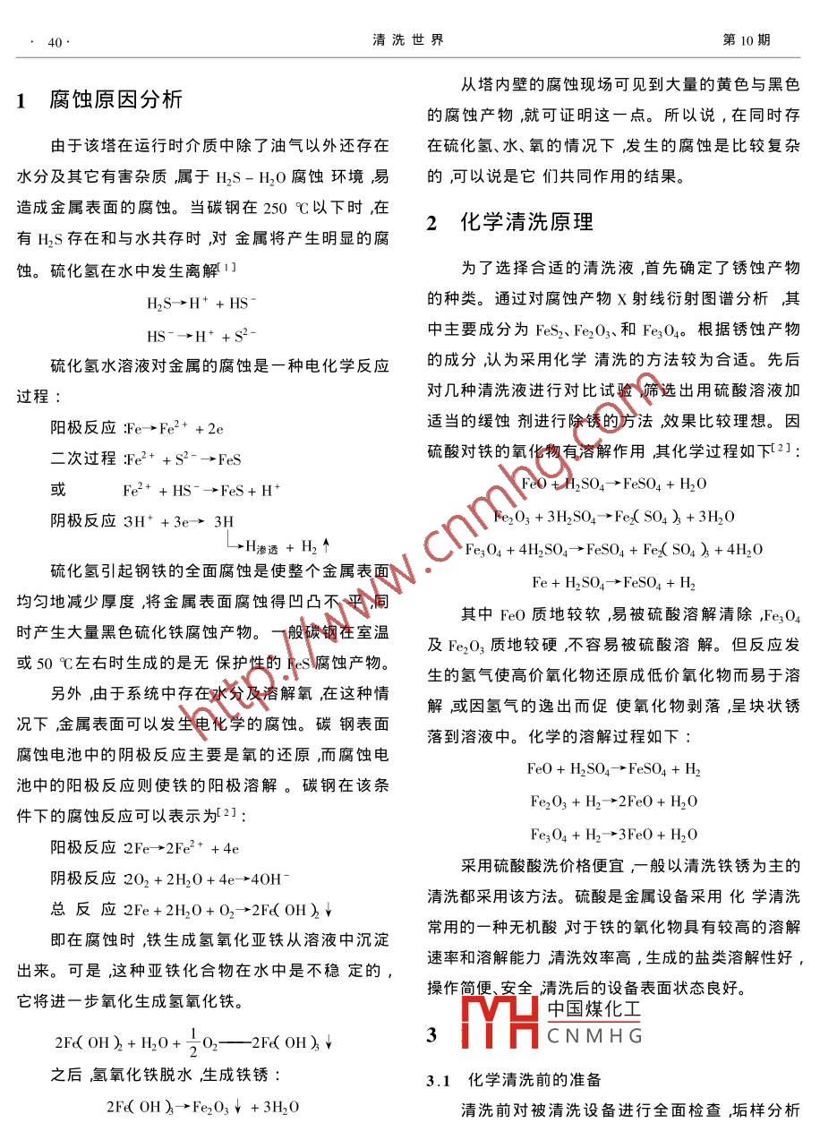 經(jīng)驗(yàn)交流清洗世界20062X10)39-42Cleaning worle丙烯塔的化學(xué)清洗王巍大慶石化公司煉油廠,黑龍江大慶163711)摘要:丙烯塔內(nèi)壁、塔盤旳腐蝕塔盤孔堵塞影響產(chǎn)品旳收率。采用硫酸化學(xué)清洗的方法效果很好。關(guān)鍵詞:丙烯塔;腐蝕;分析;化學(xué)清洗中圖分類號:TQ050.9文獻(xiàn)標(biāo)識碼:CChemical cleaning for propylene towerWANG WerRefinery of Daqing Petrochemical Co., Daqing, Heilongjiang 163711)Abstract: The corrosion of plates and inside wall of propylene tower effeced the tower efficiency. The tower and inside walls were cleaned by sulfuric acid with good resultsKey words: propylene tower corrosion i chemical cleaning我廠一重油催化裝置的丙烯塔000重主要表現(xiàn)為塔壁表面有2~4mm的腐蝕產(chǎn)物820mm×18mm綹塔盤層數(shù)為100層材質(zhì)均為碳鋼。塔盤、塔盤橫梁、浮閥表面都存在較多的腐蝕產(chǎn)物塔盤形式為浮陬共40000個(gè)左右)操作溫度為50腐蝕產(chǎn)物下面存在較多呈麻點(diǎn)狀的蝕坑。另外浮60℃操作壓力為1.9MPa。原料中含有H2S閥大部分已經(jīng)銹死不起作用造成丙烯收率降低343mg/m3、C2≤2%、C5≤1.5%。產(chǎn)品質(zhì)量要求為該塔進(jìn)行檢修時(shí)采用人工除銹十幾個(gè)人工作G≥95%、(≥90%。其主要工藝特點(diǎn)是采用低沸幾天只能對塔內(nèi)的浮銹進(jìn)行清掃因大部分的鐵點(diǎn)烴類混合物的原料利用同一壓力下具有不同的銹與金屬表面有著較強(qiáng)的附著力,人在塔內(nèi)狹小的沸點(diǎn)揮發(fā)度將其分離得到氣液不同的兩種產(chǎn)品。工作面清除銹蝕產(chǎn)物效率低,工作的質(zhì)量、效率新塔剛使用時(shí)丙烯收率達(dá)到97%以上。當(dāng)設(shè)備運(yùn)都無法保證。特別是塔盤上的浮閥大部分與塔盤銹行半年以后丙烯的收率逯步下降,最后在90%左死,不能活動工處理費(fèi)時(shí)、費(fèi)力,效果不好。右,設(shè)備效率很低損失很大如果徹底,并存在一定的CNMHG設(shè)備在檢修時(shí)發(fā)現(xiàn)塔內(nèi)壁金屬表面腐蝕很嚴(yán)不安全因系收稿日期:2006-04-13作者簡擎據(jù)(195-3),男,遼寧沈陽市人,高級工程師,從事工業(yè)設(shè)備防腐工作。清洗世界從塔內(nèi)壁的腐蝕現(xiàn)場可見到大量的黃色與黑色1腐蝕原因分析的腐蝕產(chǎn)物,就可證明這一點(diǎn)。所以說,在同時(shí)存由于該塔在運(yùn)行時(shí)介質(zhì)中除了油氣以外還存在在硫化氫、水、氧的情況下發(fā)生的腐蝕是比較復(fù)雜水分及其它有害雜質(zhì)屬于H2S-HO腐蝕環(huán)境易的可以說是它們共同作用的結(jié)果。造成金屬表面的腐蝕。當(dāng)碳鋼在250℃以下時(shí)在有H2S存在和與水共存時(shí)對金屬將產(chǎn)生明顯的腐2化學(xué)清洗原理蝕。硫化氫在水中發(fā)生離解1為了選擇合適的清洗液,首先確定了銹蝕產(chǎn)物H2S→H++HS的種類。通過對腐蝕產(chǎn)物ⅹ射線衍射圖譜分析其HS-→H++S2-中主要成分為FeS2、Fe2O3和Fe3O。根據(jù)銹蝕產(chǎn)物硫化氨水溶液對金屬的腐蝕是一種電化學(xué)反應(yīng)的成分認(rèn)為采用化學(xué)清洗的方法較為合適。先后過程對幾種清洗液進(jìn)行對比試驗(yàn),篩選岀用硫酸溶液加陽極反應(yīng):Fe→-Fe2++2e適當(dāng)?shù)木徫g劑進(jìn)行除銹的方法,效果比較理想。因二次過程Fe2++s2-→Fes硫酸對鐵的氧化物有溶解作用其化學(xué)過程如下[2HS-→FeS+HFeO+H2SO4→·FeSO4+H2O陰極反應(yīng)3H++3e→3HFe203+3H2SO4-Fe(S04)+3H,OH滲透+H2↑Fe3 O4 +4H,SO4-FeSO4 +Fe( SO4 )+4H20硫化氫引起鋼鐵的全面腐蝕是使整個(gè)金屬表面Fe+H2SO4→FeSO4+H2均勻地減少厚度,將金屬表面腐蝕得凹凸不平同其中Fe質(zhì)地較軟,易被硫酸溶解清除,Fe3O4時(shí)產(chǎn)生大量黑色硫化鐵腐蝕產(chǎn)物。一般碳鋼在室溫及re2O3質(zhì)地較硬,不容易被硫酸溶解。但反應(yīng)發(fā)或50℃左右時(shí)生成的是無保護(hù)性的FeS腐蝕產(chǎn)物生的氬氣使高價(jià)氧化物還原成低價(jià)氧化物而易于溶另外由于系統(tǒng)中存在水分及溶解氧在這種情解或因氫氣的逸出而促使氧化物剝落,呈塊狀銹況下金屬表面可以發(fā)生電化學(xué)的腐蝕。碳鋼表面落到溶液中?;瘜W(xué)的溶解過程如下腐蝕電池中的陰極反應(yīng)主要是氧的還原而腐蝕電FeO+H2SO4·FeSO4+H2池中的陽極反應(yīng)則使鐵的陽極溶解。碳鋼在該條Fe2O3+H2→2Fe0+H2O件下的腐蝕反應(yīng)可以表示為2陽極反應(yīng)2Fe→2Fe2++4Fe3O4+H2→-3FeO+H2O采用硫酸酸洗價(jià)格便宜一般以清洗鐵銹為主的陰極反應(yīng)20,+2HO+4e-4OH總反應(yīng)2Fe+2H2O+O2→2FOH)↓清洗都采用該方法。硫酸是金屬設(shè)備采用化學(xué)清洗即在腐蝕時(shí),鐵生成氫氧化亞鐵從溶液中沉淀常用的一種無機(jī)酸對于鐵的氧化物具有較高的溶解出來??墒沁@種亞鐵化合物在水中是不穩(wěn)定的速率和溶解能力清洗效率髙,生成的鹽類溶解性好,操作簡便、安全清洗后的設(shè)備表面狀態(tài)良好。它將進(jìn)一步氧化生成氫氧化鐵。中國煤化工2F< OH)+H20+02--2F OH )vCNMHG之后氳氧化鐵脫水生成鐵銹3.1化學(xué)清洗前的準(zhǔn)備2FdOH)→Fe2O3¥+3H2O清洗前對被清洗設(shè)備進(jìn)行全面檢查,垢樣分析萬方敵據(jù)H)→ FeOoh↓+H2O及溶垢試驗(yàn)。對不參與化學(xué)清洗管件、設(shè)備加盲板王巍等,丙烯塔的化學(xué)清洗41隔離或拆除?,F(xiàn)場安裝清洗配管,確保管路暢通。藥劑