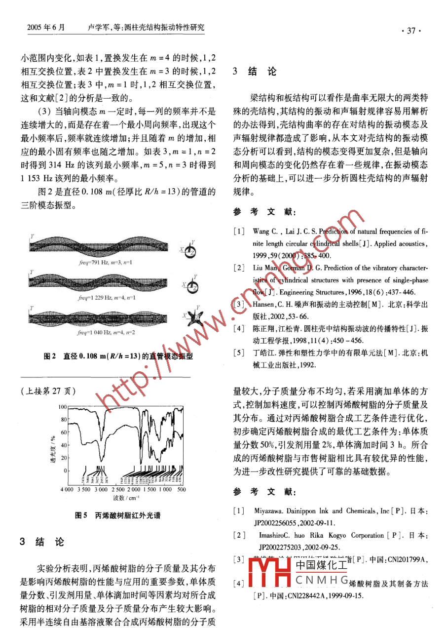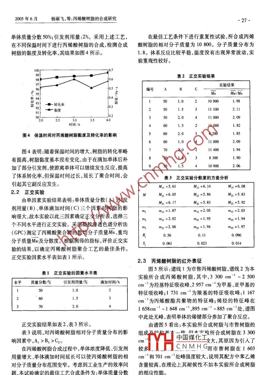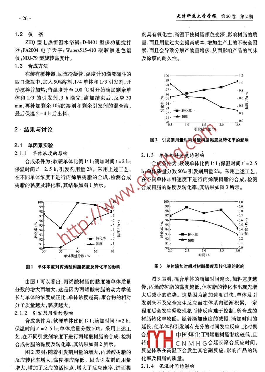 第20卷第2期天津科技大學(xué)學(xué)報(bào)2005年6月Journal of Tianjin University of Science TechnologyJun.2005丙烯酸樹脂的合成研究楊麗飛,鄧宇,鞏倩,姚寶書(天津科技大學(xué)材料科學(xué)與化學(xué)工程學(xué)院,天津300222)摘要:闡述了低分子質(zhì)量、窄分子質(zhì)量分布的丙烯酸樹脂的合成工藝,所合成樹脂相對(duì)分子質(zhì)量范圍為6000~10000,分散度范圍為1.8~2.1。討論了各主要因素對(duì)其性能的影響,并對(duì)所合成樹脂的結(jié)構(gòu)用紅外光譜進(jìn)行了表征。關(guān)鍵詞:丙烯酸樹脂;合成;分散度;相對(duì)分子質(zhì)量中圖分類號(hào):TQ031.2文獻(xiàn)標(biāo)識(shí)碼:A文章編號(hào):16726510(2005)02002503Study on Synthesis of Acrylic ResinYANG Li-fei, DENG Yu, GONG Qian, YAO Bao-shuCollege of Material Science and Chemical Engineering, Tianjin University of Sci-ence Technology, Tianjin 300222, China)Abstract: A acrylic resin with low molecular weight and narrow molecular weight distribution is synhesized, which is used in antifouling paints as base material after being modified. The range of mo-lecular weight is 6 000-10 000, the range of poly dispersity index is 1.8-2. 1. The effect of themajor factors, which affected the properties of the acrylic resin, was studied. And the resins structure was characterized by FTIRKey words: acrylic resin; synthesis; distribution; molecular weight丙烯酸樹脂是涂料工業(yè)中應(yīng)用最為廣泛的合成樹嚴(yán)加保密。因此,高性能防污涂料基料的合成研究在脂之一。目前,自拋光性防污涂料使用的可水解樹脂我國具有重要的現(xiàn)實(shí)意義。主要為聚丙烯酸類和聚酯類。聚丙烯酸類樹脂的合成在以丙烯酸樹脂為基料,復(fù)配無錫自拋光防污涂使用水溶性或親水性單體,如丙烯酸、甲基丙烯酸衣料中,丙烯酸樹脂的合成過程及其性質(zhì)對(duì)涂料的影響康酸丙烯酸氨基酯丙烯酰胺等。日本涂料公司采用作用十分明顯。本文初步研究了作為防污涂料基料的衣康酸二甲醇、丙烯酸丁酯、丙烯酸乙酯共聚物為水解丙烯酸樹脂的合成工藝,采用溶液聚合的方式,合成了樹脂,制成的防污涂料的防污期效為3年。關(guān)西公司以甲基丙烯酸二甲氨基乙酯的共聚物為基料,制成低相對(duì)分子質(zhì)量低分散度的丙烯酸樹脂,為丙烯酸樹的防污涂料的防污期效為18個(gè)月(2。專利脂進(jìn)一步改性提供了基礎(chǔ)數(shù)據(jù)。CN20179A公開了一種涂料用固體丙烯酸樹脂的合成方法,所合成樹脂具有較好的存放穩(wěn)定性。專利實(shí)驗(yàn)CN228442A合成了一種高固體含量、低黏度的丙烯酸樹脂“,但未對(duì)所合成樹脂的相對(duì)分子質(zhì)量及分布進(jìn)11原料行具體分析。在新型防污涂料方面,我國和世界先進(jìn)甲基丙烯酸甲酯:α-甲基丙烯酸;丙烯酸丁酯;丙水平還有一定差距。目前,國外各大涂料公司對(duì)自拋烯酸YHa中國煤化工;偶氮二異丁腈;二甲光防污涂料的制造技術(shù)尤其是基料樹脂的合成工藝苯CNMHG分析純。收稿日期:2004-10-28**基金項(xiàng)目:天津市重大科技攻關(guān)項(xiàng)目(315130)*博數(shù)擼飛(1981-),女,內(nèi)蒙古素峰市人,碩士研究生天津斡技大學(xué)學(xué)報(bào)第20卷第2期12儀器劑具有氧化性高溫下使樹脂顏色變深,影響樹脂的質(zhì)zHQ型電熱恒溫水浴鍋;D-8401型多功能攪拌量,而且用量過大會(huì)提高成本,增加生產(chǎn)上的不安全因器;FA2004電子天平; Waters515410凝膠滲透色譜素,而且會(huì)導(dǎo)致分解產(chǎn)物量增多,從而影響產(chǎn)品的氣味儀;NDJ-79型旋轉(zhuǎn)黏度計(jì)。及涂膜的耐久性。1.3合成方法在裝有攪拌器、回流冷凝管、溫度計(jì)和滴液漏斗的四口燒瓶中,加人90%溶劑、1/4單體和1/3引發(fā)劑,開動(dòng)攪拌并加熱;待溫度升至100℃時(shí)開始滴加剩余單體和1/3的引發(fā)劑,3h滴完;滴加結(jié)束后,反應(yīng)300.6amin,再補(bǔ)加剩余10%的溶劑和剩余引發(fā)劑的混合液,最后保溫2~4h后出料。轉(zhuǎn)化率黏度2·結(jié)果與討論引發(fā)劑用量/%圖2引發(fā)劑用量對(duì)丙烯酸樹脂黏度及轉(zhuǎn)化率的影響2.1單因素實(shí)驗(yàn)2.1.1單體濃度的影響2.1.3單體加料速度的影響合成條件為:軟硬單體比例1:1;滴加時(shí)間t=2h;合成條件為:軟硬單體比例1:1;保溫時(shí)間t'=2.5保溫時(shí)間=25h,引發(fā)劑用量2%采用上述工藝,h;單體質(zhì)量分?jǐn)?shù)50%;引發(fā)劑用量2%。采用上述工藝在不同單體濃度下進(jìn)行內(nèi)烯酸樹脂的合成檢測合成在不同單體加料速度下進(jìn)行丙烯酸樹脂的合成,檢測樹脂的黏度及轉(zhuǎn)化率,其結(jié)果如圖1所示。合成樹脂的黏度及轉(zhuǎn)化率,其結(jié)果如圖3所示。4好2903轉(zhuǎn)化率單體質(zhì)量分?jǐn)?shù)/%時(shí)間/h圖1單體濃度對(duì)丙烯酸樹脂黏度及轉(zhuǎn)化率的影響圖3單體滴加時(shí)間對(duì)樹脂黏度及轉(zhuǎn)化率的影響由圖1可以看出,丙烯酸樹脂的黏度隨單體質(zhì)量圖3表明,混合單體的滴加時(shí)間越長,加料速度越分?jǐn)?shù)的增大而增大,這是因?yàn)楸┧針渲膭?dòng)力學(xué)鏈慢,丙烯酸樹脂的黏度越低,但樹脂的轉(zhuǎn)化率出現(xiàn)先增長與單體的濃度成正比,單體濃度越高,聚合物的相對(duì)大后減小的趨勢(shì)。這是因?yàn)榈渭铀俣冗^快,單體及引分子質(zhì)量越大,黏度越大。發(fā)劑來不及完全發(fā)生反應(yīng)而在體系內(nèi)逐漸積累,一定2.1.2引發(fā)