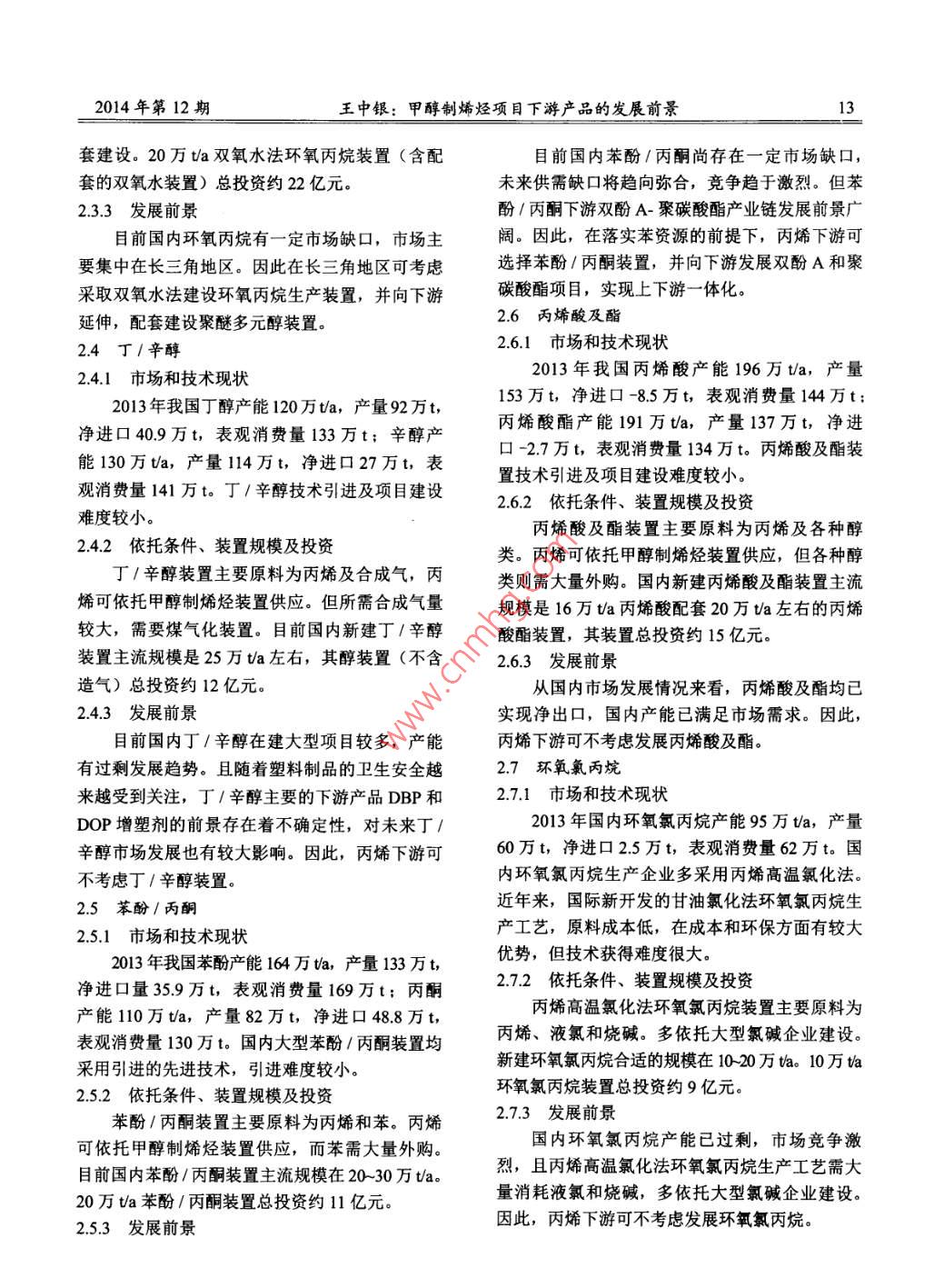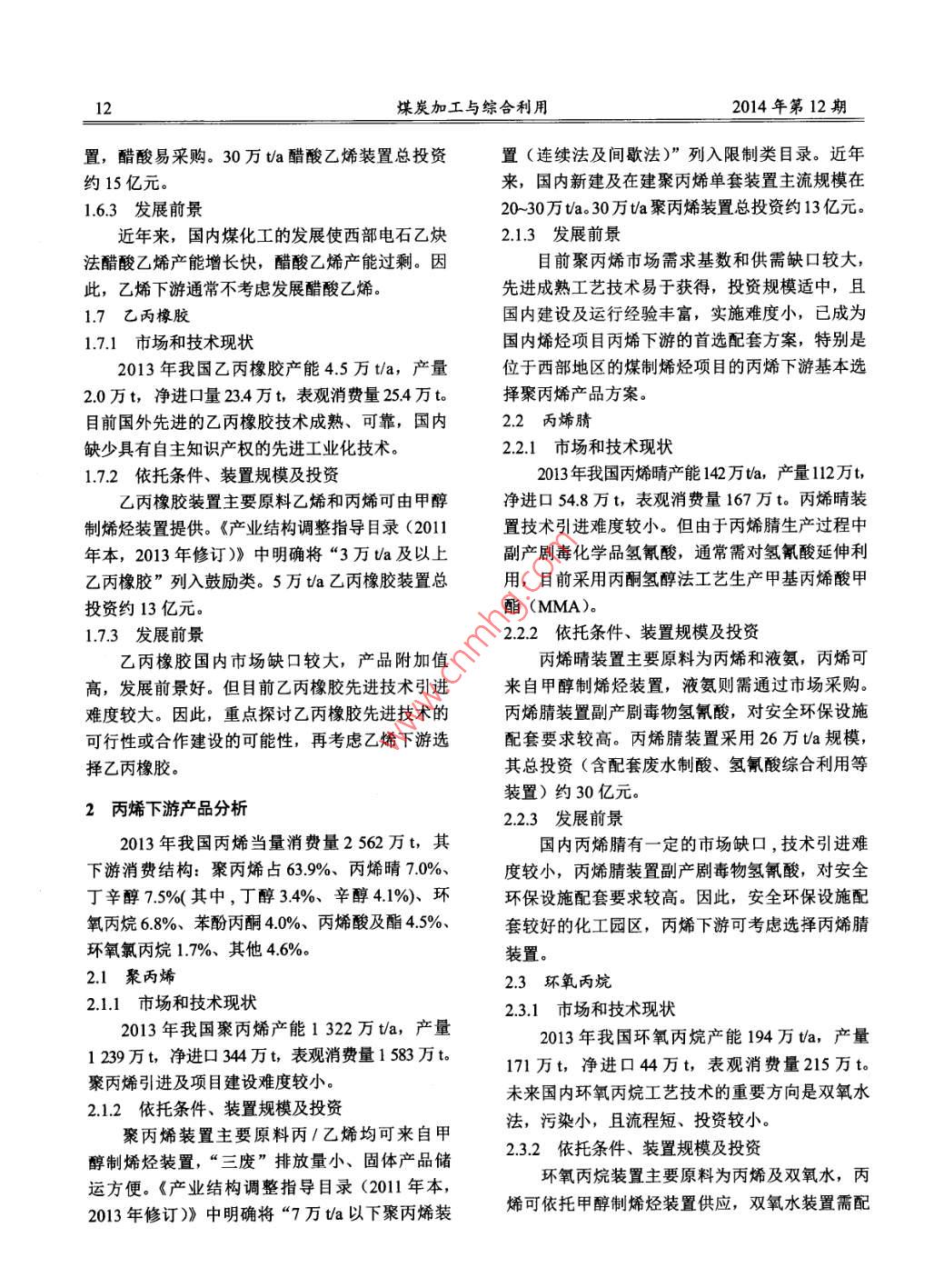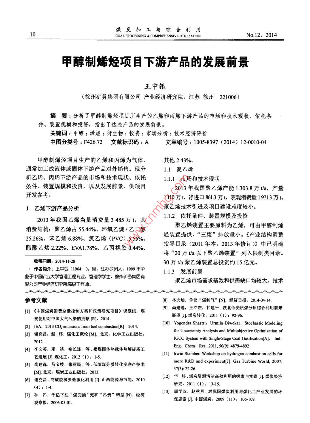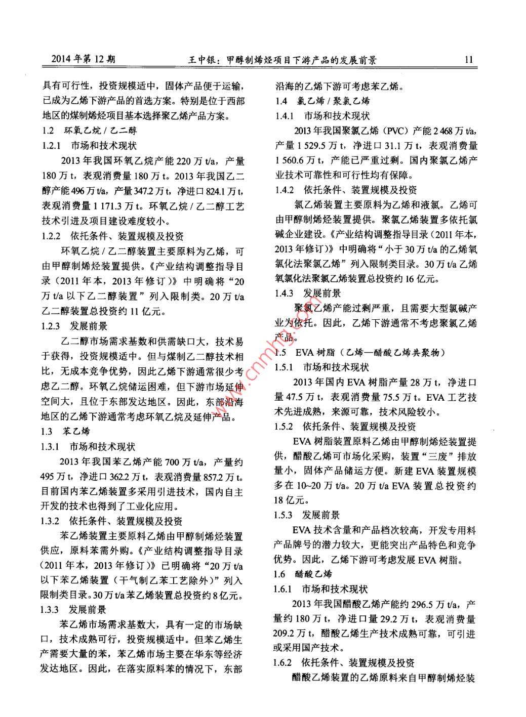 煤炭加工與綜合利用COAL PROCESSING & COMPREHENSIVE UTILIZATIONNo.12,2014甲醇制烯烴項目下游產(chǎn)品的發(fā)展前景王中銀(徐州礦務集團有限公司產(chǎn)業(yè)經(jīng)濟研究院,江蘇徐州221006)摘要:分析了甲醇制烯烴項目所生產(chǎn)的乙烯和丙烯下游產(chǎn)品的市場和技術(shù)現(xiàn)狀、依托條件、裝置規(guī)模和投資,指出了這些產(chǎn)品的發(fā)展前景。關(guān)鍵詞:甲醇;烯烴;衍生物;投資;市場分析;技術(shù)經(jīng)濟評價中圖分類號: F426.72文獻標識碼: A文章編號: 1005-8397 (2014) 12-0010-04甲醇制烯烴項目生產(chǎn)的乙烯和丙烯為氣體,其他2.43%。通常加工成液體或固體下游產(chǎn)品對外銷售?,F(xiàn)分1.1 聚乙烯析乙烯、丙烯下游產(chǎn)品的市場和技術(shù)現(xiàn)狀、依托1.1.1市場和技 術(shù)現(xiàn)狀條件、裝置規(guī)模和投資,以及發(fā)展前景,供項目2013年我國聚乙烯產(chǎn)能1303.8萬ta,產(chǎn)量開發(fā)參考。1110萬t,凈進口861.3萬t,表觀消費量19713萬t。1乙烯下游產(chǎn) 品分析聚乙烯技術(shù)引進及項目建設難度較小。2013年我國乙烯當量消費量3485萬t,其1.1.2依托條件、 裝置規(guī)模及投資聚乙烯裝置主要原料為乙烯,可由甲醇制烯消費結(jié)構(gòu):聚乙烯占55.44%、環(huán)氧乙烷/乙二醇烴裝置提供,“三廢”排放量小?!懂a(chǎn)業(yè)結(jié)構(gòu)調(diào)整25.26%、苯乙烯6.88%、氯乙烯(PVC) 5.55%、醋酸乙烯2.22%、EVA1.78%、 乙丙橡膠0.44%、指導目錄(2011年本,2013 年修訂)》中已明確將“20萬tla以下聚乙烯裝置”列入限制類目錄。收稿日期: 2014-11-2830萬ta聚乙烯裝置總投資約15億元。作者簡介:王中銀(1964- -),男,江蘇徐州人,19999 年畢1.1.3 發(fā)展前景業(yè)于中國礦業(yè)大學管理工程專業(yè),管理學學士,徐州礦務集團有聚乙烯市場需求基數(shù)和供需缺口均較大,技術(shù)限公司產(chǎn)業(yè)經(jīng)濟研究院高級工程師。參考文獻[8]林火燦. 爭議“煤制氣" N].經(jīng)濟日報,201404-14.[I]《中國煤炭消 費總量控制方案和政策研究項目》課題組.煤9] 尚建選,王立杰,甘建平.陜北低變質(zhì)煤分質(zhì)綜合利用前景展望[].煤炭轉(zhuǎn)化,2011 (1): 92-96.炭使用對中國大氣污染的貢獻[R], 2014.[10] Yogendra Shastri, Urmila Diwekar. Stochastic Modeling[2] IEA. 2013 CO2 emissions from fuel combustion[R], 2014.for Uncertainty Analysis and Multiobjective Optimization of[3] 謝克昌,趙煒.煤化工概論[M]. 北京:化學工業(yè)出版社,IGCC System wit Single Stage Coal Gasification[A]. In2012.Eng. Chem. Res, 2011, 50(9): 4879 4892.[4] 李文英,鄧靖,喻長連,等.褐煤固體熱載體熱解提質(zhì)工[1] Irwin Stamber. Workshop on bydrogen combustion cells for藝進展[J].煤化工,2012 (1): 1-5.more R&D and experiment[J]. Gas Turbine World, 2007,[5] 尚建選,馬寶岐,張秋民,等.低階煤分質(zhì)轉(zhuǎn)化多聯(lián)產(chǎn)技術(shù)37(3): 22-26.[M].北京:煤炭工業(yè)出版社,2013.[6]謝克昌. 高碳能源要低碳化利用[I]山西能源與節(jié)能,2010[12]華煒.煤炭資源清潔高效利用的探索與實踐[0]煤炭經(jīng)濟研究,2011 (1): 13-15.(4): 14.[7]種昂.千億下注“煤變油”兗礦“昂貴”轉(zhuǎn)型N].經(jīng)濟.[13] 周學雙,趙秋月.對我國煤炭利用與煤化工產(chǎn)業(yè)發(fā)展的環(huán)保思索[0].中國煤炭,2009 (11): 106-109.觀察報,2006-05-01..2014年第12期王中銀:甲醇制烯烴項目下游產(chǎn)品的發(fā)展前景11具有可行性,投資規(guī)模適中,固體產(chǎn)品便于運輸,沿海的乙烯下游可考慮苯乙烯。已成為乙烯下游產(chǎn)品的首選方案。特別是位于西部1.4 氯乙烯/聚氯乙烯地區(qū)的煤制烯烴項目基本選擇聚乙烯產(chǎn)品方案。1.4.1市場和技術(shù)現(xiàn)狀1.2環(huán)氧乙烷/ 乙二醇.2013年我國聚氯乙烯(PVC)產(chǎn)能2468萬ta,1.2.1市場和技 術(shù)現(xiàn)狀產(chǎn)量1529.5萬t,凈進口31.1 萬t,表觀消費量2013年我國環(huán)氧乙烷產(chǎn)能220萬ta,產(chǎn)量1 560.6萬t,產(chǎn)能已嚴重過剩。國內(nèi)聚氯乙烯產(chǎn)180萬t,表觀消費量180萬t。2013 年我國乙二業(yè)技術(shù)可靠性和可行性均有保障。醇產(chǎn)能496萬始,產(chǎn)量347.2萬t, 凈進口824.1萬t,1.4.2依托條件、 裝置規(guī)模及投資表觀消費量1 171.3萬t。環(huán)氧乙烷/乙二醇工藝氯乙烯裝置主要原料為乙烯和液氯。乙烯可技術(shù)引進及項目建設難度較小。由甲醇制烯烴裝置提供。聚氯乙烯裝置多依托氯1.2.2依托條件、 裝置規(guī)模及投資堿企業(yè)建設?!懂a(chǎn)業(yè)結(jié)構(gòu)調(diào)整指導目錄(2011年本,環(huán)氧乙烷1乙二醇裝置主要原料為乙烯,可2013年修訂》》中明確將“小于30萬ta的乙烯氧由甲醇制烯烴裝置提供?!懂a(chǎn)業(yè)結(jié)構(gòu)調(diào)整指導目.氯化法聚氯乙烯”列入限制類目錄。30萬t/a乙烯錄(2011年本,2013年修訂)》中明確將“20氧氯化法聚氯乙烯裝置總投資約16億元。萬t/a以下乙二醇裝置”列入限制類。20萬ta1.4.3 發(fā)展前景乙二醇裝置總投資約11億元。聚氯乙烯產(chǎn)能過剩嚴重,且需要大型氯堿產(chǎn)1.2.3發(fā)展前景.業(yè)為依托。因此,乙烯下游通常不考慮聚氯乙烯乙二醇市場需求基數(shù)和供需缺口大,技術(shù)易產(chǎn)品。于獲得,投資規(guī)模適中。但與煤制乙二醇技術(shù)相1.5EVA樹脂(乙烯-醋酸乙烯共聚物)比,無成本競爭優(yōu)勢,因此乙烯下游通常很少考1.5.1 市場和技術(shù)現(xiàn)狀慮乙二醇。環(huán)氧乙烷儲