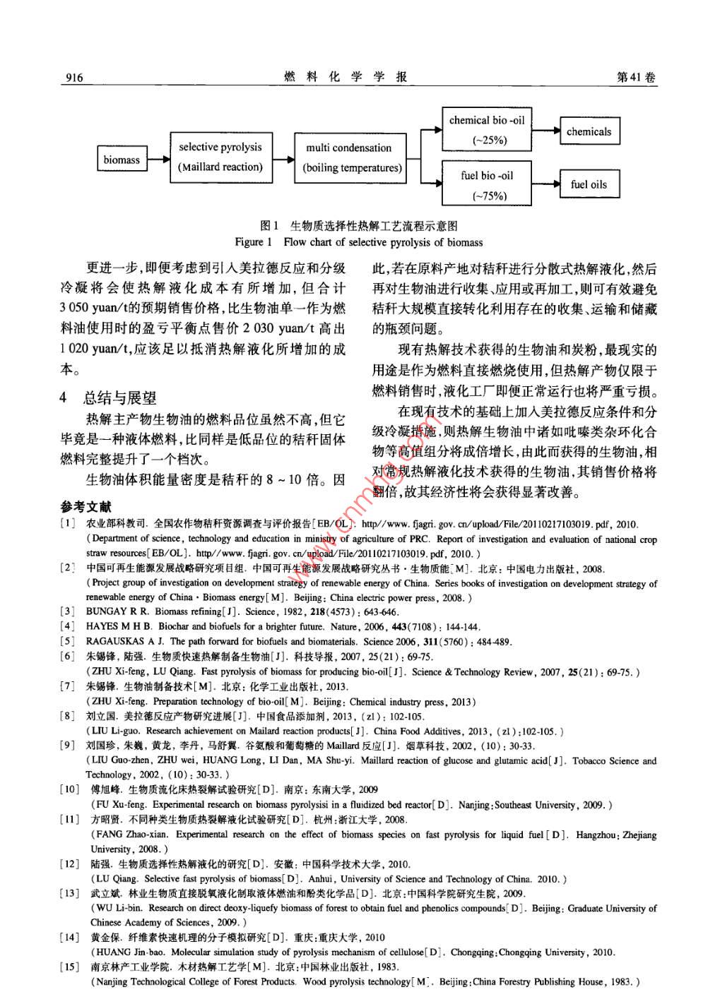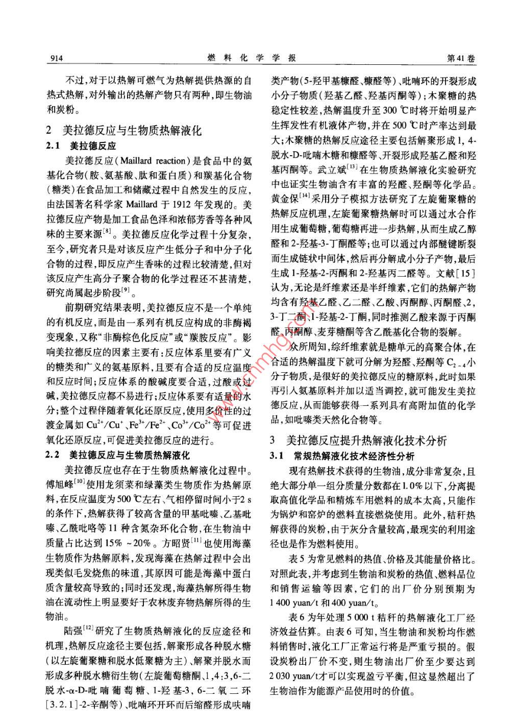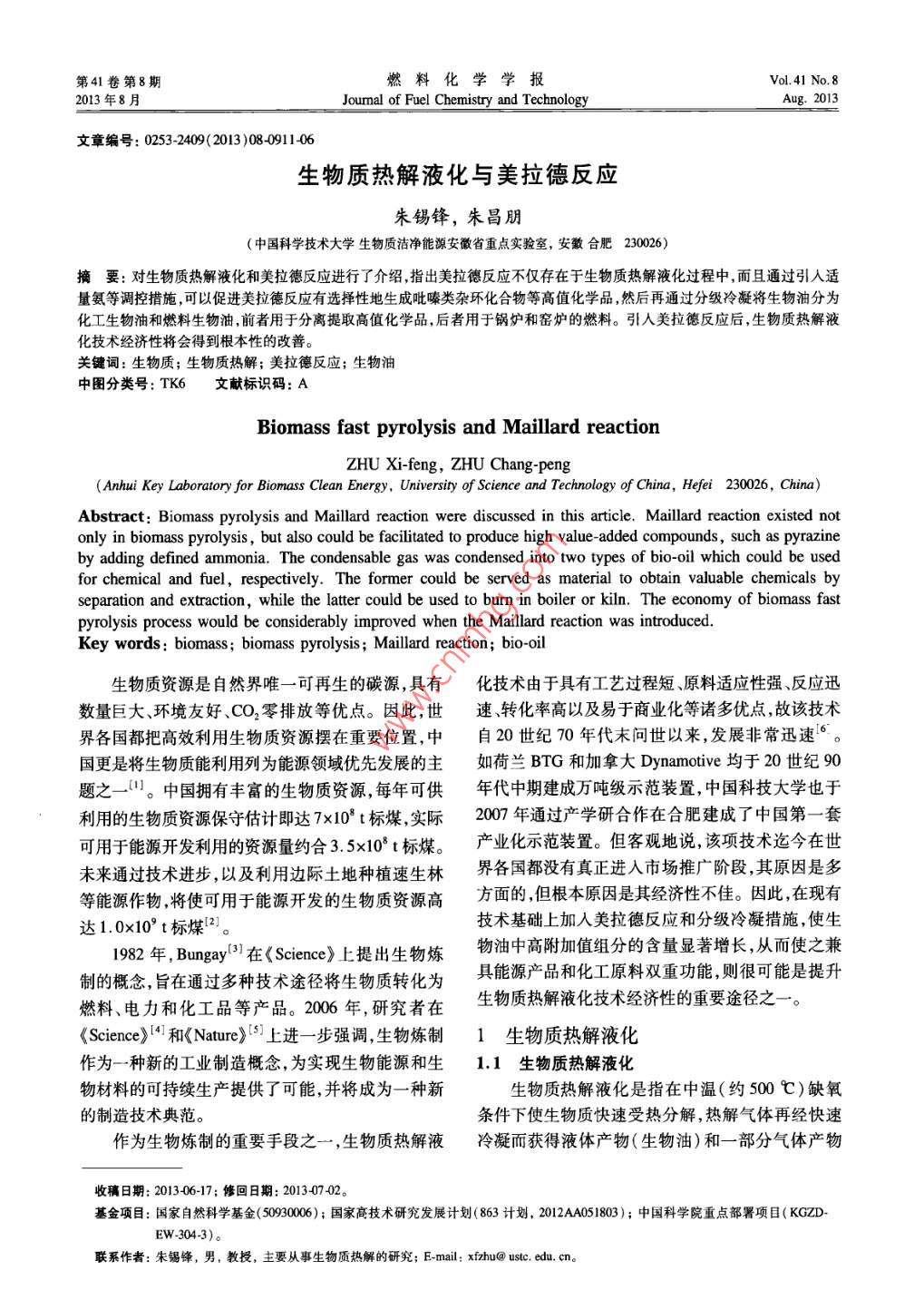 第41卷第8期燃料化學學報Vol 41 No 82013年8月Joumal of Fuel Chemistry and TechnologyAug.2013文章編號:0253-2409(2013)08-091146生物質熱解液化與美拉德反應朱錫鋒,朱昌朋(中國科學技術大學生物質潔凈能源安徽省重點實驗室,安徽合肥230026)摘要:對生物質熱解液化和美拉德反應進行了介紹指出美拉德反應不僅存在于生物質熱解液化過程中,而且通過引人適量氨等調控措施,可以促進美拉德反應有選擇性地生成吡嗪類雜環(huán)化合物等高值化學品,然后再通過分級冷凝將生物油分為化工生物油和燃料生物油,前者用于分離提取高值化學品,后者用于鍋爐和窯爐的燃料。引人美拉德反應后,生物質熱解液化技術經濟性將會得到根本性的改善。關鍵詞:生物質;生物質熱解;美拉德反應;生物油中圖分類號:TK6文獻標識碼:ABiomass fast pyrolysis and Maillard reactionZHU Xi-feng, ZHU Chang-pengAnhui Key Laboratory for Biomass Clean Energy, University of Science and Technology of China, Hefei 230026, China)Abstract Biomass pyrolysis and Maillard reaction were discussed in this article. Maillard reaction existed notonly in biomass pyrolysis, but also could be facilitated to produce high value-added compounds, such as pyrazineby adding defined ammonia. The condensable gas was condensed into two types of bio-oil which could be usedfor chemical and fuel, respectively. The former could be served as material to obtain valuable chemicals byseparation and extraction, while the latter could be used to burn in boiler or kiln. The economy of biomass fastpyrolysis process would be considerably improved when the Maillard reaction was introducedKey words: biomass; biomass pyrolysis; Maillard reaction; bio-oil生物質資源是自然界唯一可再生的碳源,具有化技術由于具有工藝過程短、原料適應性強、反應迅數(shù)量巨大、環(huán)境友好、CO2零排放等優(yōu)點。因此,世速、轉化率高以及易于商業(yè)化等諸多優(yōu)點故該技術界各國都把高效利用生物質資源擺在重要位置,中自20世紀70年代末問世以來,發(fā)展非常迅速6國更是將生物質能利用列為能源領域優(yōu)先發(fā)展的主如荷蘭BTG和加拿大 Dynamotive均于20世紀90題之一。中國擁有豐富的生物質資源,每年可供年代中期建成萬噸級示范裝置,中國科技大學也于利用的生物質資源保守估計即達7×103t標煤,實際20070年通過產學研合作在合肥建成了中國第一套可用于能源開發(fā)利用的資源量約合3.5×x103t標煤。產業(yè)化示范裝置。但客觀地說,該項技術迄今在世未來通過技術進步,以及利用邊際土地種植速生林界各國都沒有真正進入市場推廣階段其原因是多等能源作物,將使可用于能源開發(fā)的生物質資源高方面的但根本原因是其經濟性不佳。因此在現(xiàn)有達10×10t標煤2。技術基礎上加入美拉德反應和分級冷凝措施,使生1982年, Bunga)在 Science)上提出生物煉物油中高附加值組分的含量顯著增長,從而使之兼制的概念,旨在通過多種技術途徑將生物質轉化為其能源產品和化工原料雙重功能,則很可能是提升燃料、電力和化工品等產品。2006年,研究者在生物質熱解液化技術經濟性的重要途徑之一。《 Science和《Natr5上進一步強調,生物煉制1生物質熱解液化作為一種新的工業(yè)制造概念,為實現(xiàn)生物能源和生11生物質熱解液化物材料的可持續(xù)生產提供了可能,并將成為一種新生物質熱解液化是指在中溫(約500℃)缺氧的制造技術典范。條件下使生物質快速受熱分解,熱解氣體再經快速作為生物煉制的重要手段之一,生物質熱解液冷凝而獲得液體產物(生物油)和一部分氣體產物收稿日期:20136-17;修回日期:2013407402?;痦椖?國家自然科學基金(509300);國家高技術研究發(fā)展計劃(863計劃,2012AA051803);中國科學院重點部署項目(KGZD聯(lián)系作者:朱錫鋒,男,教授,主要從事生物質熱解的研究;E-mail:xihu@ustc,edu.cn。燃料化學學報第41卷(可燃氣)及固體產物(炭粉)的熱化學轉化過程。原因是熱解反應為吸熱反應,吸收的熱量轉變?yōu)榛绊懮镔|熱解的因素主要有加熱速率、熱解學能儲藏在了熱解產物之中。反應溫度、氣相滯留時間和熱解高溫氣體的淬冷等。為減少熱解過程對商品能源的消耗,可以采用在最佳反應條件下,農林廢棄物生物質熱解產物的熱解副產物可燃氣或炭粉燃燒釋放的熱量為熱解提產率和熱值見表1。由表1可知,不論采用何種原供熱源,從而實現(xiàn)自熱式熱解。料,三種熱解產物的能量產率之和都大于100%,其表1農林廢棄物類生物質熱解產物的產率和熱值Table I Yields and heating values of pyrolysis products of various biomassesPyrolysis produBio-oilgasCharcoalTotalAgricultural wastes( moisture s10%, heating value =15 M/kg)HHV15.0~16.0M/kg12.0-13.0MJ/m318~20M/kgWeight yield w/%45~5518-2325~35100Energy yield w/%50~5535~40>100Forest residues(moisture%, heating value =17 MJ/kg)17.0-18.0M/kg13.0-14.0MJ/m324~25M/kgWeight yield w/%15Energy yield w/% 63-67 12-16 25-30>1001.2生物油的化學組成表2為稻殼及其生物油的元素組成。由表2生物油的化學組成非常復雜,除了含有20%~可知,生物油中碳、氫、氧三種有機元素的含量大于30%的水和少量炭粉等固體顆粒之外,還含有數(shù)以原料中的含量。但無機元素除Fe元素外,其他元素百計的酸、醇、酮、醛、酚、醚、酯糖、呋喃等有機化合的含量都明顯降低。生物油中較高的Fe元素可能物,目前,已檢測出的就達400多種,其中,有不少物是由于生物油在制備和保存過程中,從熱解反應器質是在大多數(shù)原料制